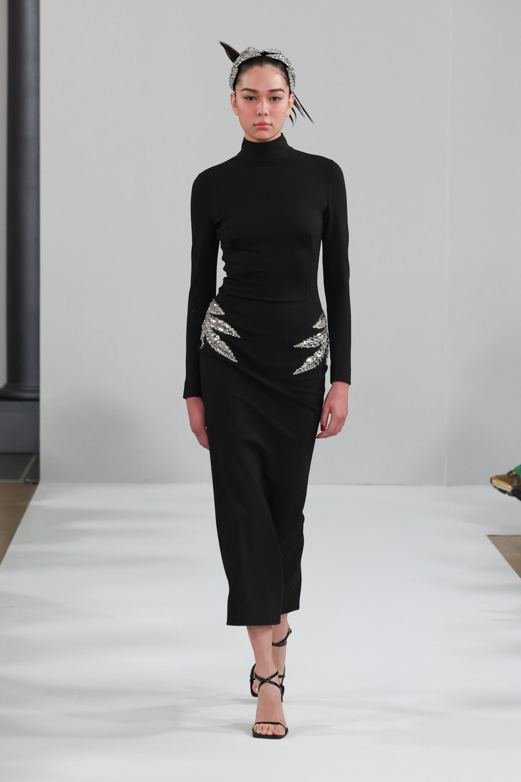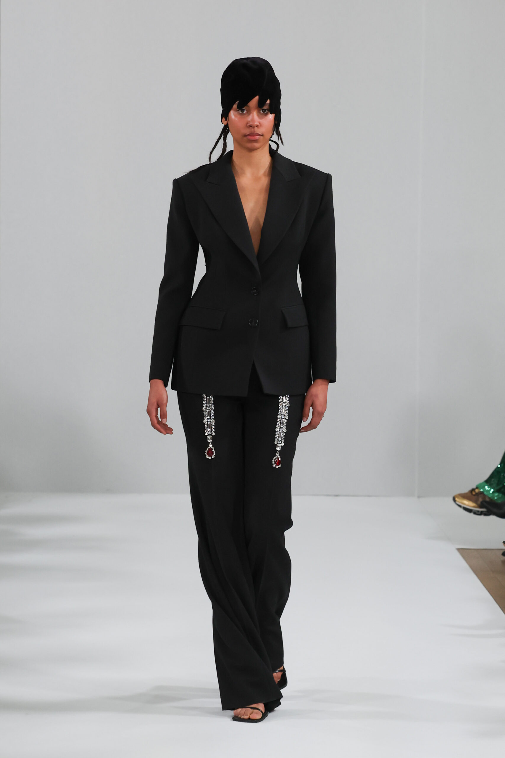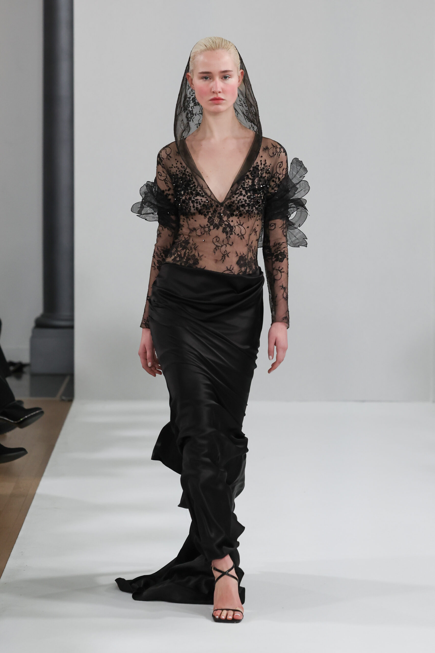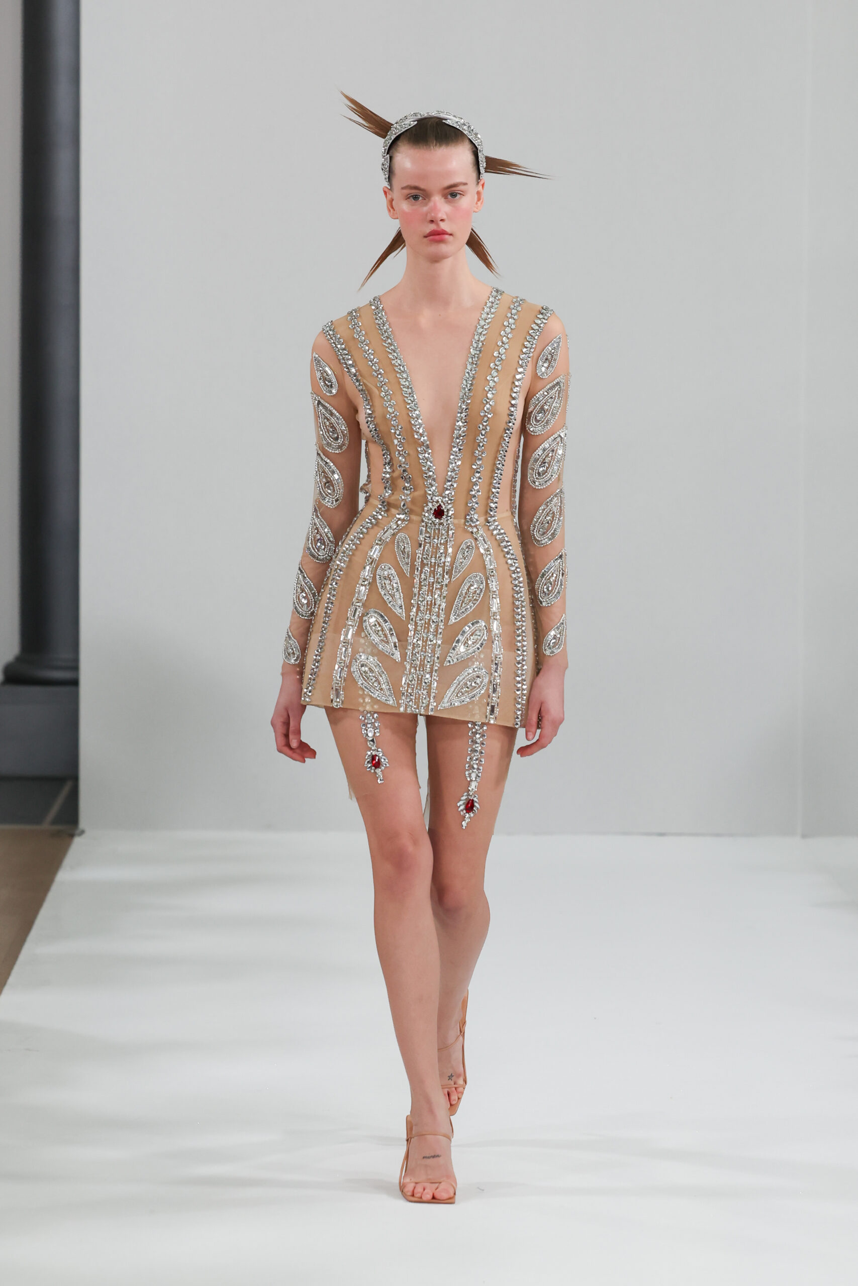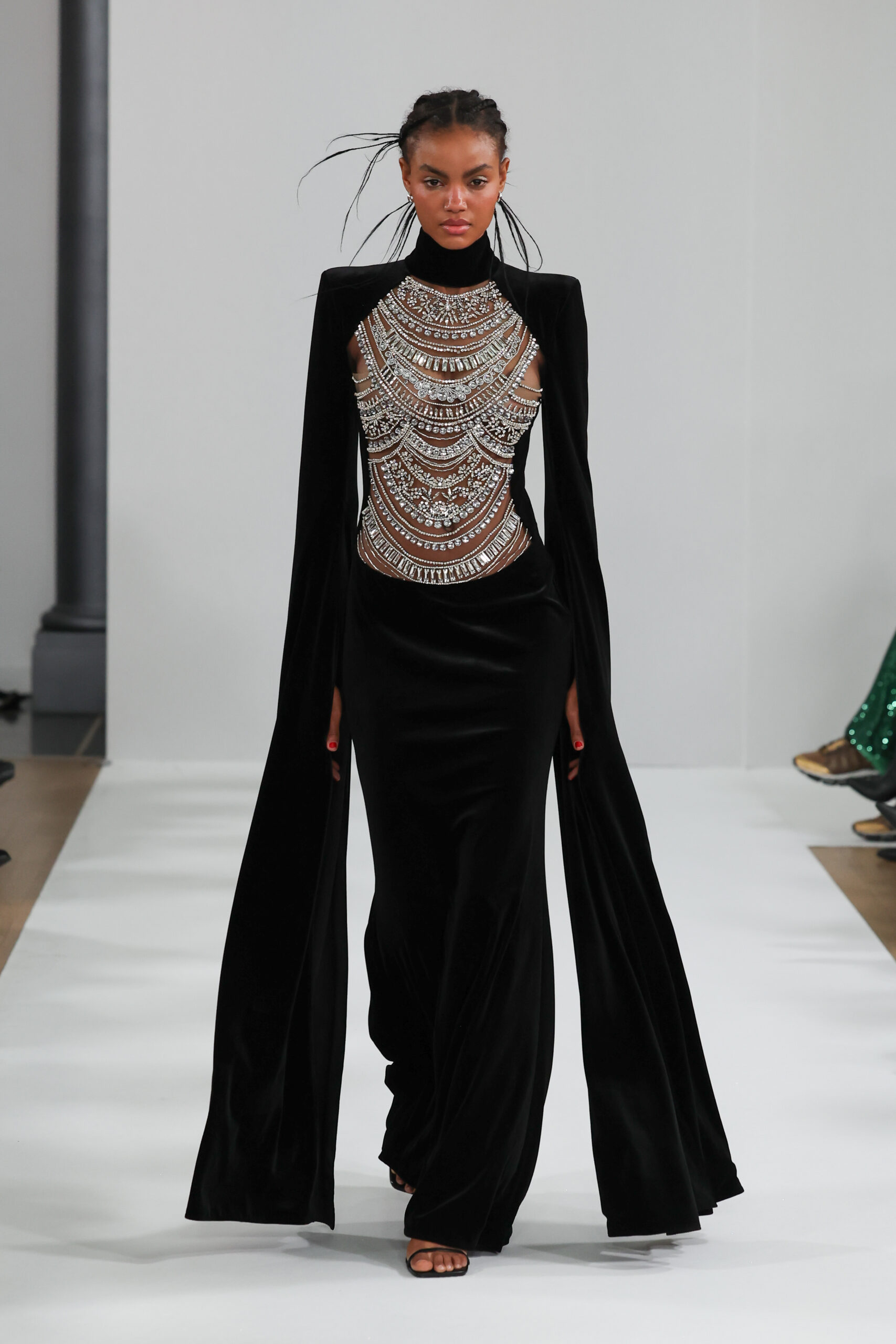 YANINA Couture reste fidèle à son héritage en utilisant des tissus traditionnels tels que le velours, la mousseline de soie et l’organza, tout en introduisant des innovations, notamment dans les techniques de broderie de plumes. Les silhouettes, qui épousent les formes féminines, sont mises en valeur par des tailleurs noirs stricts et ajustés, des robes élégantes et des manteaux à plumes uniques, témoignant d’une maîtrise artisanale exceptionnelle.