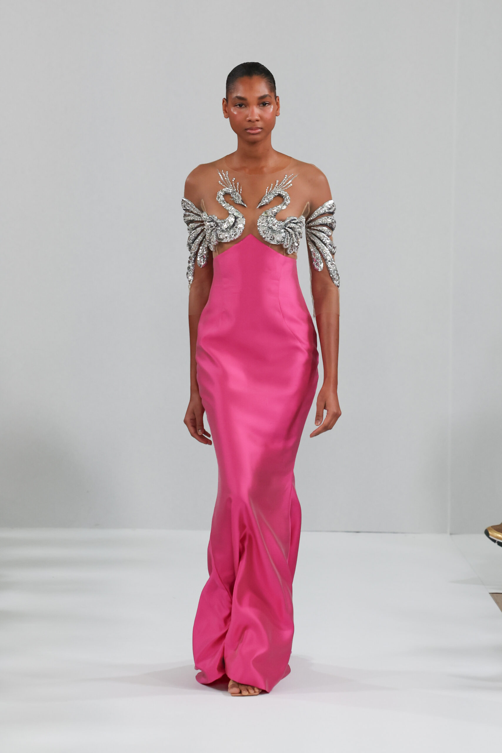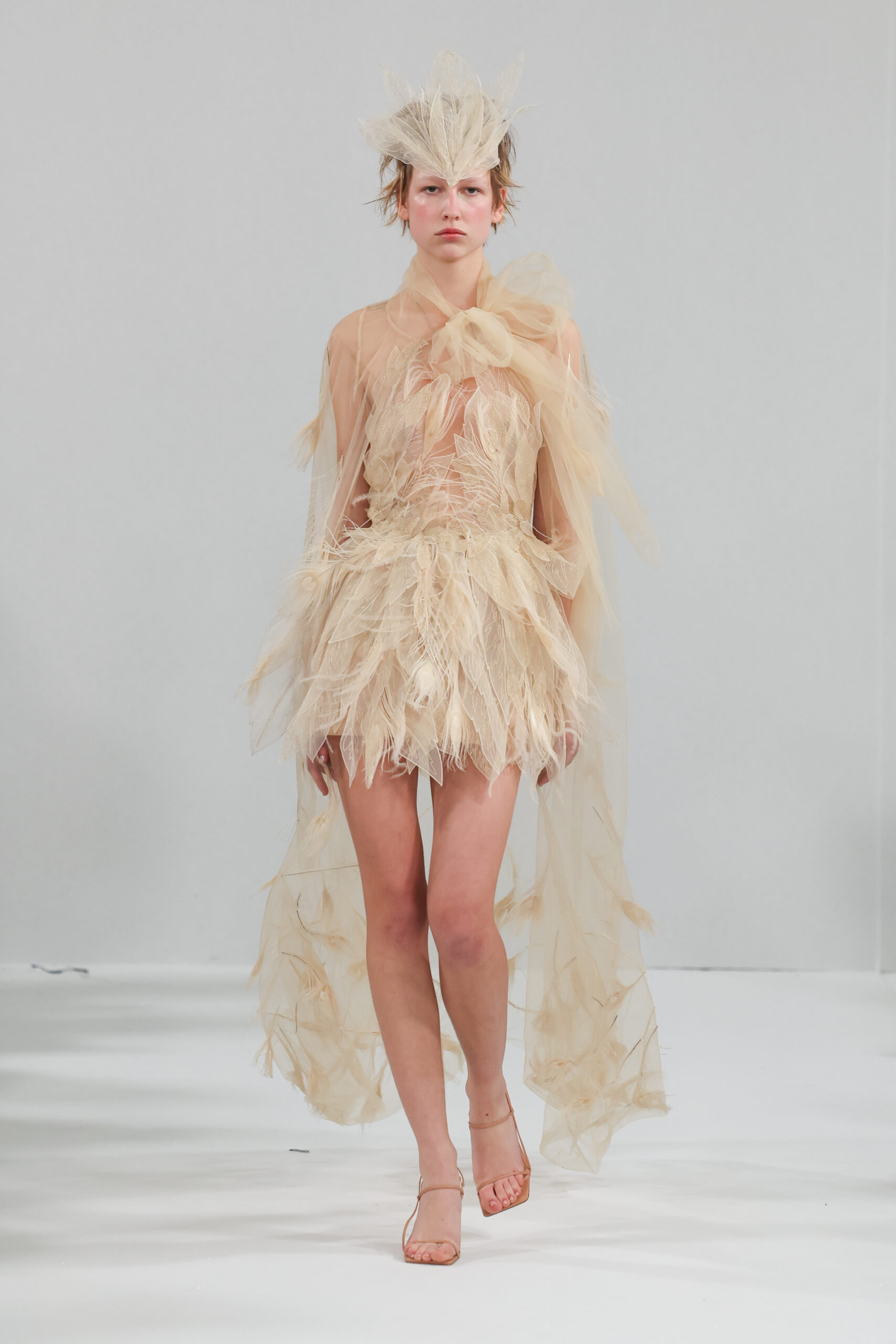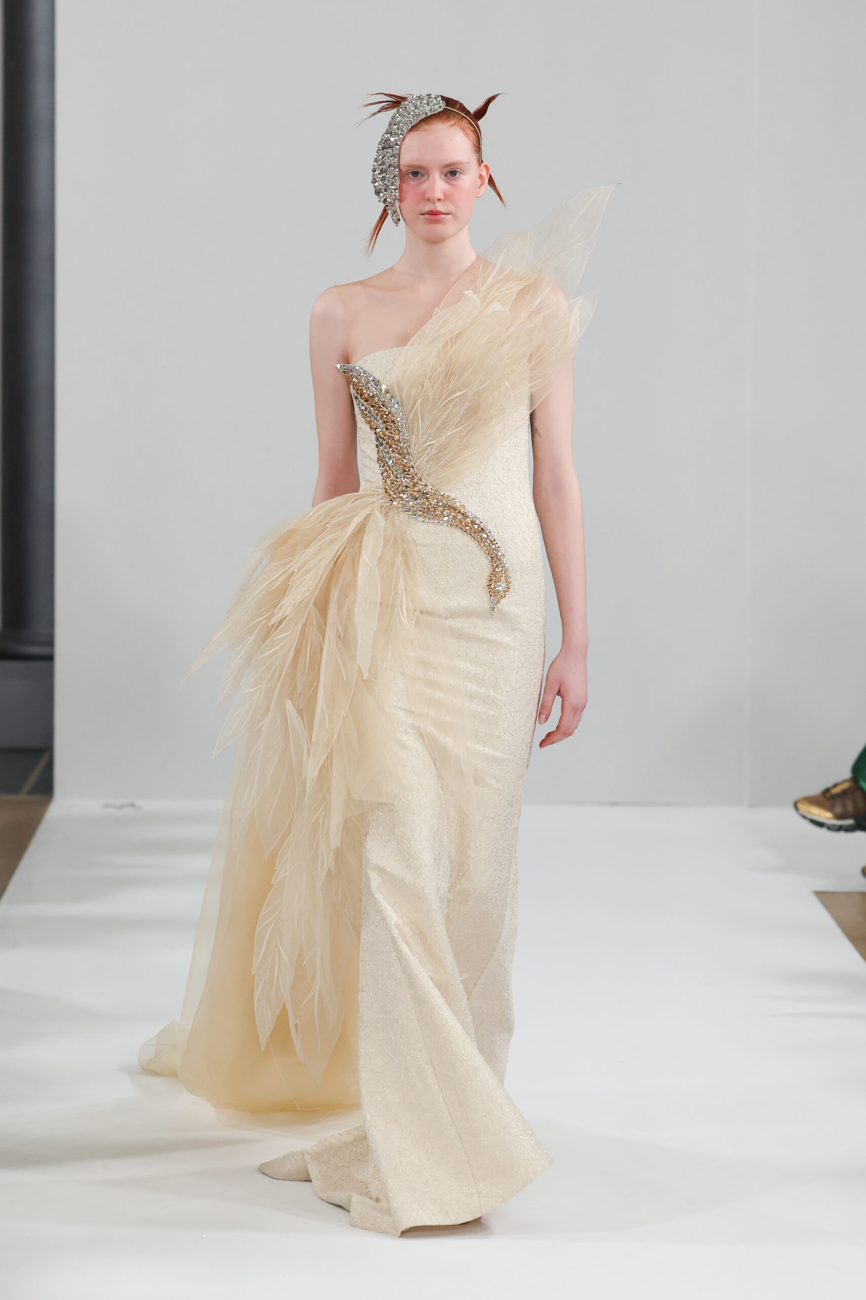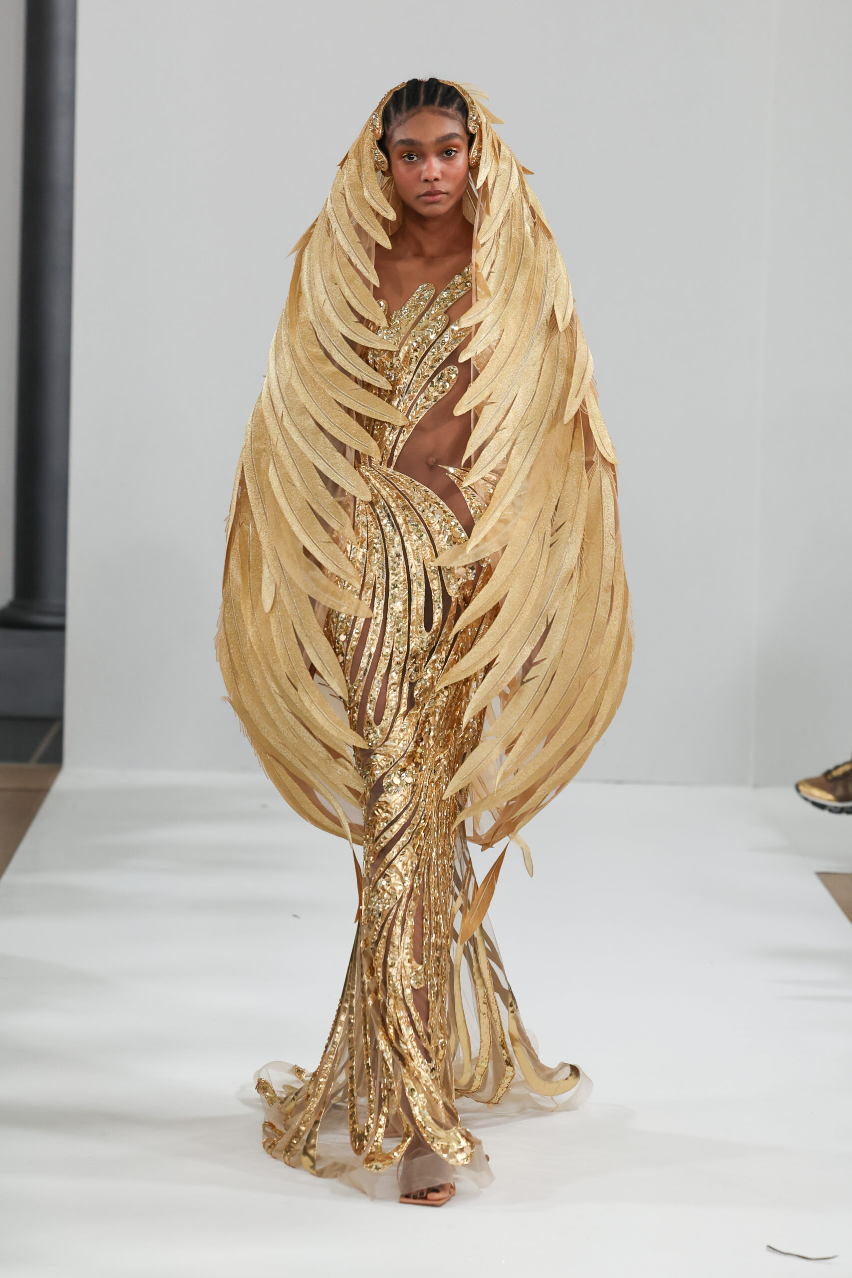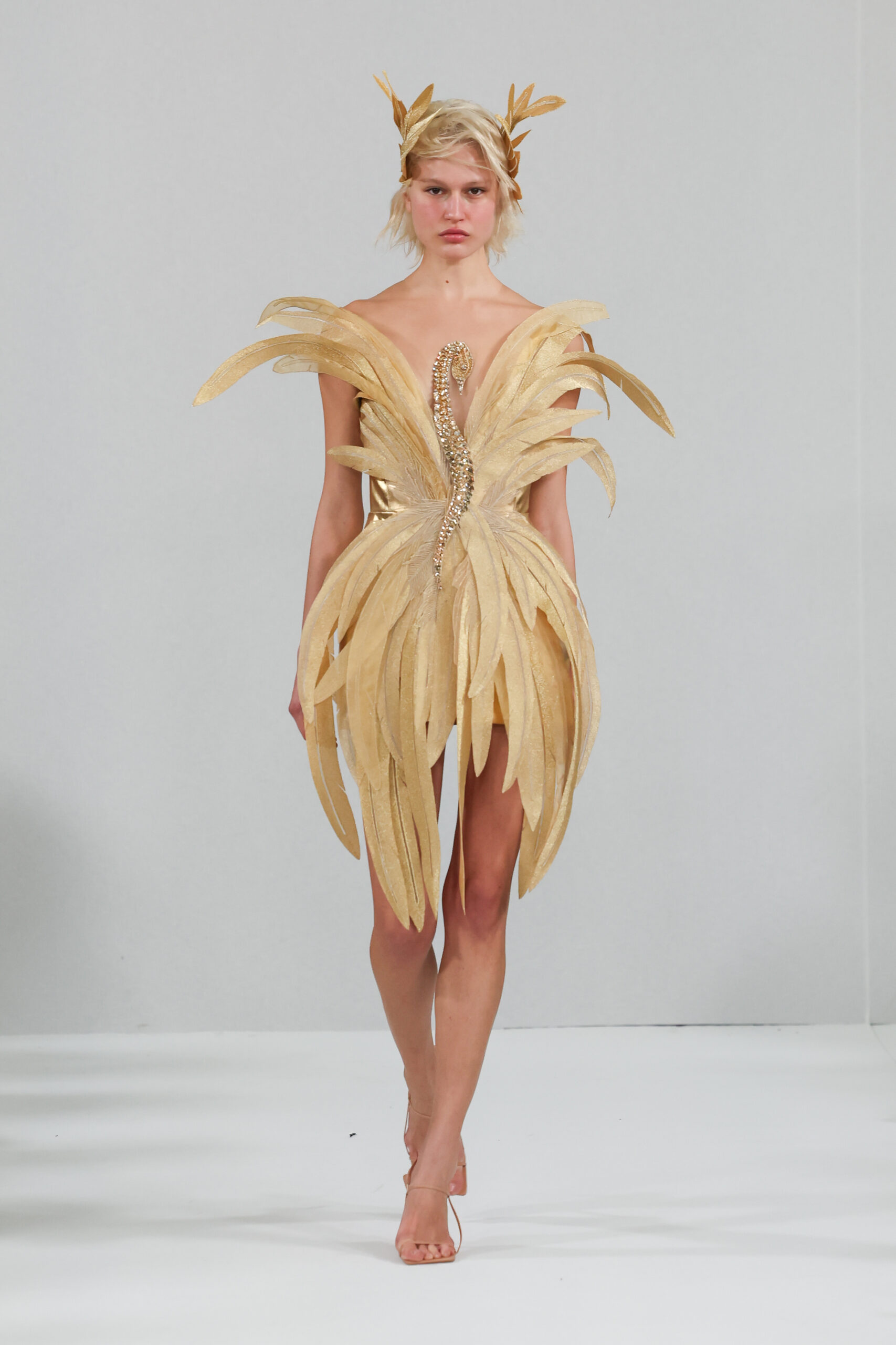 Cette collection, fruit de la vision créative de Yulia Yanina, s’inspire du légendaire phénix, cet oiseau mythique capable de renaître de ses cendres. Symbole de résilience et de renouveau, le phénix se matérialise dans chaque pièce à travers des ailes étincelantes, brodées et strassées, ainsi que des plumes décoratives, incarnant ainsi la force et l’amour de la vie.