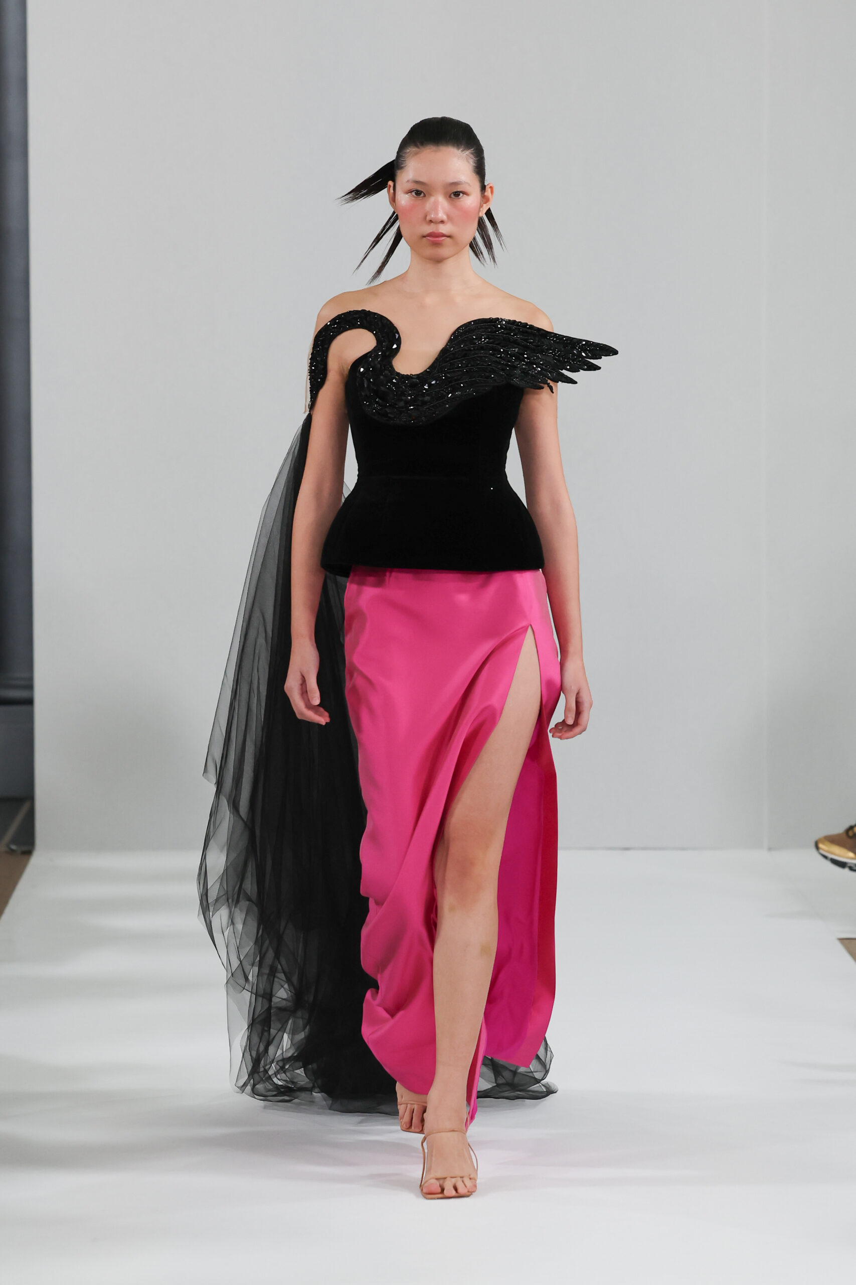 Le noir, couleur dominante, symbolise l’élégance et le mystère, tandis que le fuchsia évoque la passion et l’amour. L’or, omniprésent, représente la renaissance. Chaque silhouette, ornée d’ailes, invite celles qui les portent à se sentir protégées et puissantes.