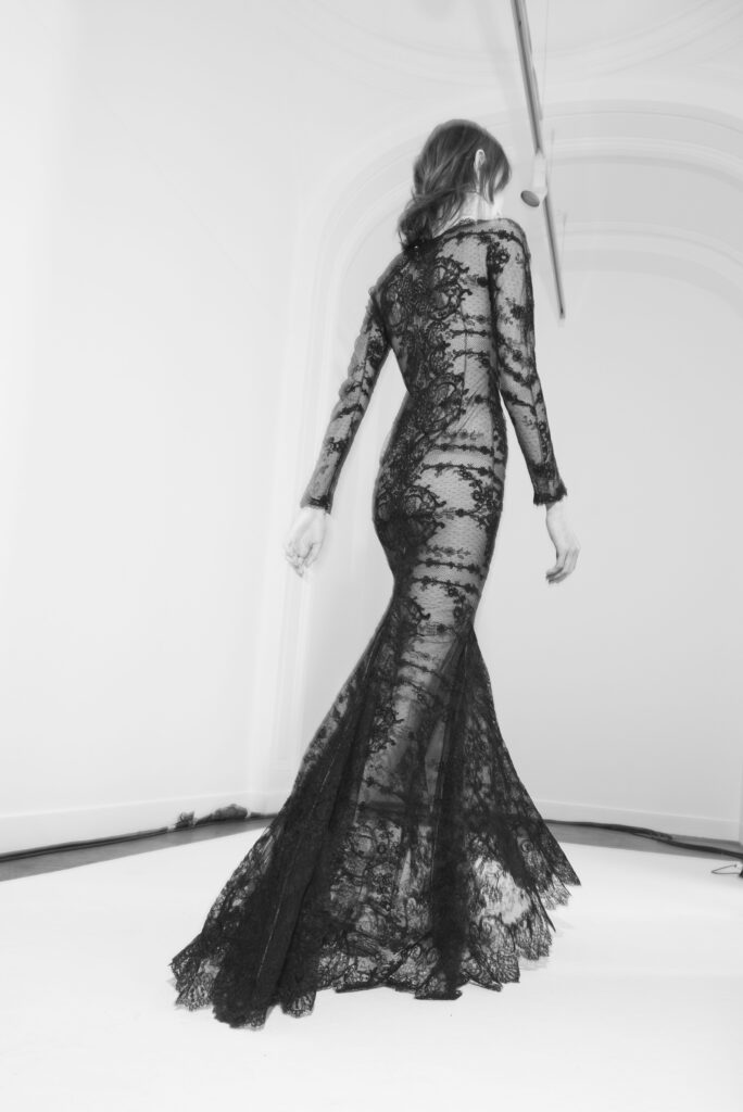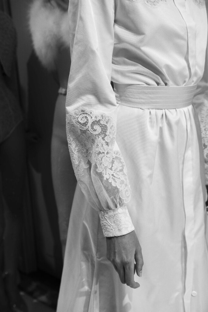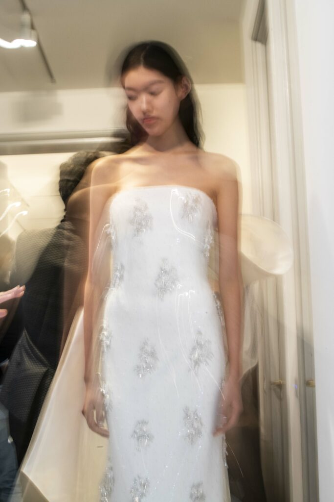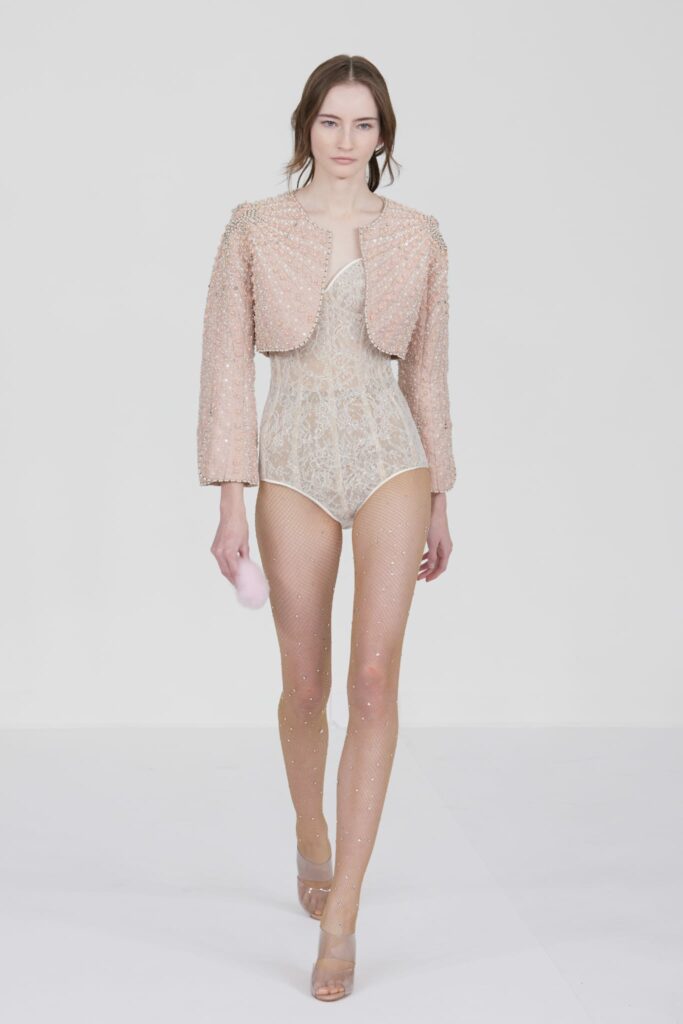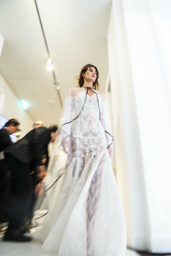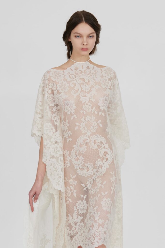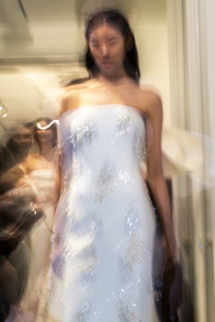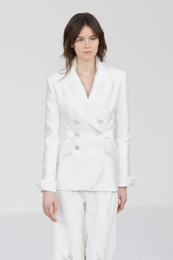 Le défilé s’ouvre sur une robe smoking en crêpe blanc, réhaussée de dentelle de Lyon et de boutons de nacre, établissant d’emblée le ton d’une élégance sobre mais sophistiquée. Cette approche se retrouve dans toute la collection, où la dentelle de Lyon, le satin, les cristaux, les nacres et les perles jouent un rôle prépondérant, apportant une touche de lumière et de raffinement à des silhouettes déjà empreintes de grâce.