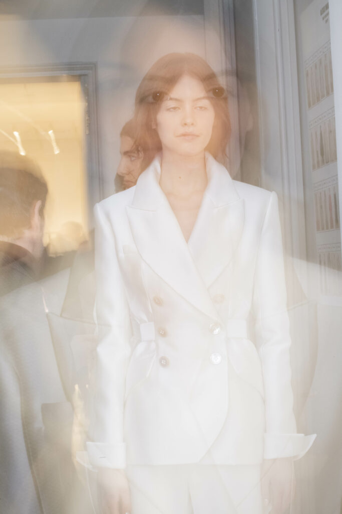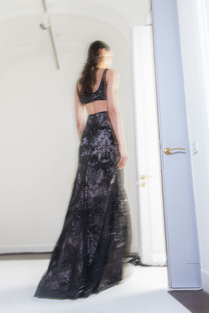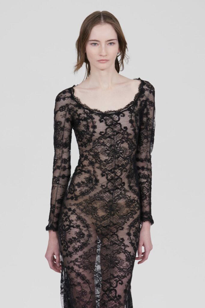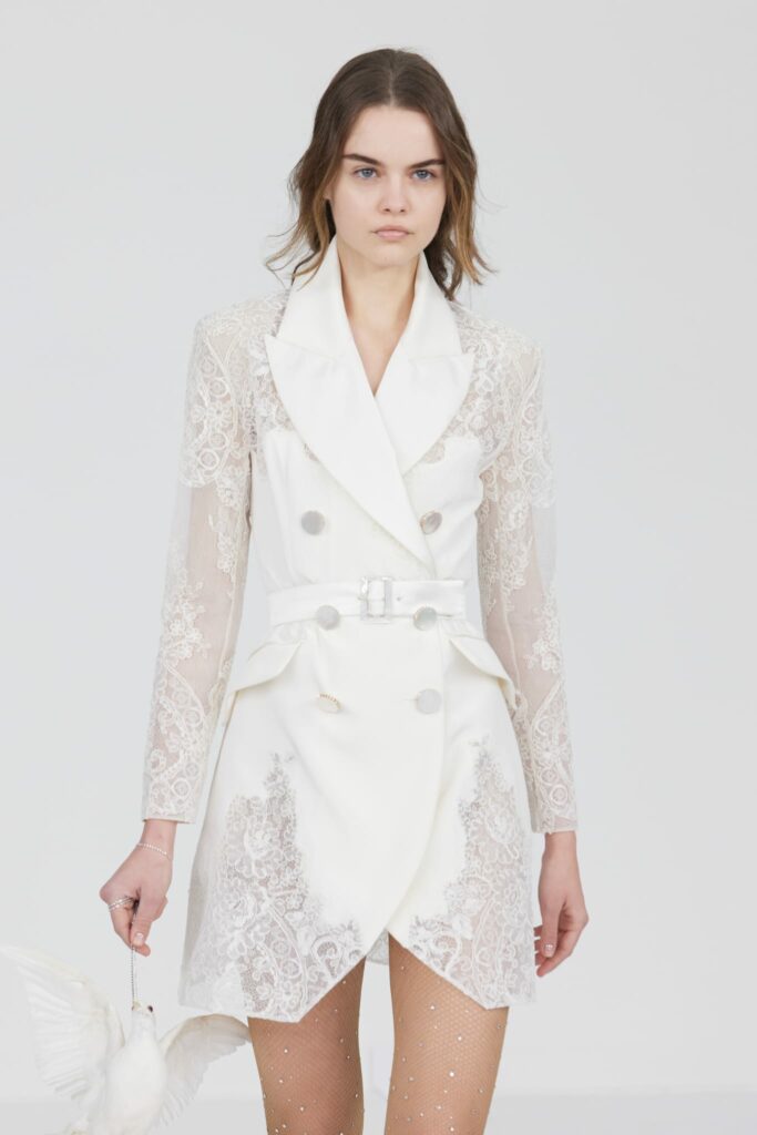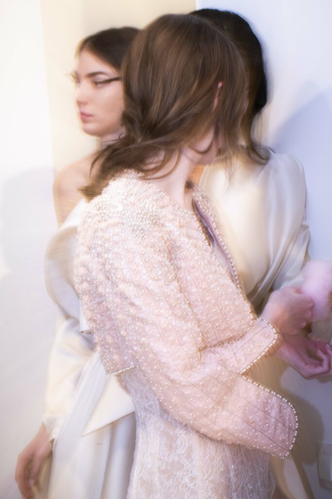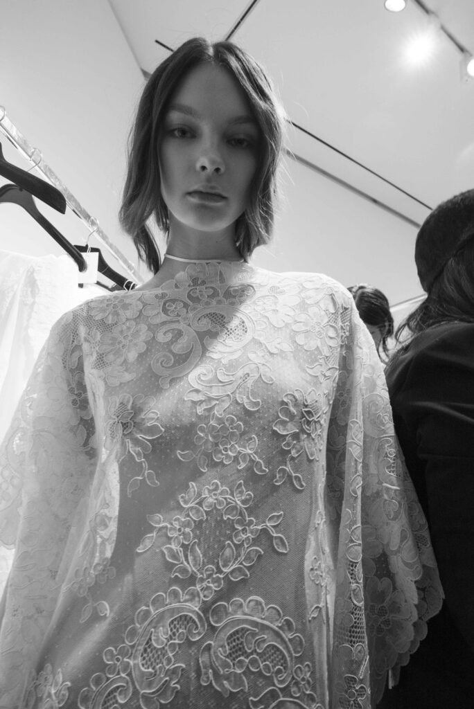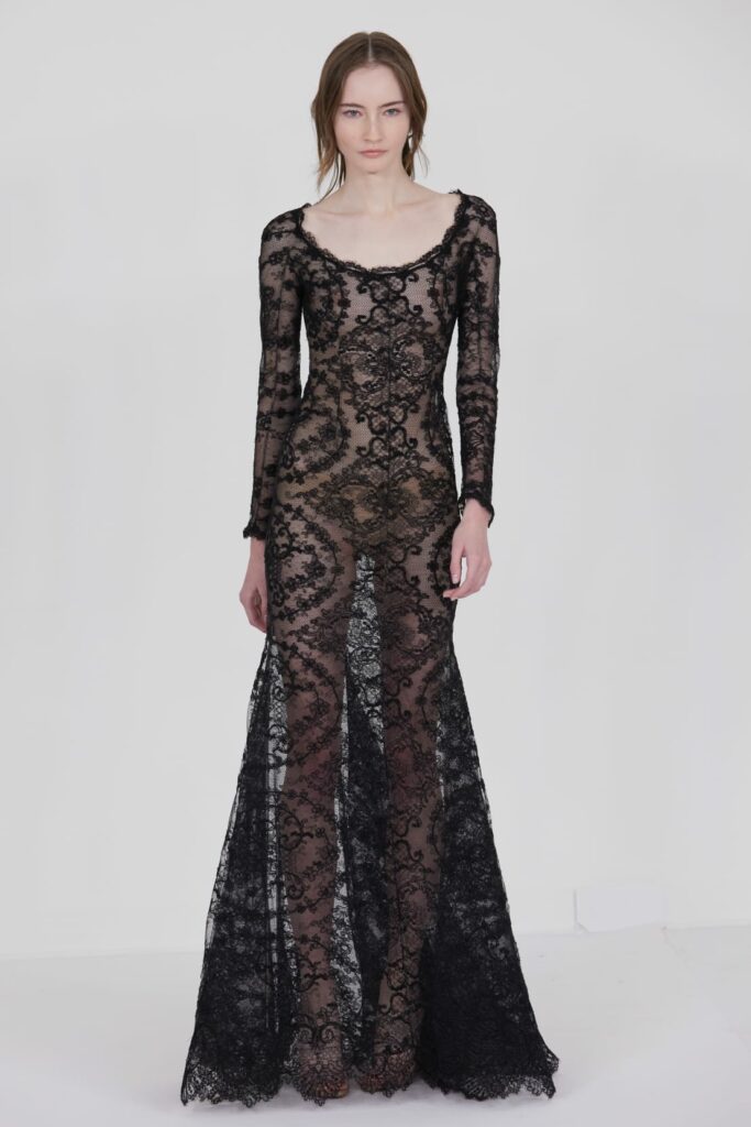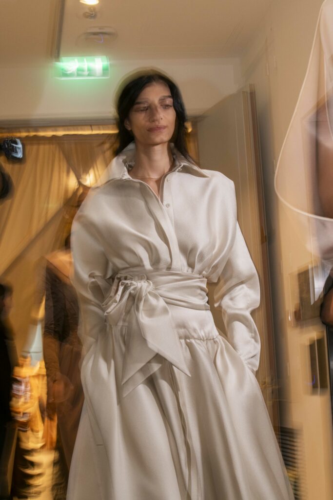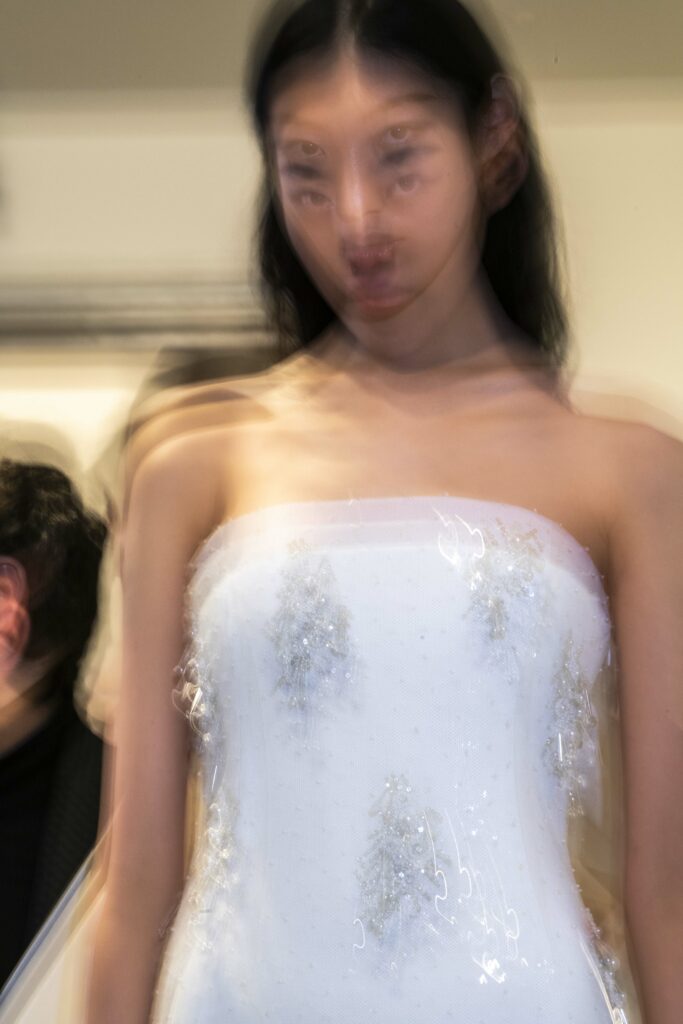 Le défilé s’ouvre sur une robe smoking en crêpe blanc, réhaussée de dentelle de Lyon et de boutons de nacre, établissant d’emblée le ton d’une élégance sobre mais sophistiquée. Cette approche se retrouve dans toute la collection, où la dentelle de Lyon, le satin, les cristaux, les nacres et les perles jouent un rôle prépondérant, apportant une touche de lumière et de raffinement à des silhouettes déjà empreintes de grâce.