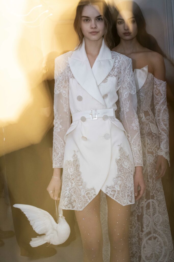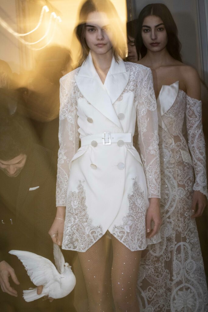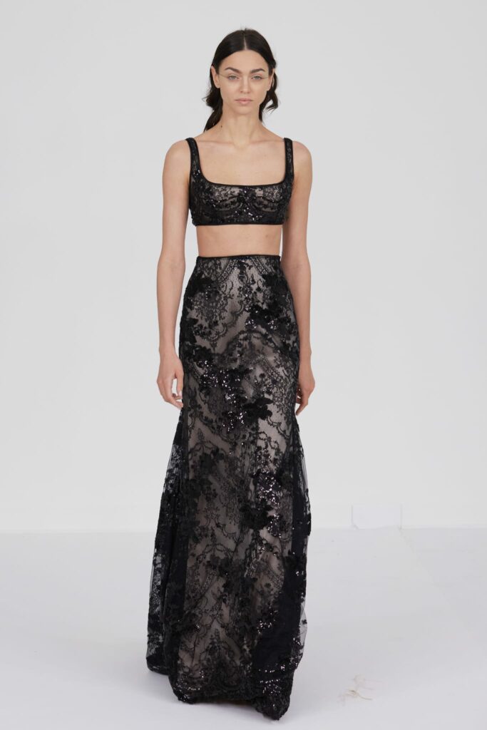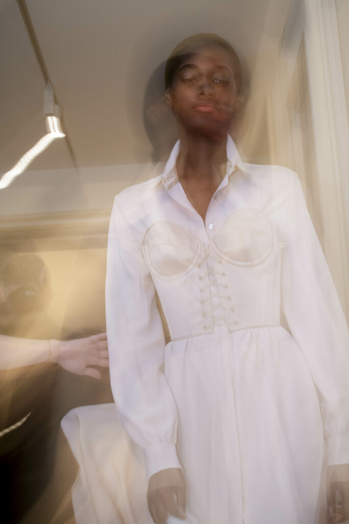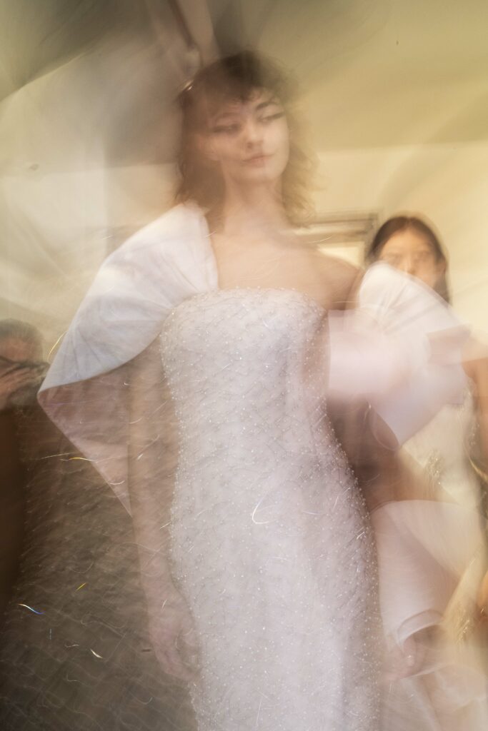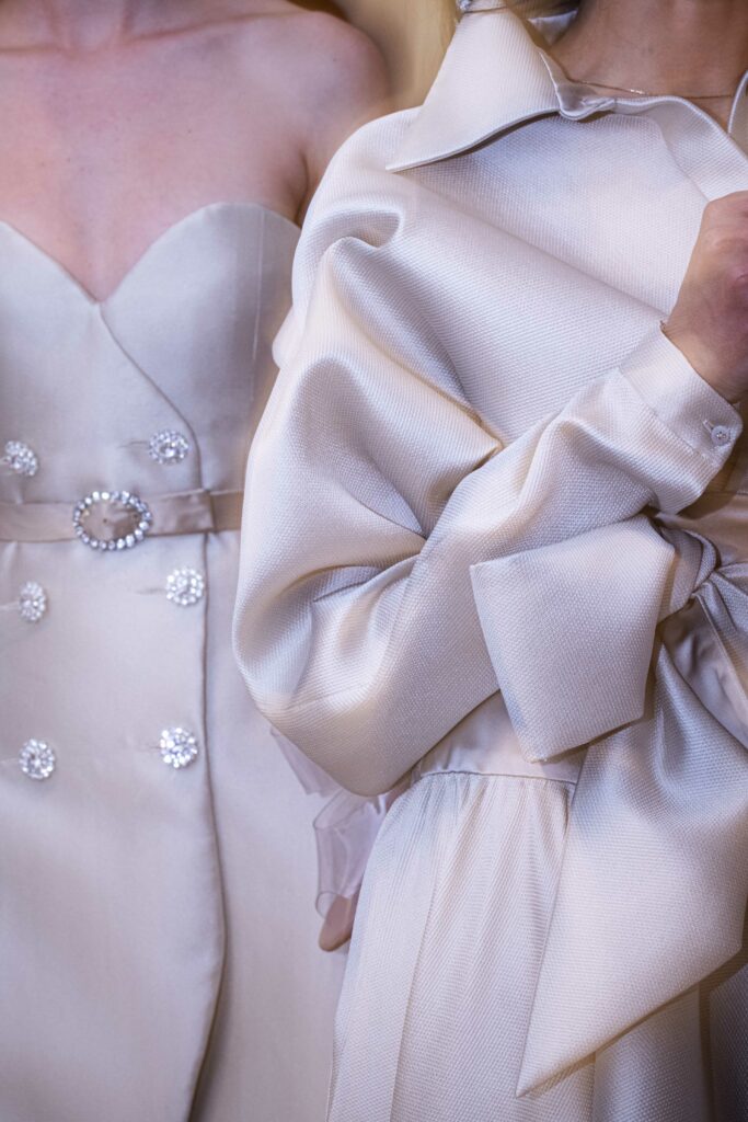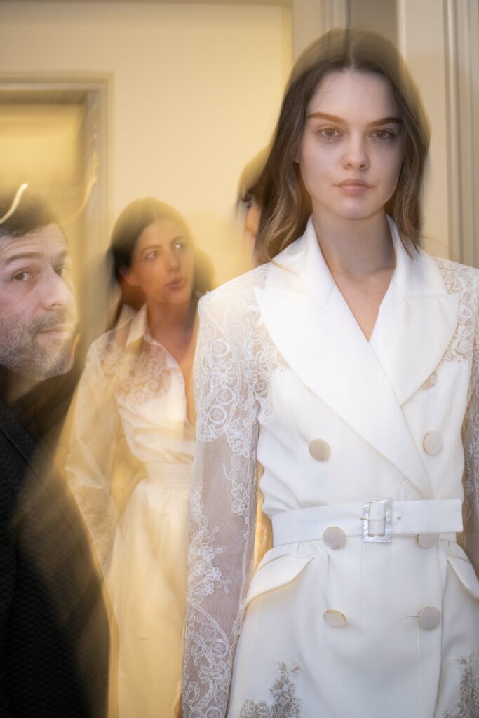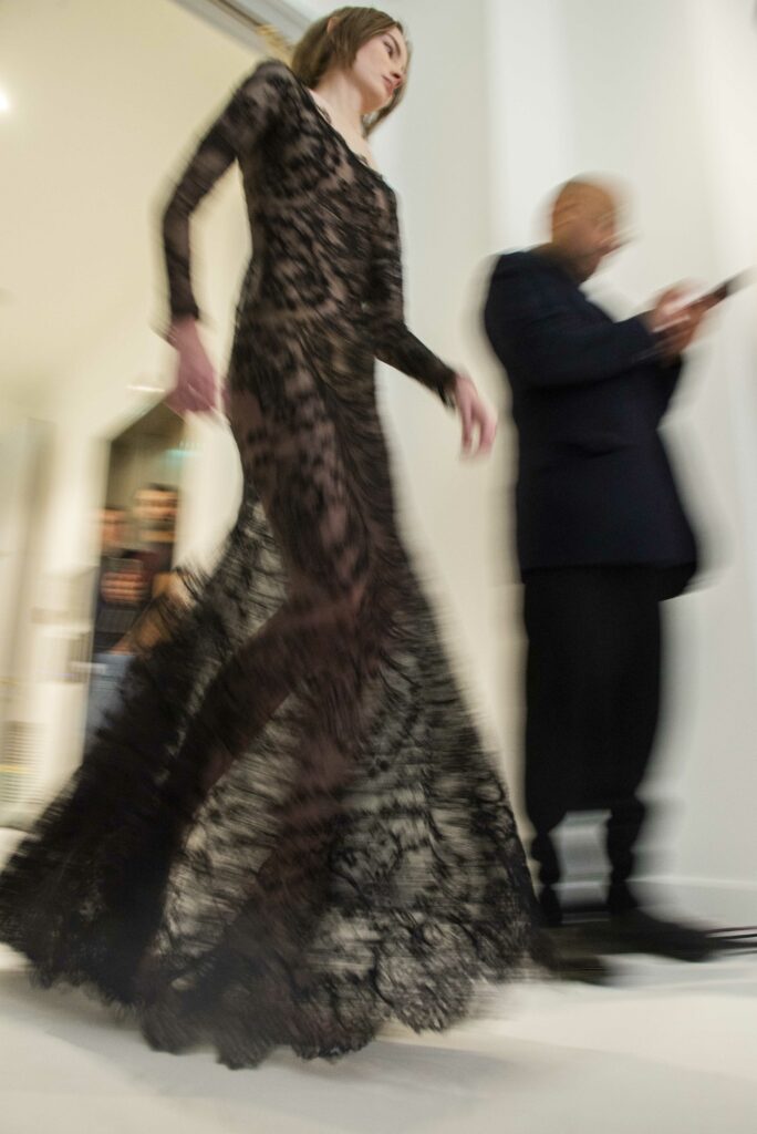 Le défilé s’ouvre sur une robe smoking en crêpe blanc, réhaussée de dentelle de Lyon et de boutons de nacre, établissant d’emblée le ton d’une élégance sobre mais sophistiquée. Cette approche se retrouve dans toute la collection, où la dentelle de Lyon, le satin, les cristaux, les nacres et les perles jouent un rôle prépondérant, apportant une touche de lumière et de raffinement à des silhouettes déjà empreintes de grâce.