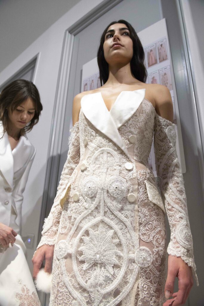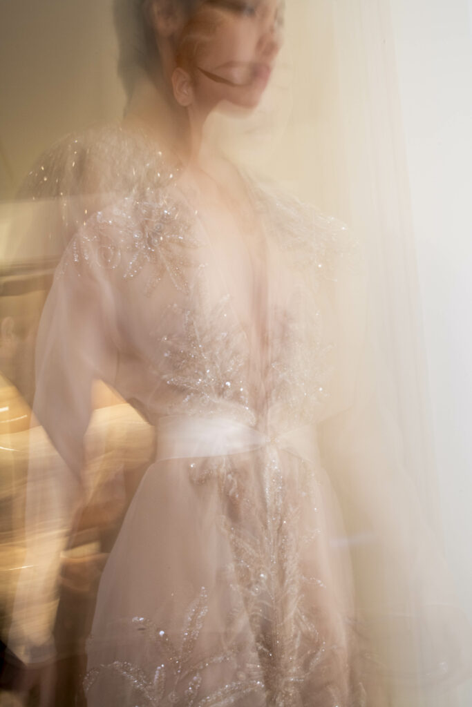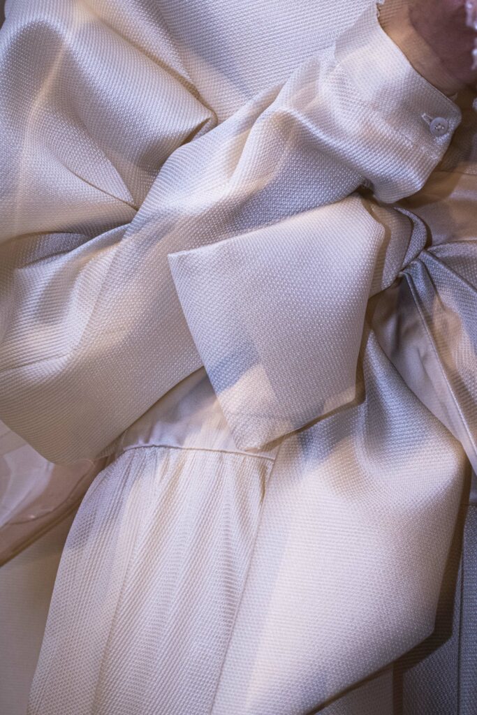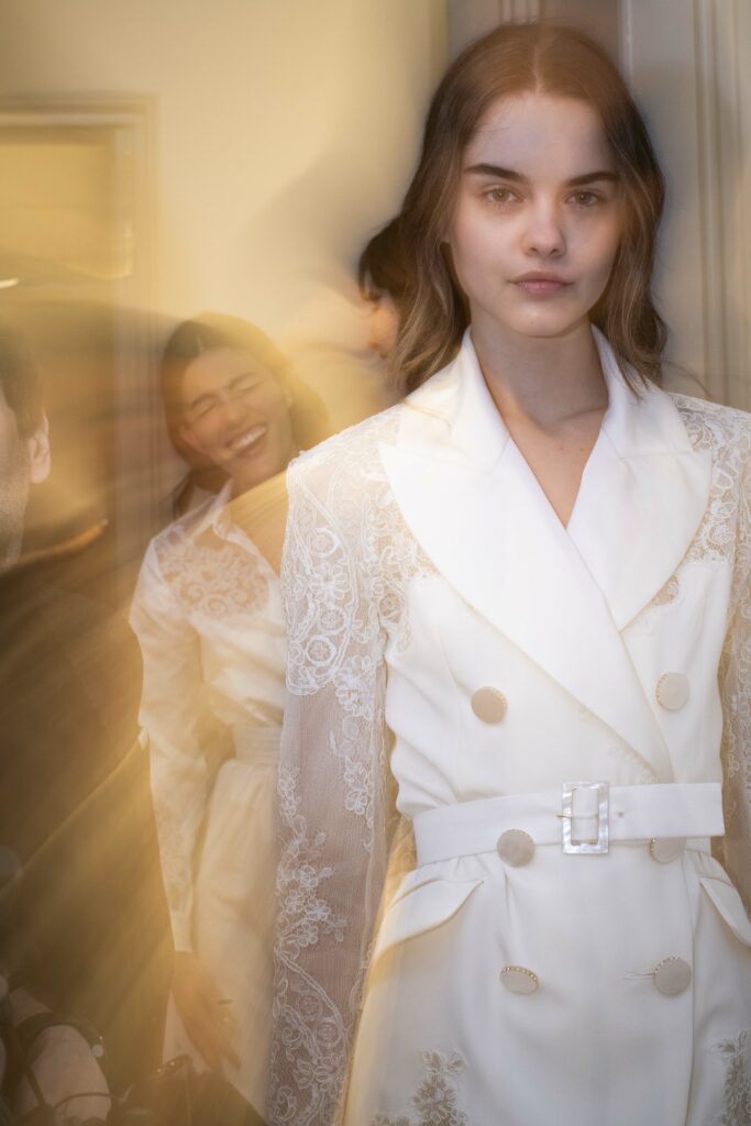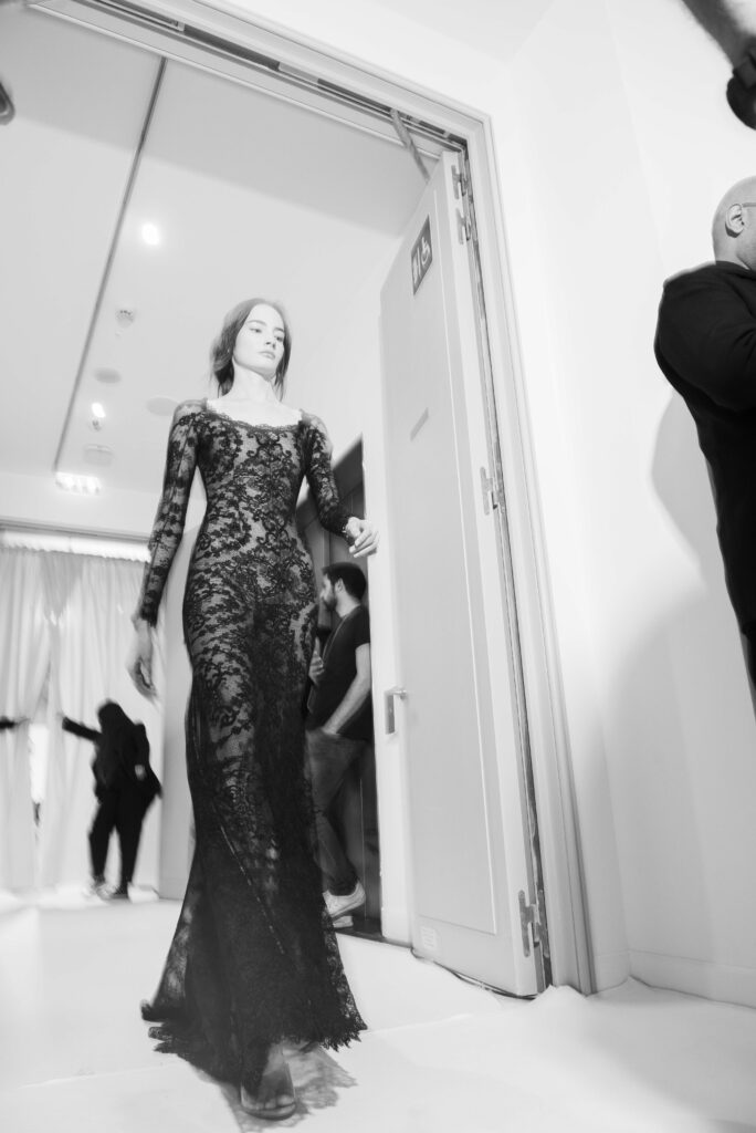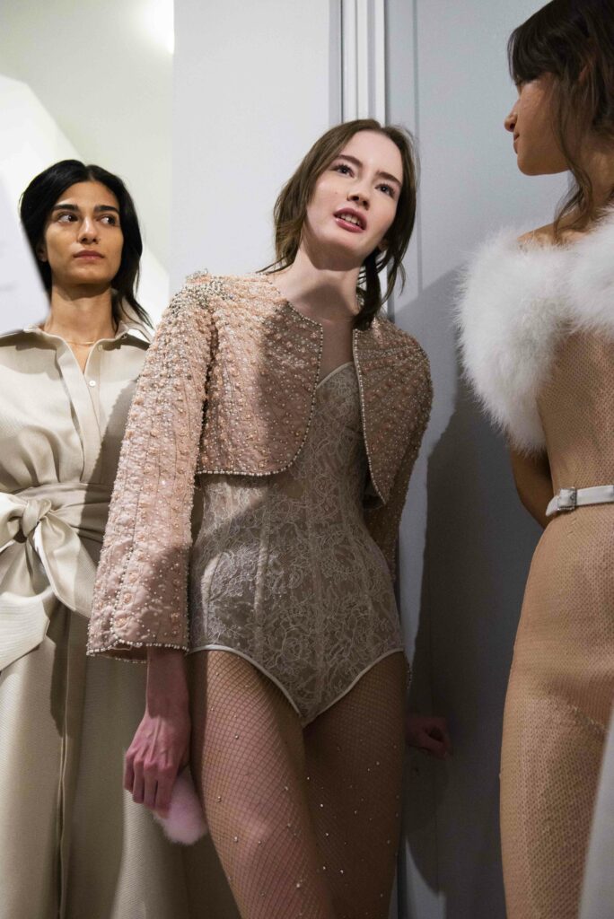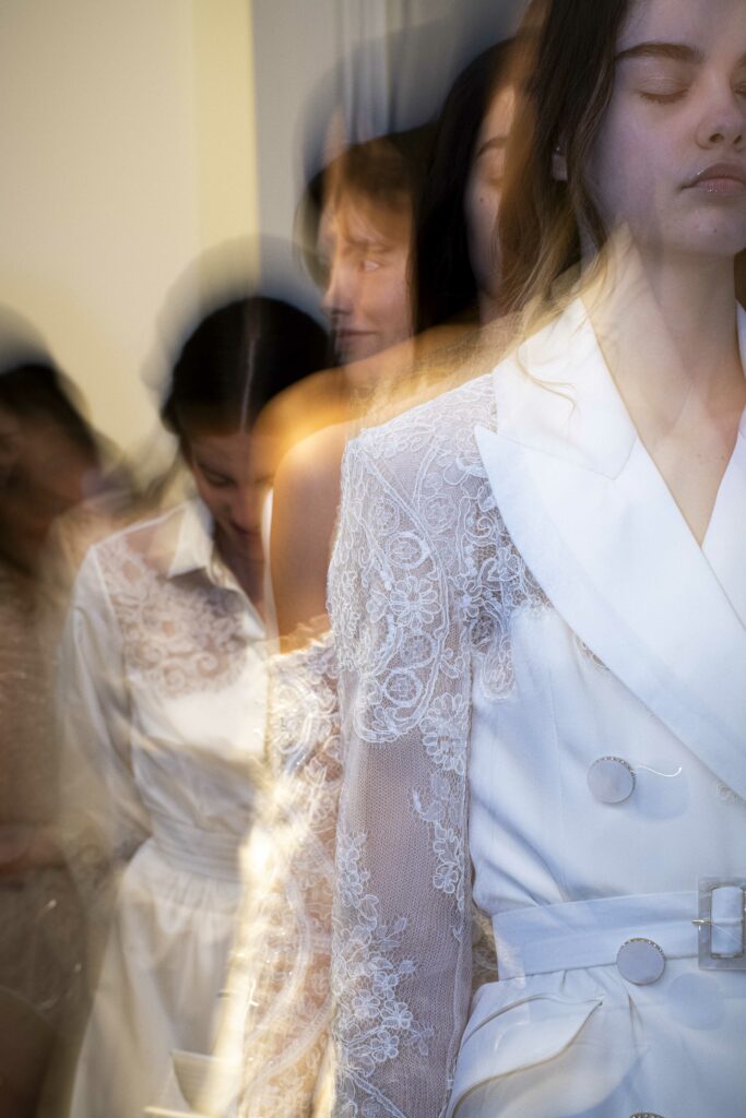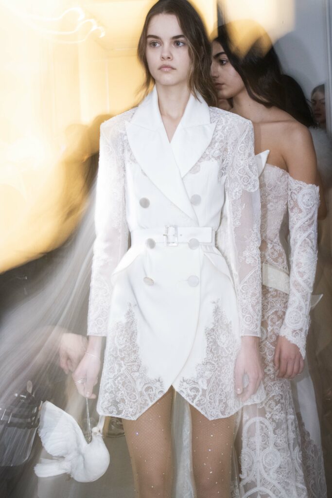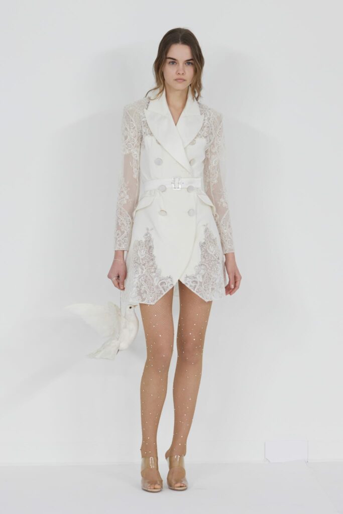 Le défilé s’ouvre sur une robe smoking en crêpe blanc, réhaussée de dentelle de Lyon et de boutons de nacre, établissant d’emblée le ton d’une élégance sobre mais sophistiquée. Cette approche se retrouve dans toute la collection, où la dentelle de Lyon, le satin, les cristaux, les nacres et les perles jouent un rôle prépondérant, apportant une touche de lumière et de raffinement à des silhouettes déjà empreintes de grâce.