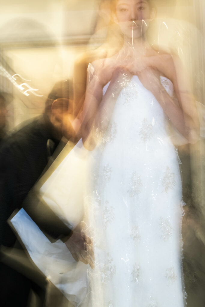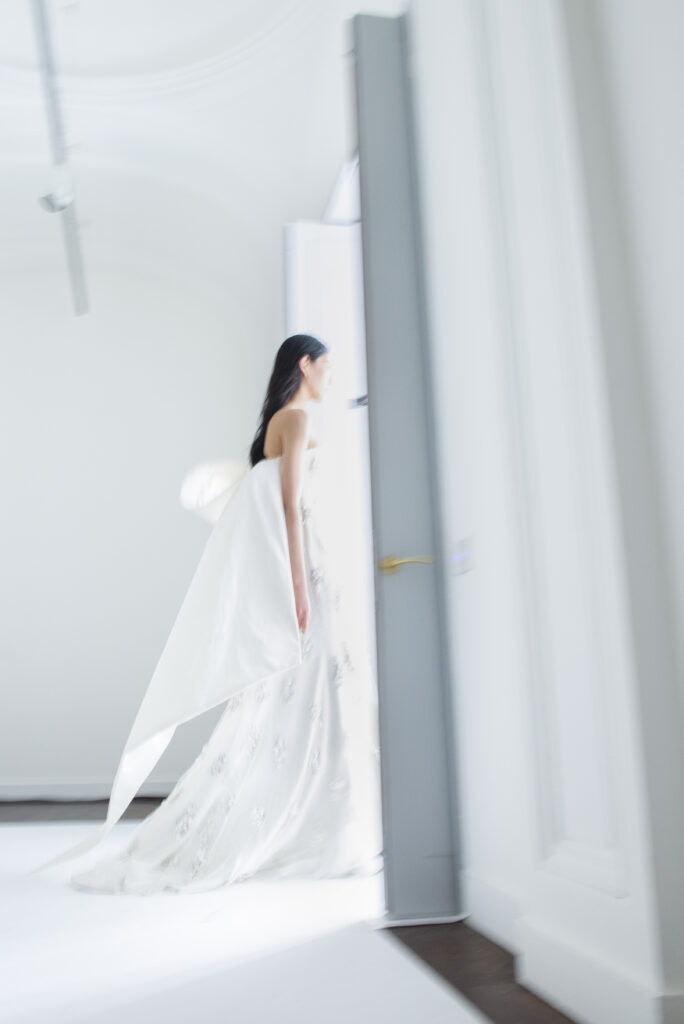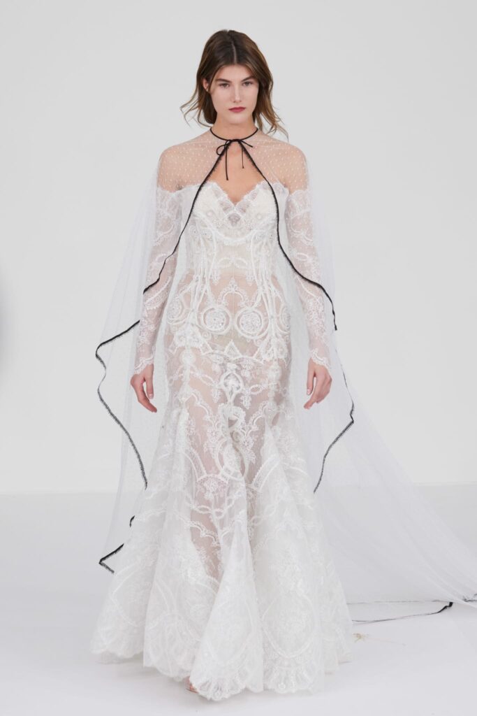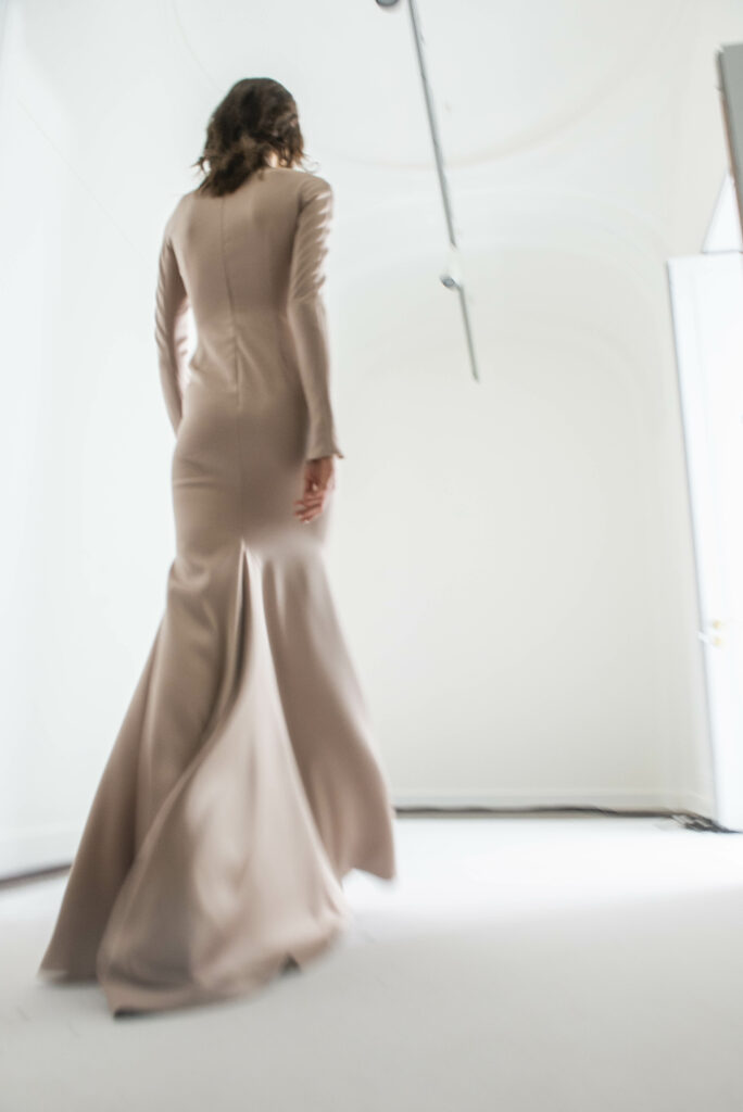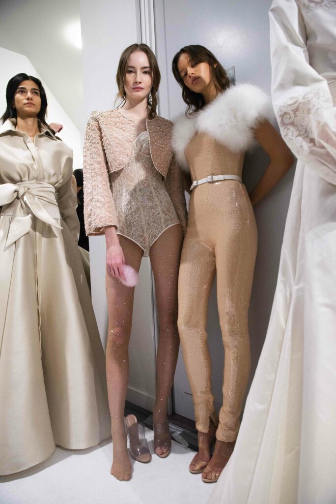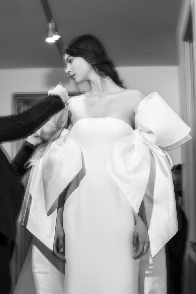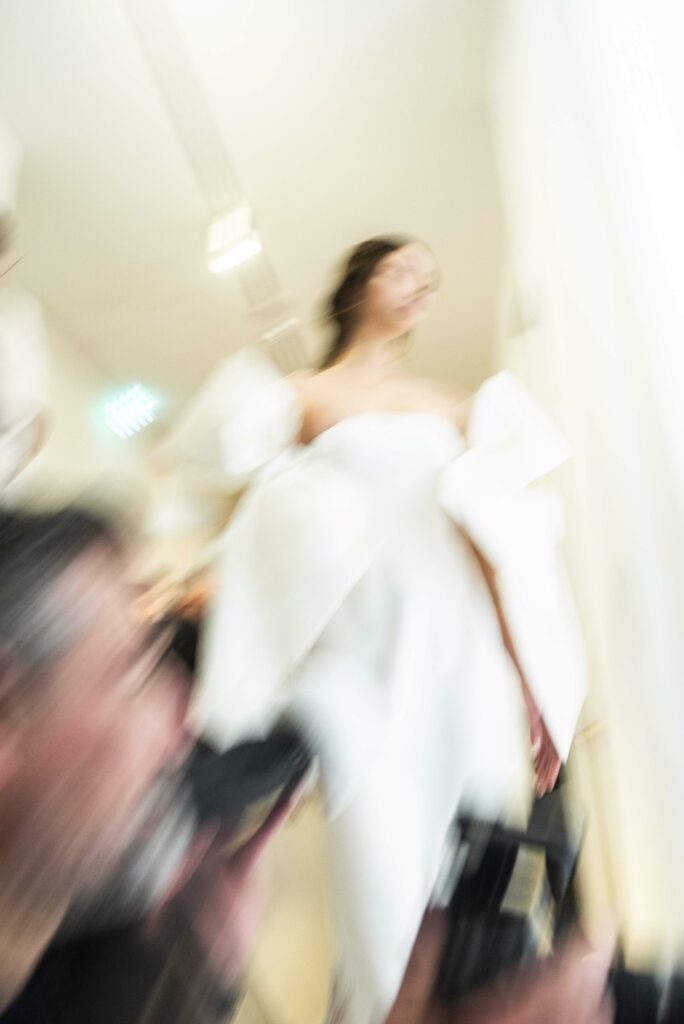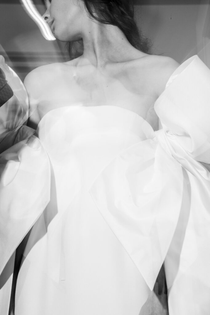 Le défilé s’ouvre sur une robe smoking en crêpe blanc, réhaussée de dentelle de Lyon et de boutons de nacre, établissant d’emblée le ton d’une élégance sobre mais sophistiquée. Cette approche se retrouve dans toute la collection, où la dentelle de Lyon, le satin, les cristaux, les nacres et les perles jouent un rôle prépondérant, apportant une touche de lumière et de raffinement à des silhouettes déjà empreintes de grâce.