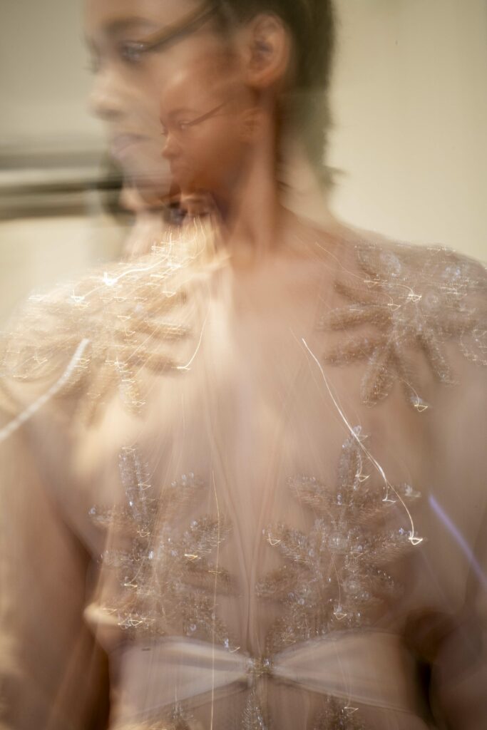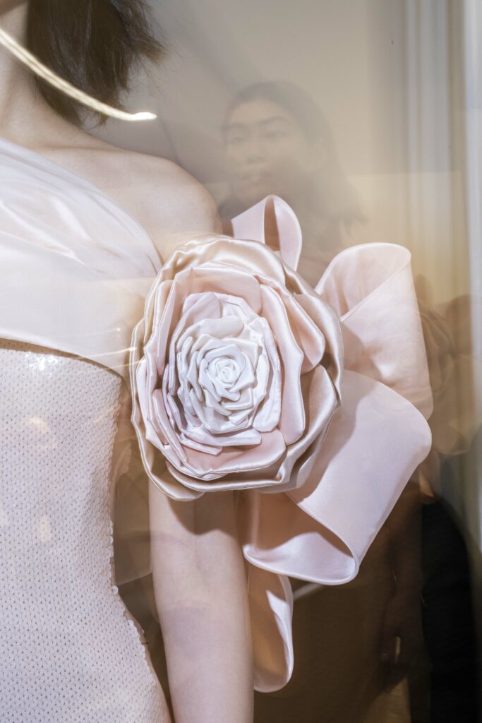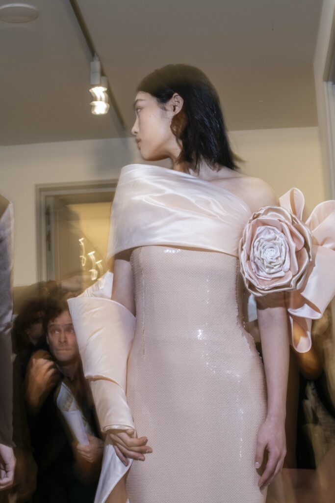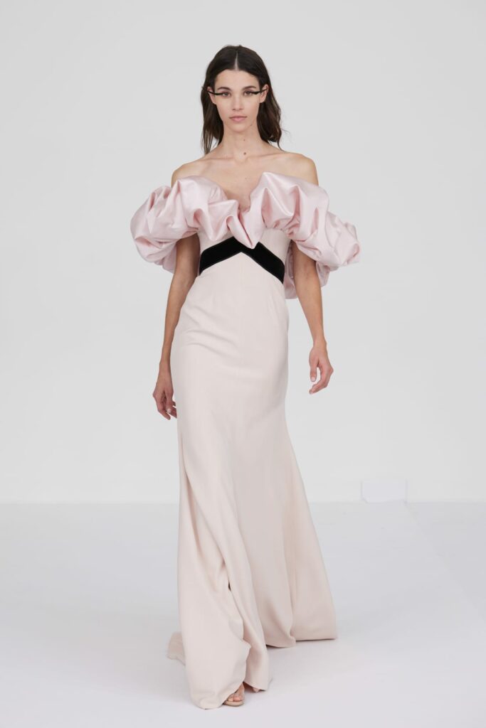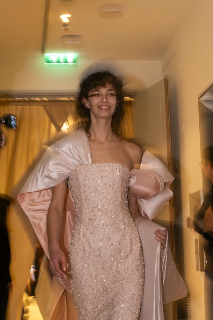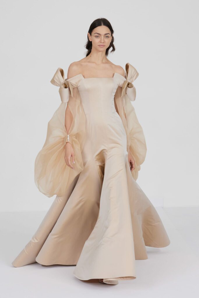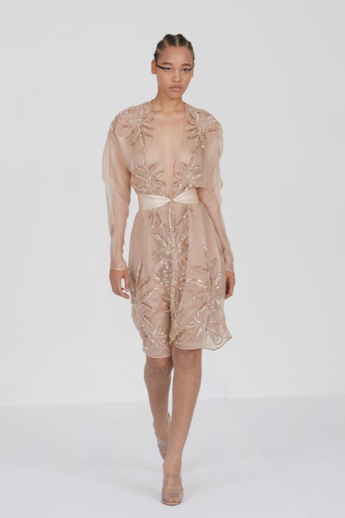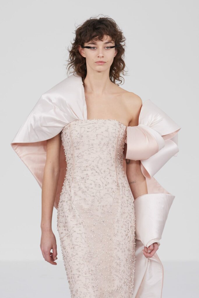 L’un des moments forts de la collection est sans doute la robe à manches chauve-souris en organza-satin rosé, délicatement rebrodée de fleurs et de feuillages en perles or rose. Cette pièce illustre la capacité de Mabille à créer des vêtements qui captent la lumière et l’attention, enveloppant la porteuse dans un éclat subtil qui transcende les simples atours pour toucher à l’essence même de sa personnalité.