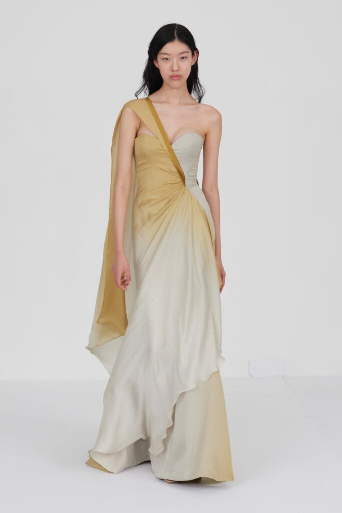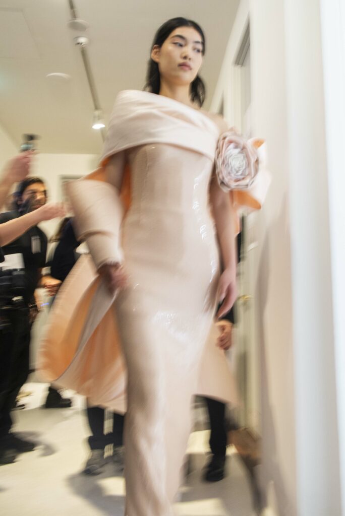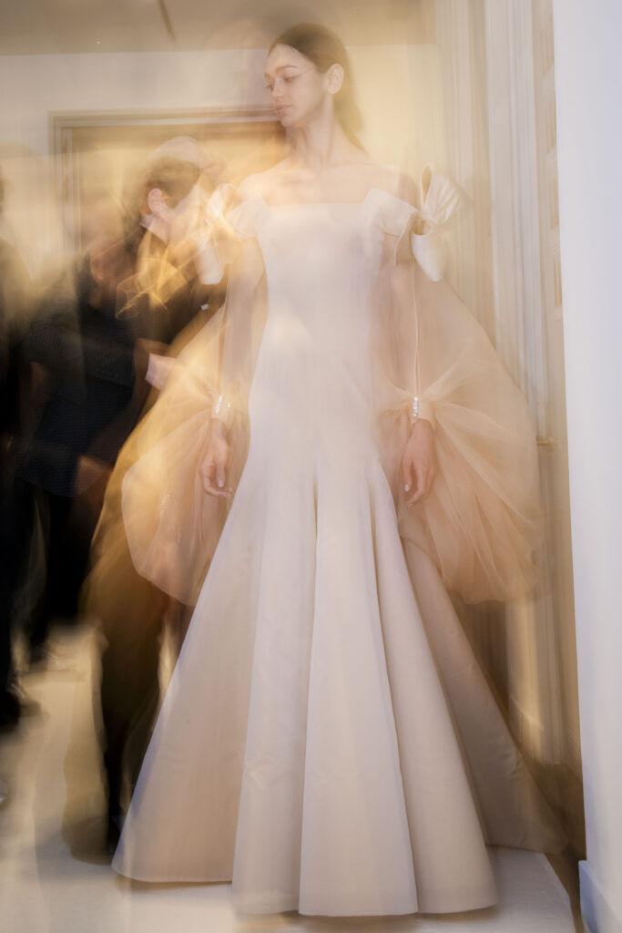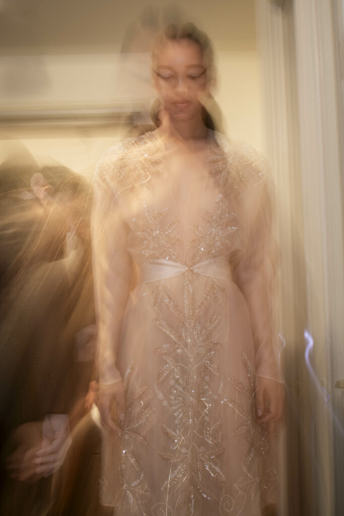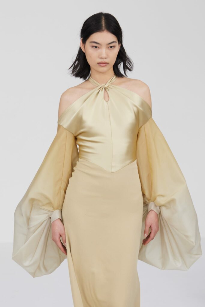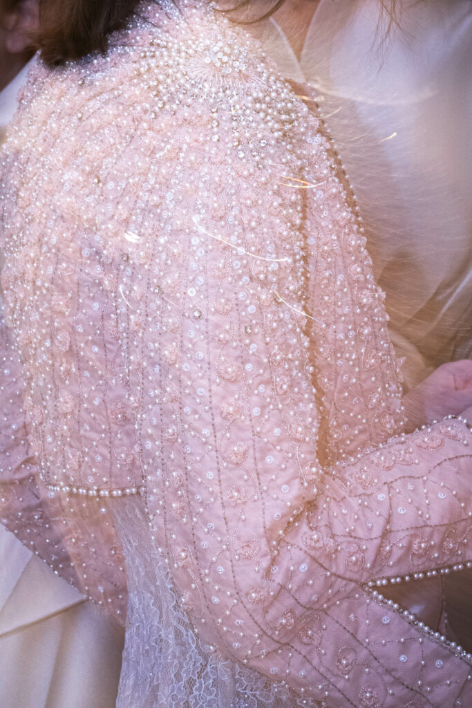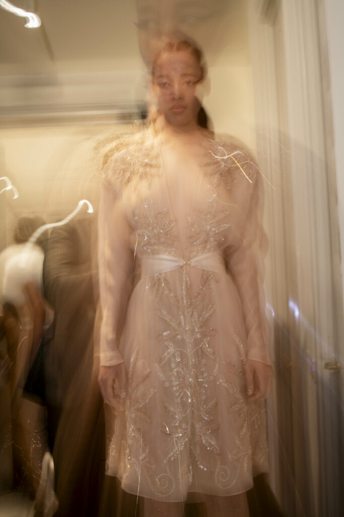 L’un des moments forts de la collection est sans doute la robe à manches chauve-souris en organza-satin rosé, délicatement rebrodée de fleurs et de feuillages en perles or rose. Cette pièce illustre la capacité de Mabille à créer des vêtements qui captent la lumière et l’attention, enveloppant la porteuse dans un éclat subtil qui transcende les simples atours pour toucher à l’essence même de sa personnalité.