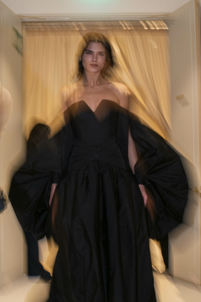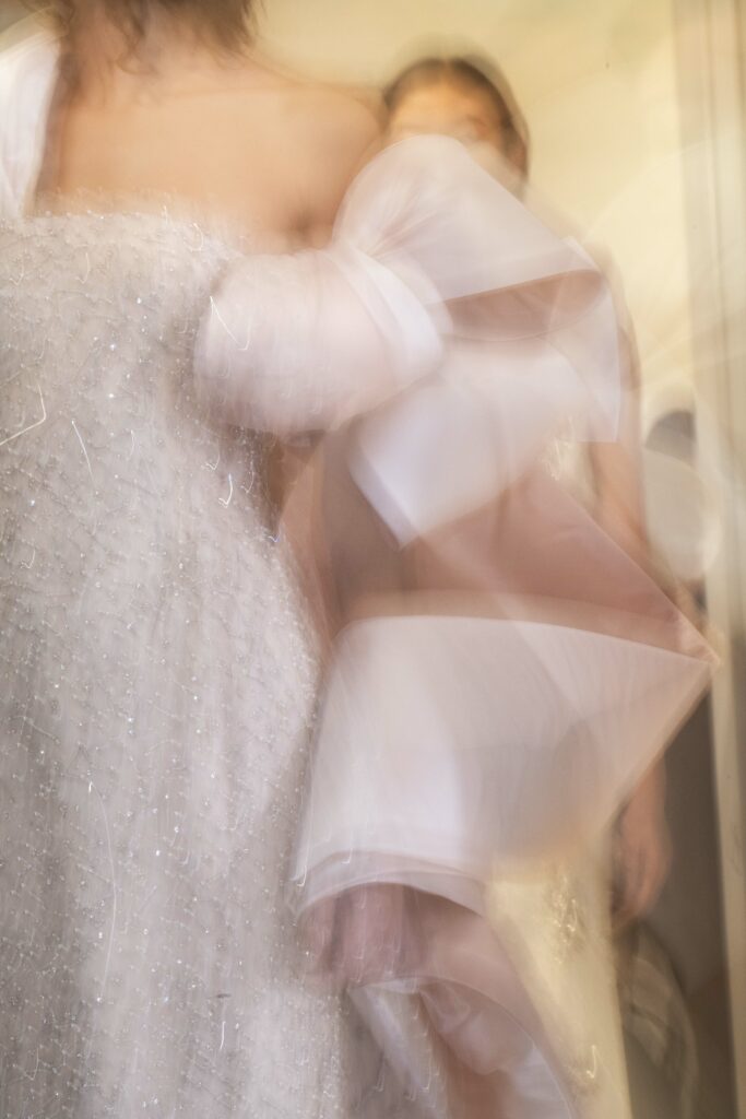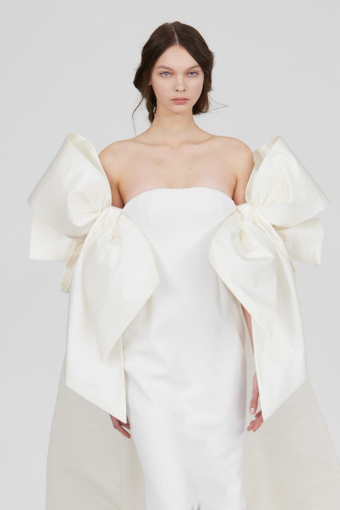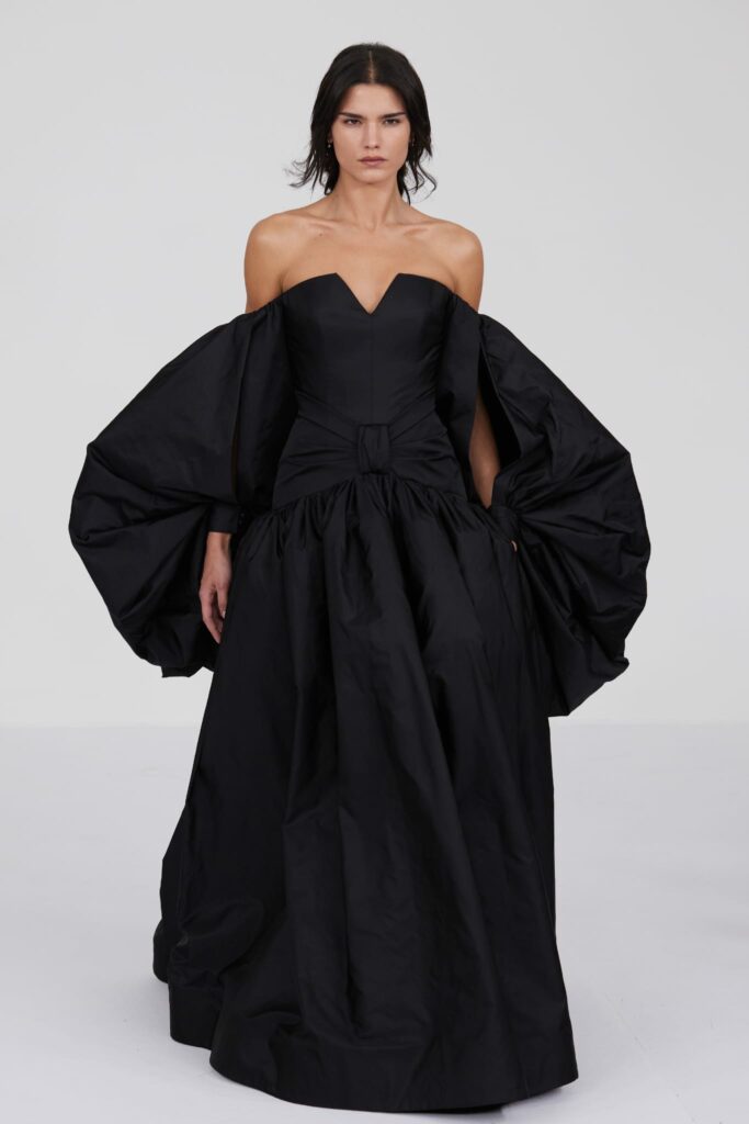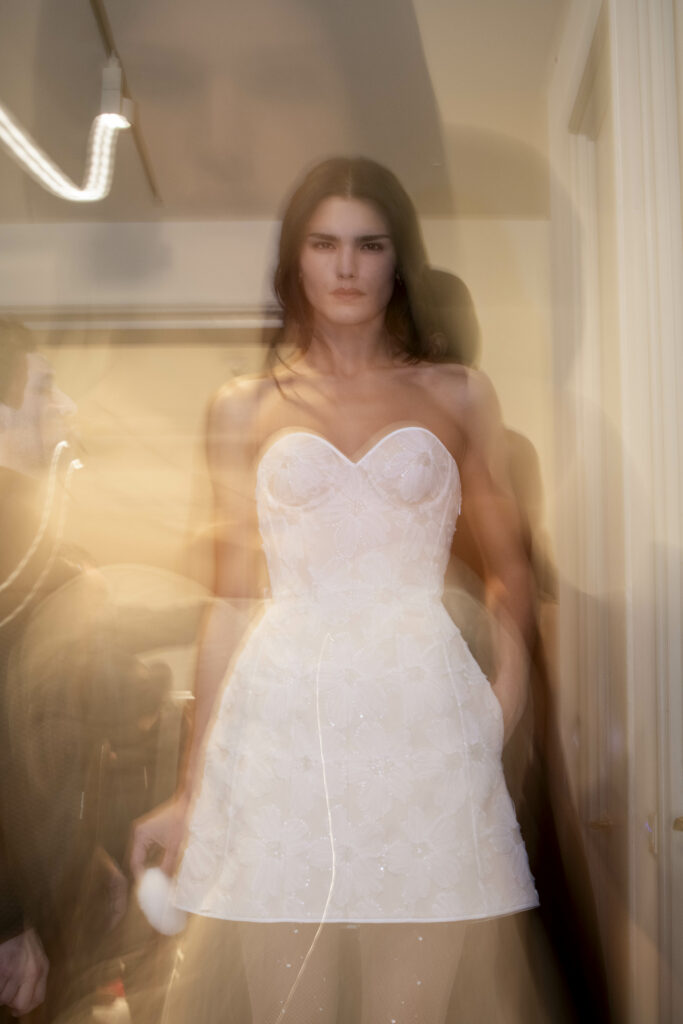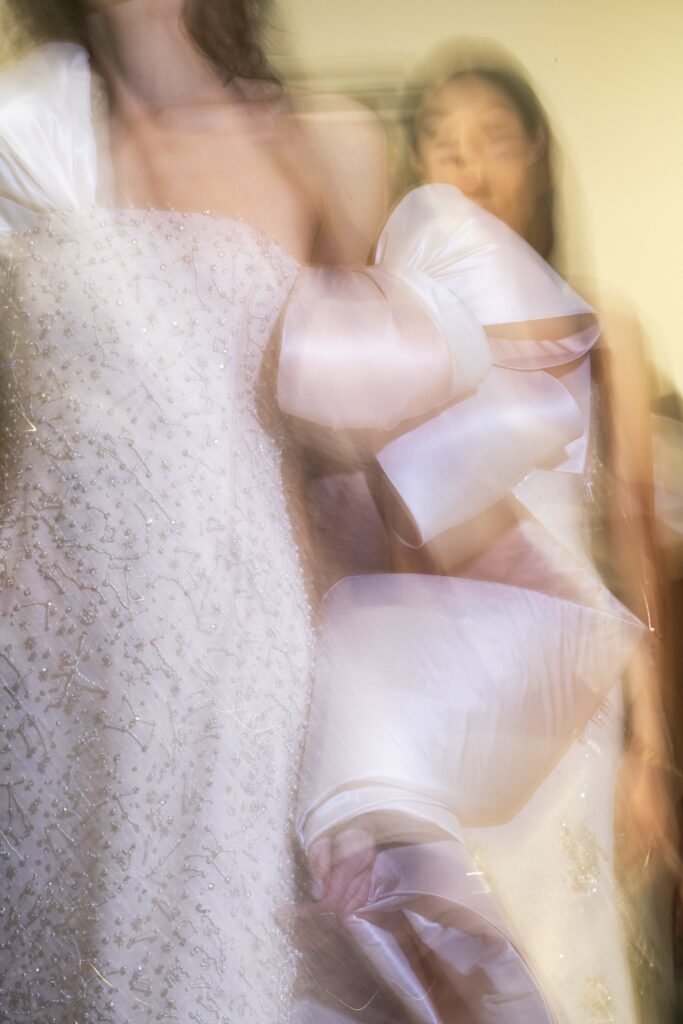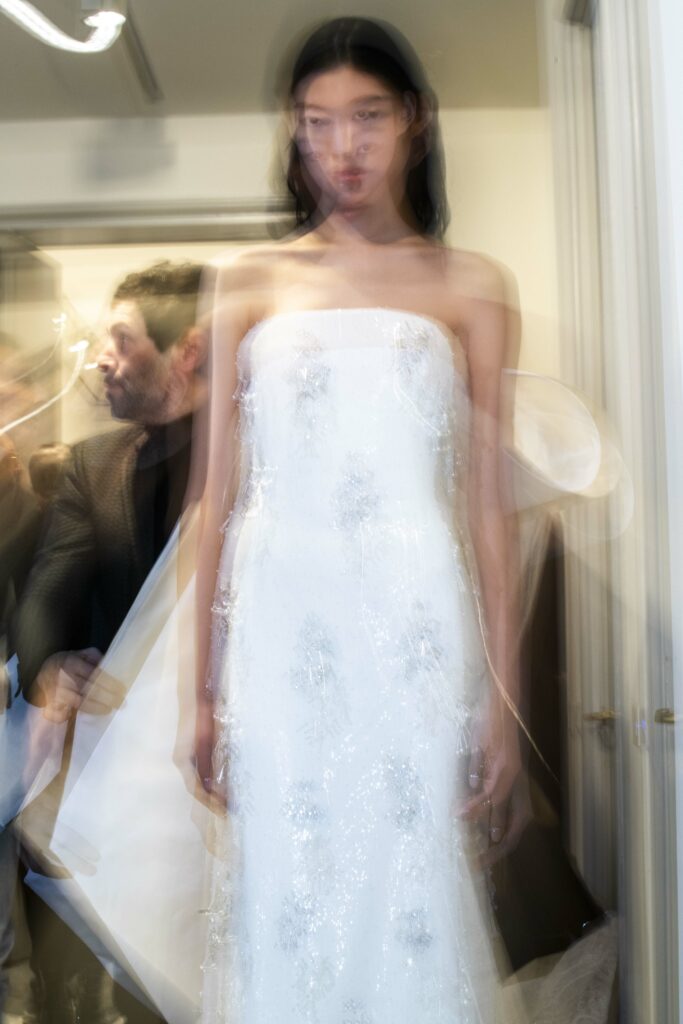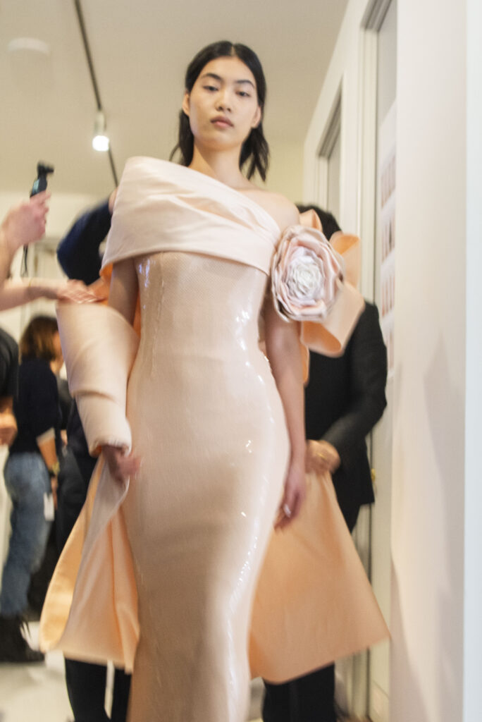 L’un des moments forts de la collection est sans doute la robe à manches chauve-souris en organza-satin rosé, délicatement rebrodée de fleurs et de feuillages en perles or rose. Cette pièce illustre la capacité de Mabille à créer des vêtements qui captent la lumière et l’attention, enveloppant la porteuse dans un éclat subtil qui transcende les simples atours pour toucher à l’essence même de sa personnalité.