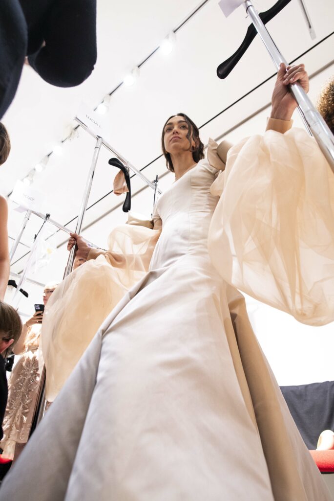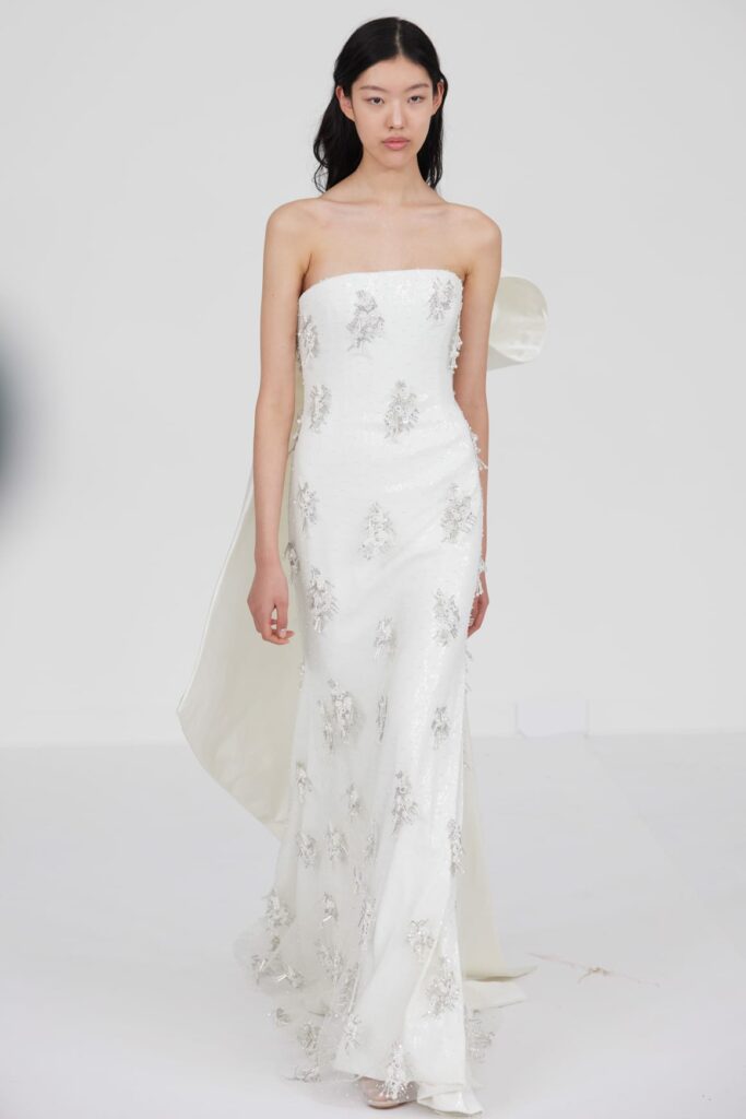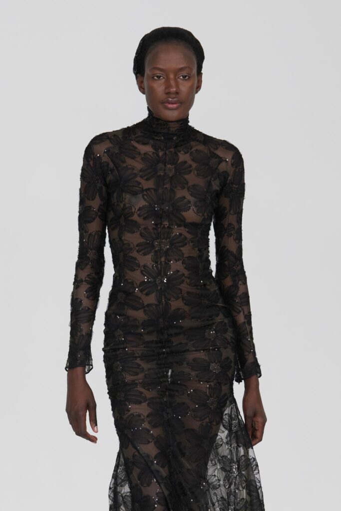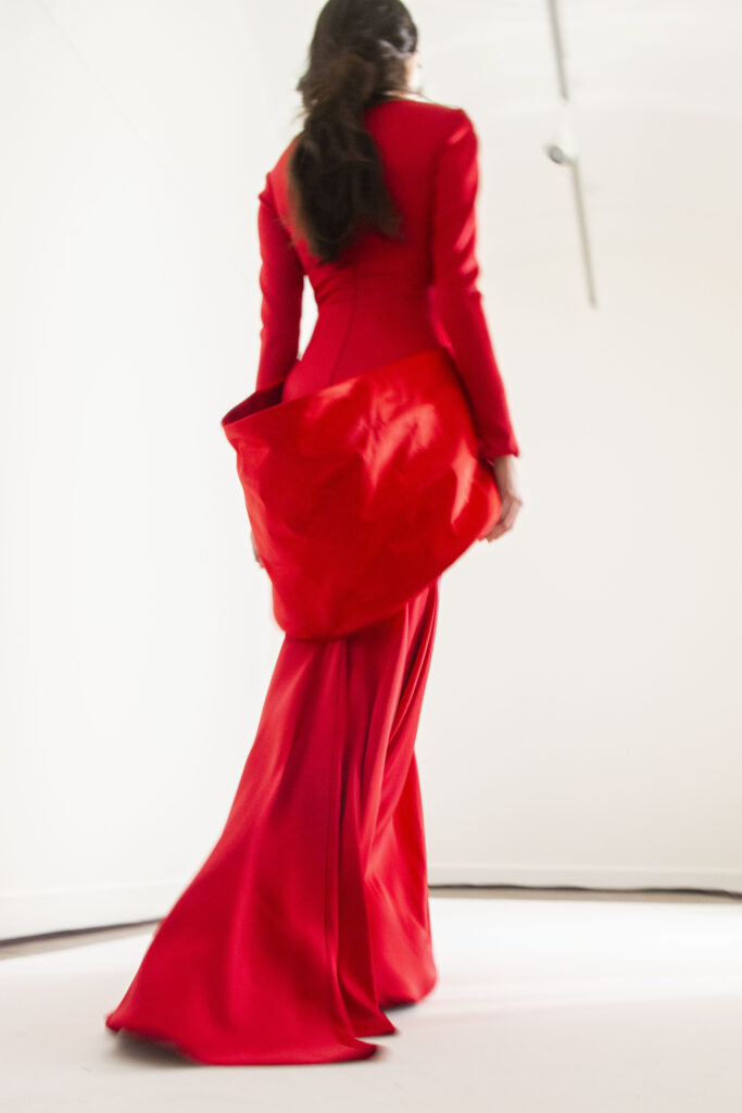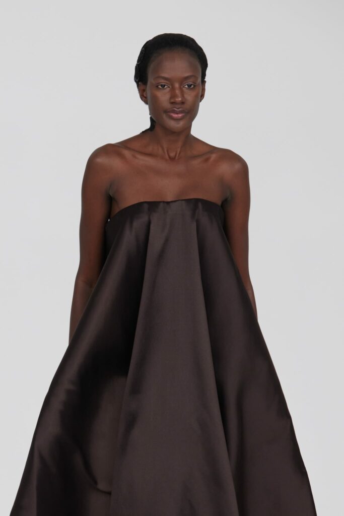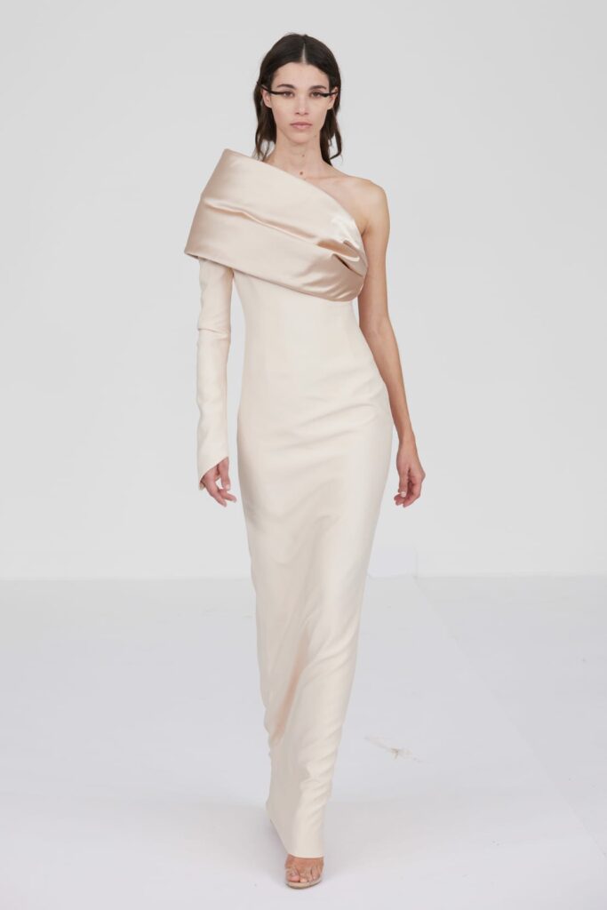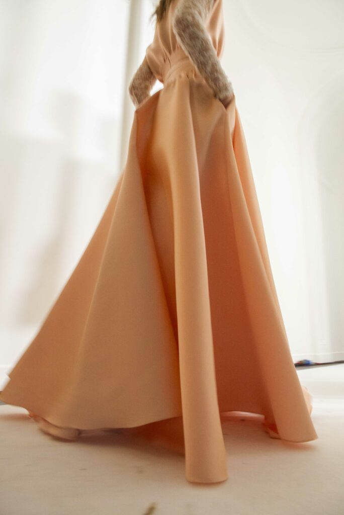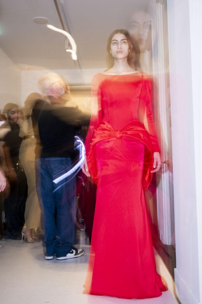 L’un des moments forts de la collection est sans doute la robe à manches chauve-souris en organza-satin rosé, délicatement rebrodée de fleurs et de feuillages en perles or rose. Cette pièce illustre la capacité de Mabille à créer des vêtements qui captent la lumière et l’attention, enveloppant la porteuse dans un éclat subtil qui transcende les simples atours pour toucher à l’essence même de sa personnalité.