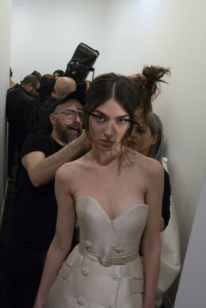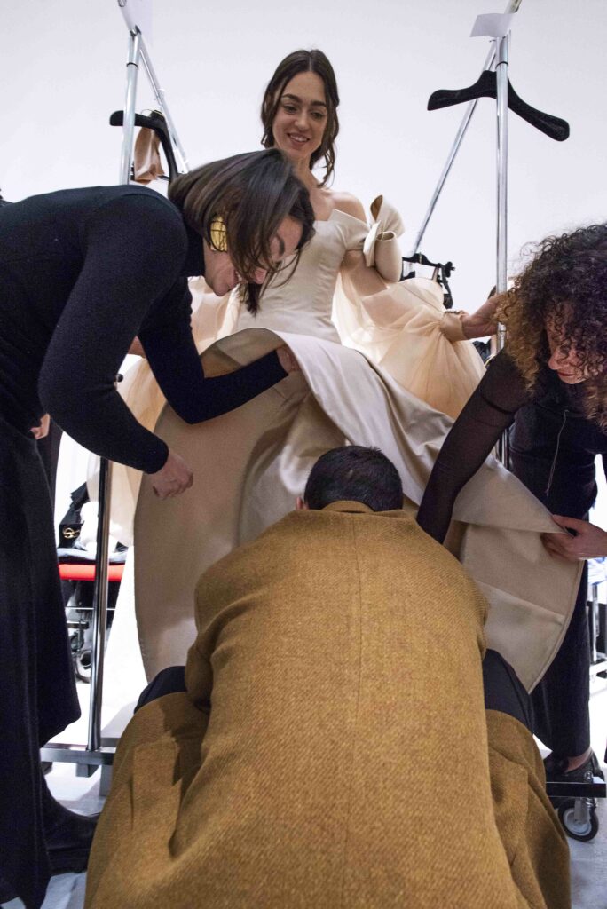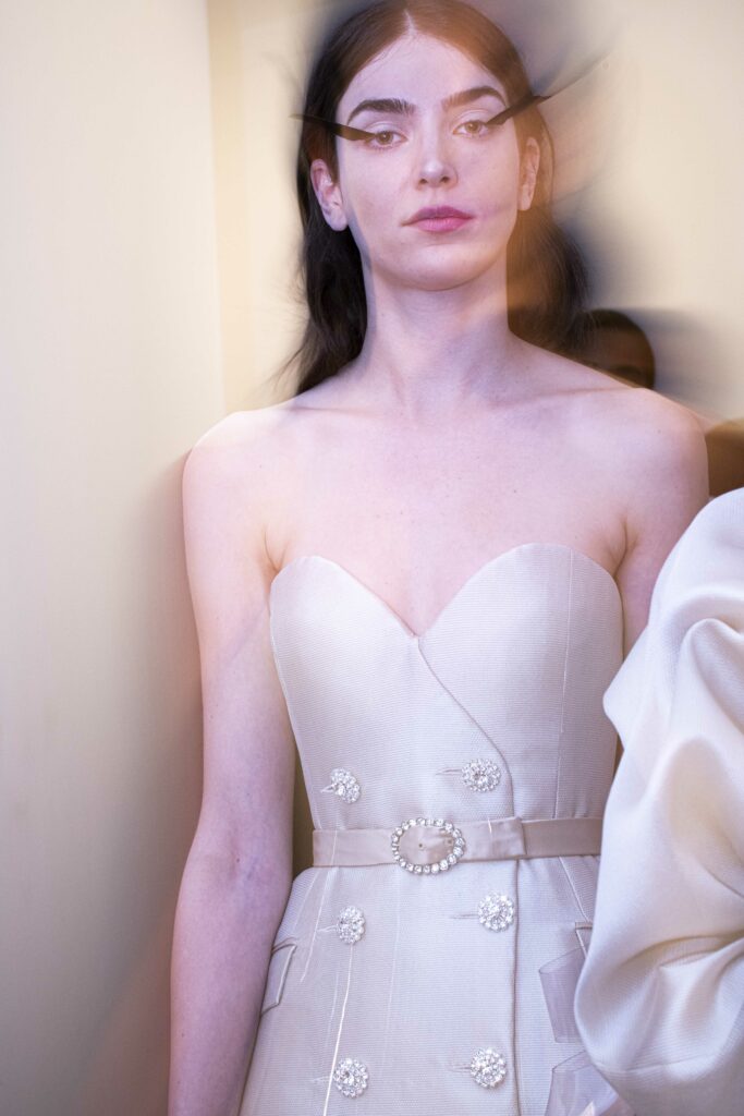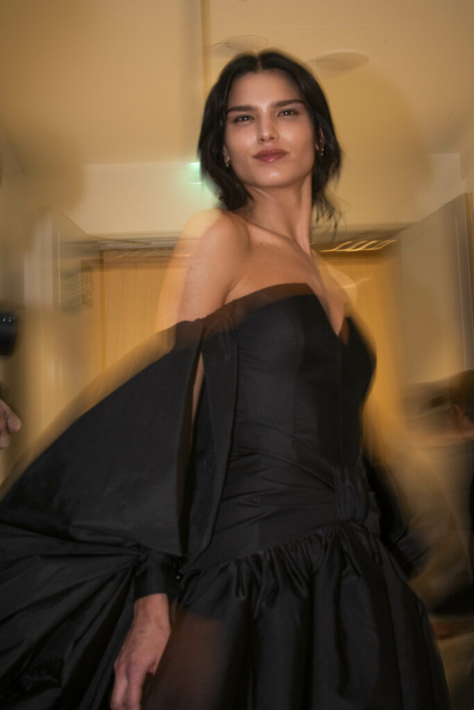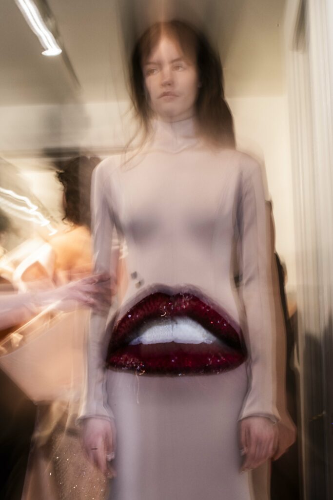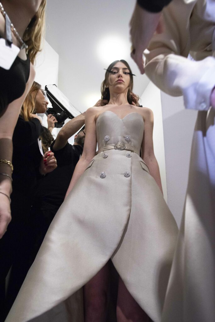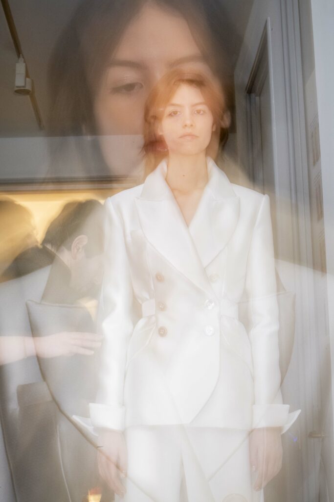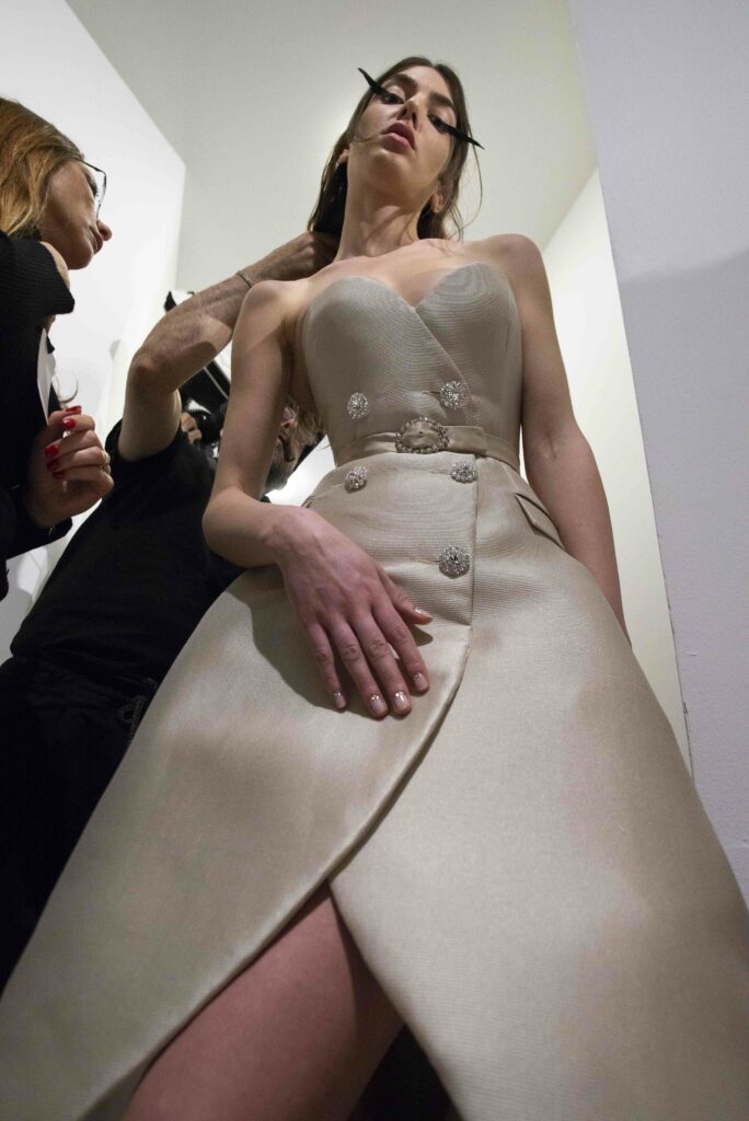 La collaboration avec des artistes de renom tels que Lloyd Simmonds pour le maquillage et Beppe D’Elia pour la coiffure souligne l’importance de chaque détail dans l’élaboration de cette collection. Le son d’Emmanuel Caurel et le casting par Coco Liscia ajoutent une autre dimension à l’expérience, en harmonisant parfaitement l’audiovisuel avec le visuel.