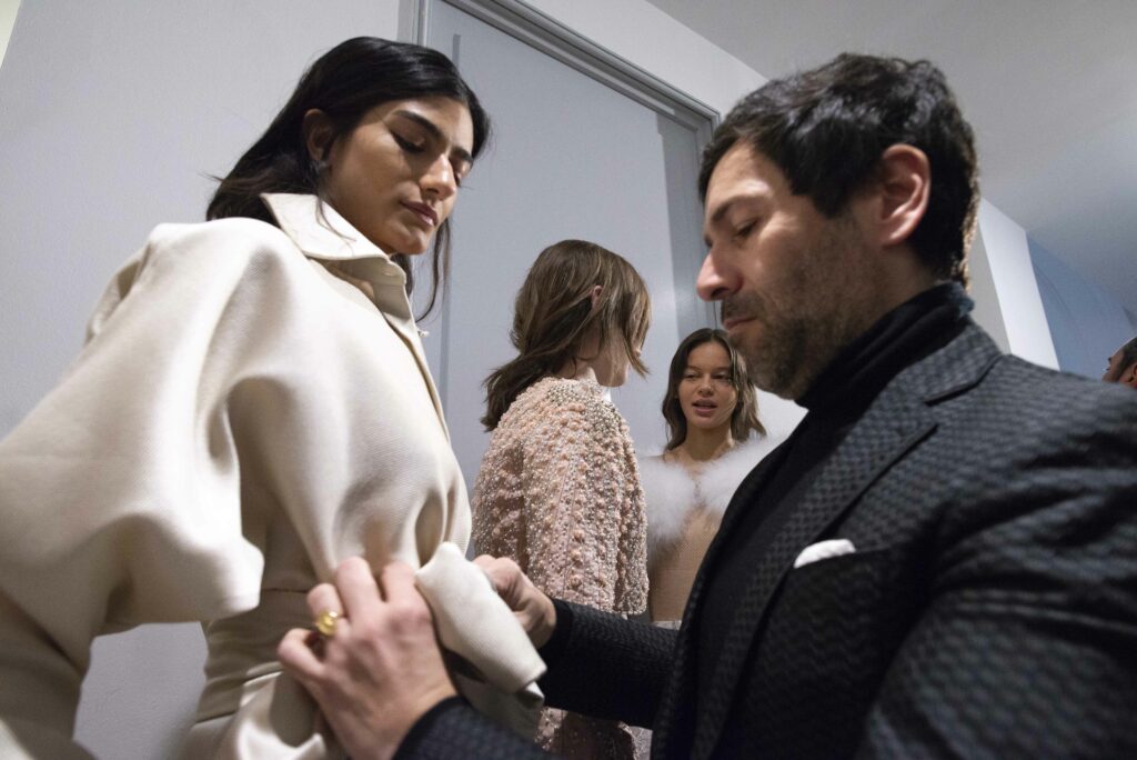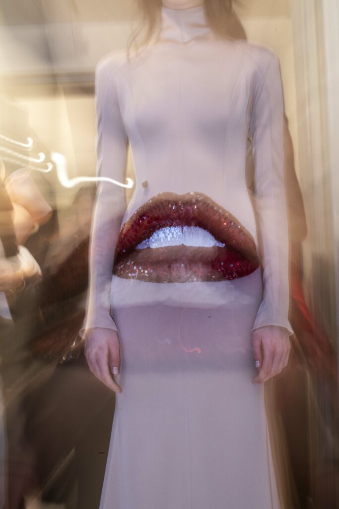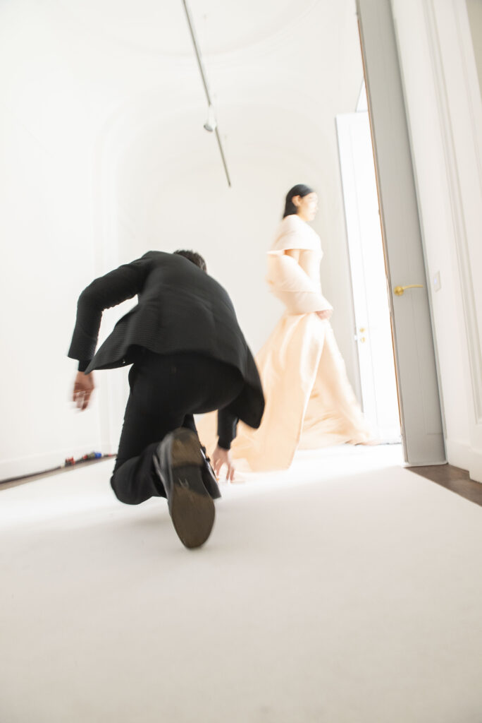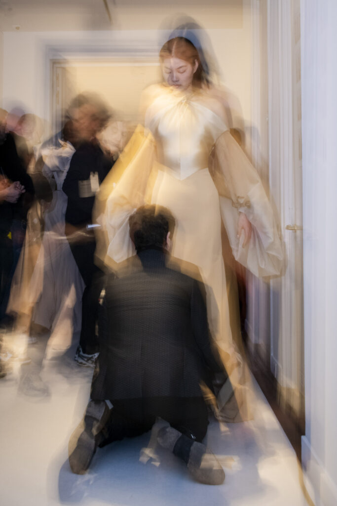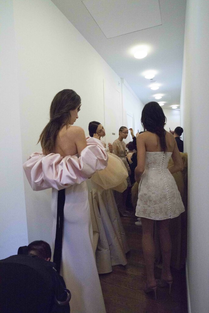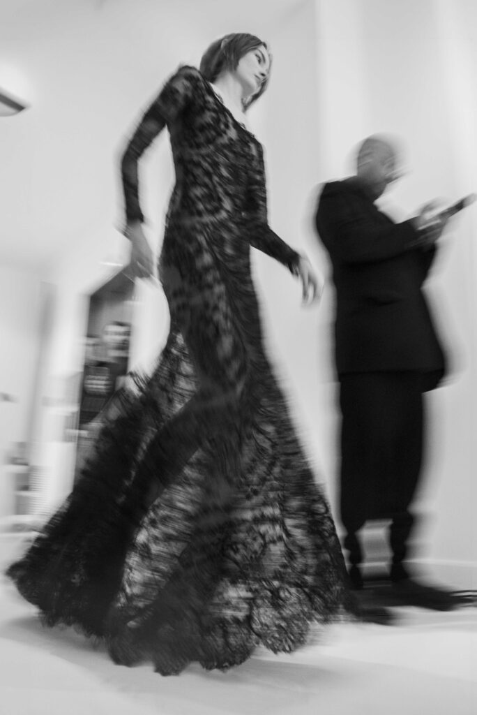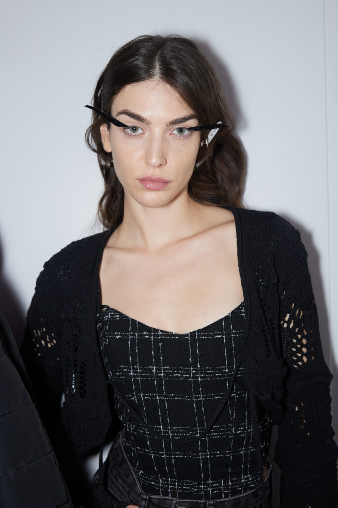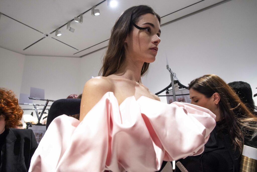 La collaboration avec des artistes de renom tels que Lloyd Simmonds pour le maquillage et Beppe D’Elia pour la coiffure souligne l’importance de chaque détail dans l’élaboration de cette collection. Le son d’Emmanuel Caurel et le casting par Coco Liscia ajoutent une autre dimension à l’expérience, en harmonisant parfaitement l’audiovisuel avec le visuel.