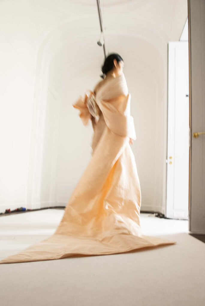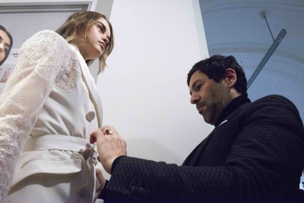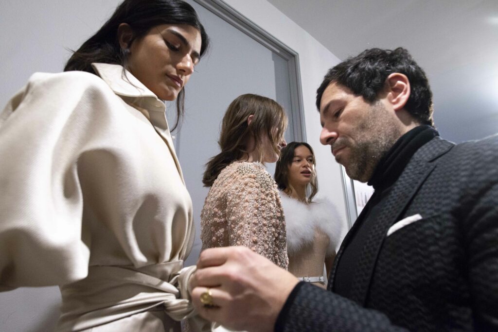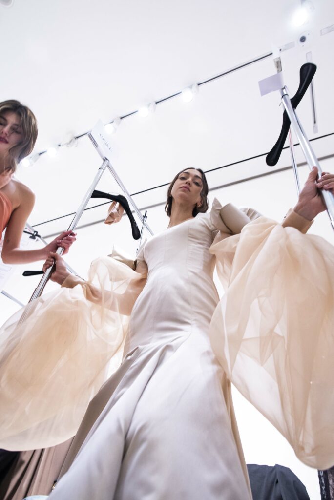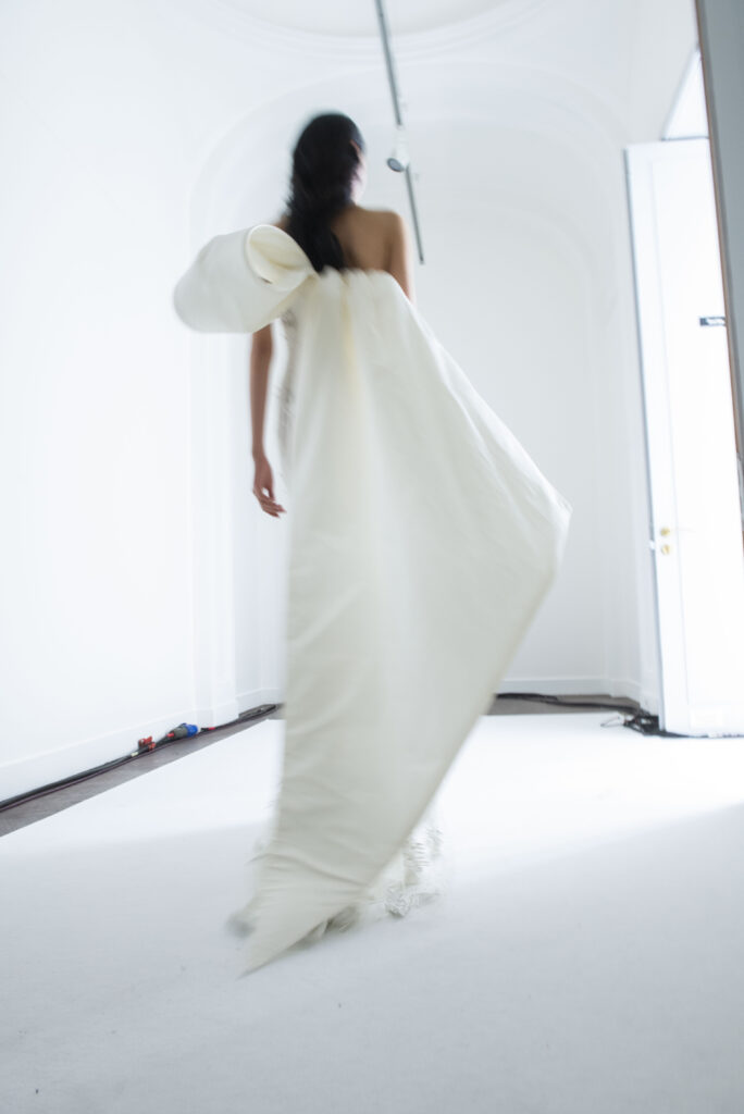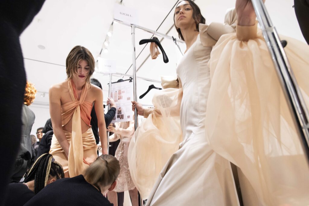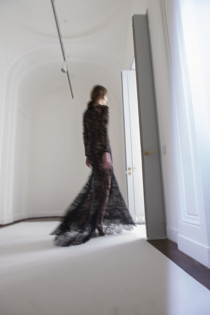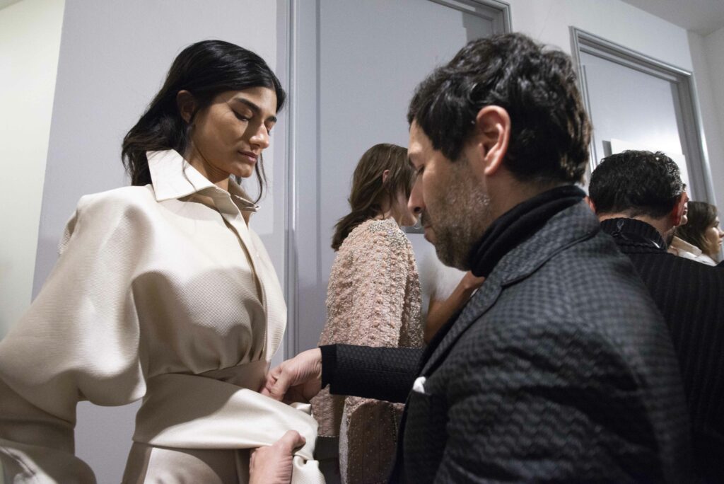 La collaboration avec des artistes de renom tels que Lloyd Simmonds pour le maquillage et Beppe D’Elia pour la coiffure souligne l’importance de chaque détail dans l’élaboration de cette collection. Le son d’Emmanuel Caurel et le casting par Coco Liscia ajoutent une autre dimension à l’expérience, en harmonisant parfaitement l’audiovisuel avec le visuel.