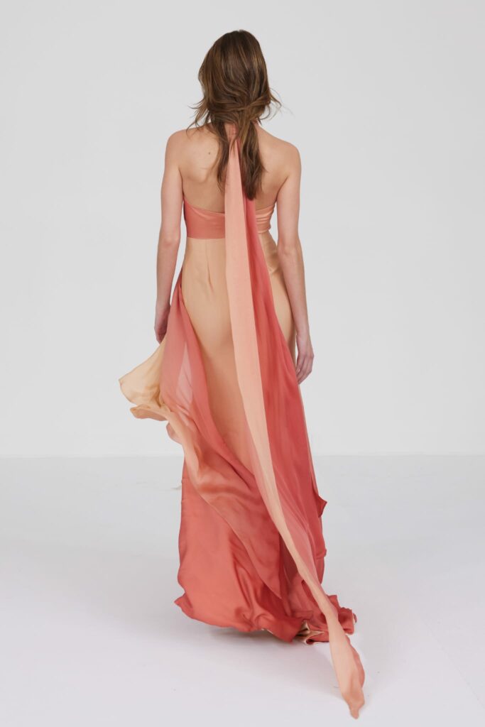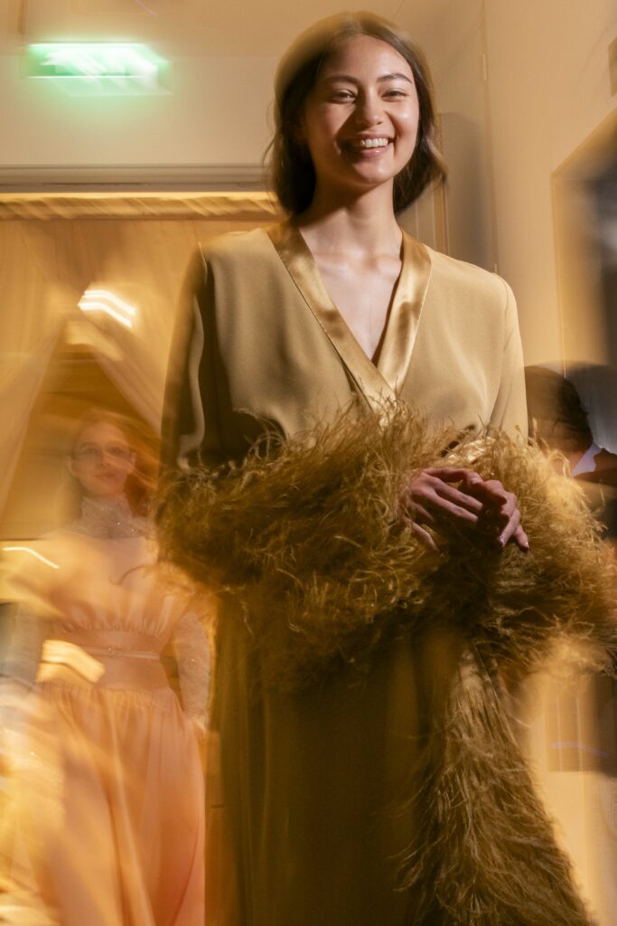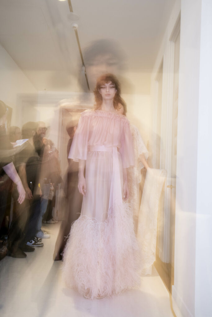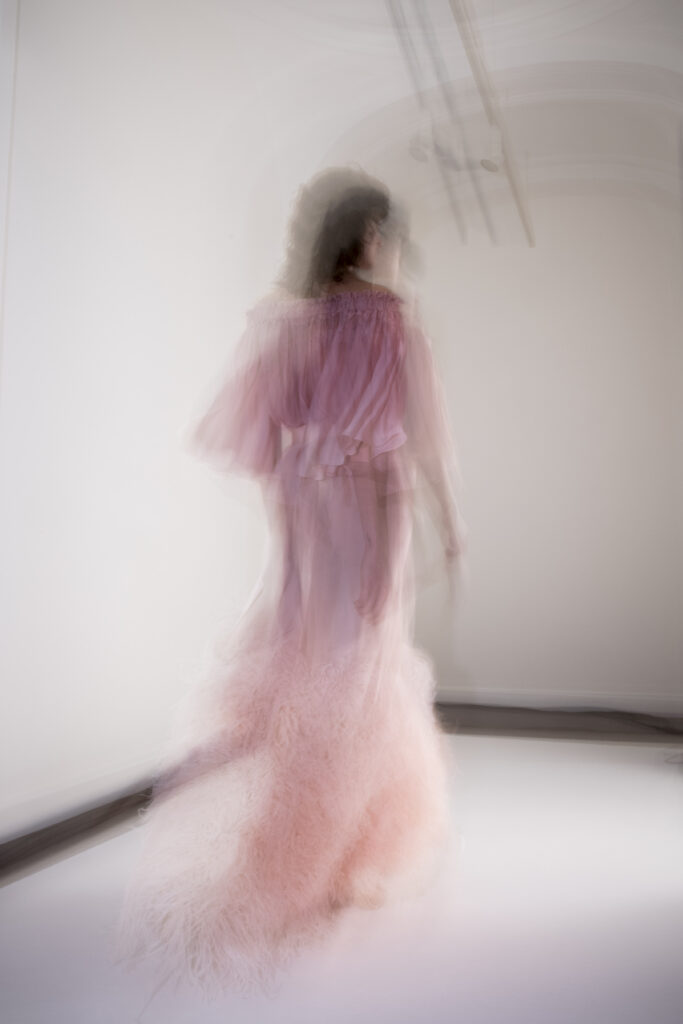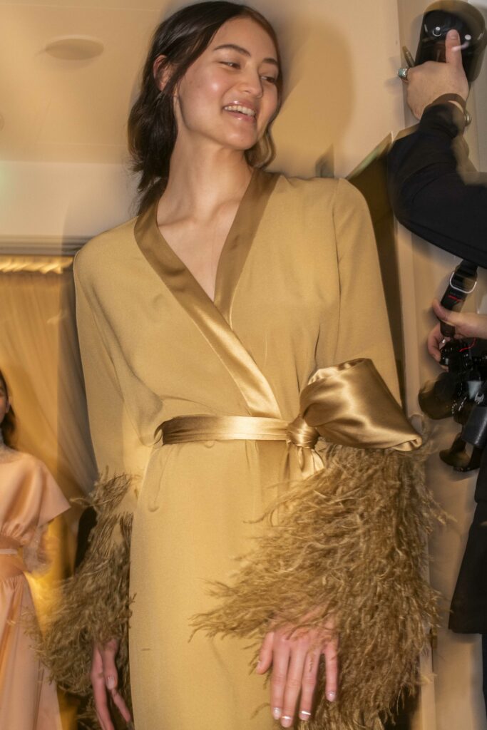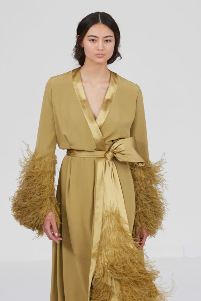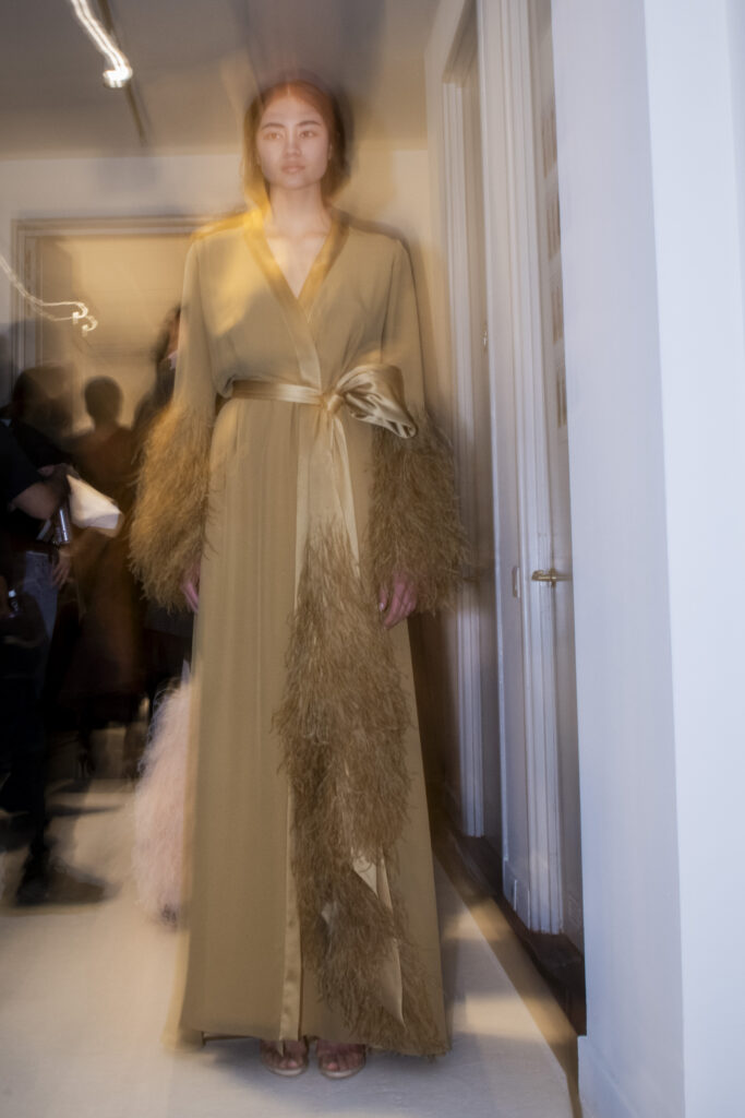 Le grand déshabillé en crêpe de soie or sombre bordé de plumes d’autruche ou encore la longue robe « bain de soleil » en mousseline dégradé de rose font écho à cette exploration de la beauté sous toutes ses formes, matérialisant la vision d’Alexis Mabille où chaque femme peut se voir comme le sujet principal d’une œuvre d’art vivante.