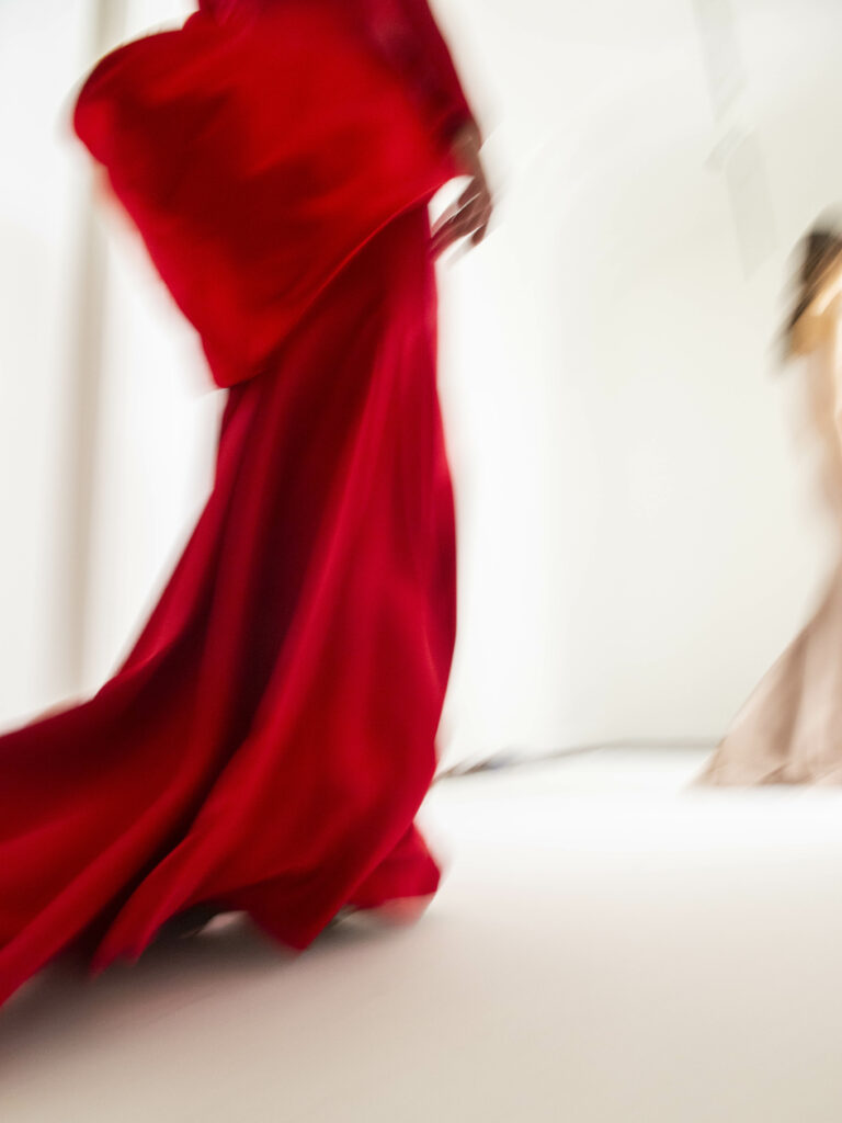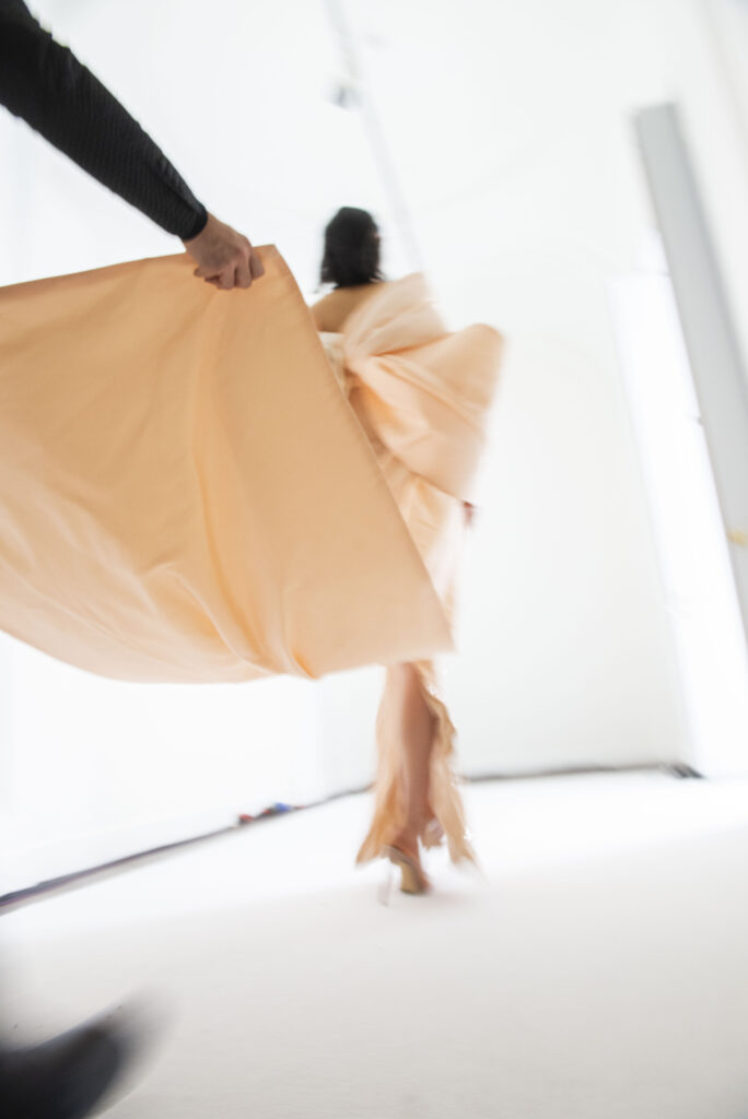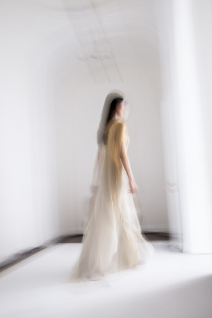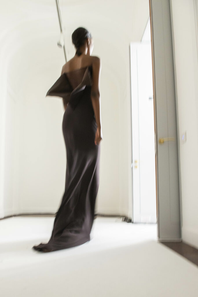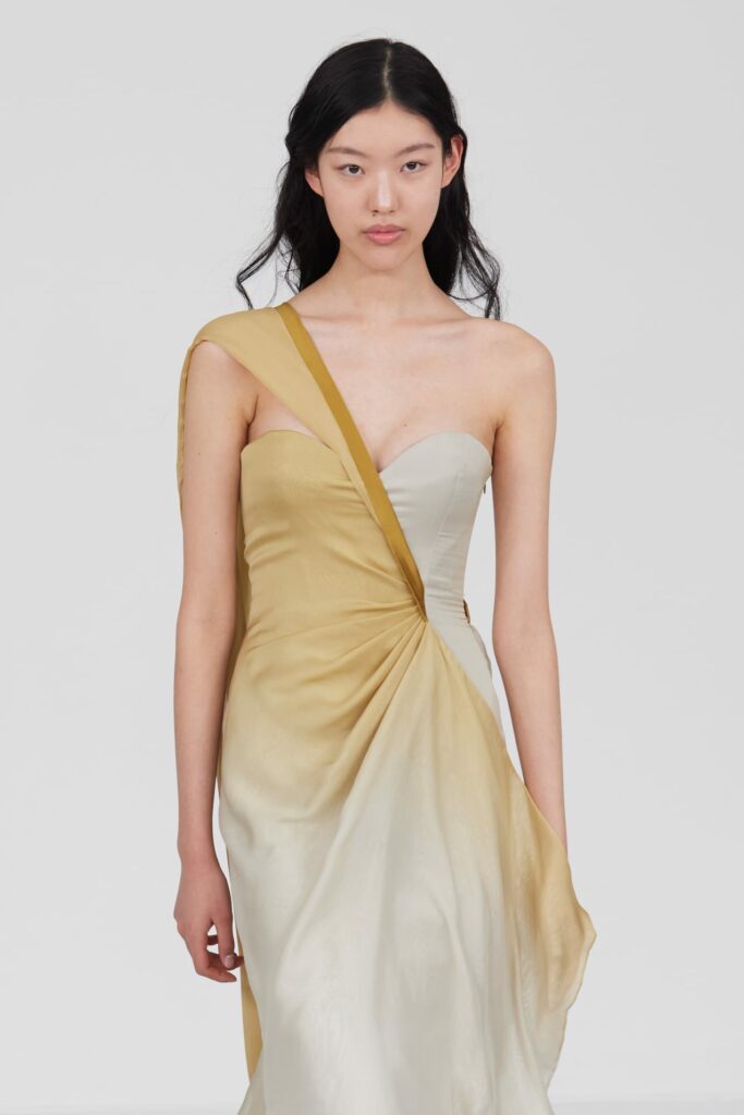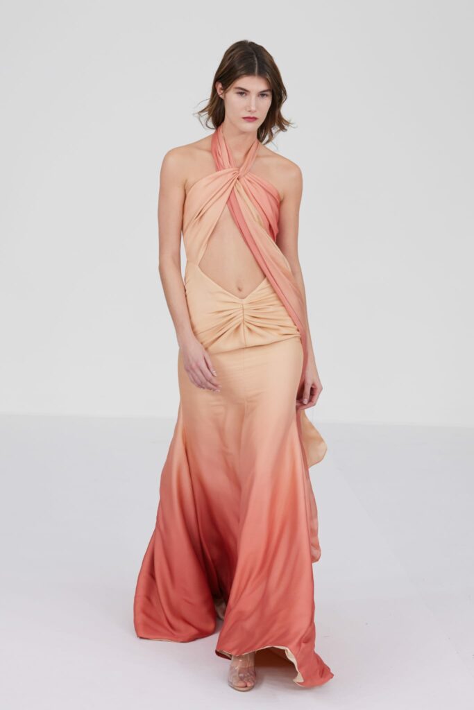 Le grand déshabillé en crêpe de soie or sombre bordé de plumes d’autruche ou encore la longue robe « bain de soleil » en mousseline dégradé de rose font écho à cette exploration de la beauté sous toutes ses formes, matérialisant la vision d’Alexis Mabille où chaque femme peut se voir comme le sujet principal d’une œuvre d’art vivante.