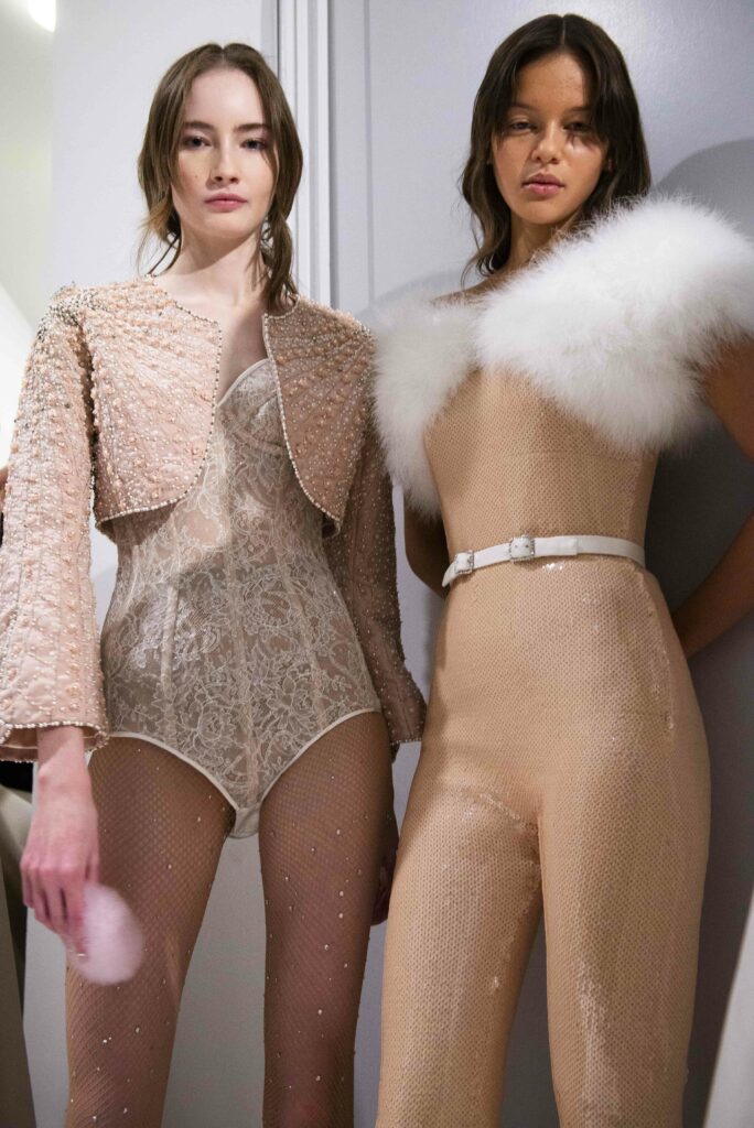 La longue robe bustier-smoking, ornée de cristaux et de perles, incarne parfaitement cette fusion entre la structure formelle du smoking et la fluidité, la délicatesse de la dentelle. Mabille joue avec les textures et les formes, offrant une nouvelle interprétation de la féminité à travers des pièces telles qu’un boléro en plumes de cygne ou une robe-chemise en faille de soie off-white, toutes deux témoignant de son expertise dans le mariage des matériaux et des effets.