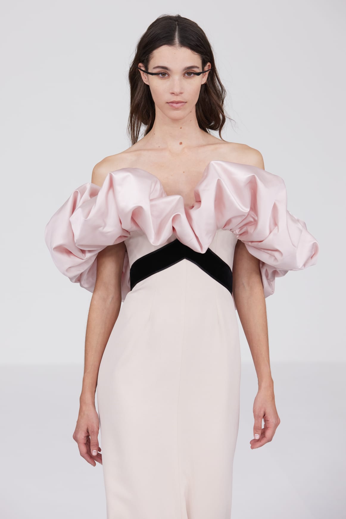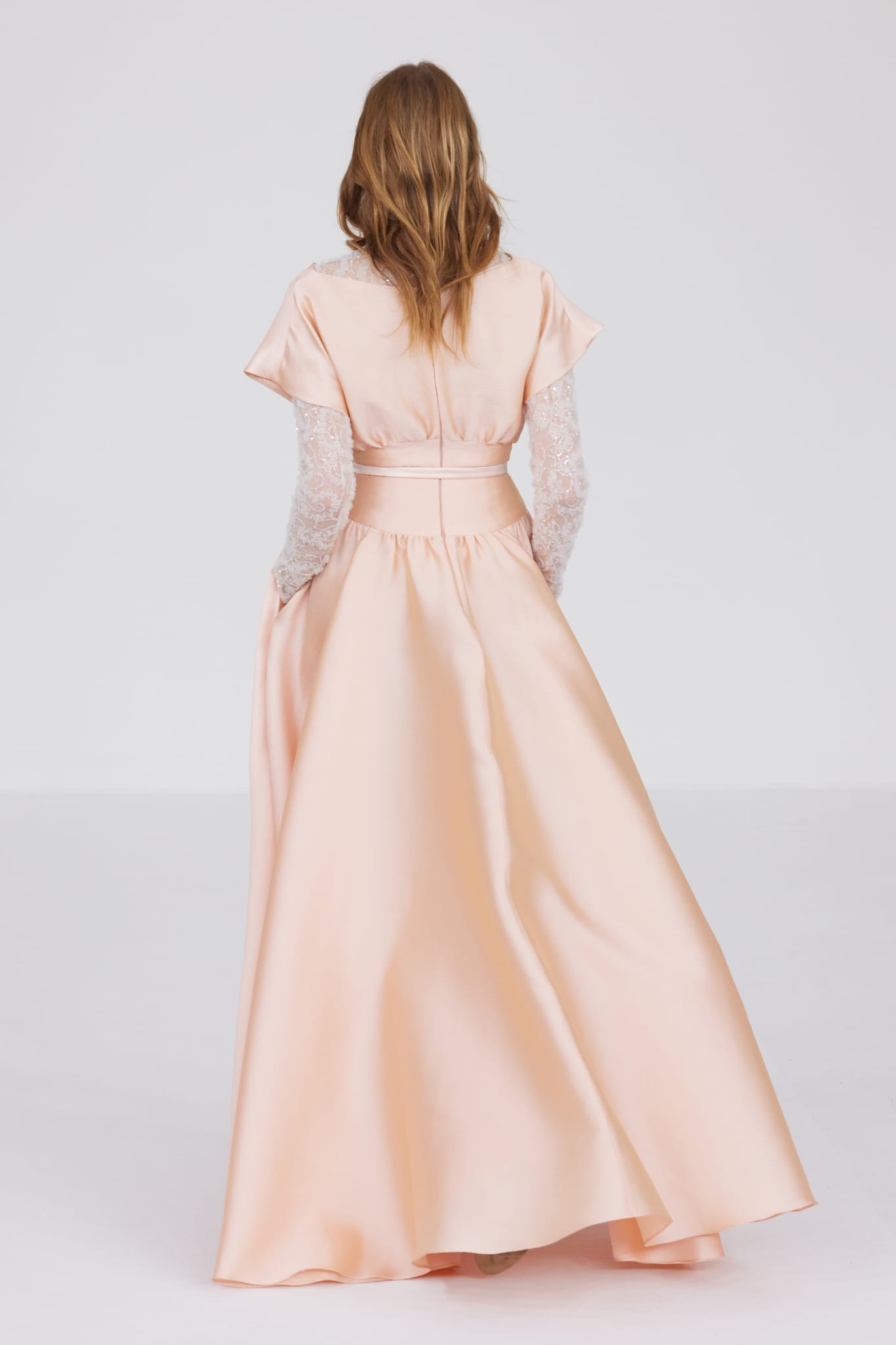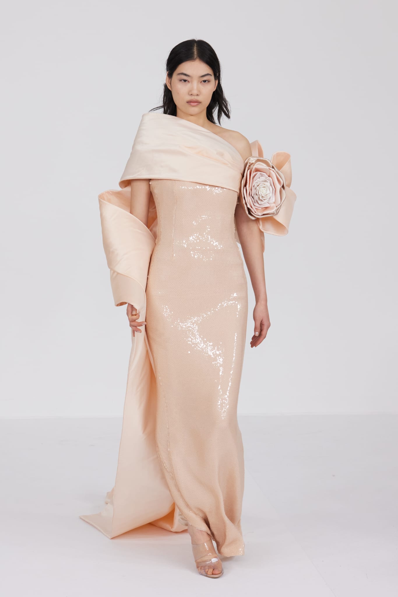 L’un des moments forts de la collection est sans doute la robe à manches chauve-souris en organza-satin rosé, délicatement rebrodée de fleurs et de feuillages en perles or rose. Cette pièce illustre la capacité de Mabille à créer des vêtements qui captent la lumière et l’attention, enveloppant la porteuse dans un éclat subtil qui transcende les simples atours pour toucher à l’essence même de sa personnalité.