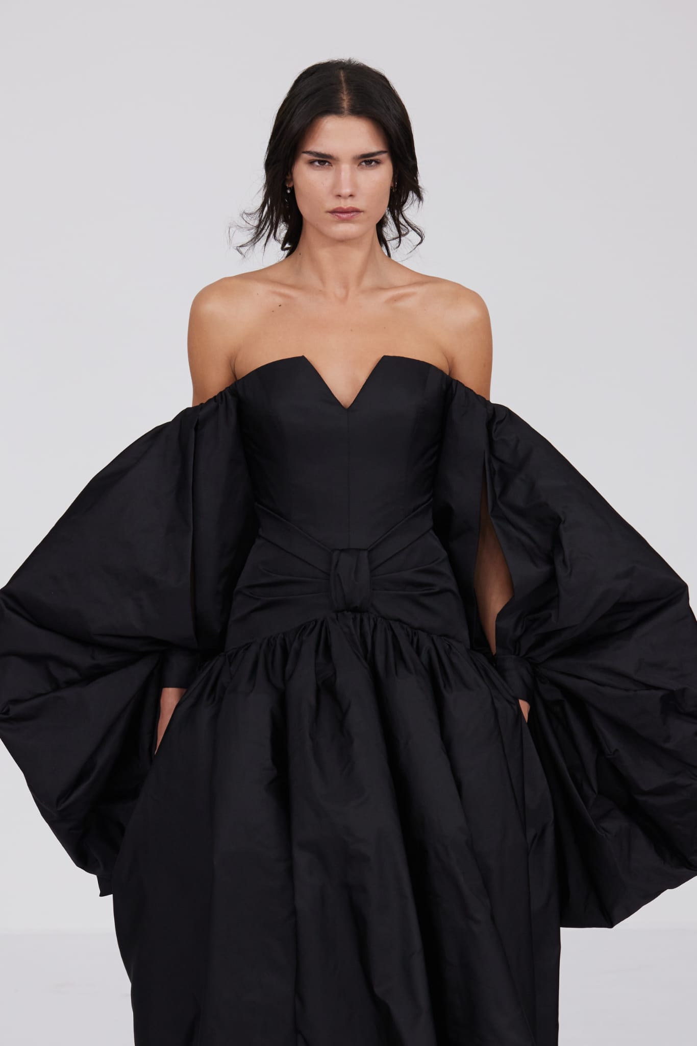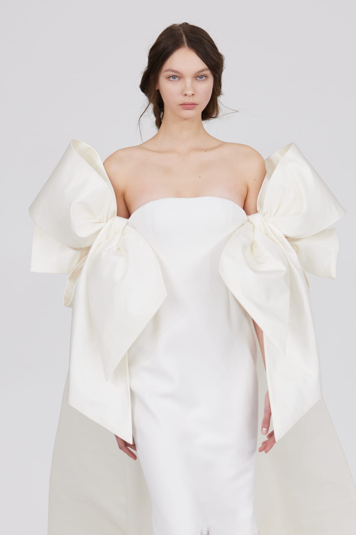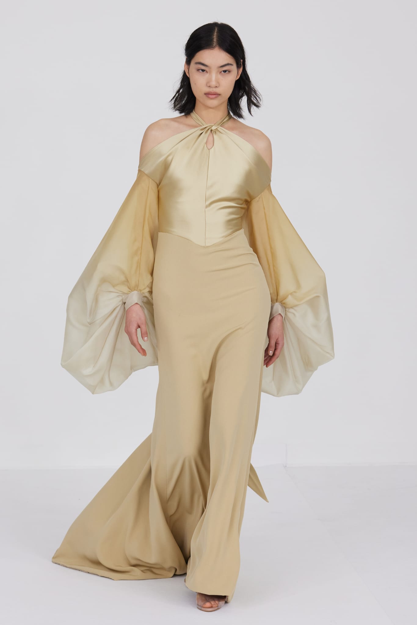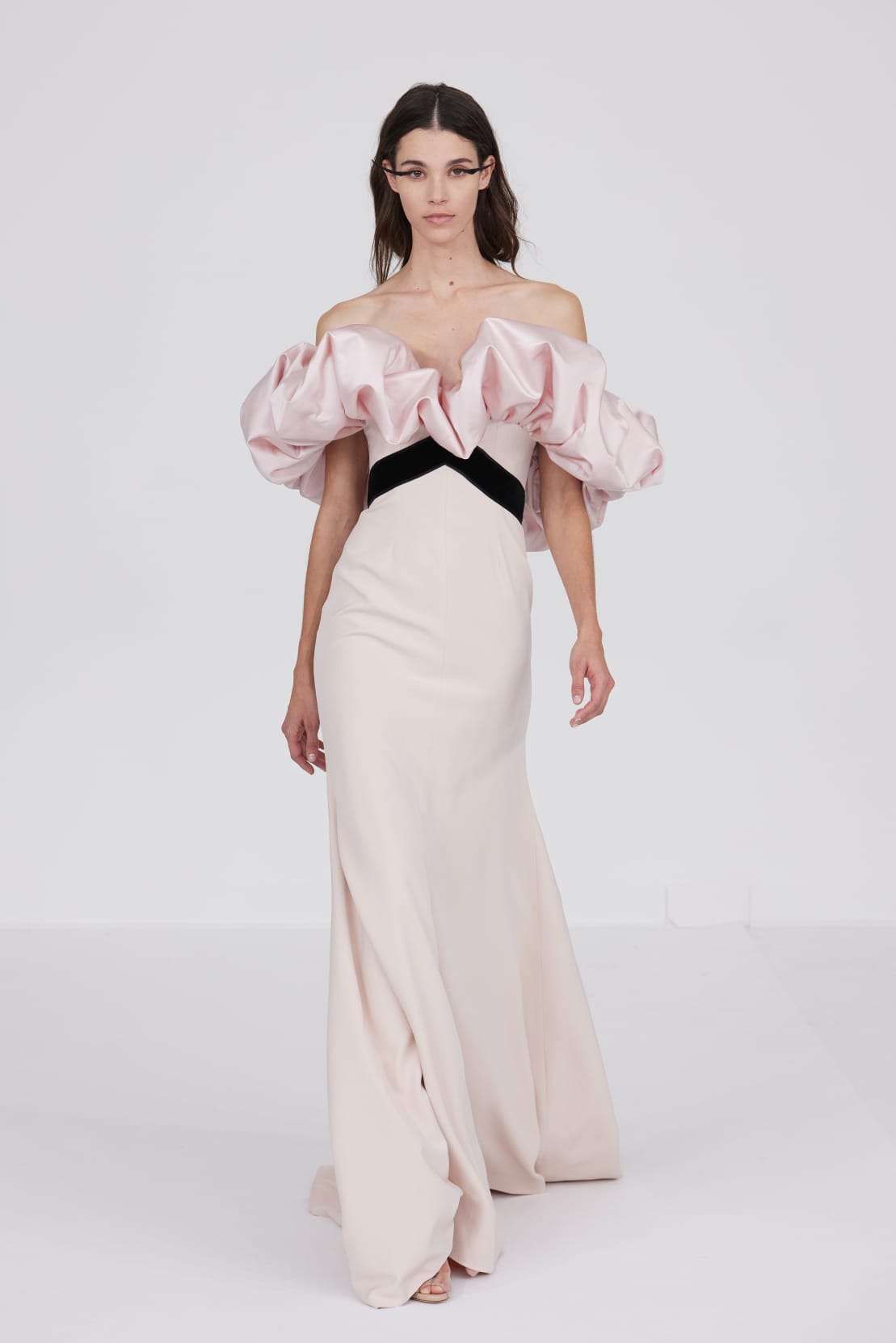 L’un des moments forts de la collection est sans doute la robe à manches chauve-souris en organza-satin rosé, délicatement rebrodée de fleurs et de feuillages en perles or rose. Cette pièce illustre la capacité de Mabille à créer des vêtements qui captent la lumière et l’attention, enveloppant la porteuse dans un éclat subtil qui transcende les simples atours pour toucher à l’essence même de sa personnalité.