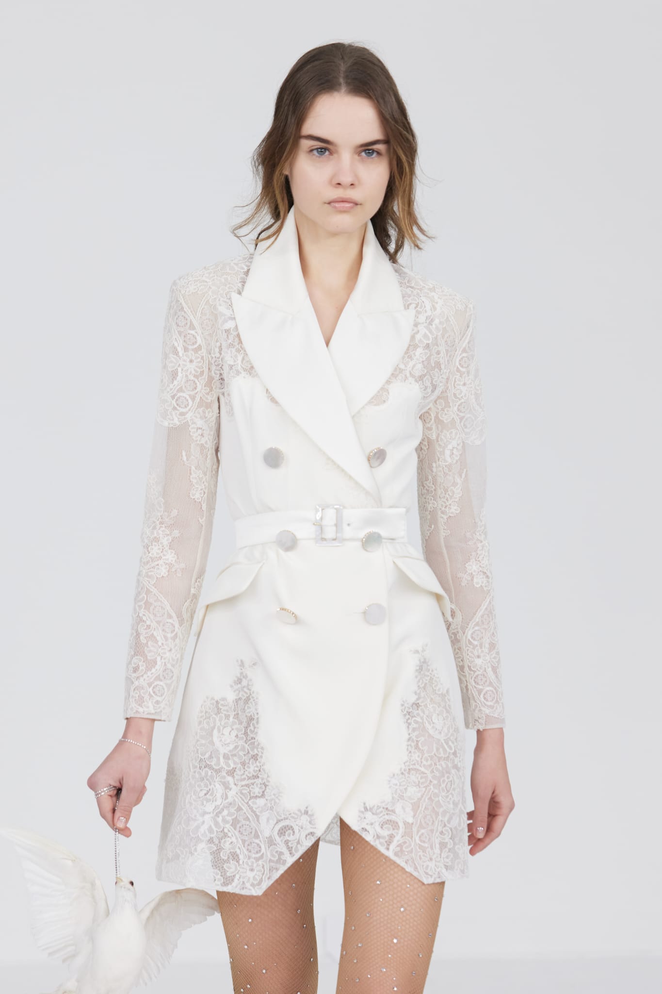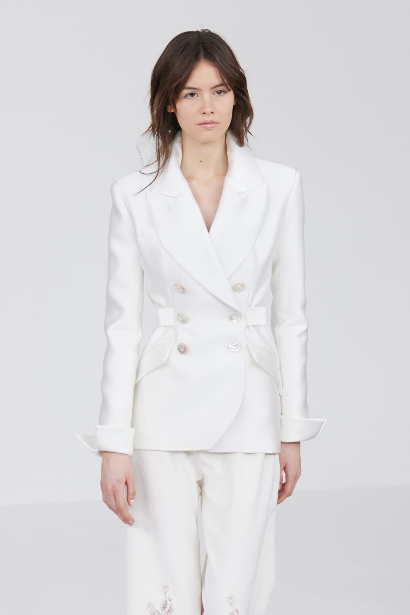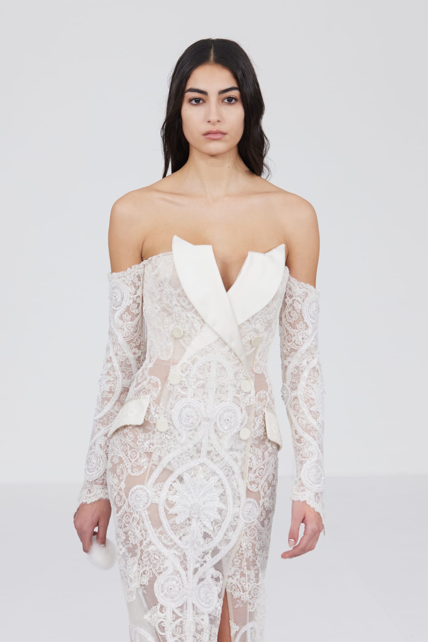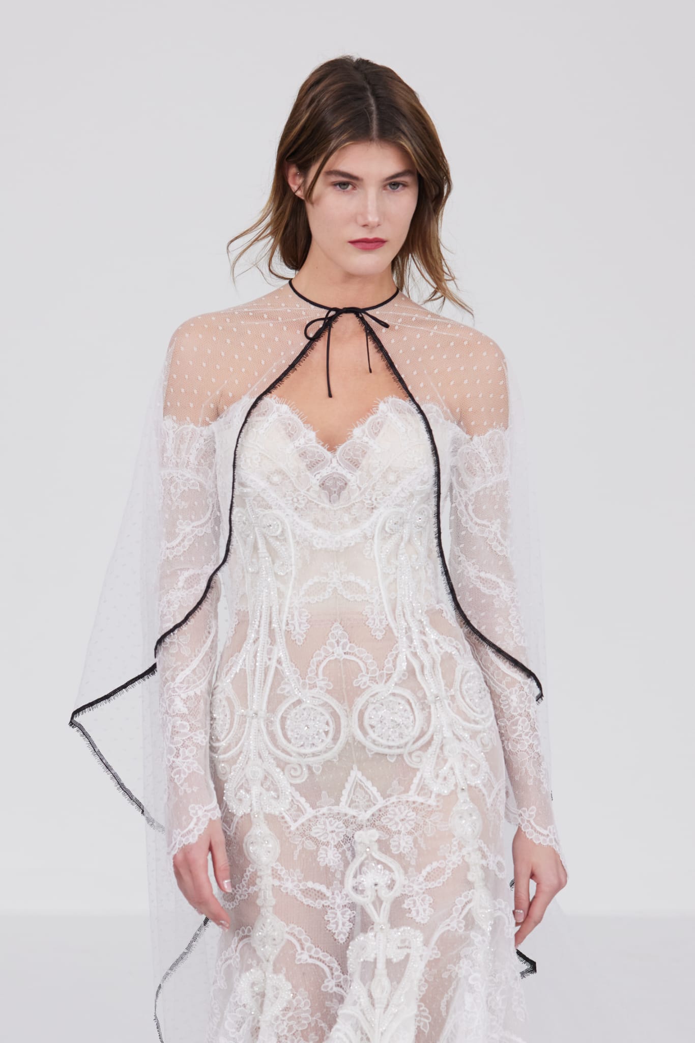 Le défilé s’ouvre sur une robe smoking en crêpe blanc, réhaussée de dentelle de Lyon et de boutons de nacre, établissant d’emblée le ton d’une élégance sobre mais sophistiquée. Cette approche se retrouve dans toute la collection, où la dentelle de Lyon, le satin, les cristaux, les nacres et les perles jouent un rôle prépondérant, apportant une touche de lumière et de raffinement à des silhouettes déjà empreintes de grâce.