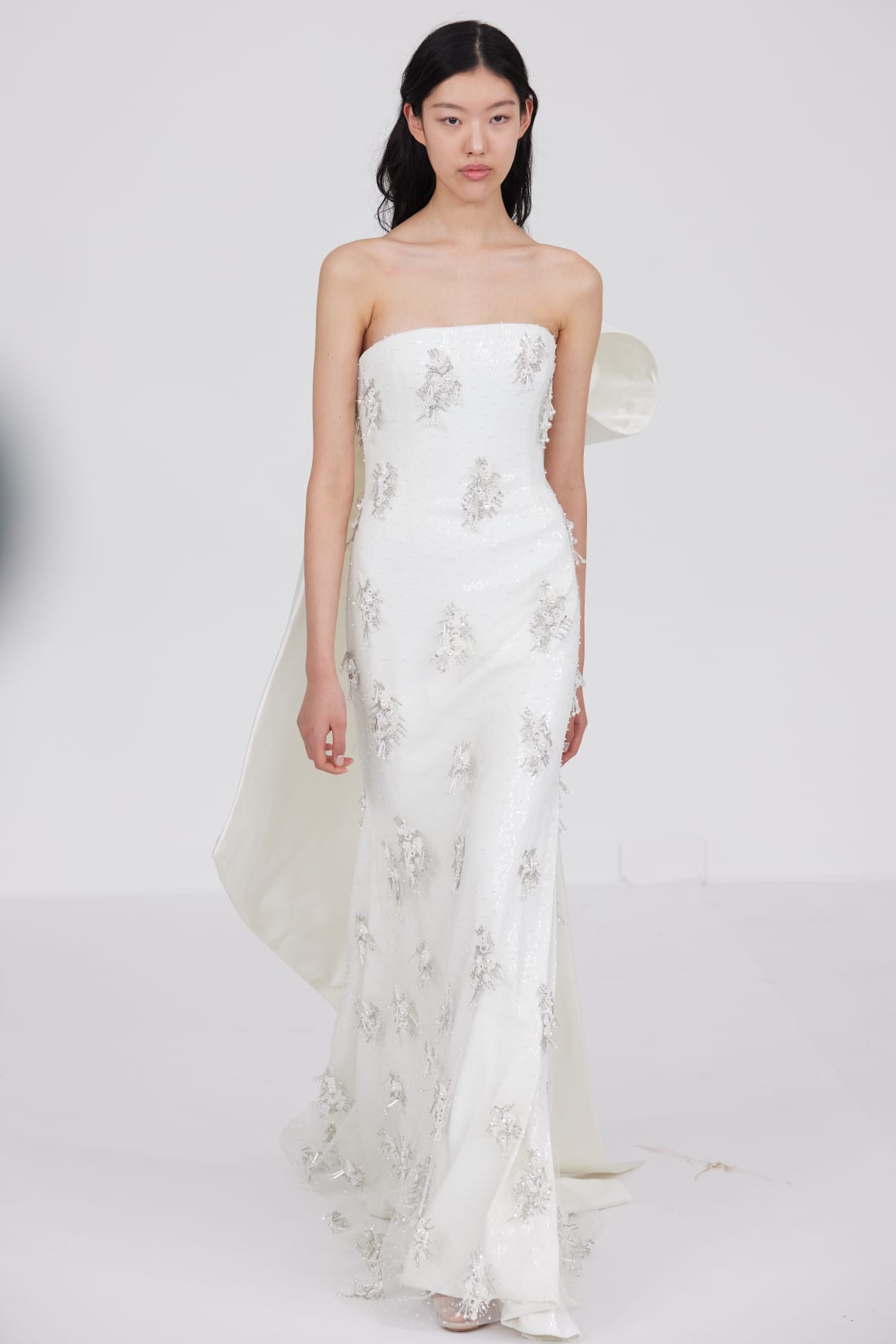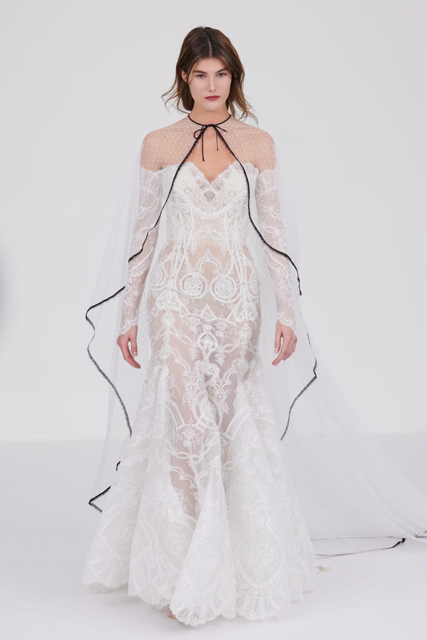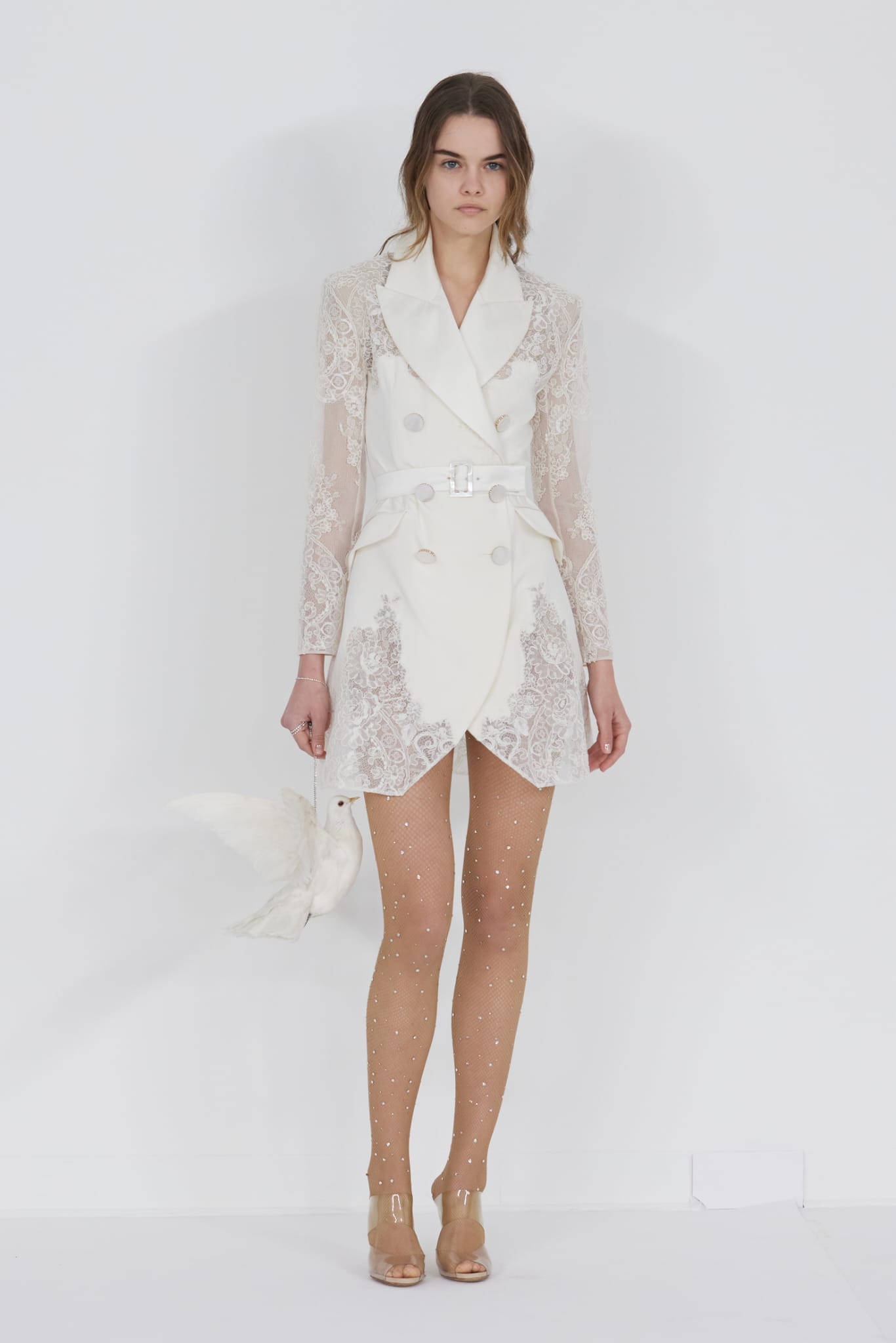 Le défilé s’ouvre sur une robe smoking en crêpe blanc, réhaussée de dentelle de Lyon et de boutons de nacre, établissant d’emblée le ton d’une élégance sobre mais sophistiquée. Cette approche se retrouve dans toute la collection, où la dentelle de Lyon, le satin, les cristaux, les nacres et les perles jouent un rôle prépondérant, apportant une touche de lumière et de raffinement à des silhouettes déjà empreintes de grâce.