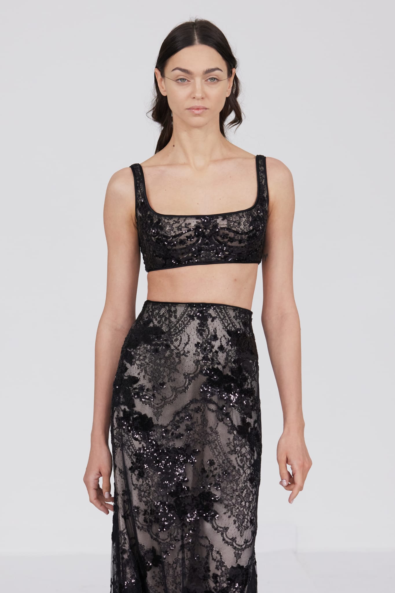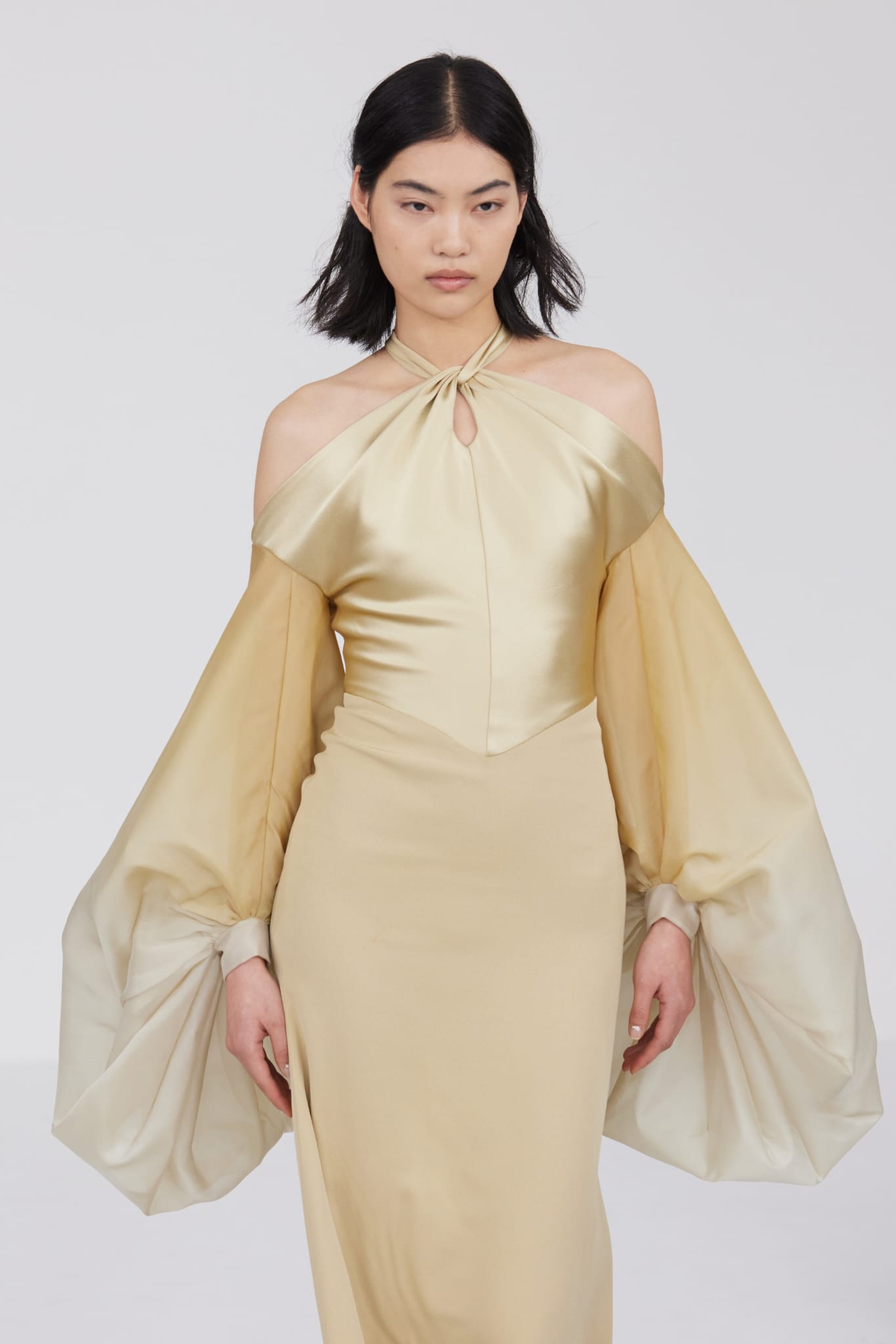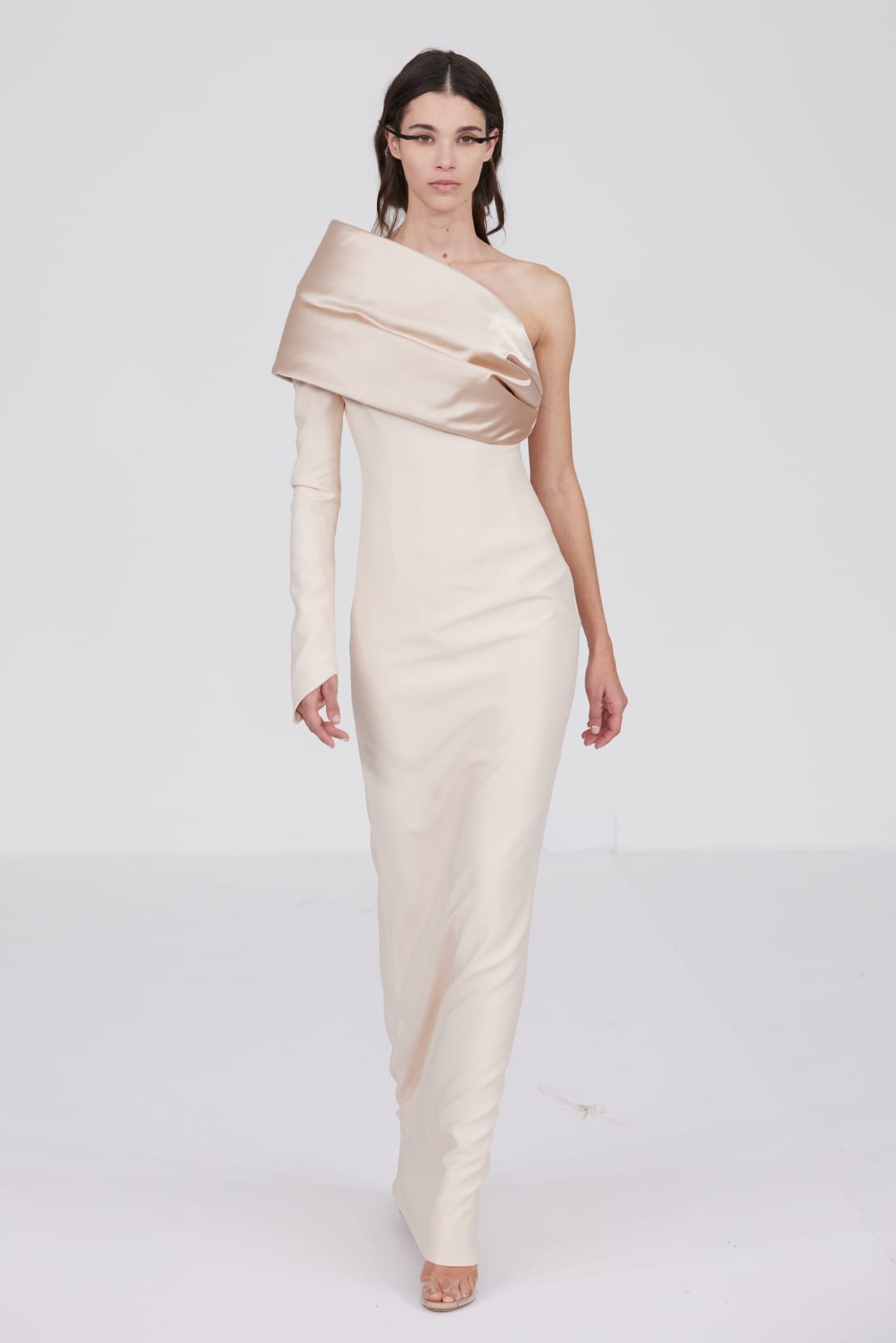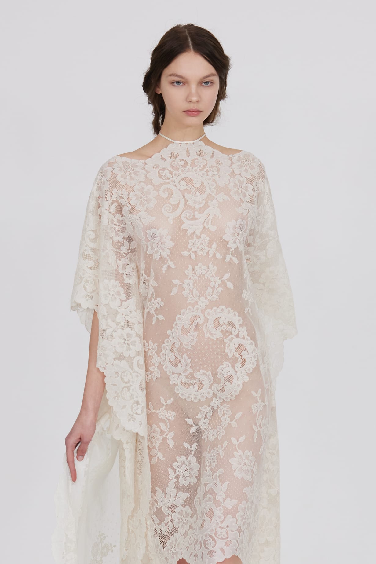 Le défilé s’ouvre sur une robe smoking en crêpe blanc, réhaussée de dentelle de Lyon et de boutons de nacre, établissant d’emblée le ton d’une élégance sobre mais sophistiquée. Cette approche se retrouve dans toute la collection, où la dentelle de Lyon, le satin, les cristaux, les nacres et les perles jouent un rôle prépondérant, apportant une touche de lumière et de raffinement à des silhouettes déjà empreintes de grâce.