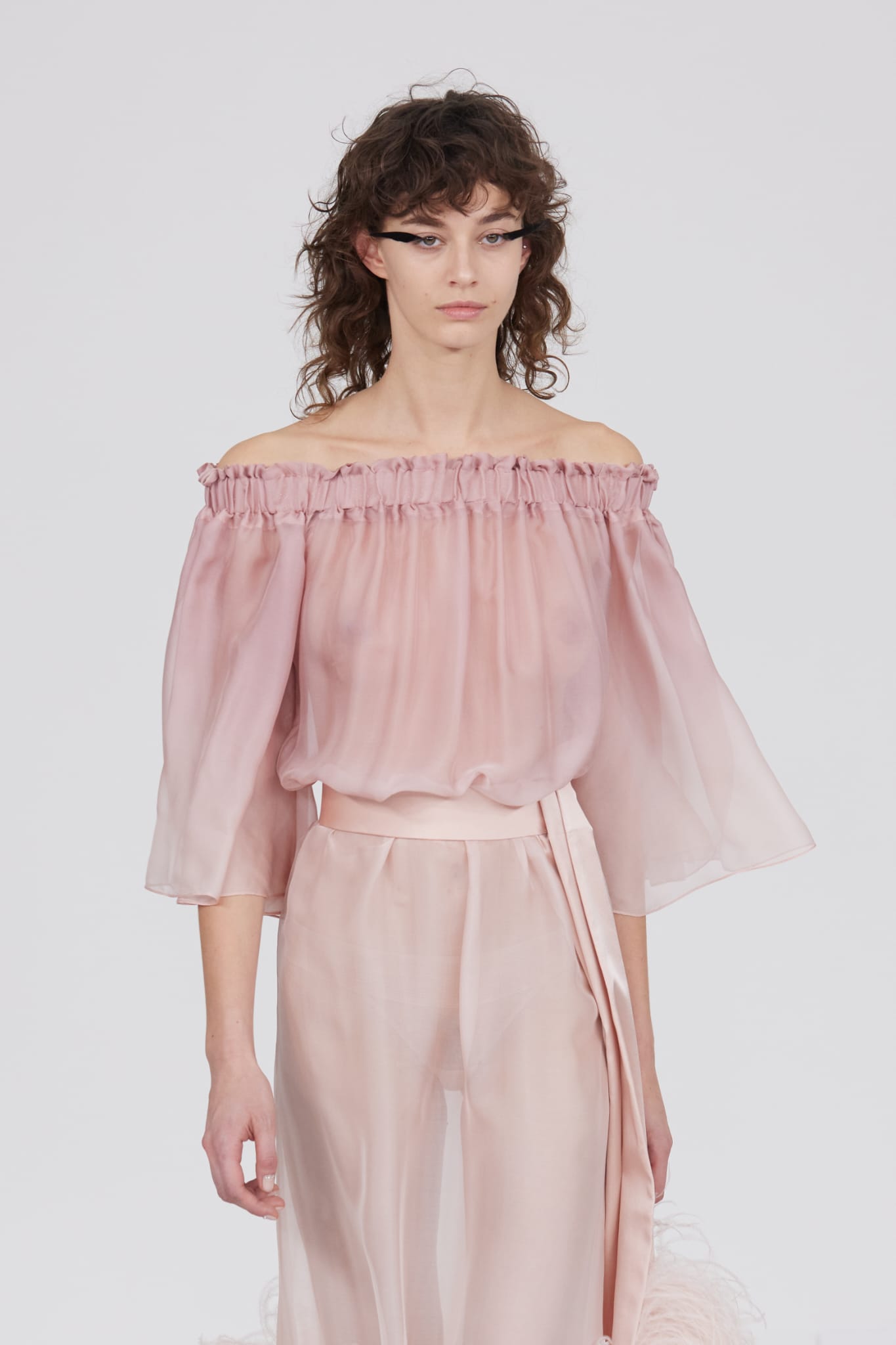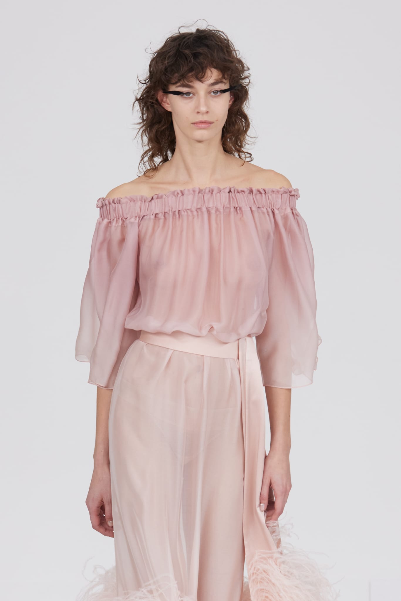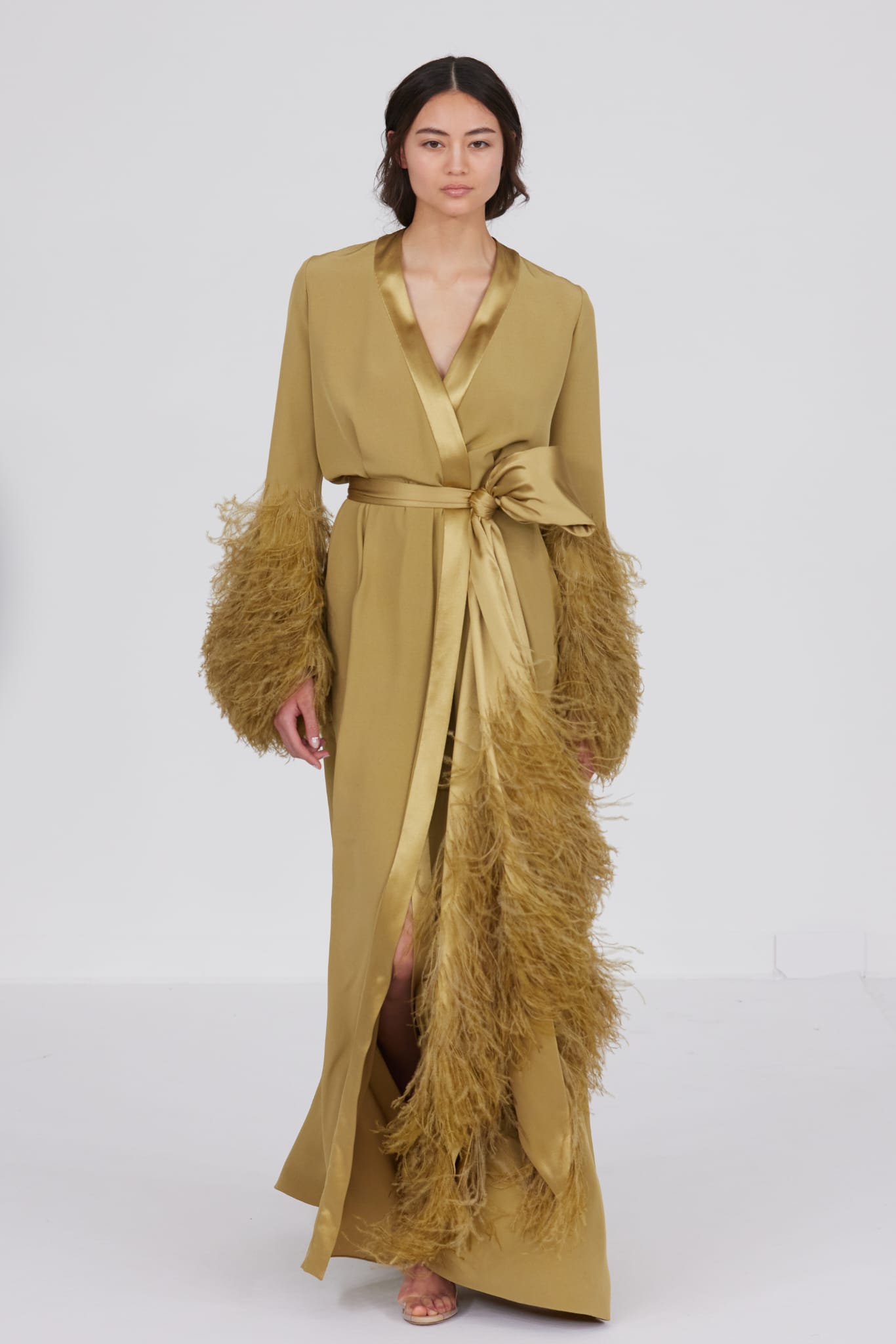 Le grand déshabillé en crêpe de soie or sombre bordé de plumes d’autruche ou encore la longue robe « bain de soleil » en mousseline dégradé de rose font écho à cette exploration de la beauté sous toutes ses formes, matérialisant la vision d’Alexis Mabille où chaque femme peut se voir comme le sujet principal d’une œuvre d’art vivante.