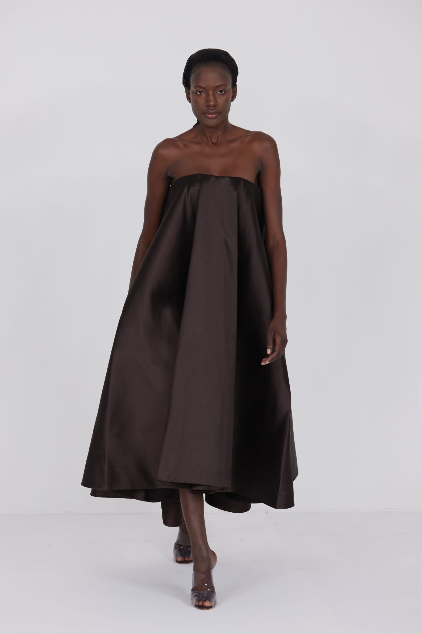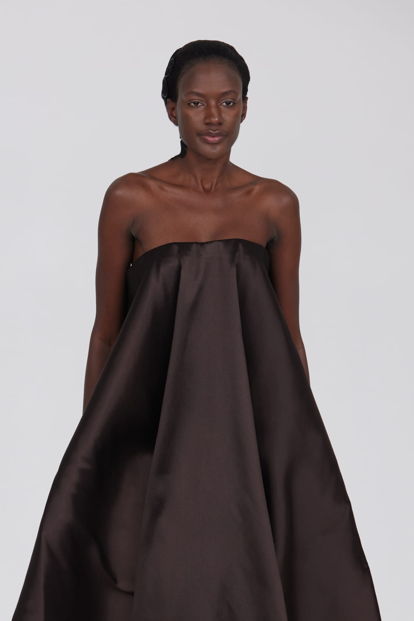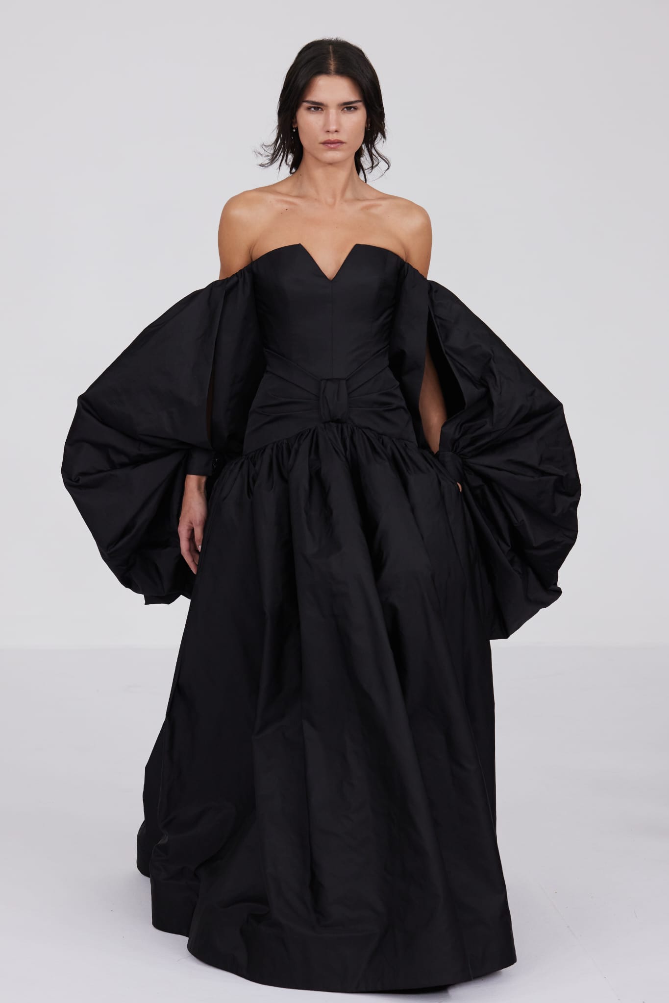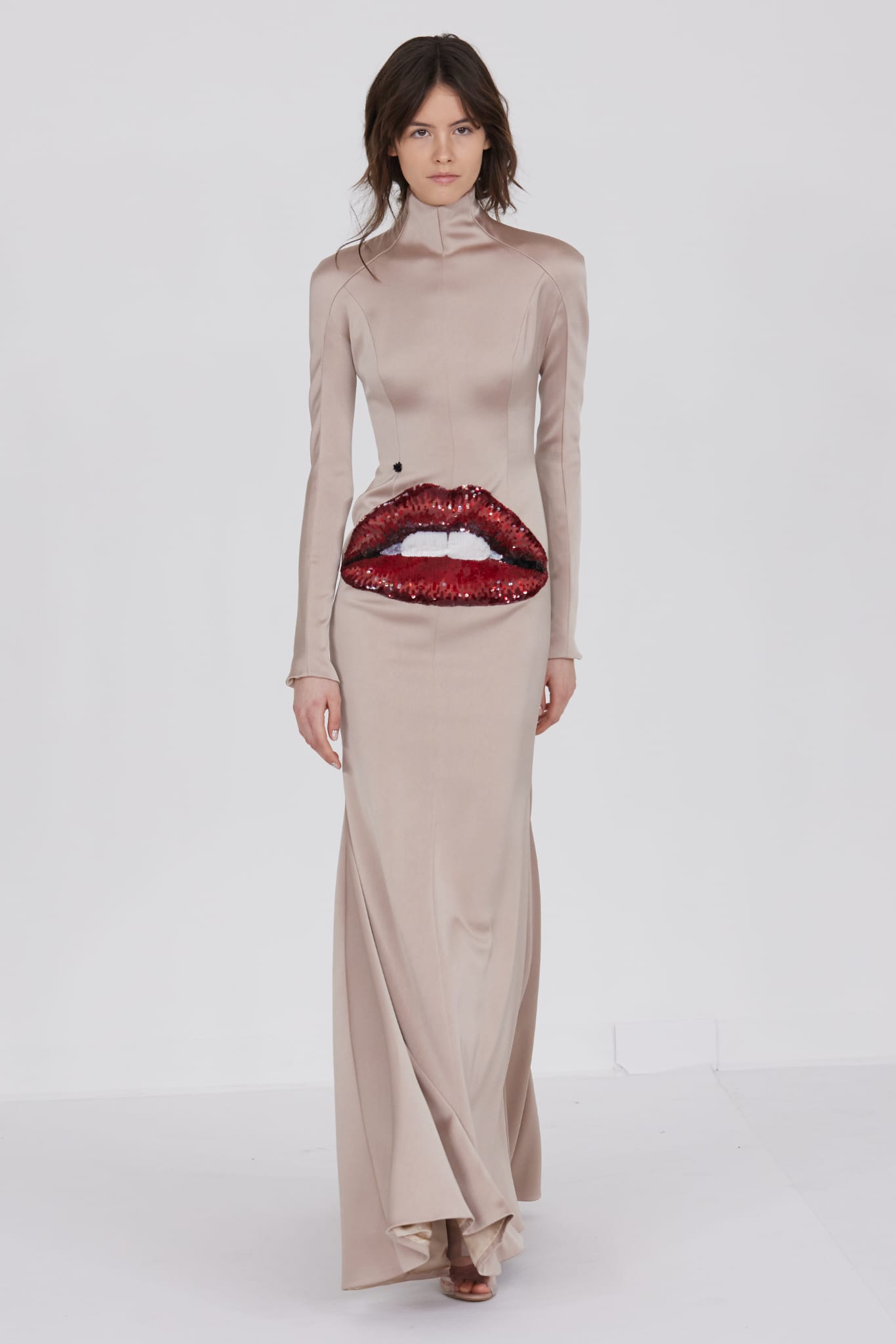 Le grand déshabillé en crêpe de soie or sombre bordé de plumes d’autruche ou encore la longue robe « bain de soleil » en mousseline dégradé de rose font écho à cette exploration de la beauté sous toutes ses formes, matérialisant la vision d’Alexis Mabille où chaque femme peut se voir comme le sujet principal d’une œuvre d’art vivante.
