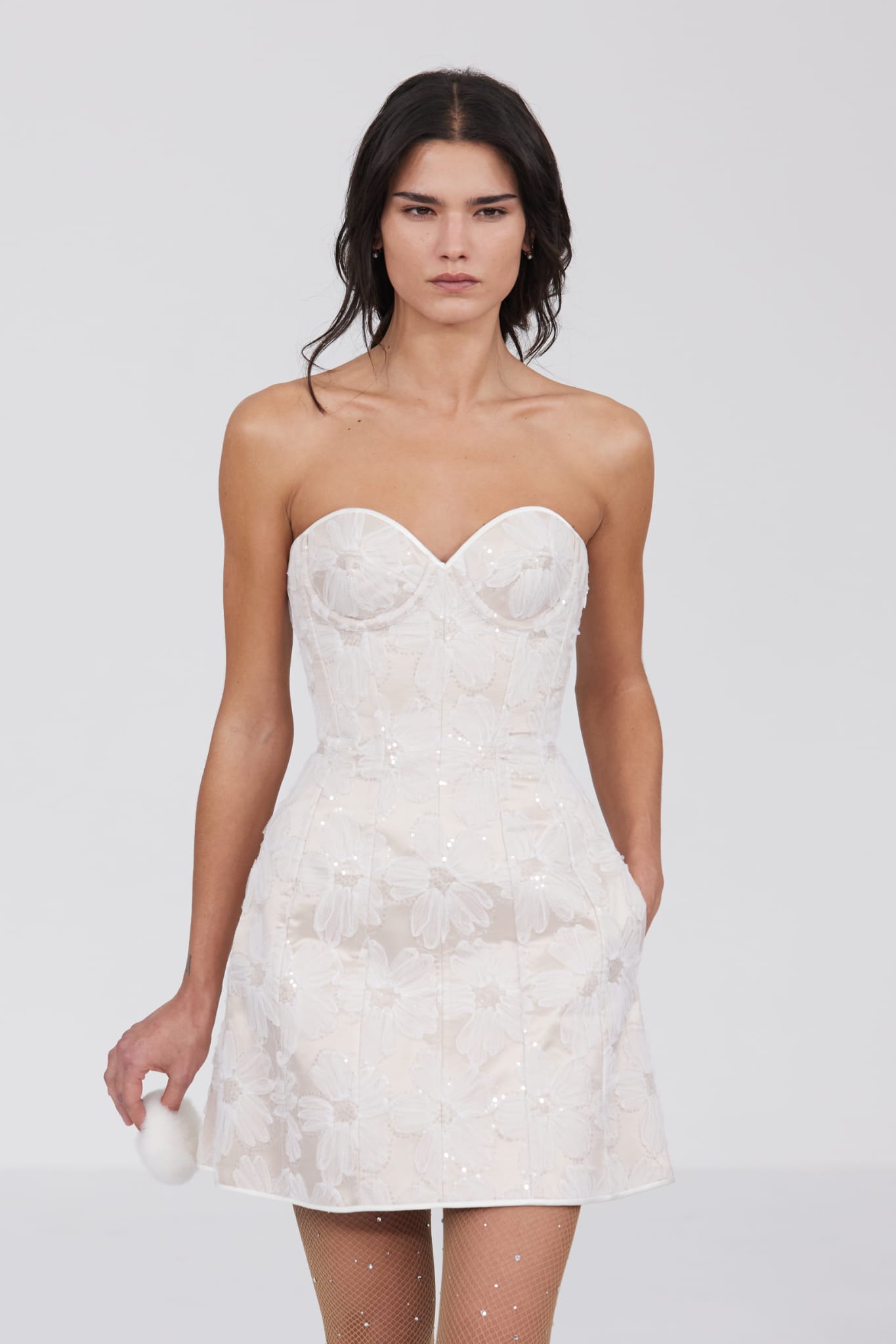 La longue robe bustier-smoking, ornée de cristaux et de perles, incarne parfaitement cette fusion entre la structure formelle du smoking et la fluidité, la délicatesse de la dentelle. Mabille joue avec les textures et les formes, offrant une nouvelle interprétation de la féminité à travers des pièces telles qu’un boléro en plumes de cygne ou une robe-chemise en faille de soie off-white, toutes deux témoignant de son expertise dans le mariage des matériaux et des effets.