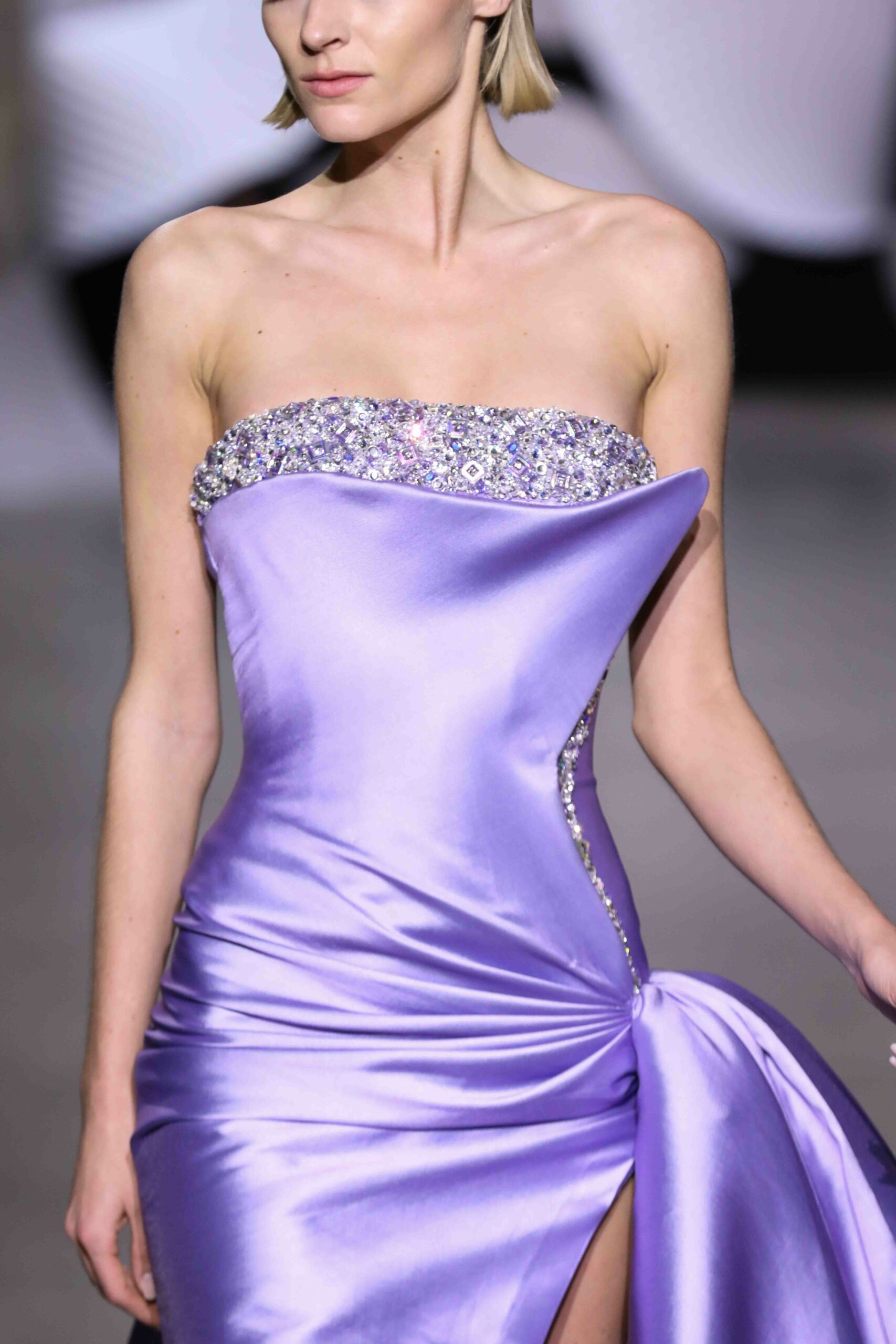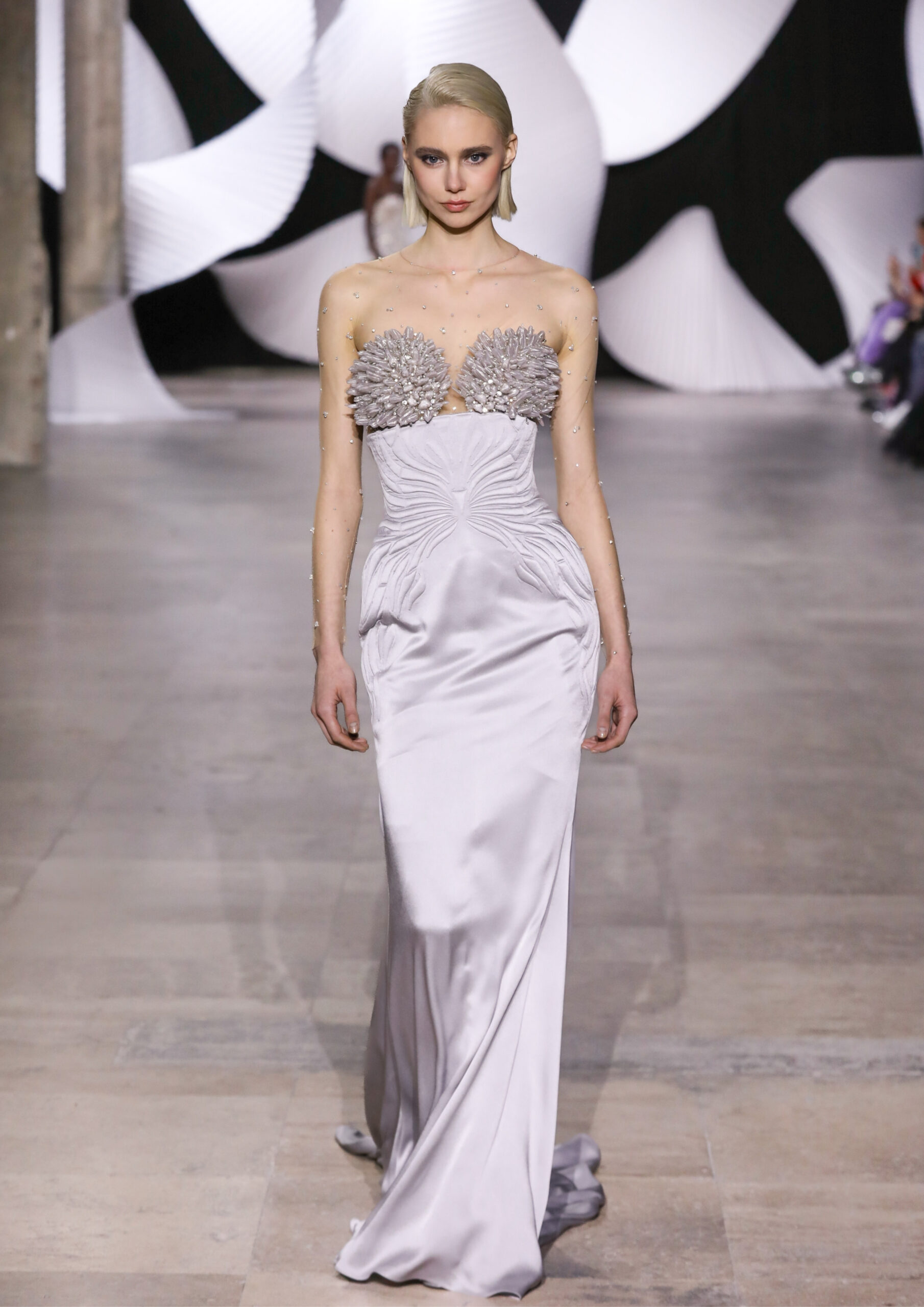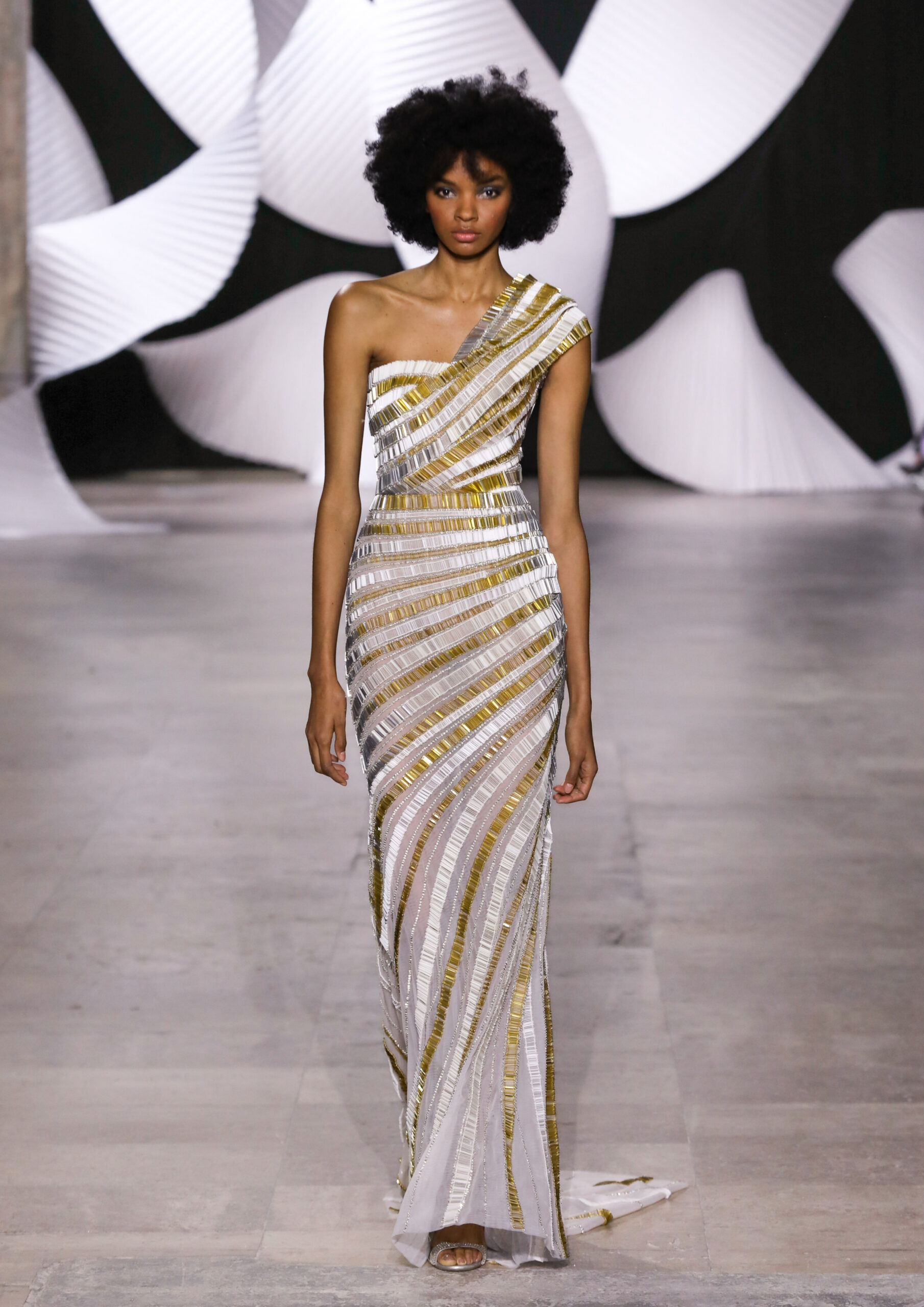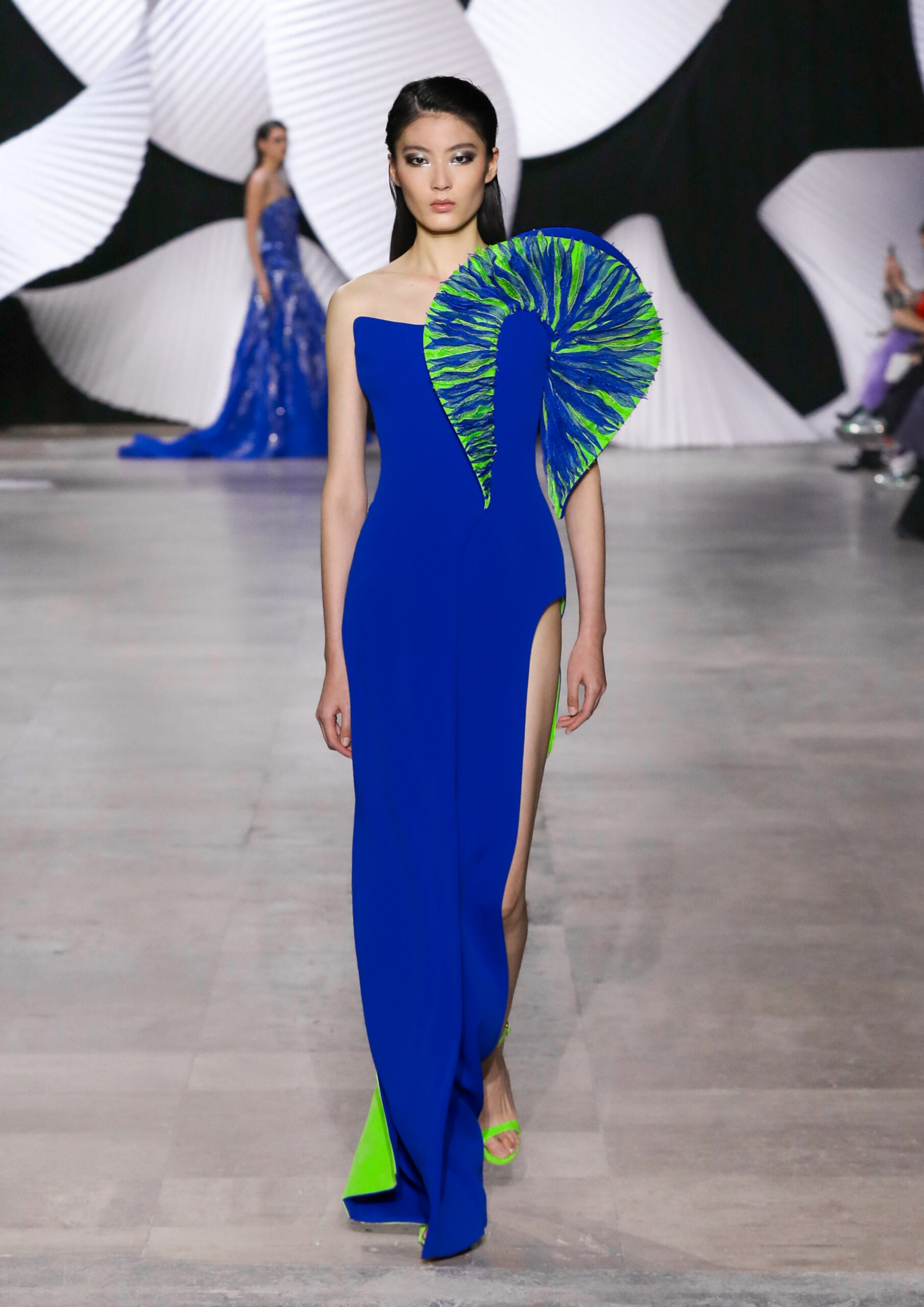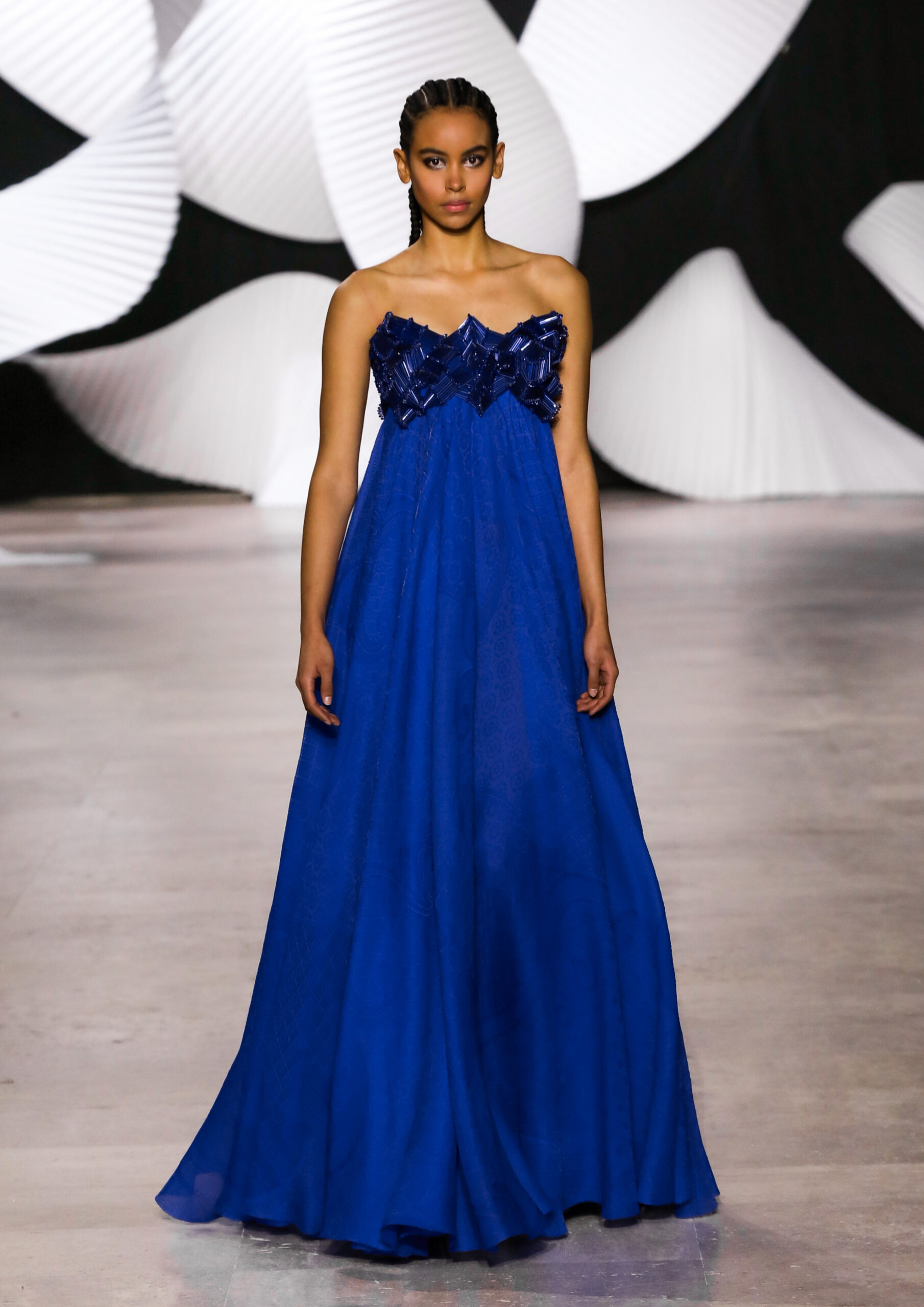 La collection se distingue par son audace dans l’utilisation de couleurs vibrantes – feuilles d’or, bleu électrique, rouge vif, lavande – toutes unifiées sous le thème du Nombre d’Or. Les manches édouardiennes, les superpositions de matières et les œuvres d’art tridimensionnelles créées par l’intersection de formes et de volumes différents montrent l’étendue de la créativité de Tony Ward.