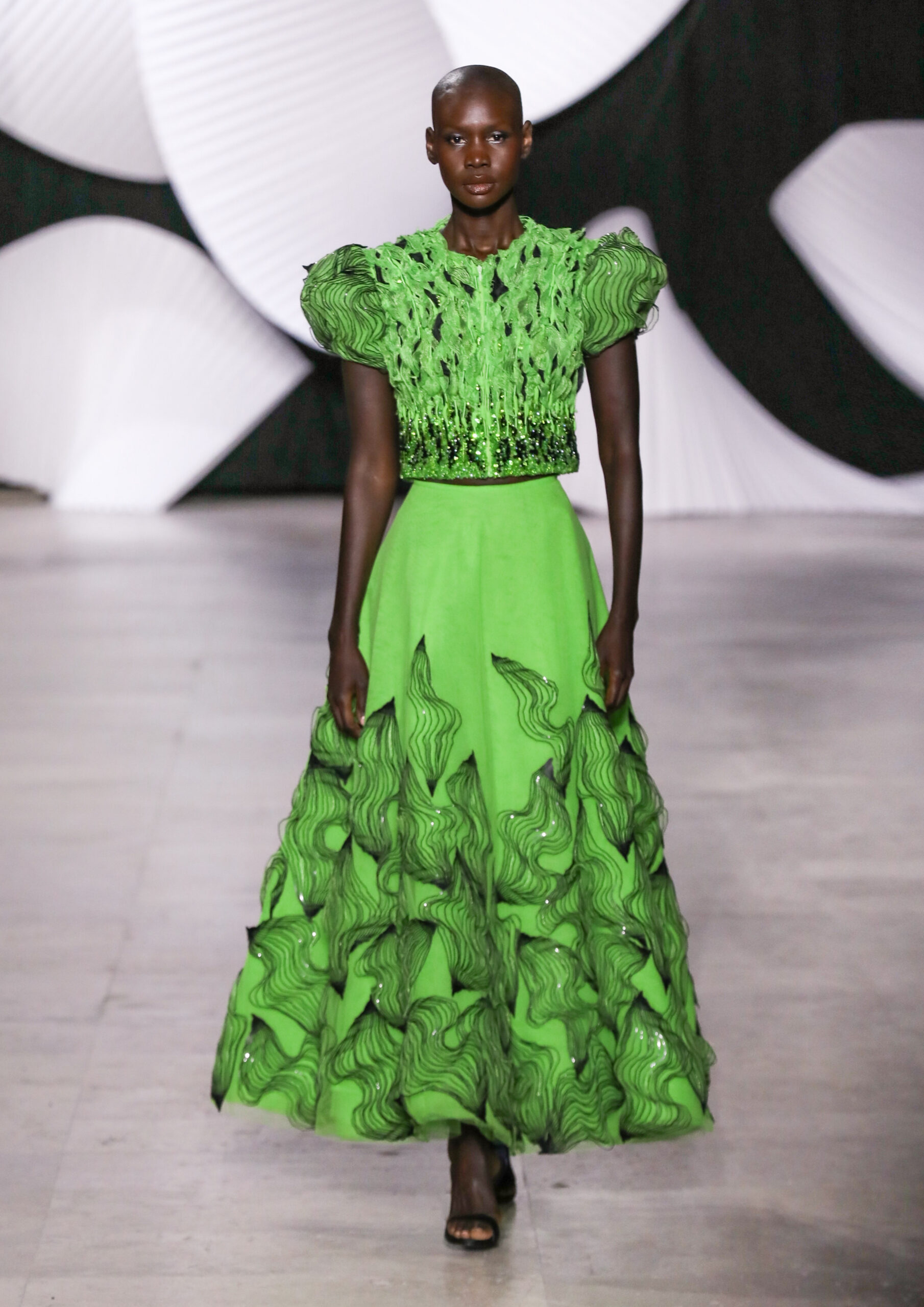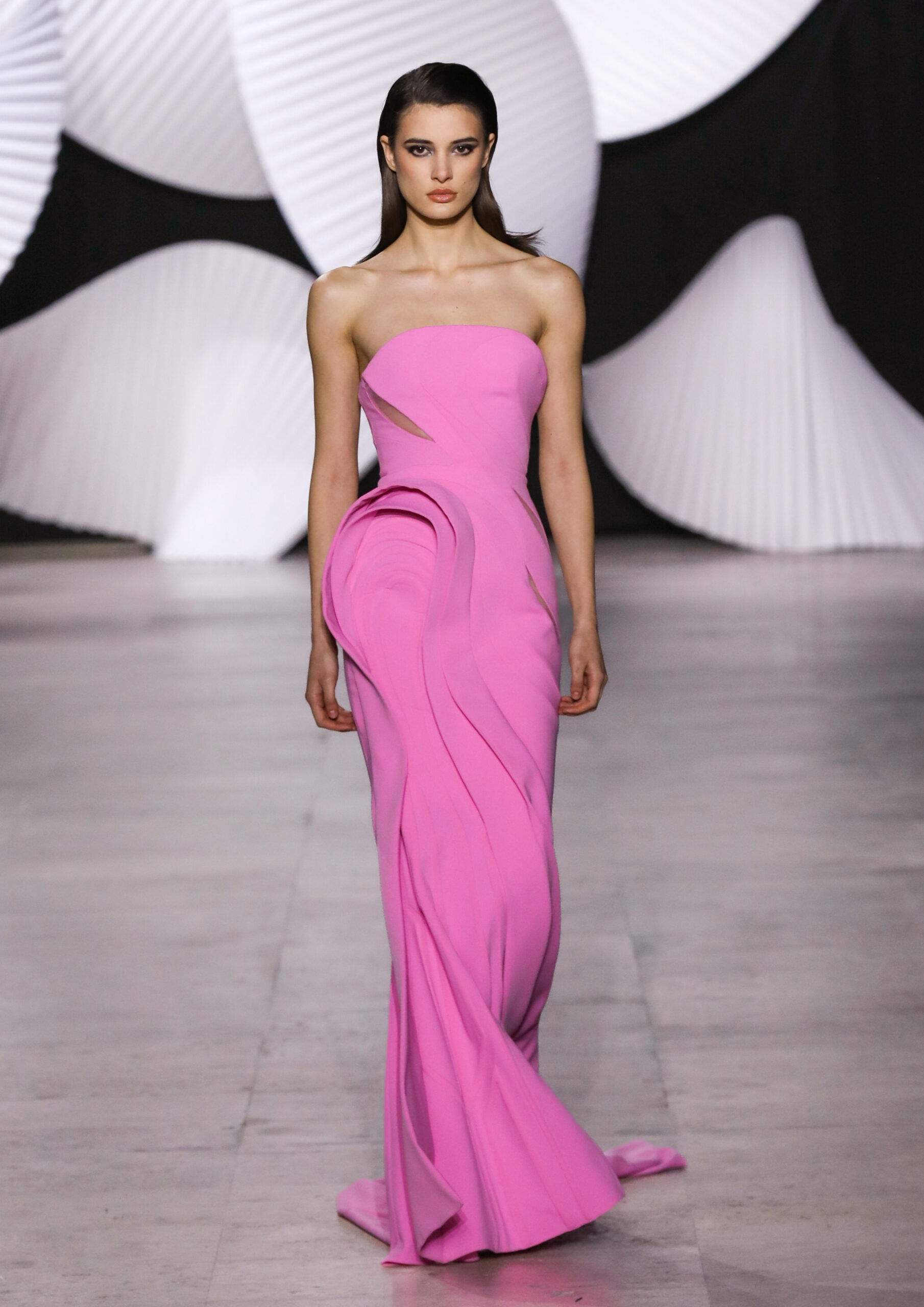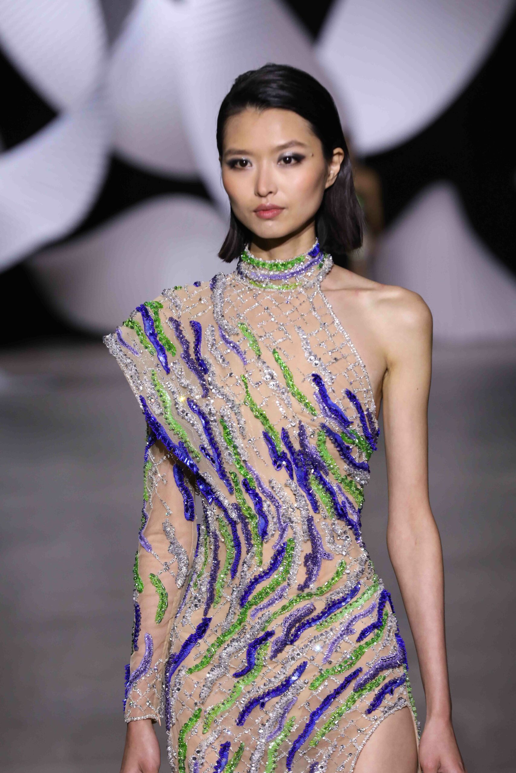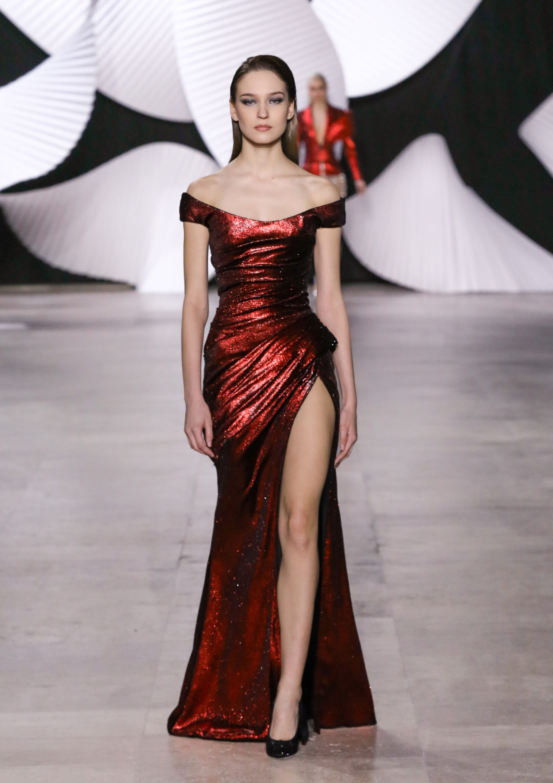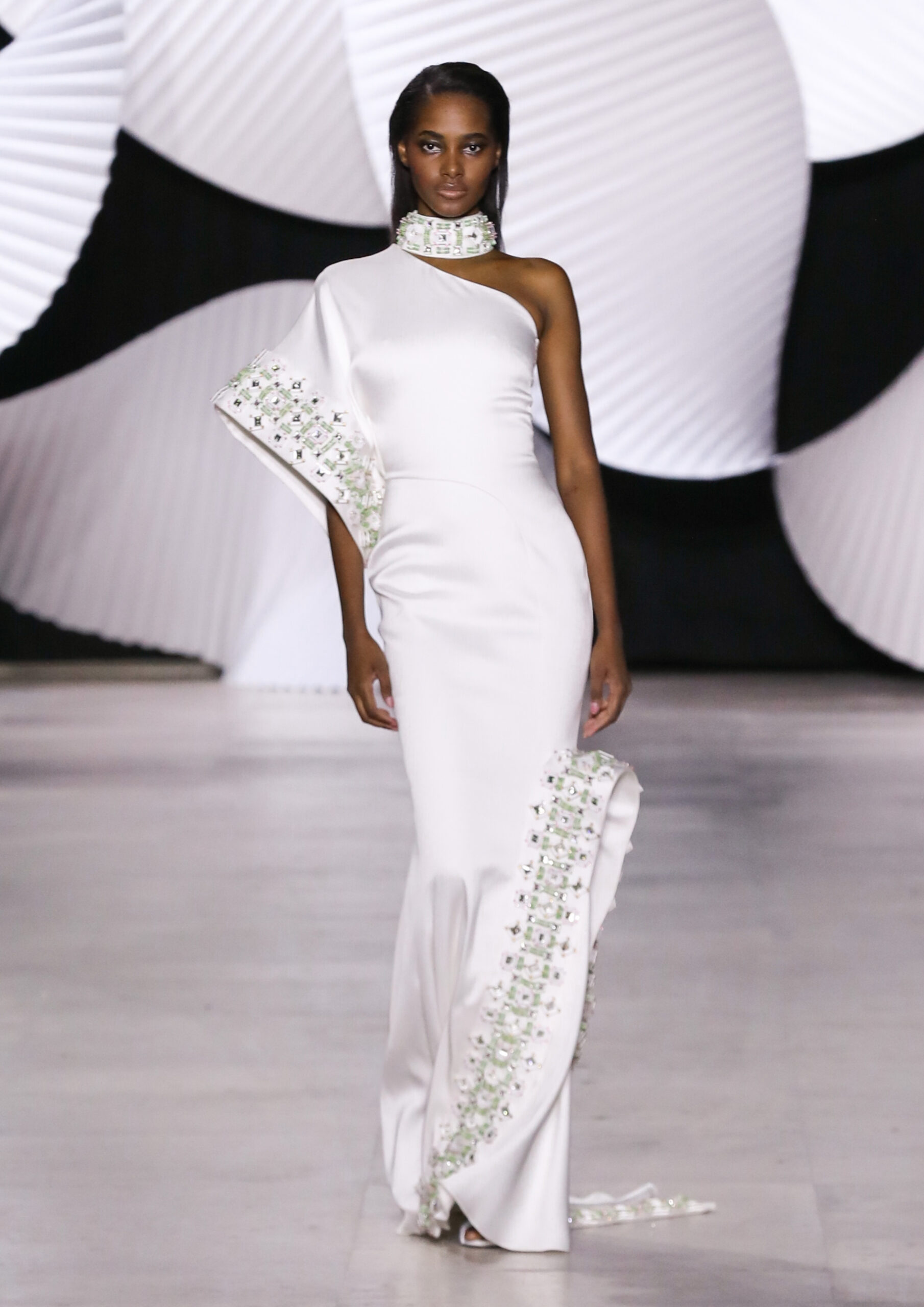 La collection se distingue par son audace dans l’utilisation de couleurs vibrantes – feuilles d’or, bleu électrique, rouge vif, lavande – toutes unifiées sous le thème du Nombre d’Or. Les manches édouardiennes, les superpositions de matières et les œuvres d’art tridimensionnelles créées par l’intersection de formes et de volumes différents montrent l’étendue de la créativité de Tony Ward.