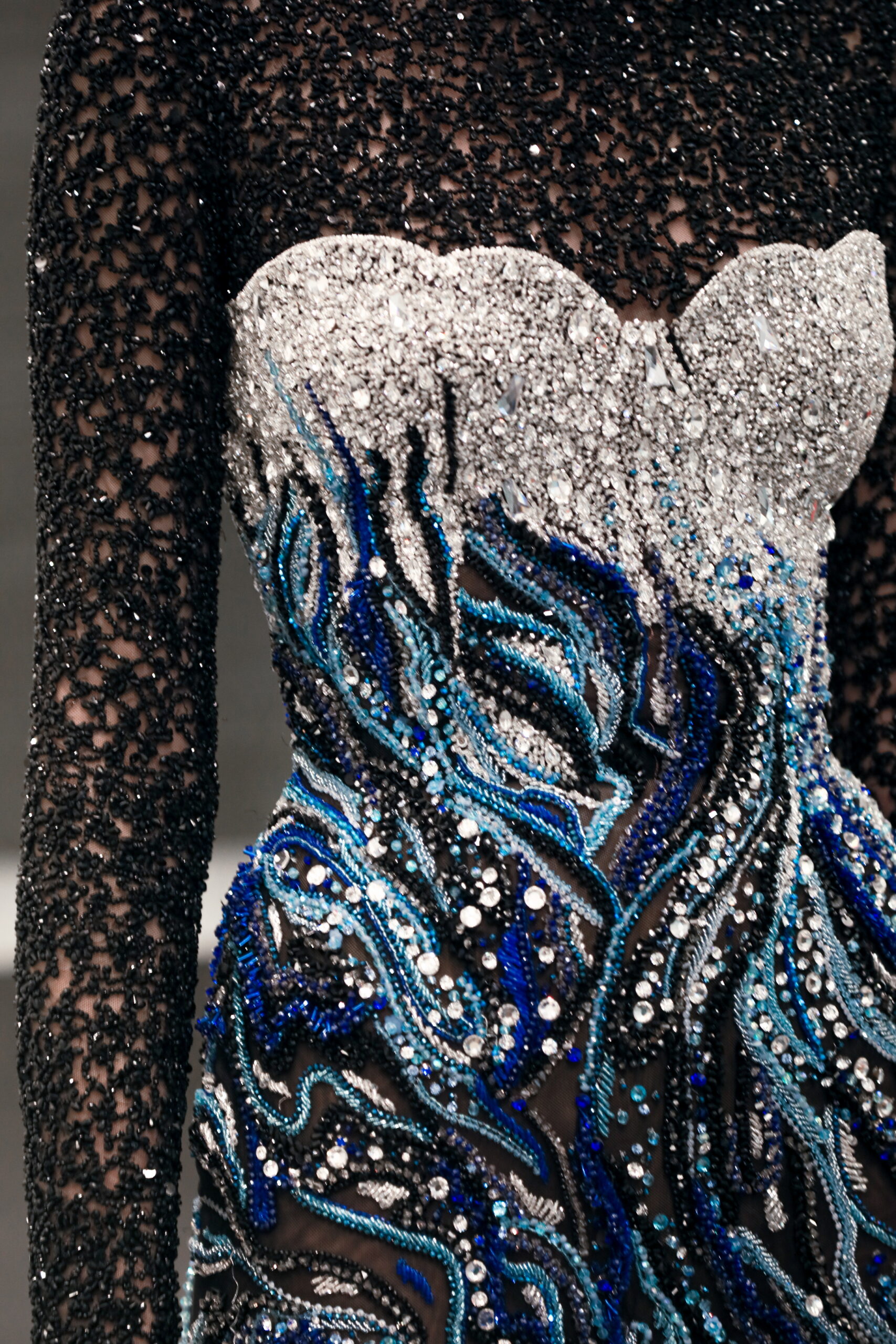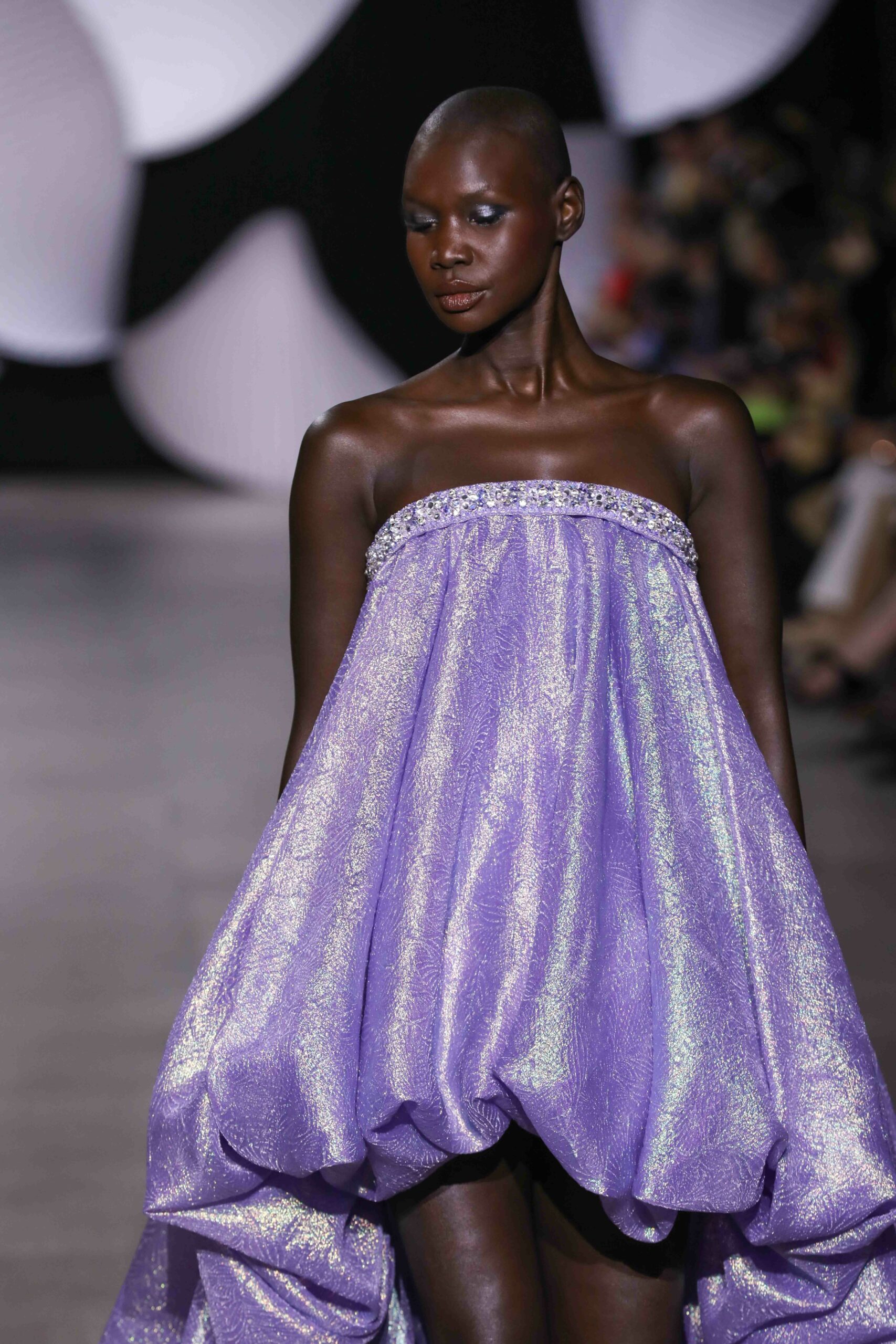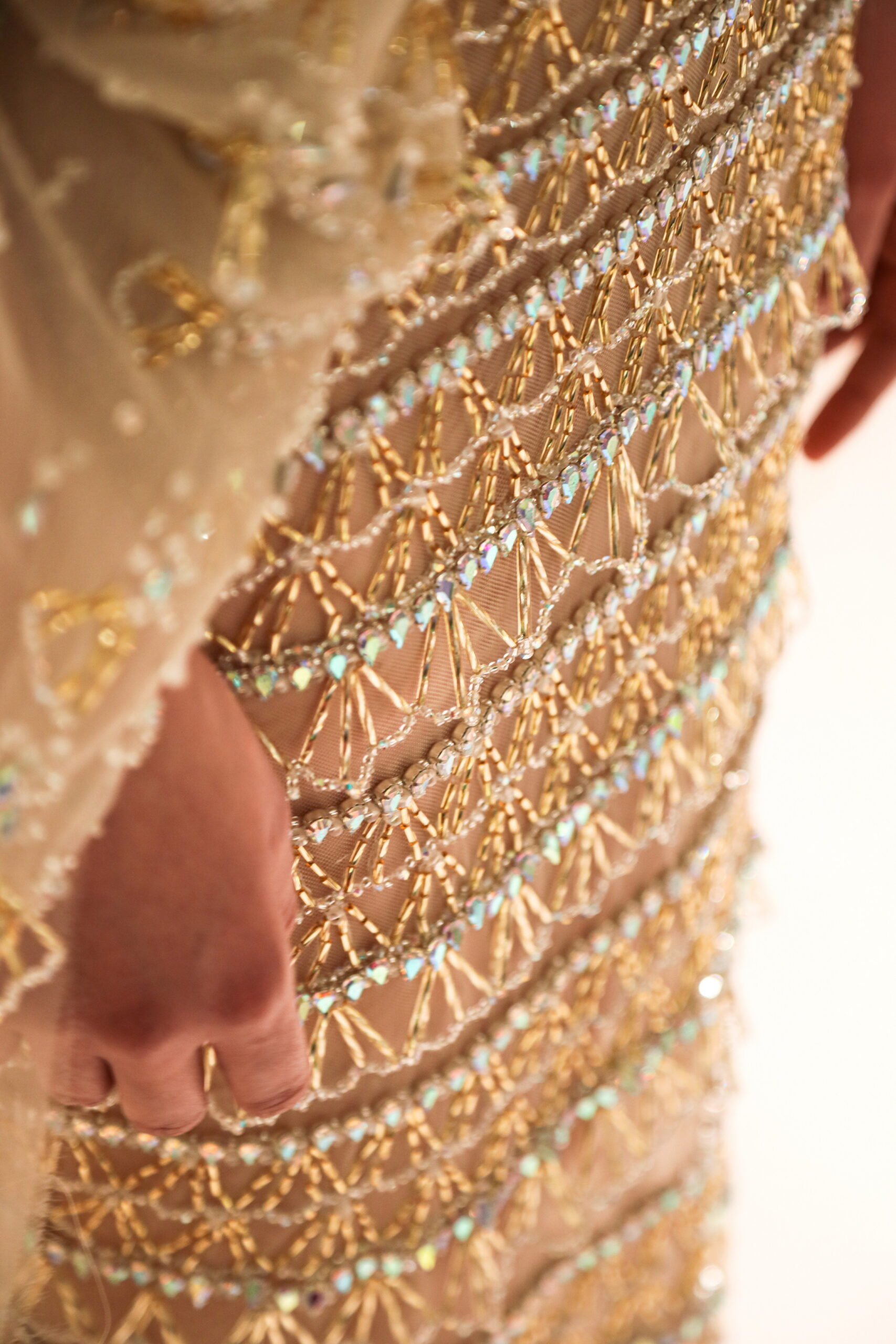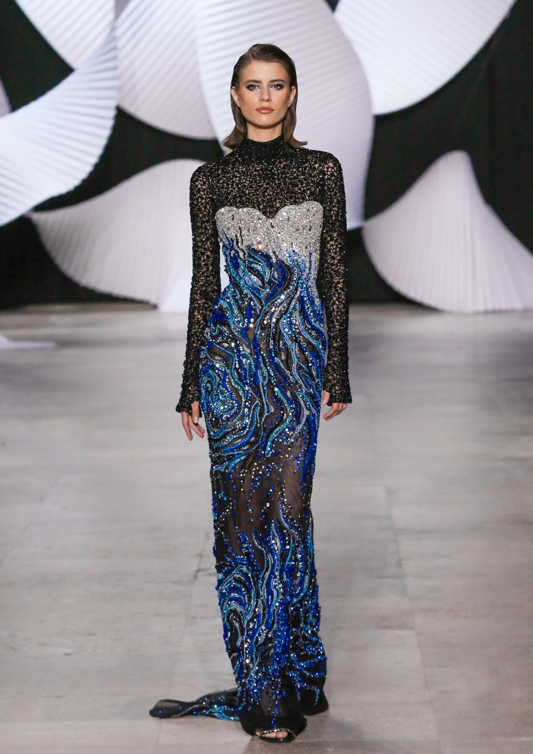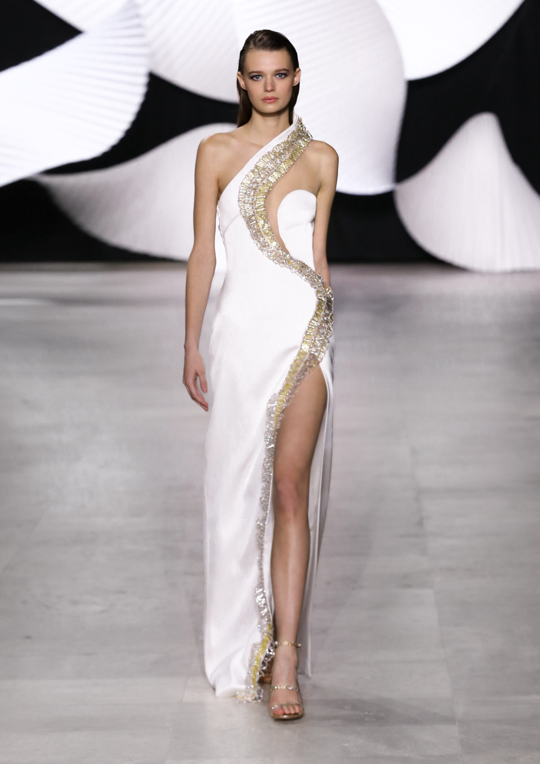 La collection se distingue par son audace dans l’utilisation de couleurs vibrantes – feuilles d’or, bleu électrique, rouge vif, lavande – toutes unifiées sous le thème du Nombre d’Or. Les manches édouardiennes, les superpositions de matières et les œuvres d’art tridimensionnelles créées par l’intersection de formes et de volumes différents montrent l’étendue de la créativité de Tony Ward.