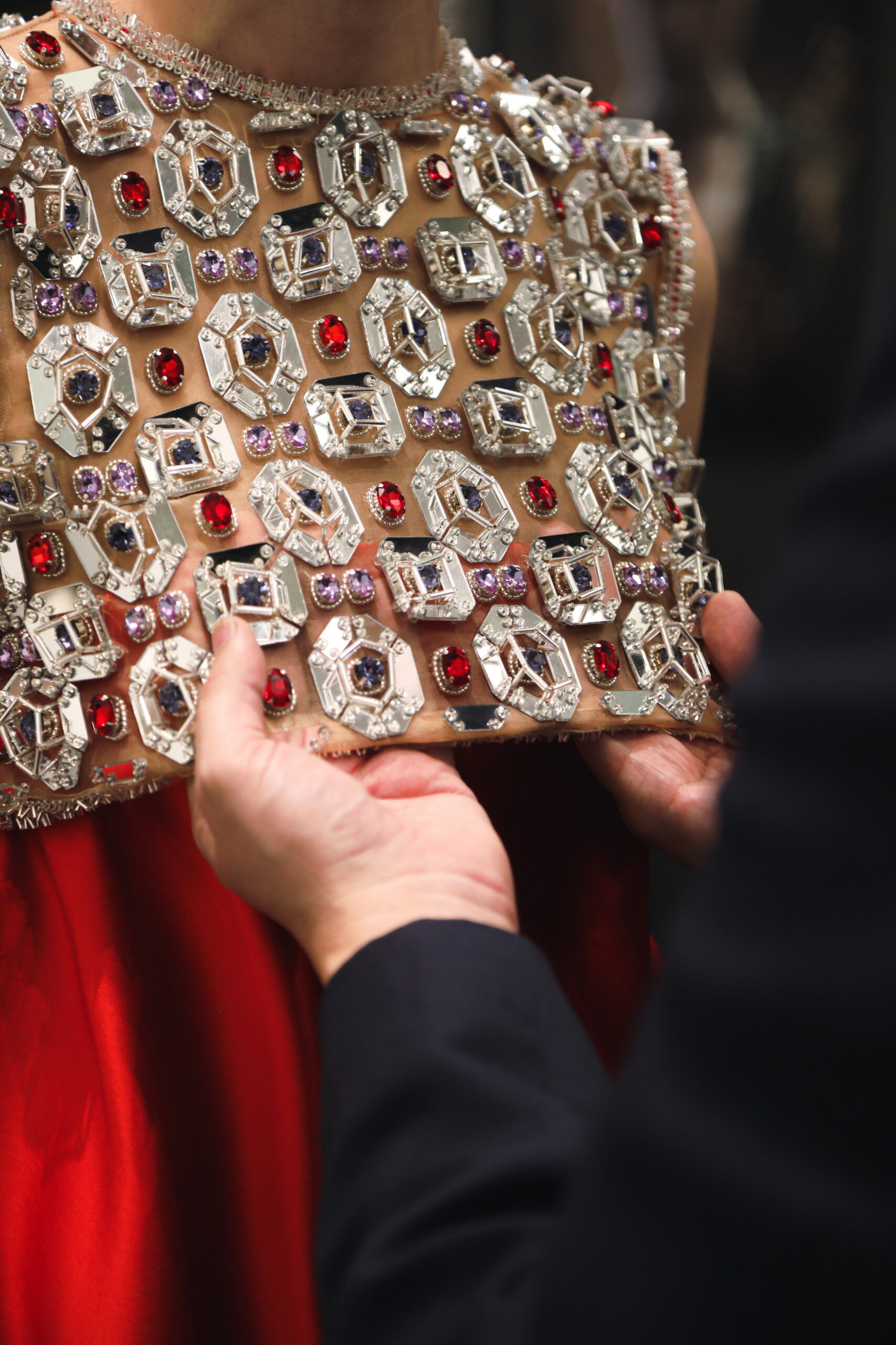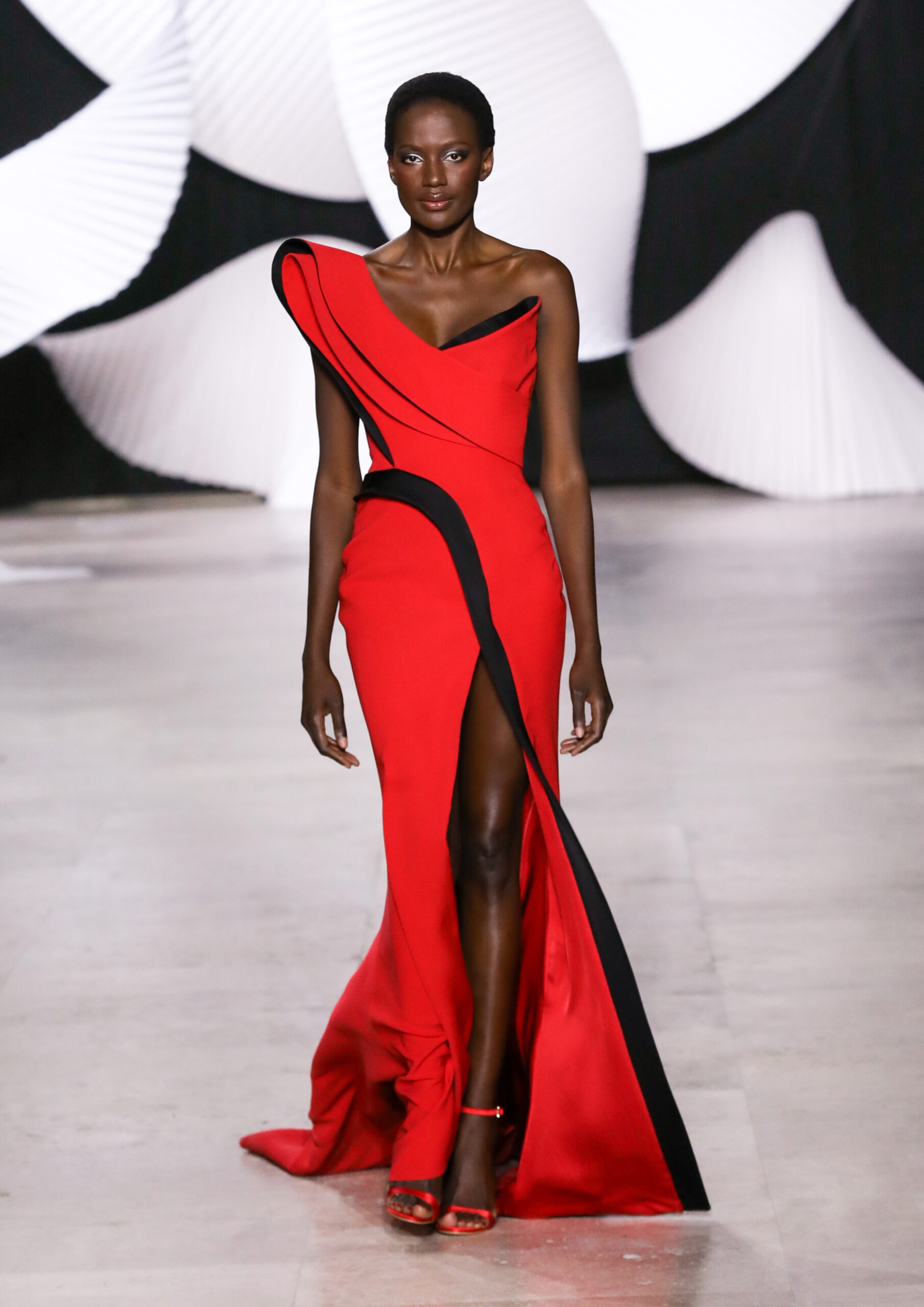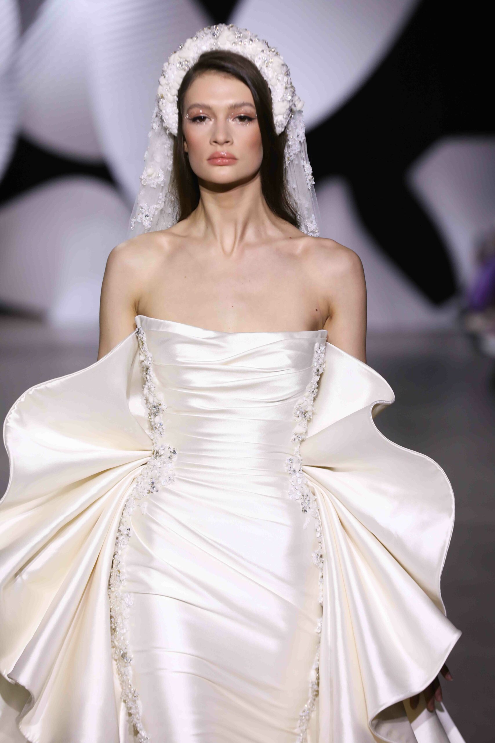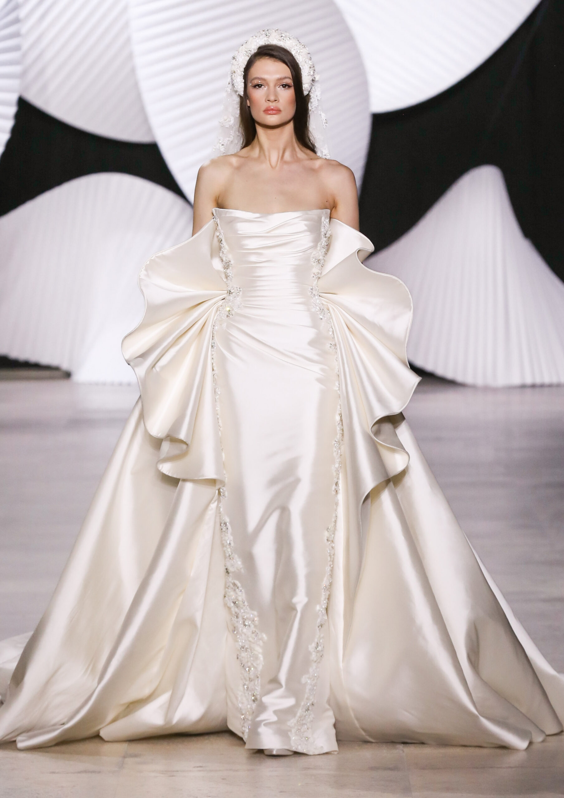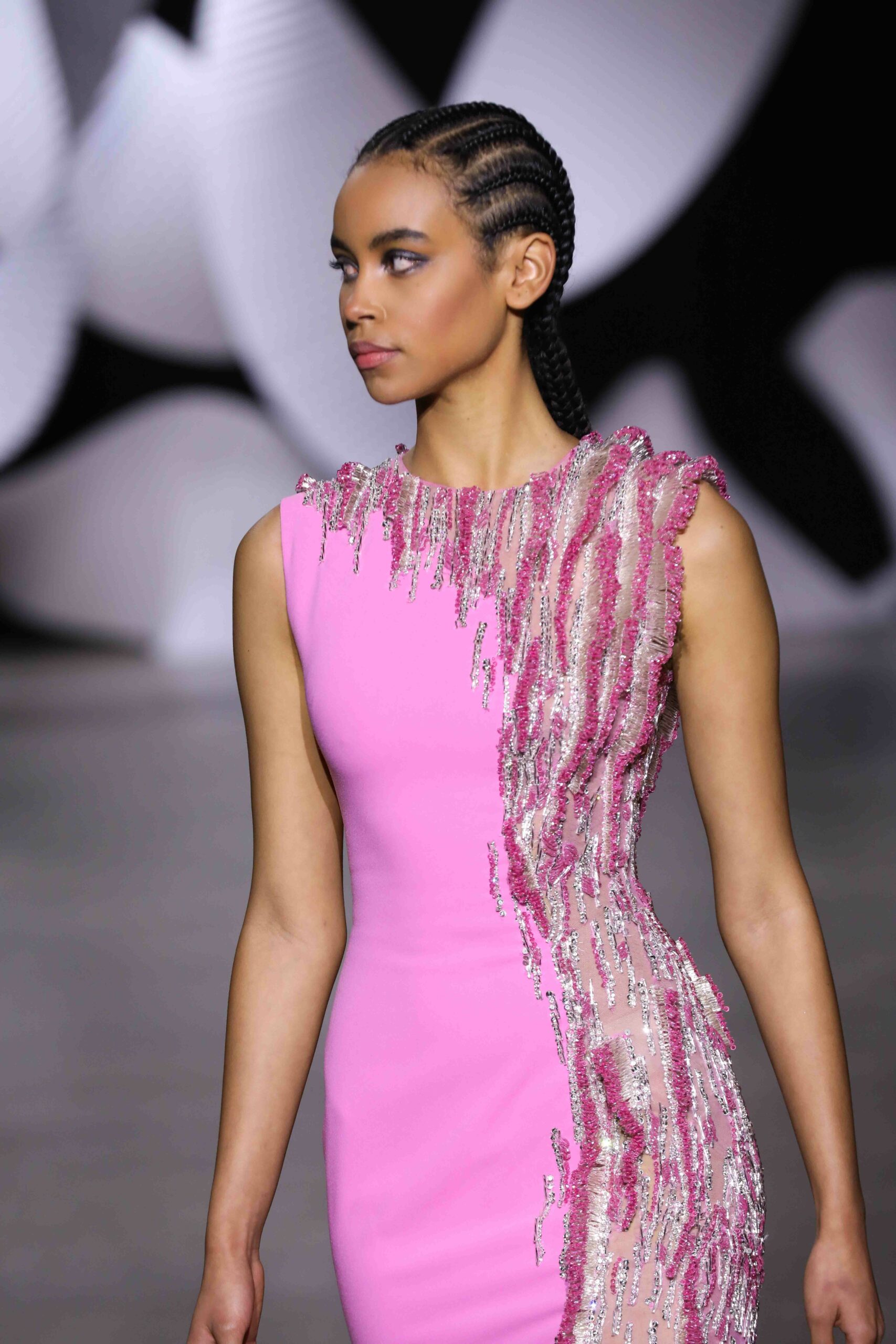 La collection se distingue par son audace dans l’utilisation de couleurs vibrantes – feuilles d’or, bleu électrique, rouge vif, lavande – toutes unifiées sous le thème du Nombre d’Or. Les manches édouardiennes, les superpositions de matières et les œuvres d’art tridimensionnelles créées par l’intersection de formes et de volumes différents montrent l’étendue de la créativité de Tony Ward.