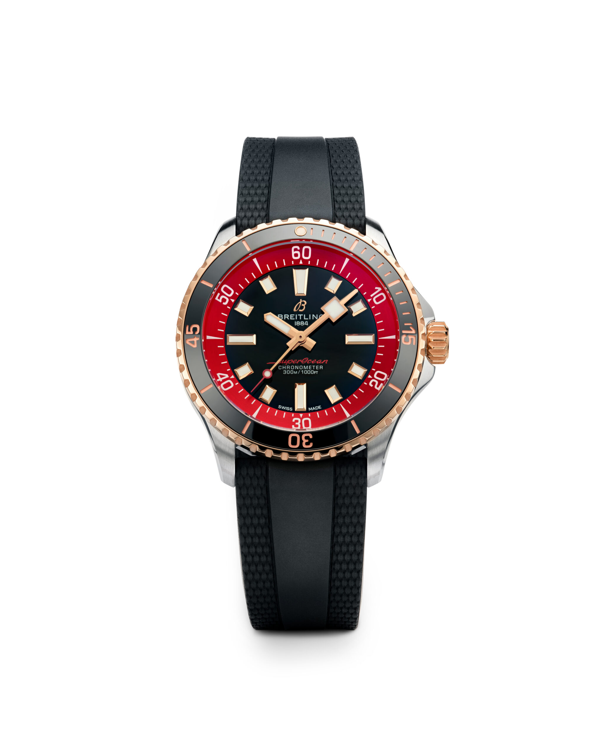 La Bucherer Exclusive Breitling Superocean 42 allie élégance classique et fonctionnalités pratiques d’une montre de plongée. Son cadran bordeaux et son échelle des minutes forment un ensemble splendide. La lunette tournante unidirectionnelle en or rose avec incrustation en céramique ajoute une touche de luxe. Comme les autres modèles de cette édition limitée, elle est équipée d’aiguilles larges et d’index revêtus de Super LumiNova®, assurant une lisibilité optimale, même sous l’eau et de nuit.