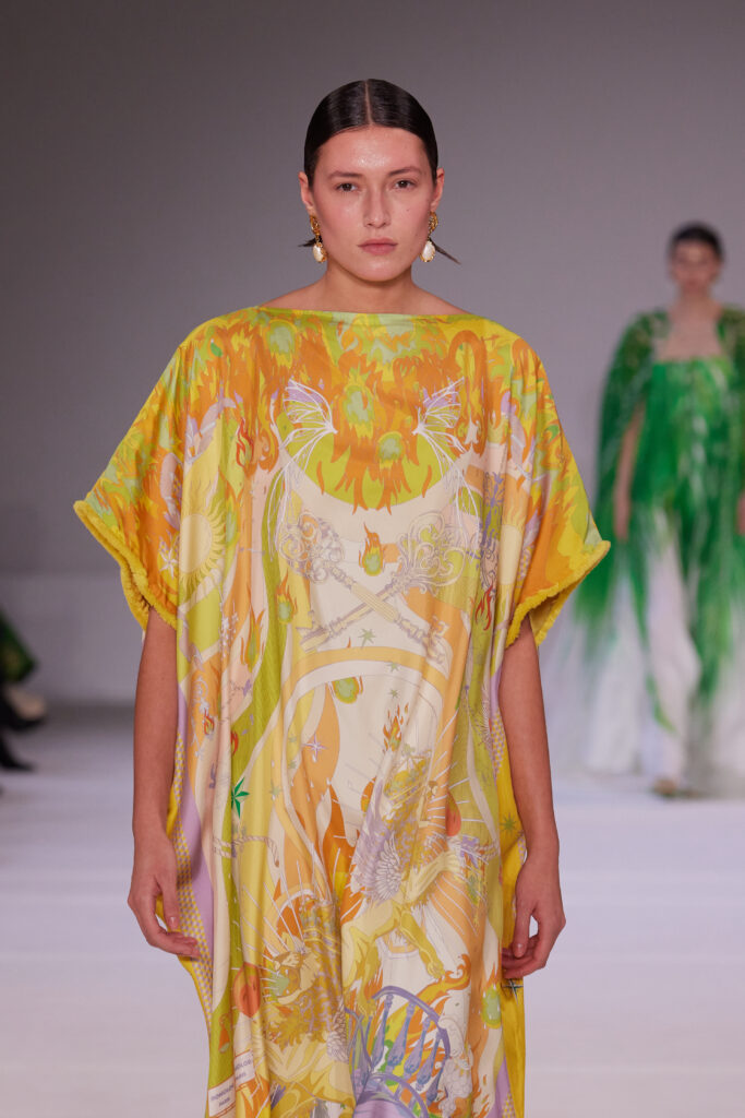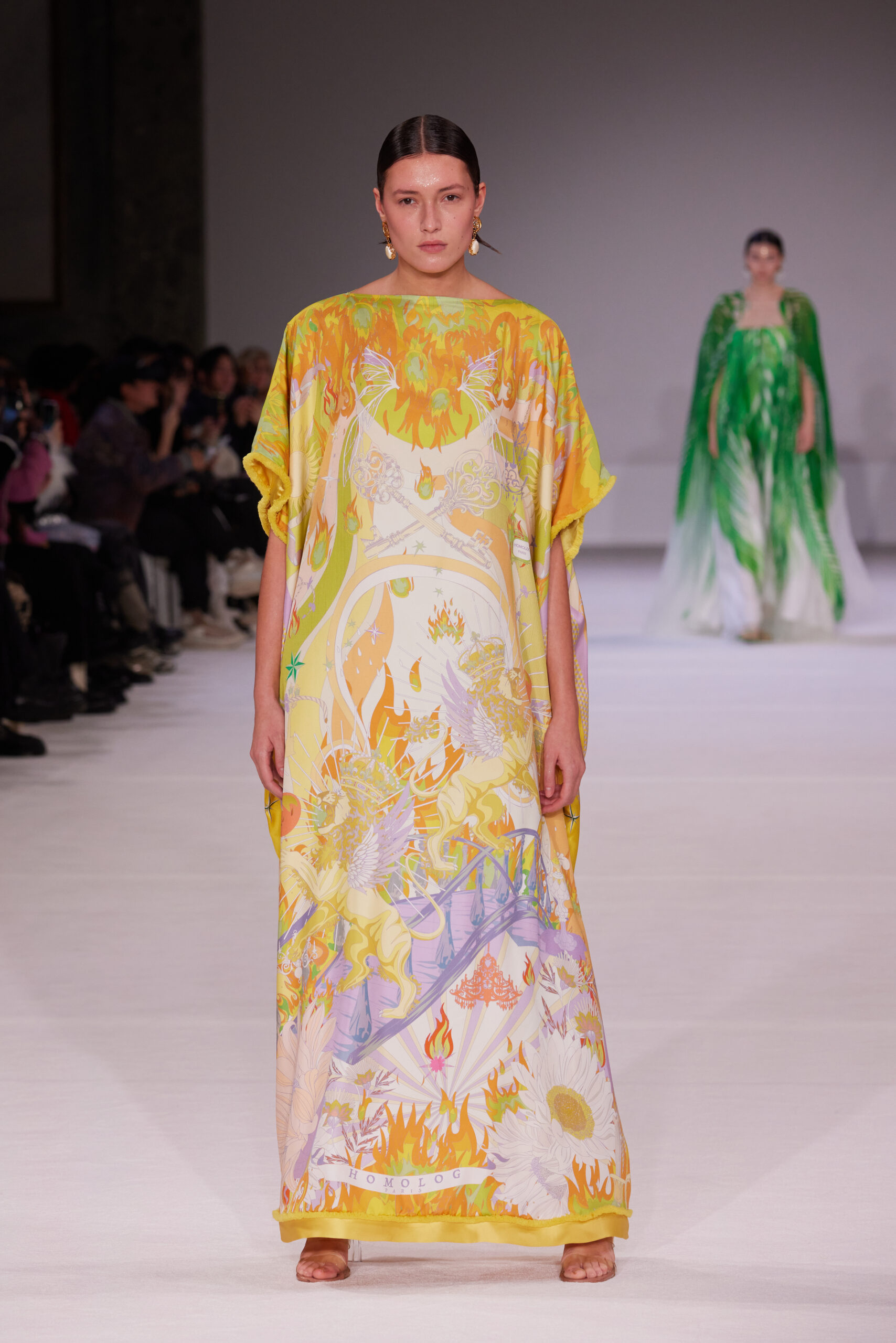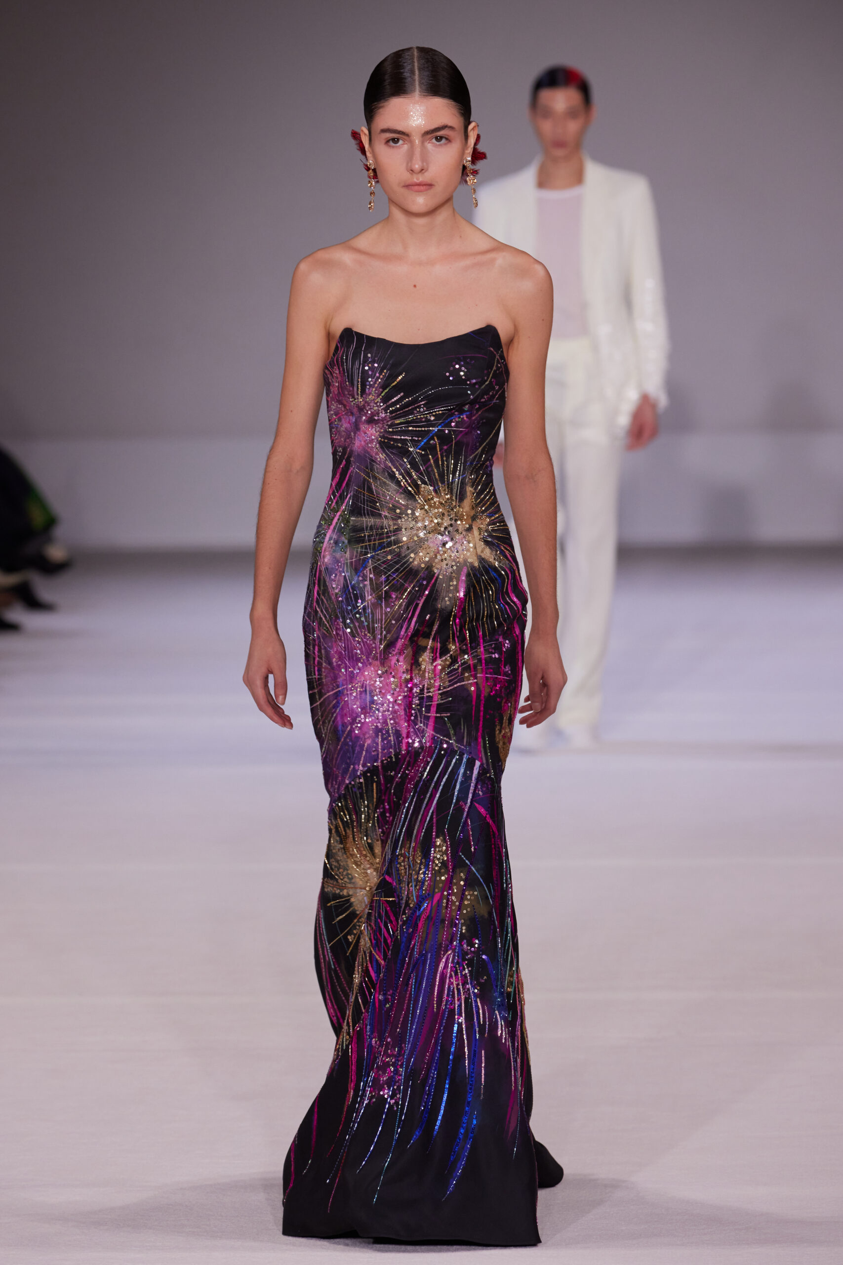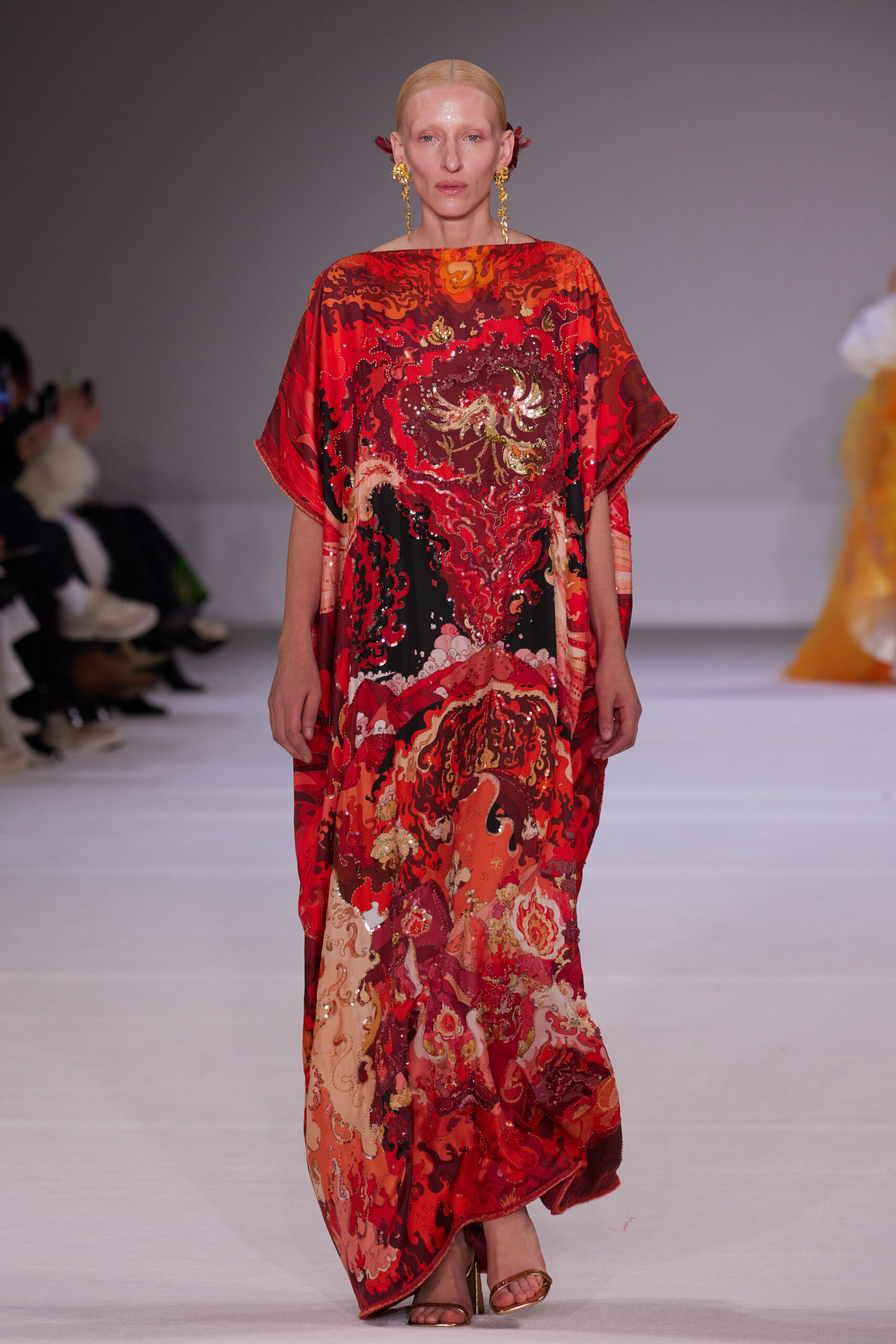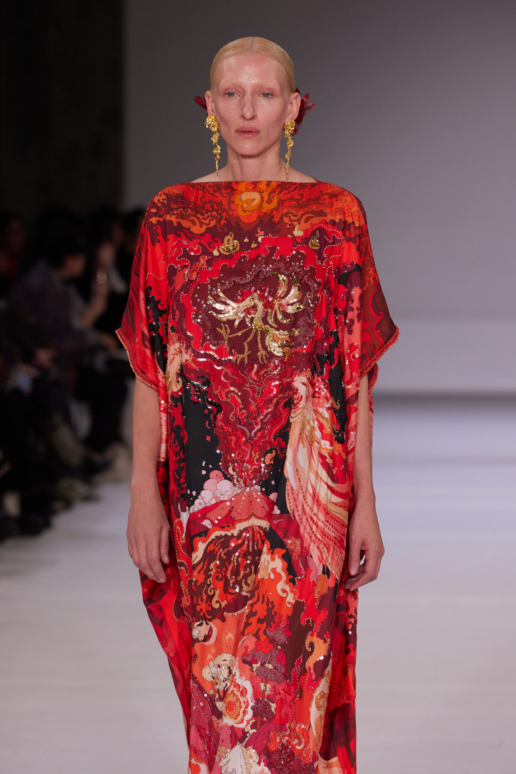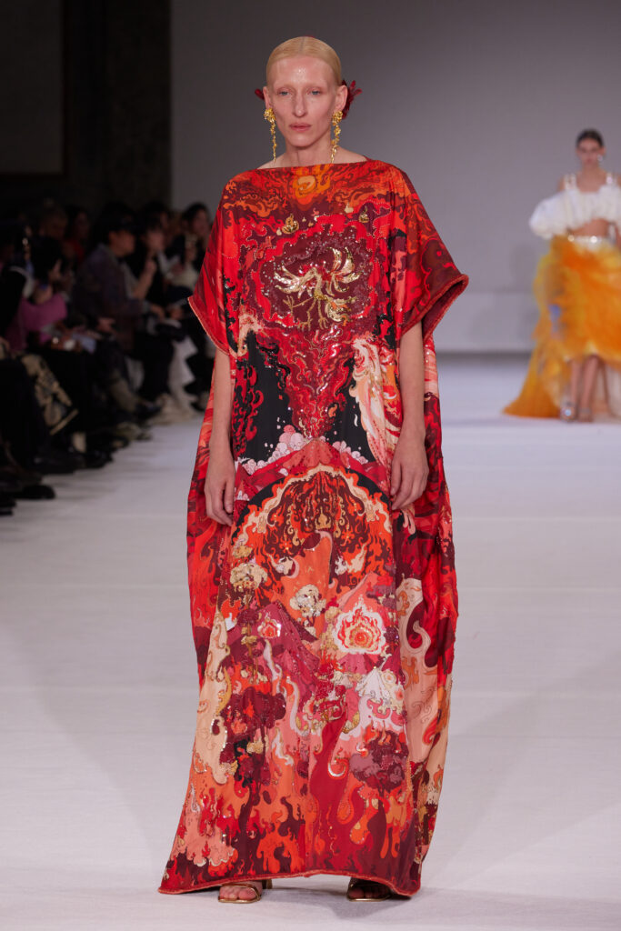 Emily Cheong et son équipe ont plongé dans l’étude des totems et des récits des dieux du feu, capturant leur caractère magique pour les transformer en motifs imprimés vibrants. Grâce à une coupe experte et un savoir-faire COUTURE, les robes s’ajustent parfaitement, soulignant le contrôle et la maîtrise de la silhouette.