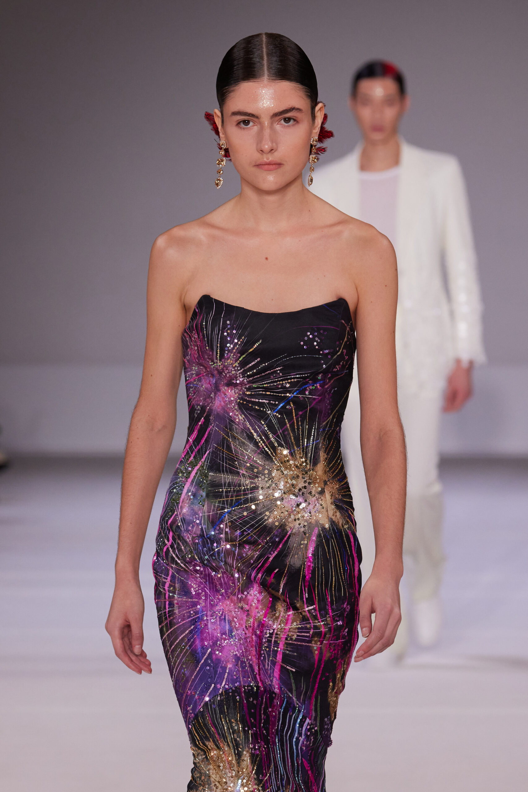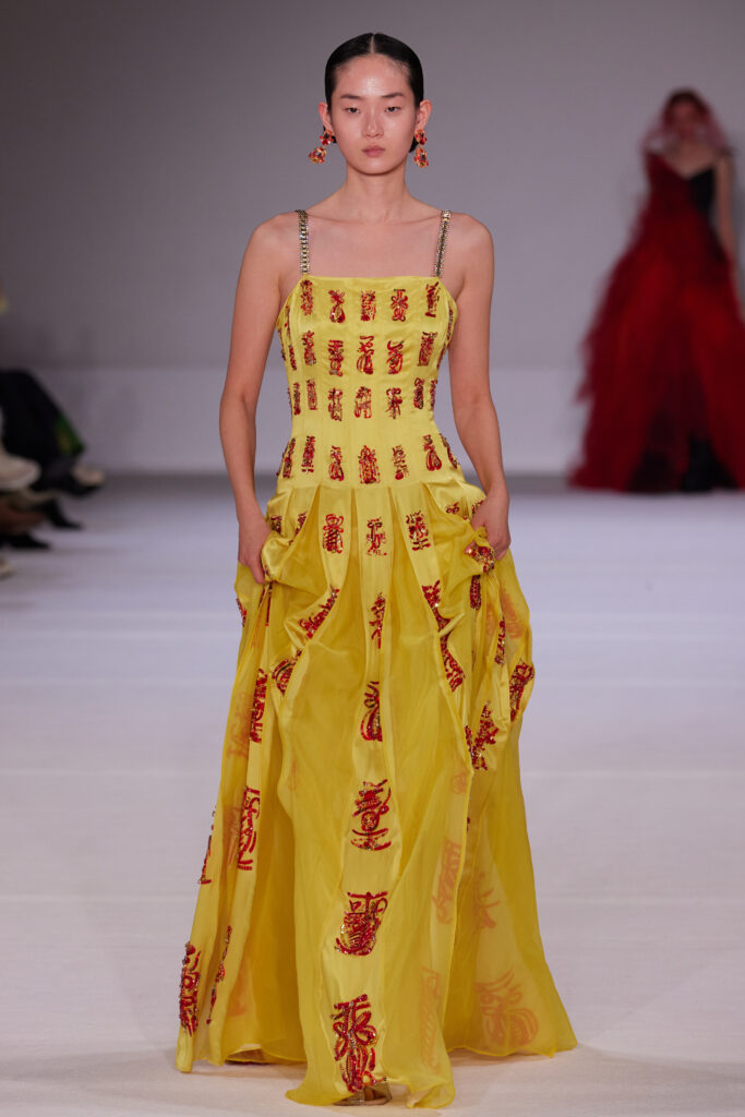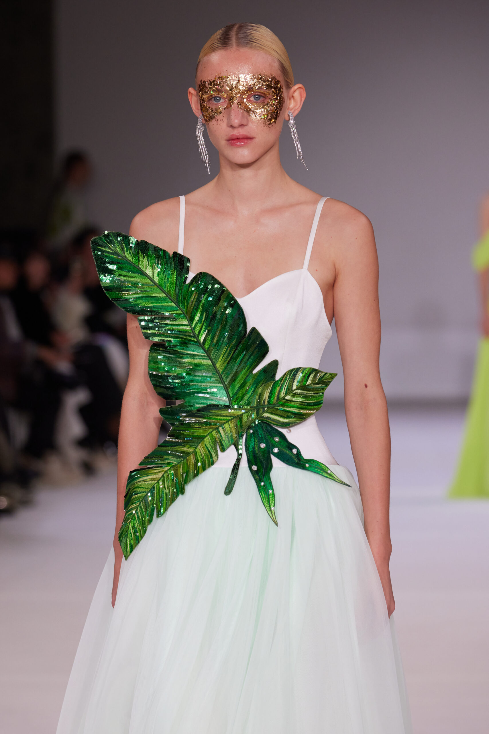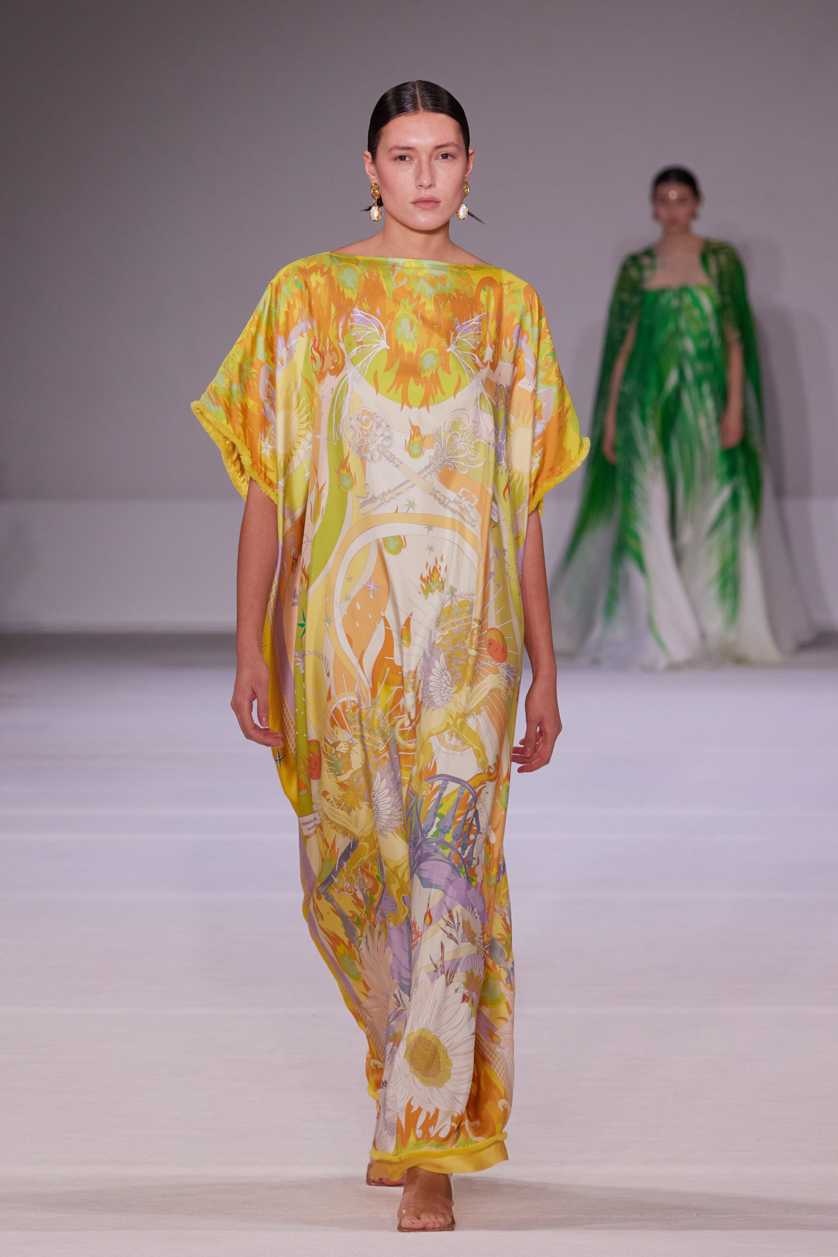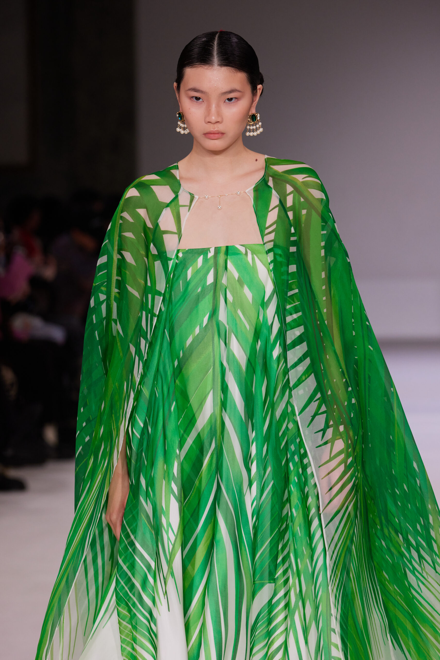 Emily Cheong et son équipe ont plongé dans l’étude des totems et des récits des dieux du feu, capturant leur caractère magique pour les transformer en motifs imprimés vibrants. Grâce à une coupe experte et un savoir-faire COUTURE, les robes s’ajustent parfaitement, soulignant le contrôle et la maîtrise de la silhouette.