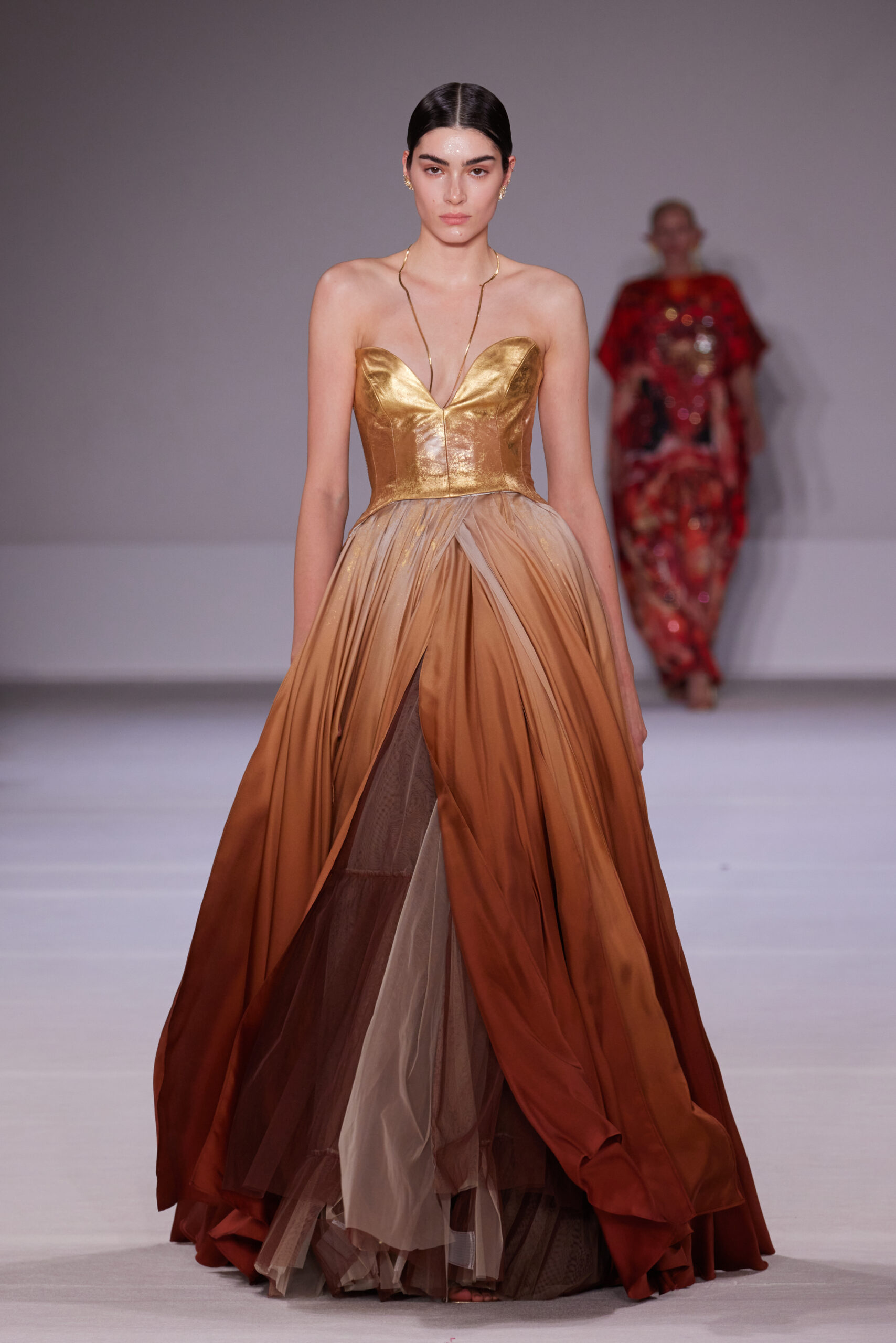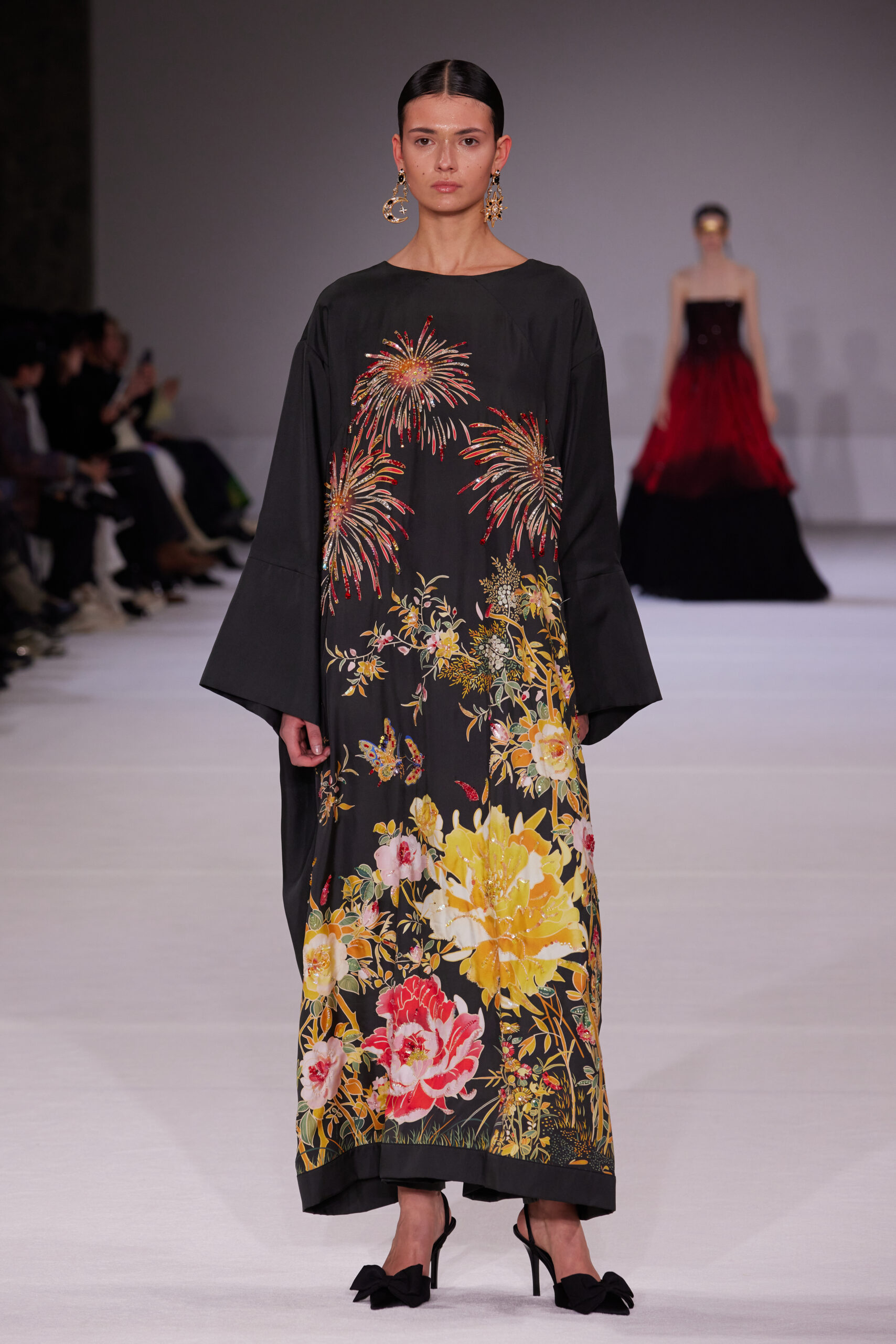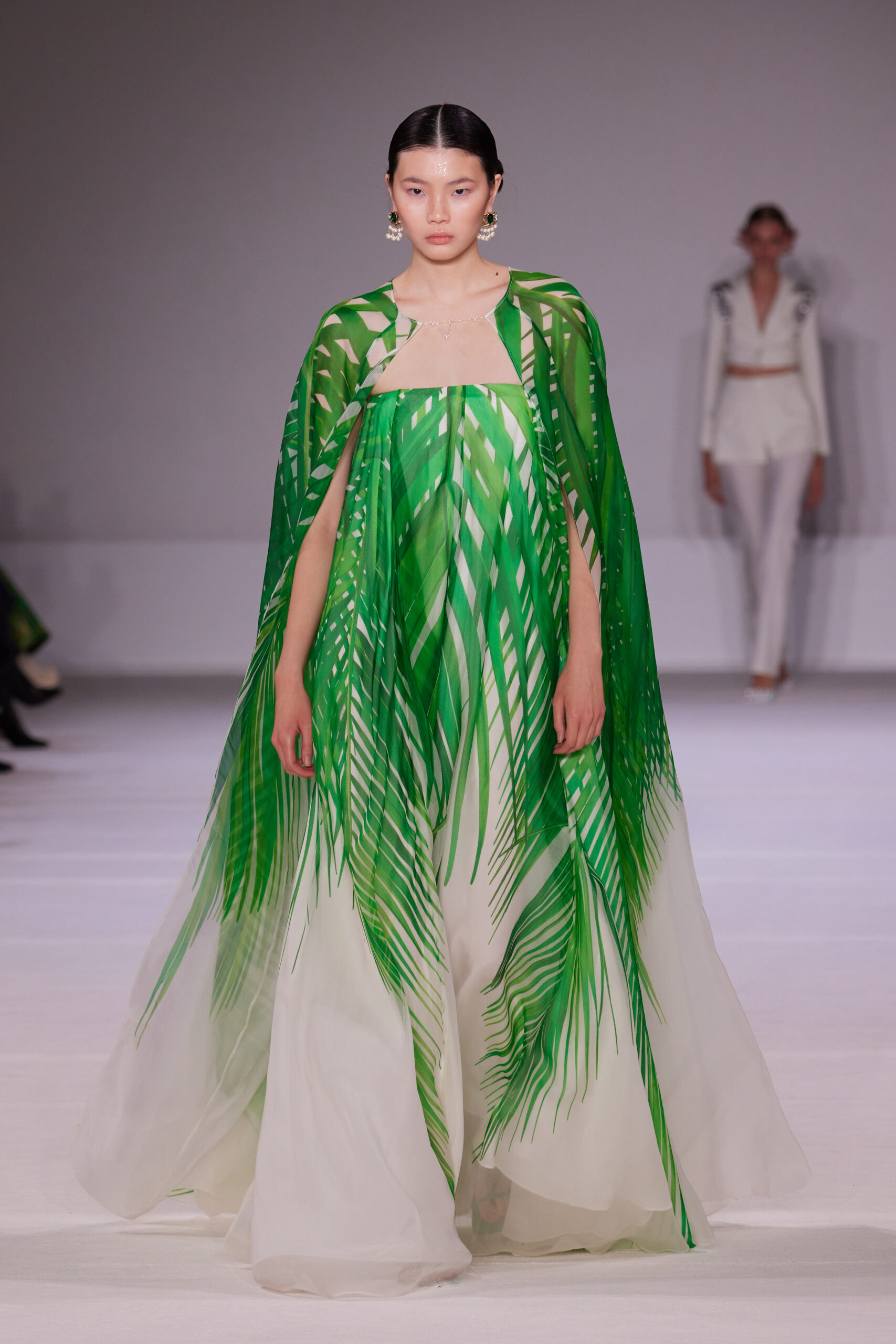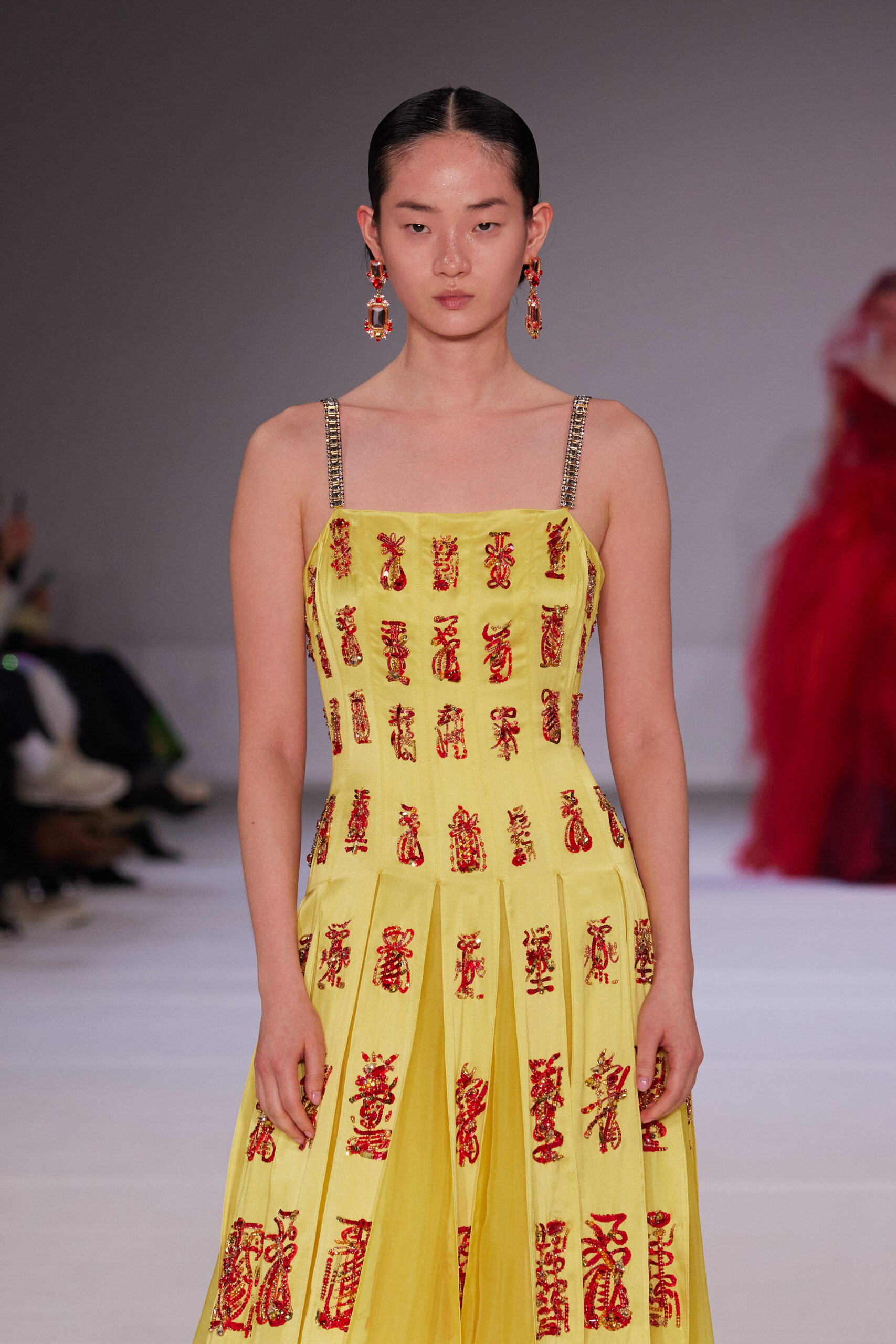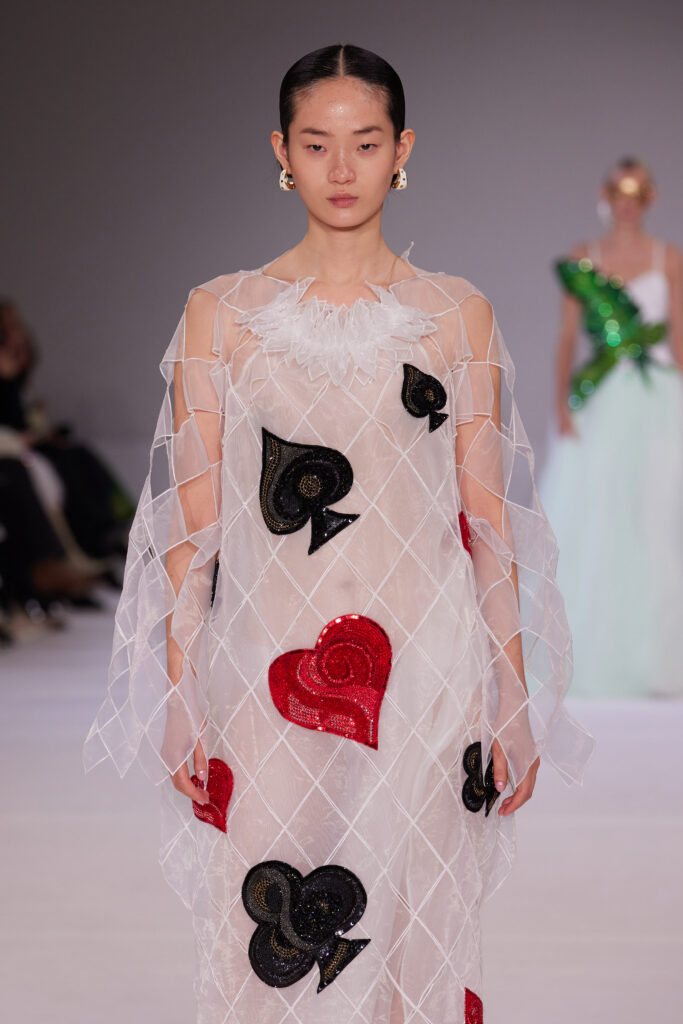 Emily Cheong et son équipe ont plongé dans l’étude des totems et des récits des dieux du feu, capturant leur caractère magique pour les transformer en motifs imprimés vibrants. Grâce à une coupe experte et un savoir-faire COUTURE, les robes s’ajustent parfaitement, soulignant le contrôle et la maîtrise de la silhouette.