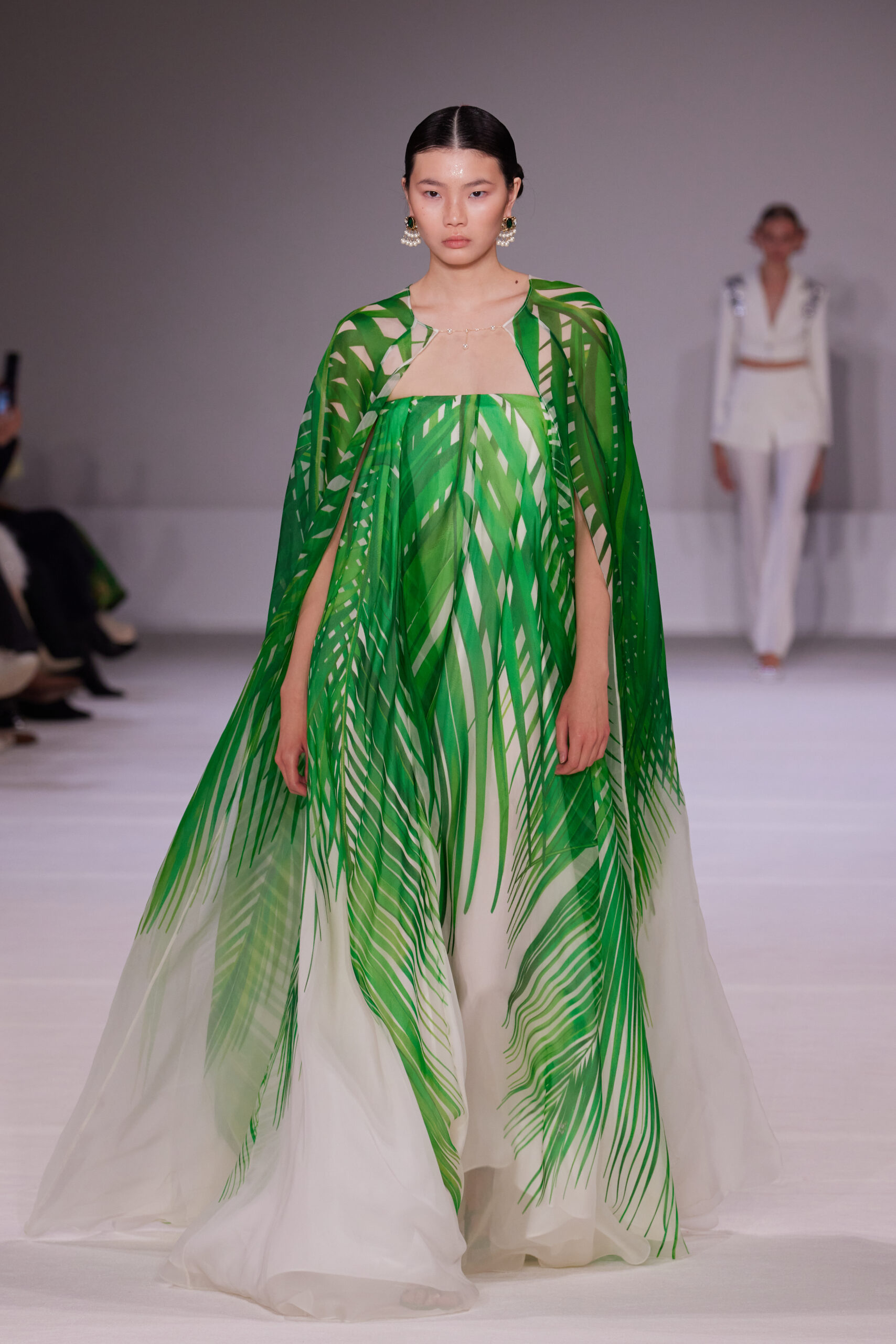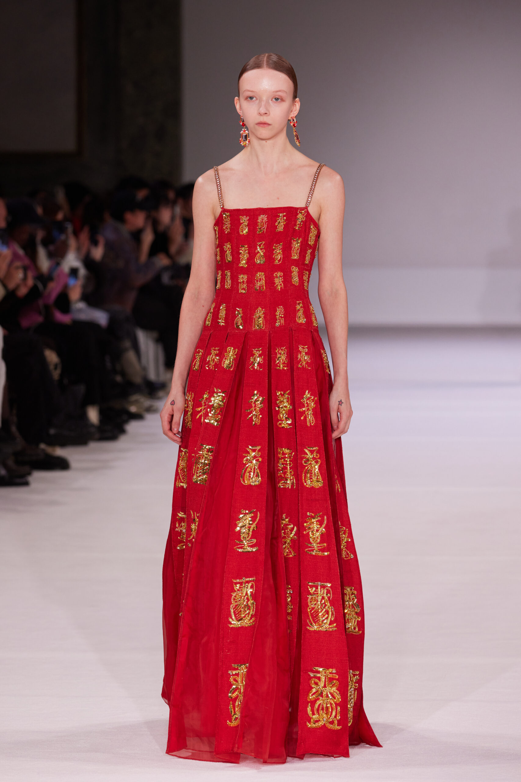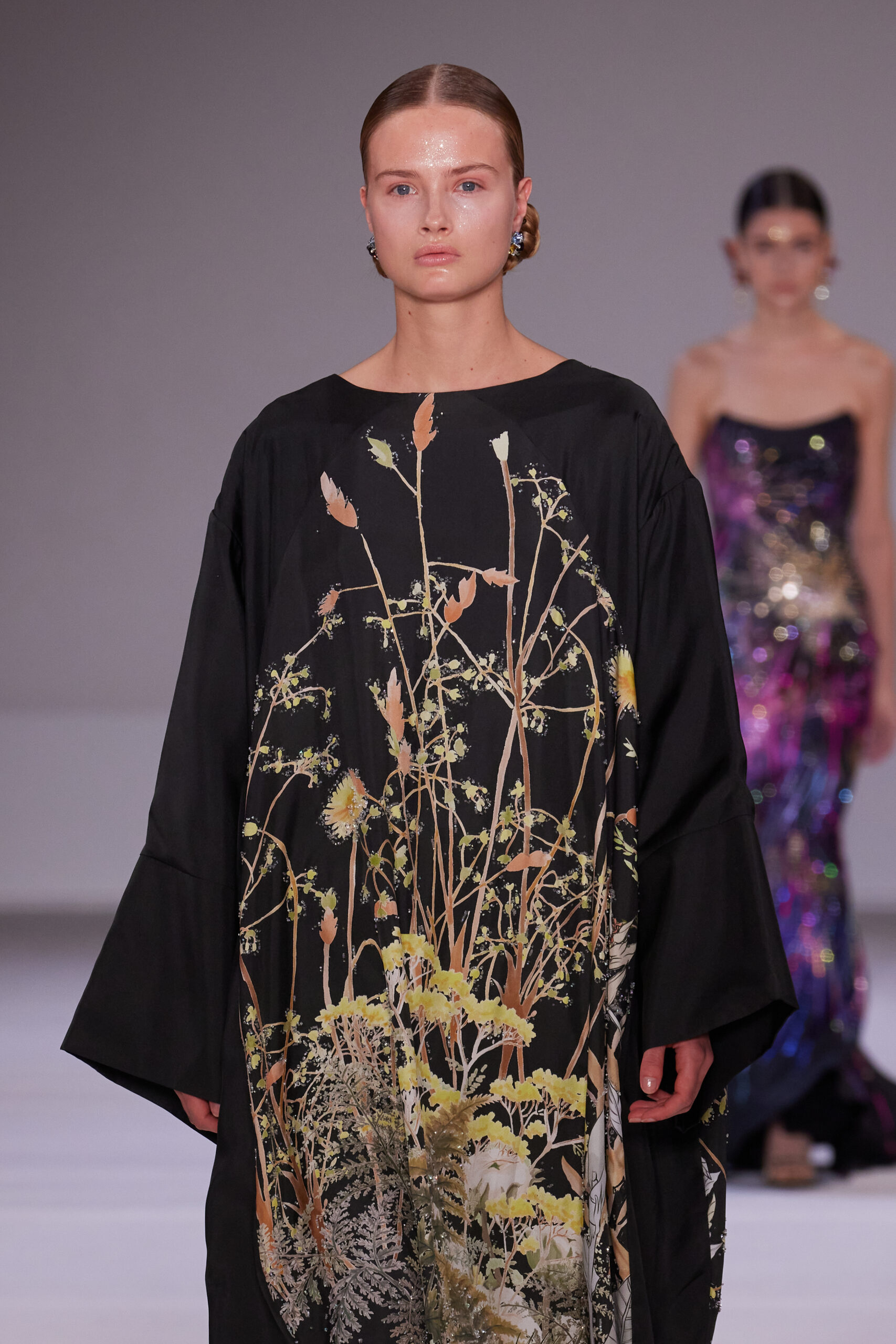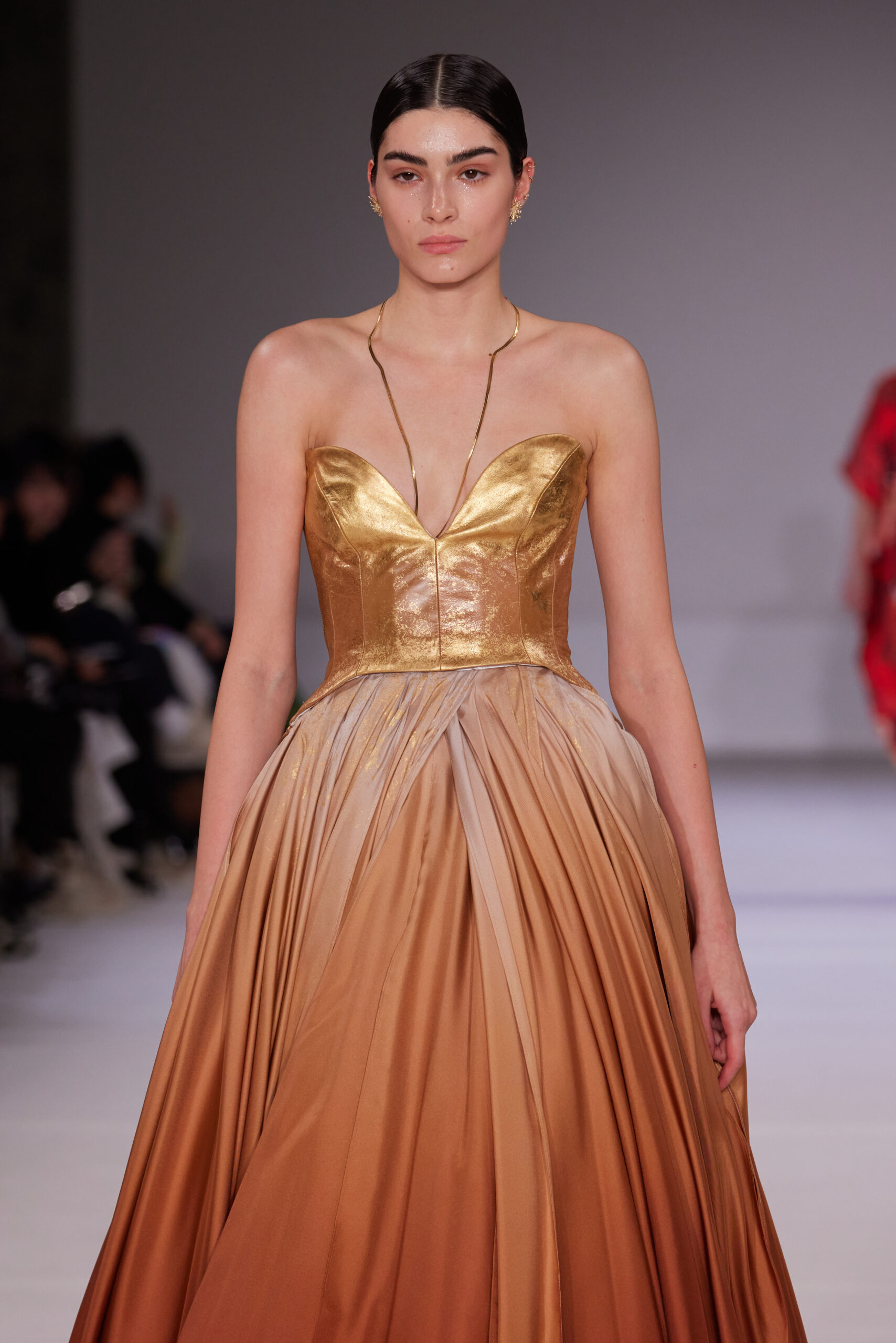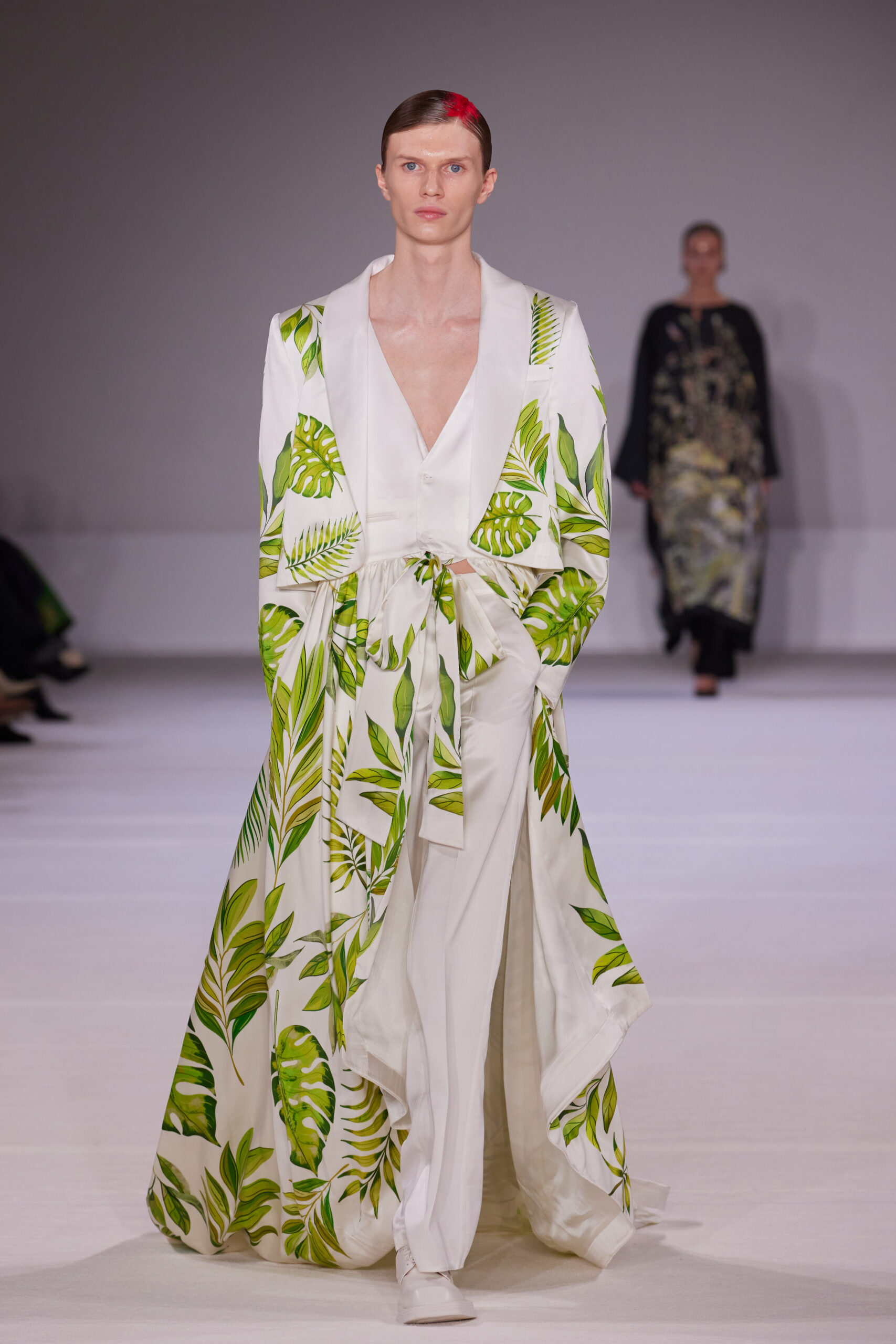 Emily Cheong et son équipe ont plongé dans l’étude des totems et des récits des dieux du feu, capturant leur caractère magique pour les transformer en motifs imprimés vibrants. Grâce à une coupe experte et un savoir-faire COUTURE, les robes s’ajustent parfaitement, soulignant le contrôle et la maîtrise de la silhouette.