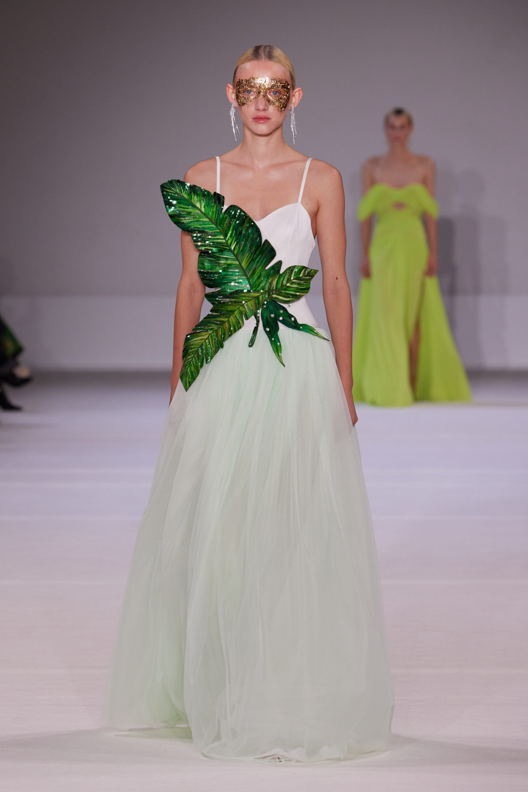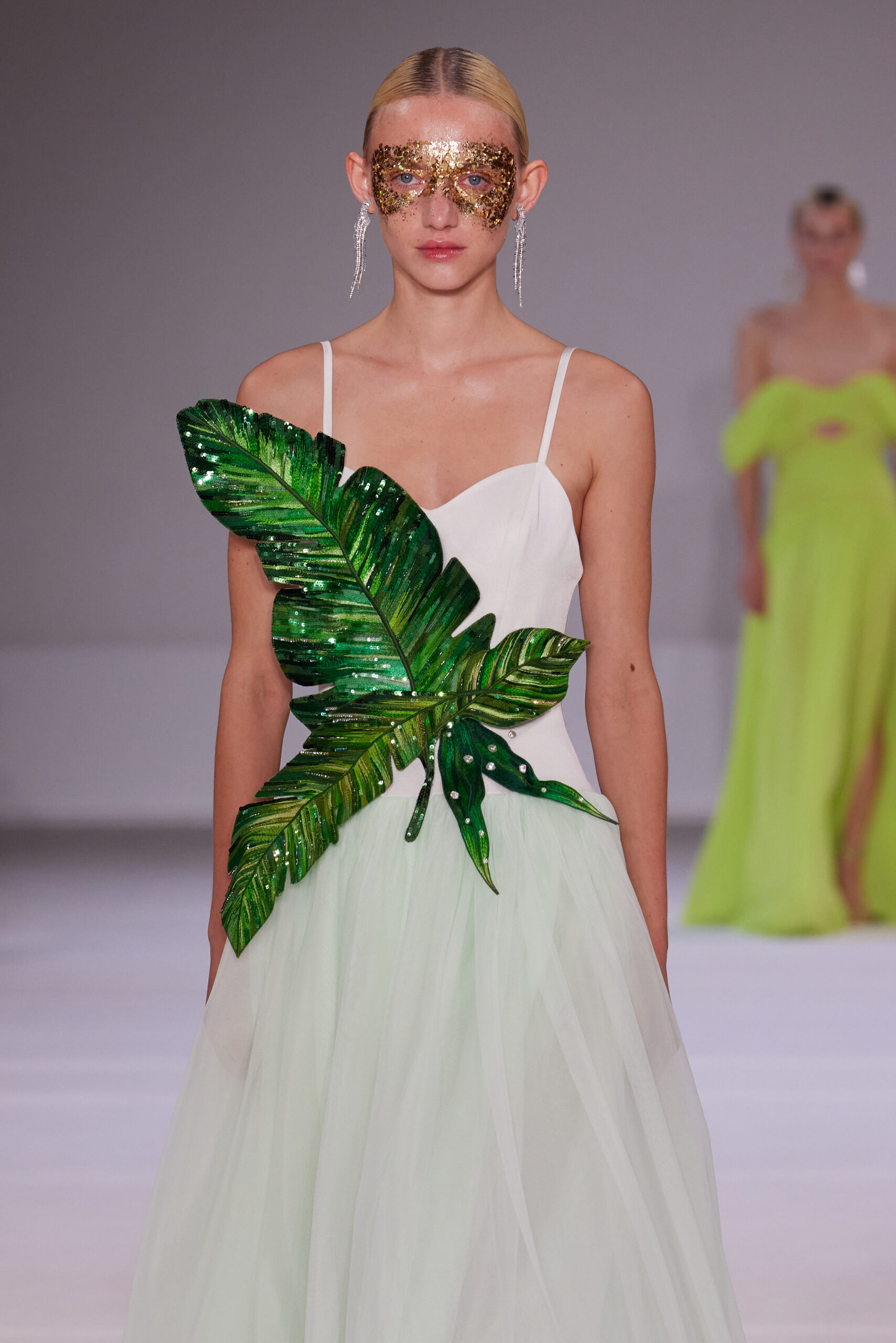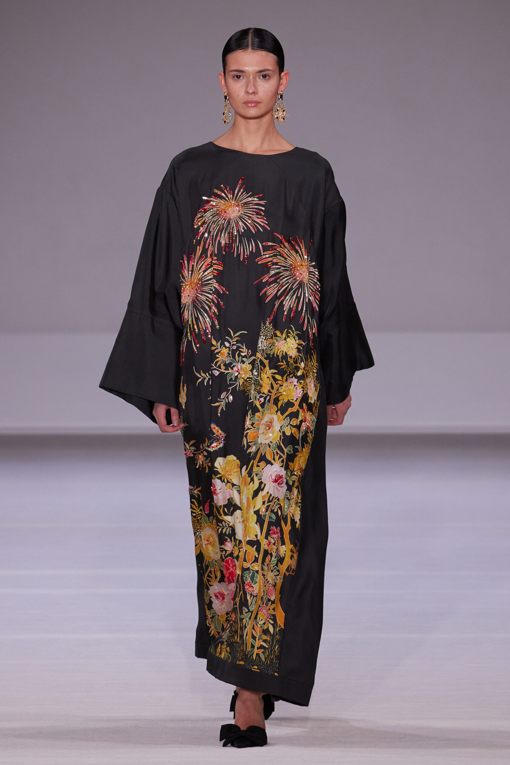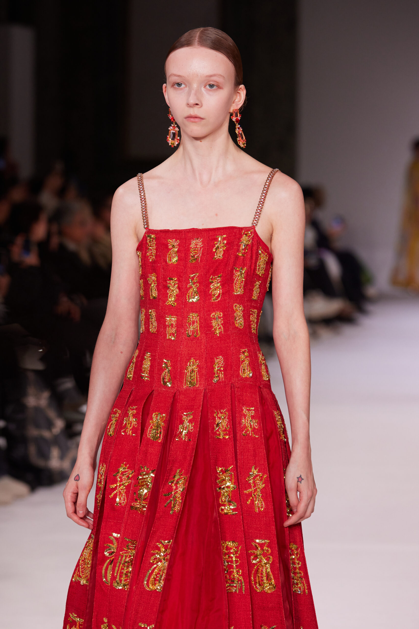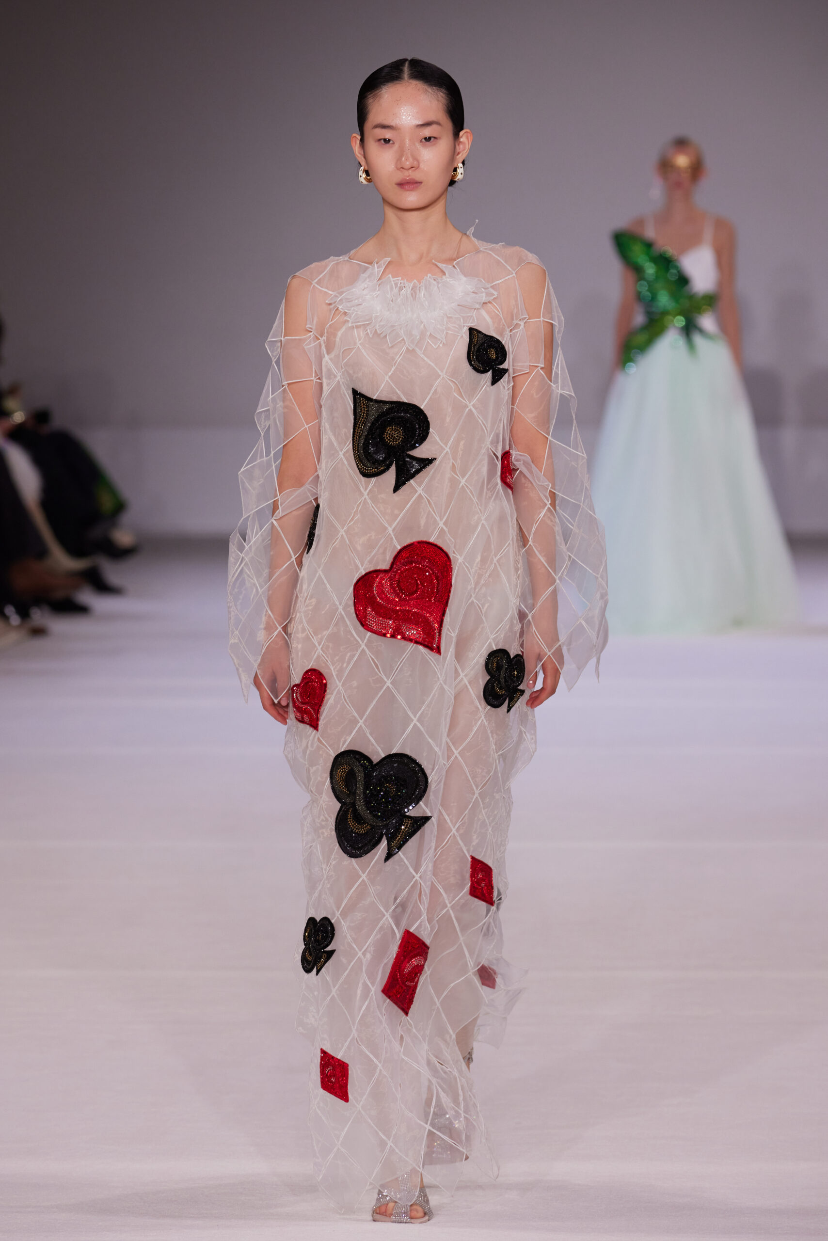 Emily Cheong et son équipe ont plongé dans l’étude des totems et des récits des dieux du feu, capturant leur caractère magique pour les transformer en motifs imprimés vibrants. Grâce à une coupe experte et un savoir-faire COUTURE, les robes s’ajustent parfaitement, soulignant le contrôle et la maîtrise de la silhouette.