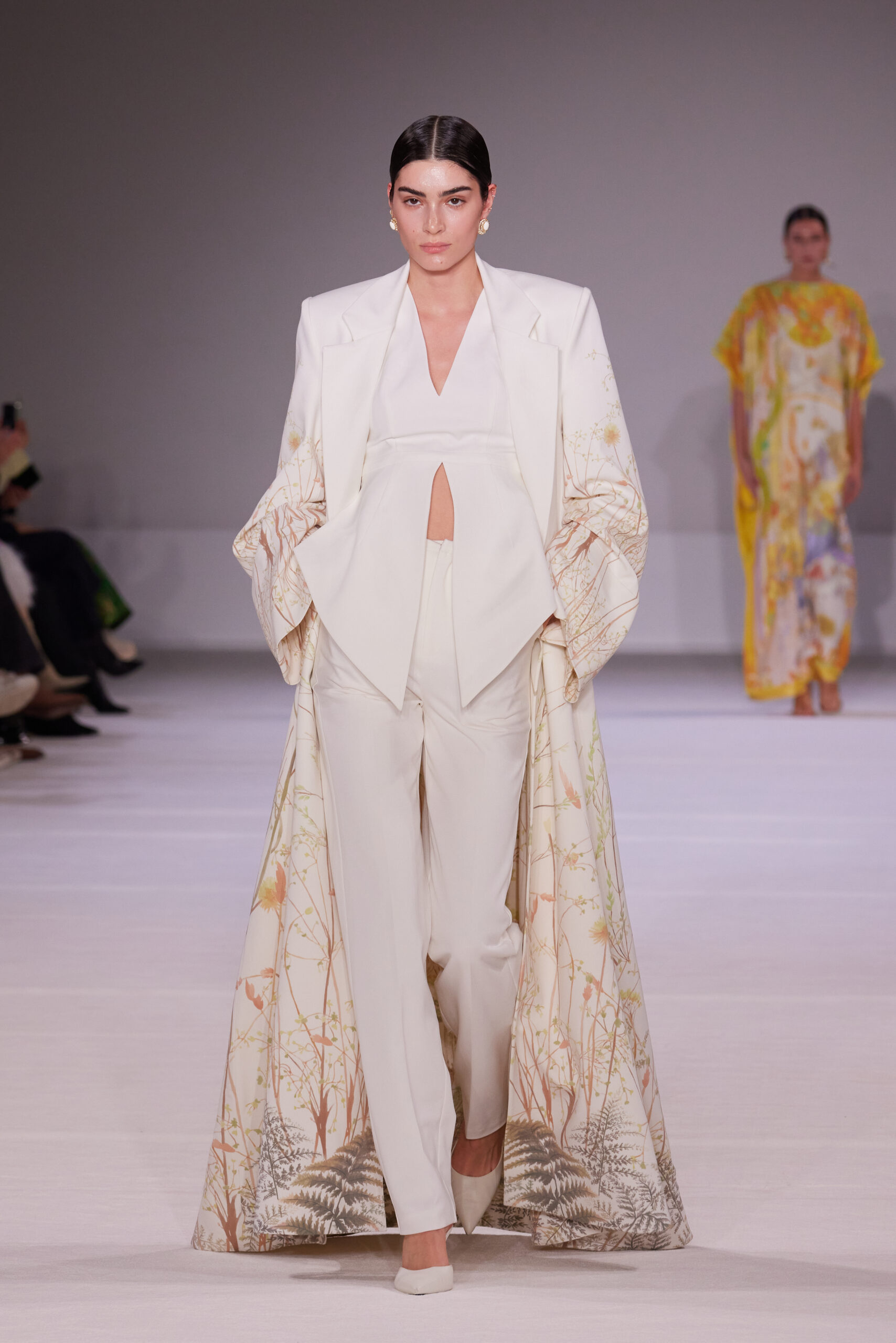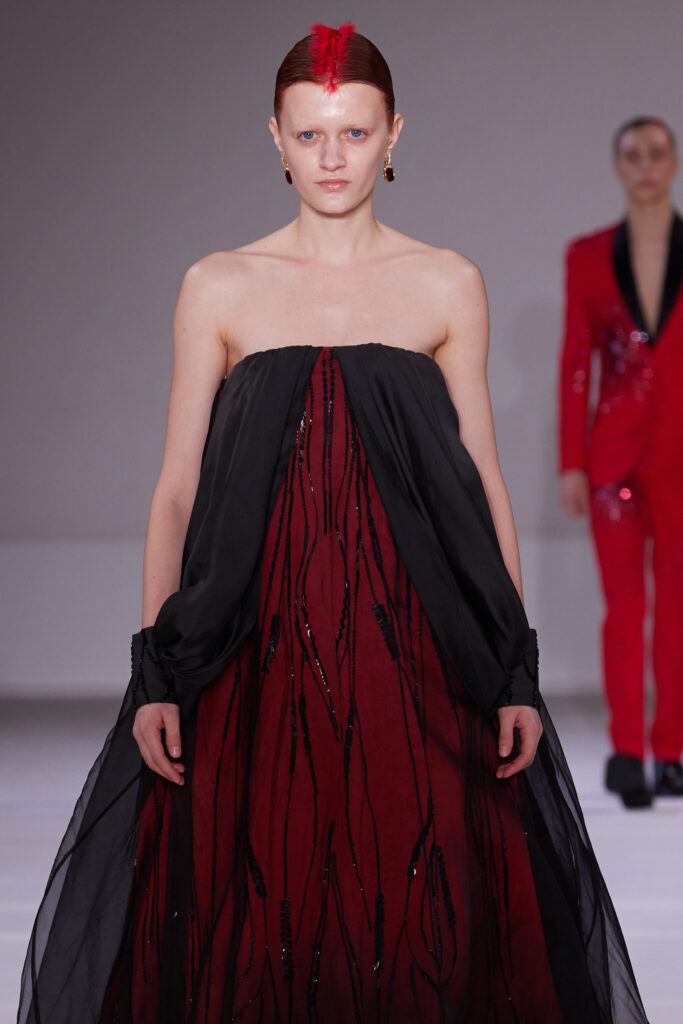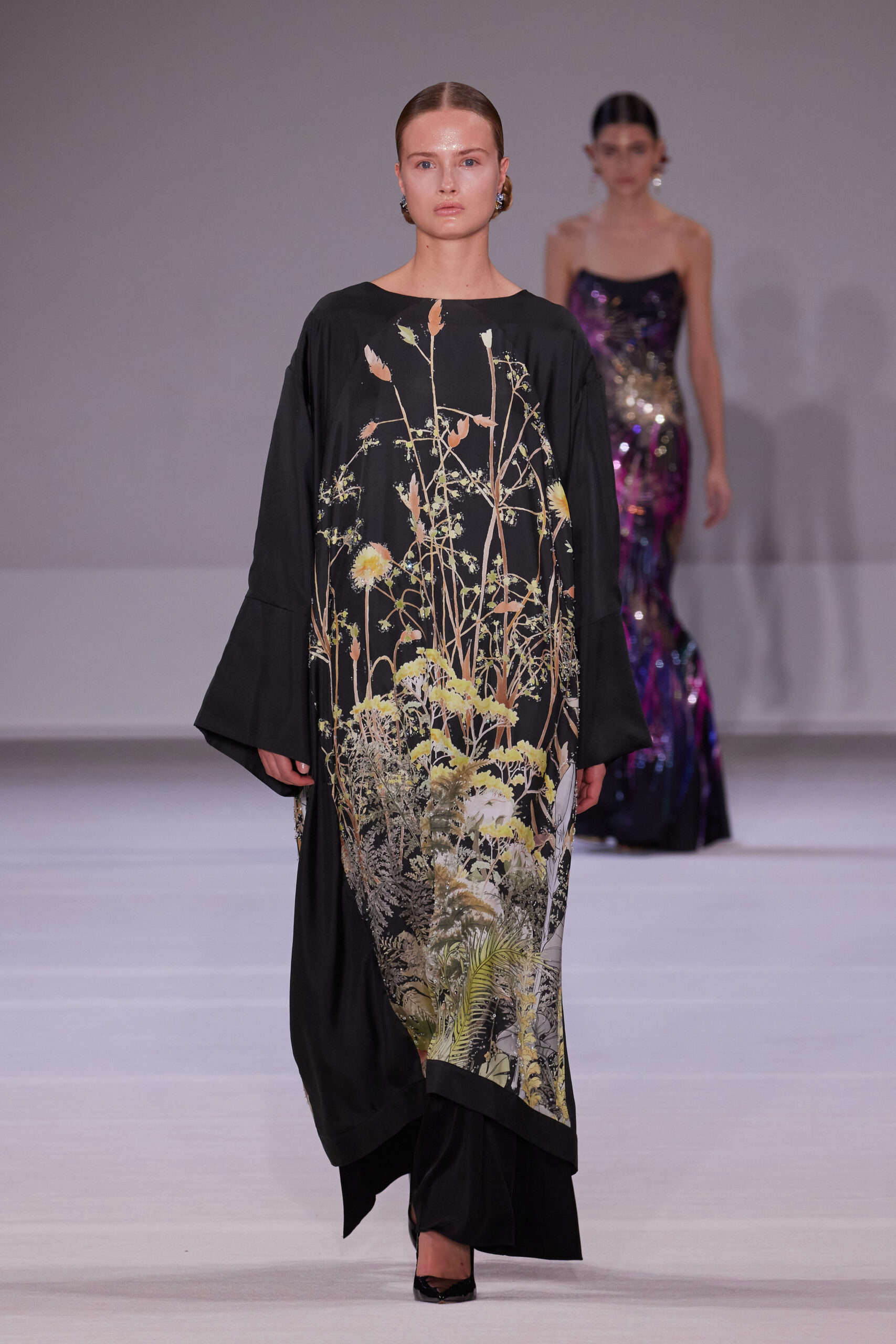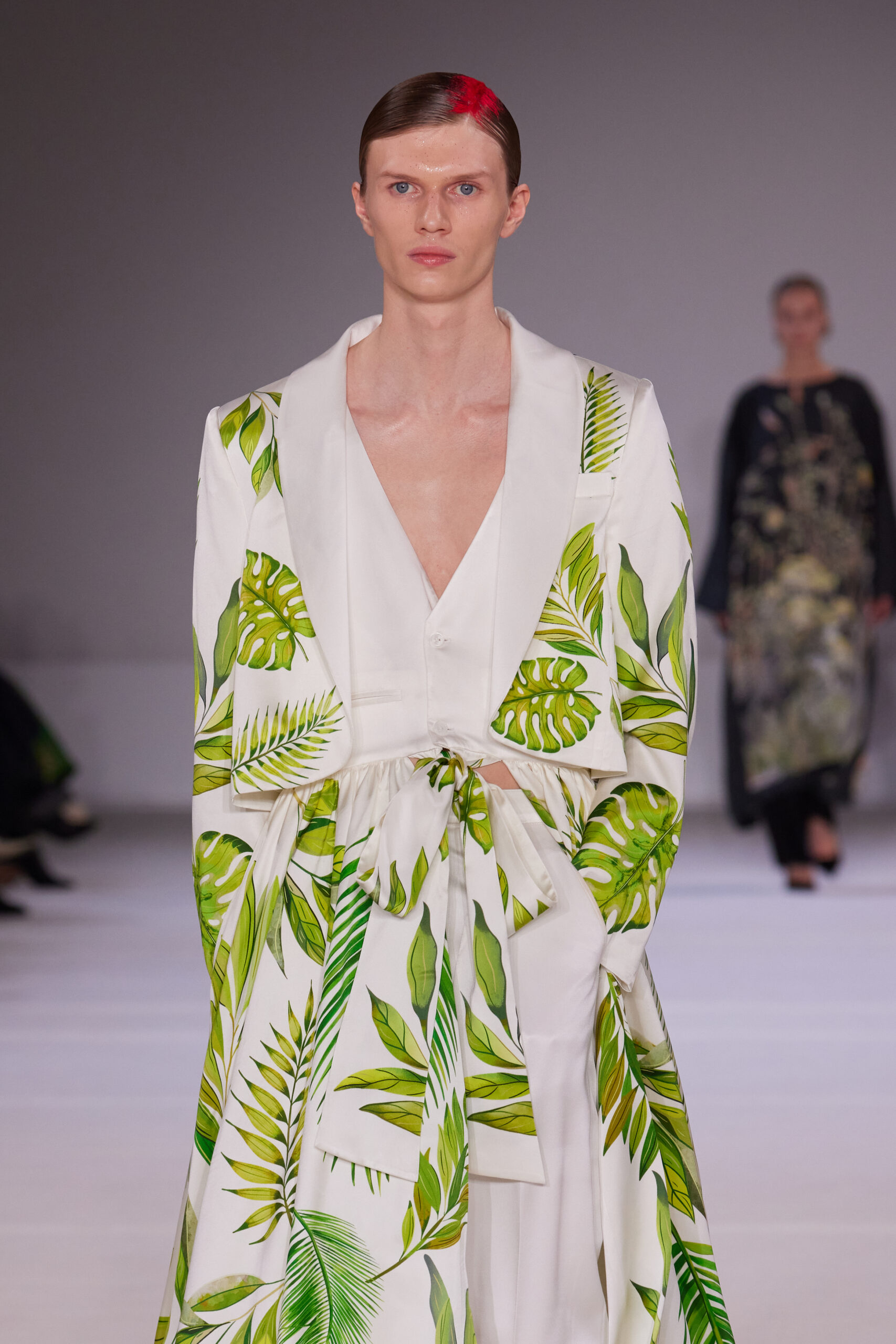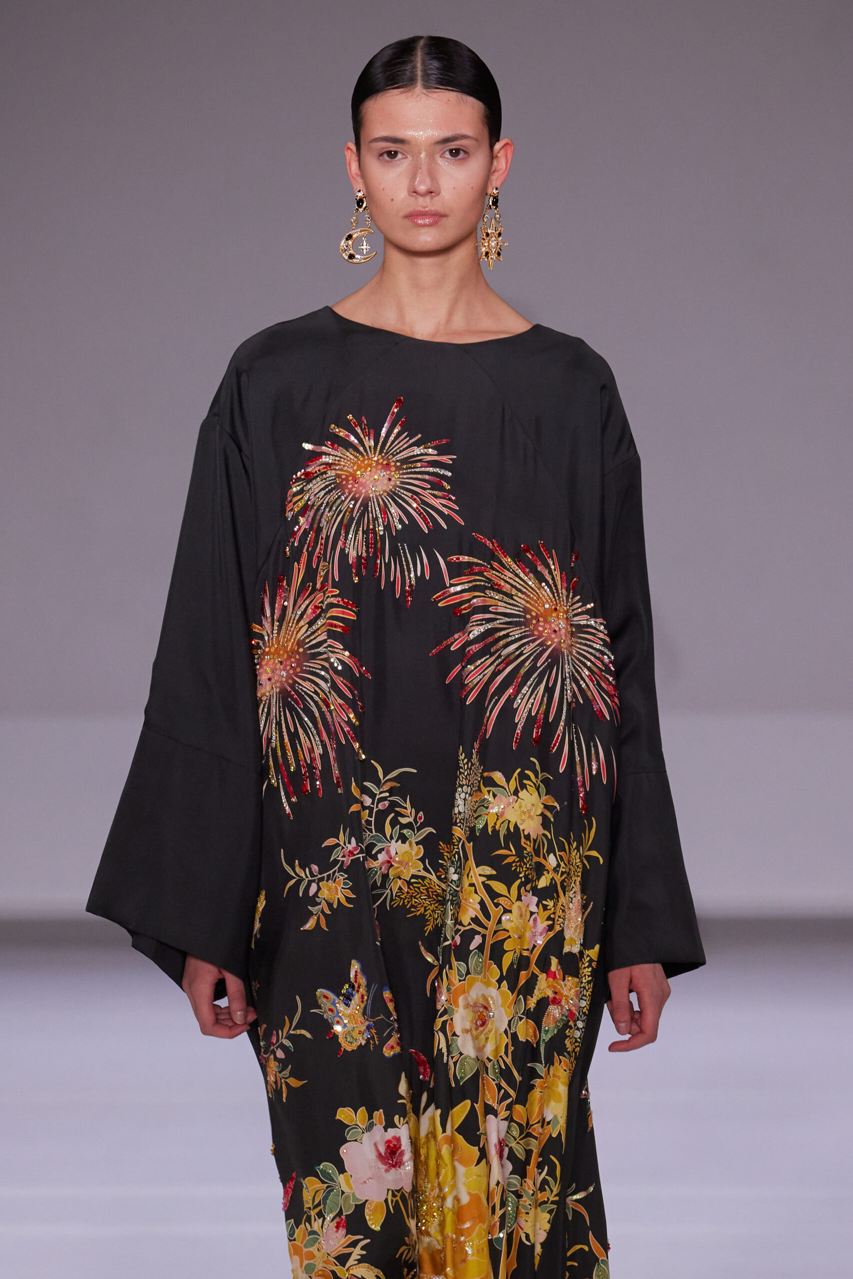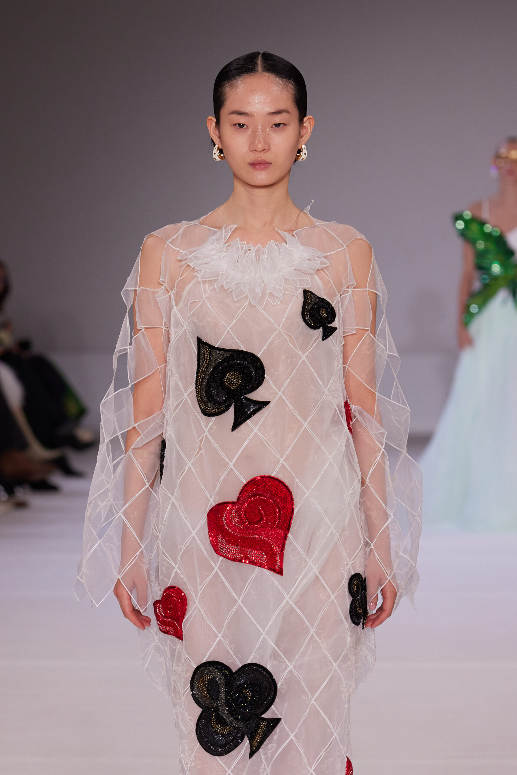 Emily Cheong et son équipe ont plongé dans l’étude des totems et des récits des dieux du feu, capturant leur caractère magique pour les transformer en motifs imprimés vibrants. Grâce à une coupe experte et un savoir-faire COUTURE, les robes s’ajustent parfaitement, soulignant le contrôle et la maîtrise de la silhouette.