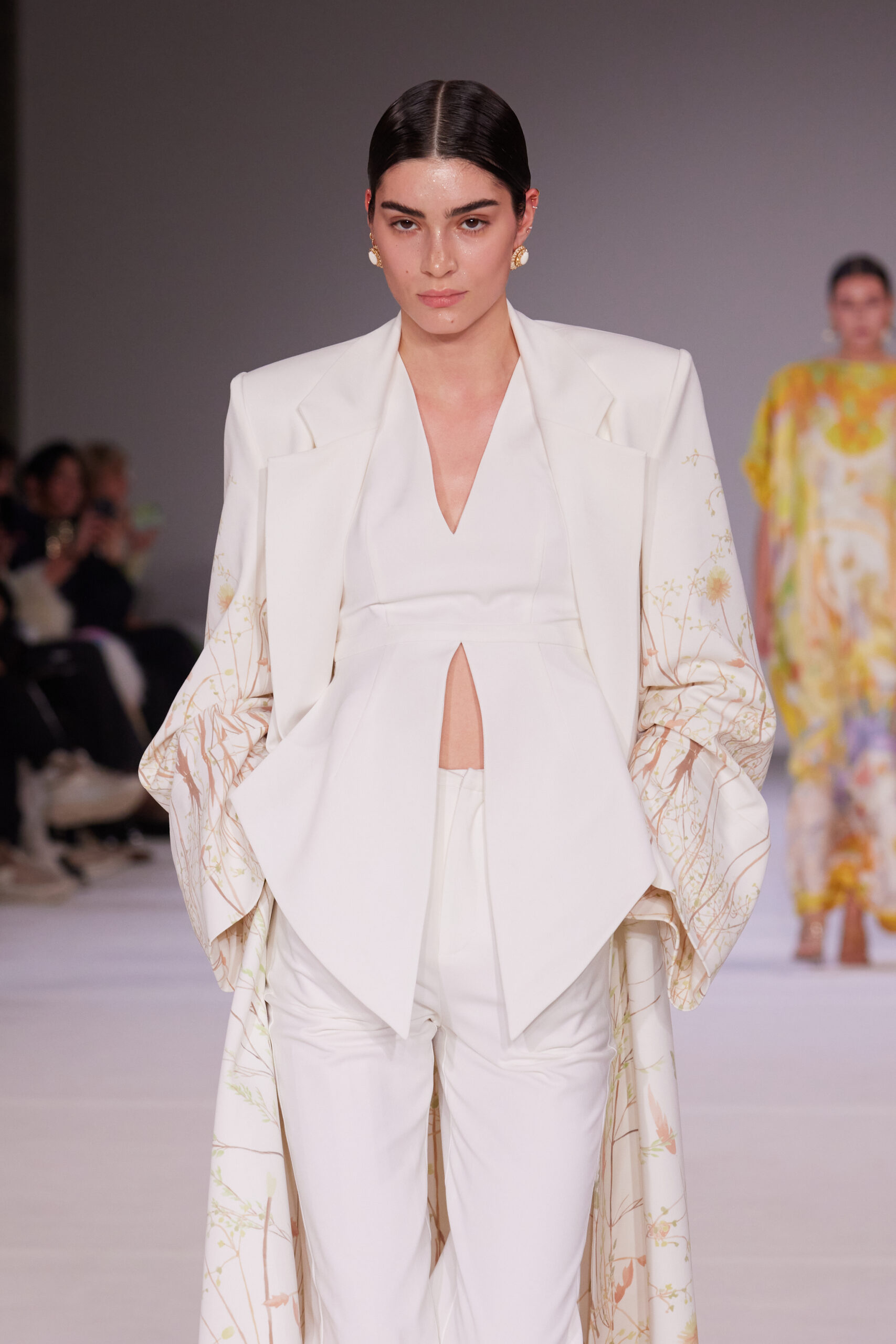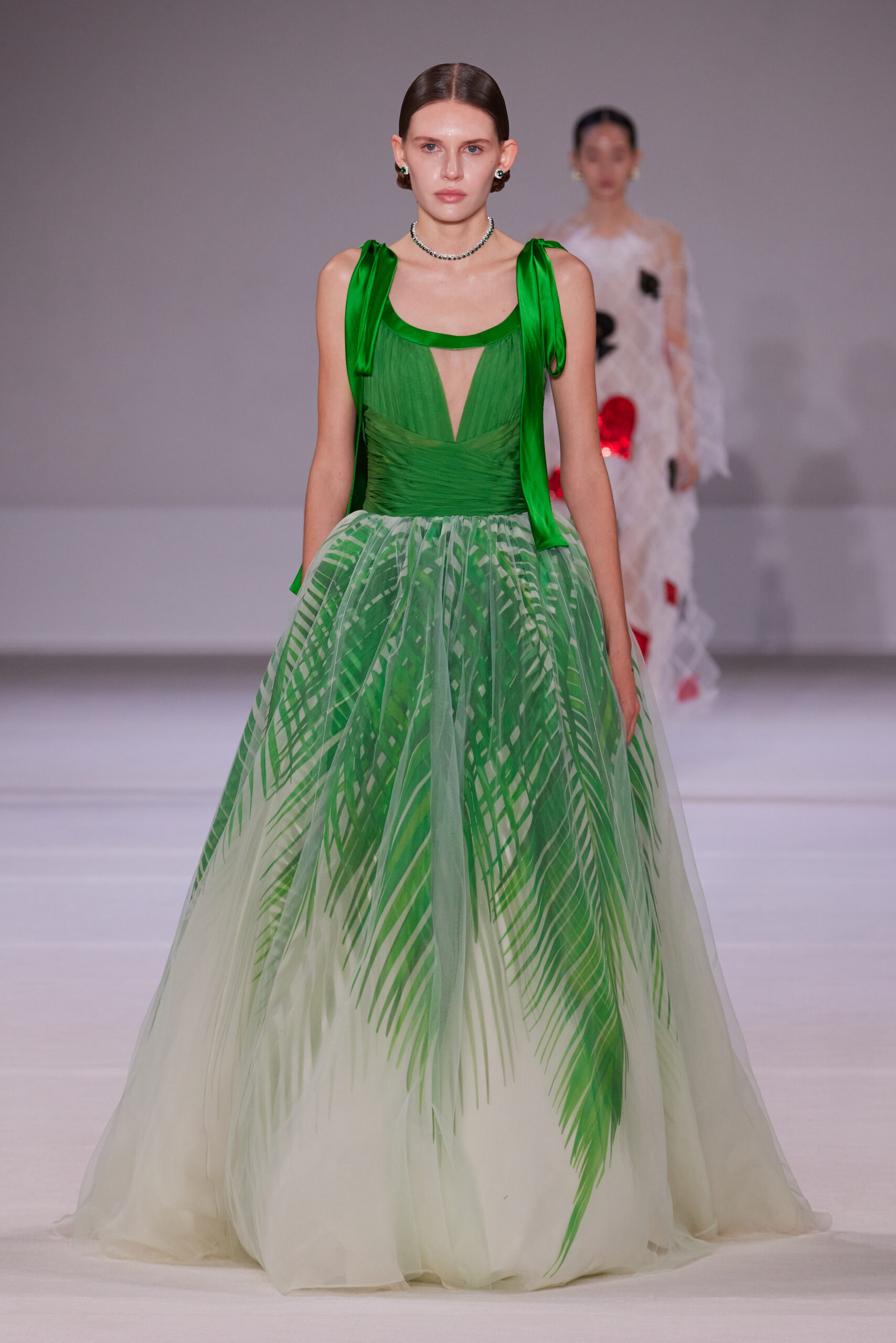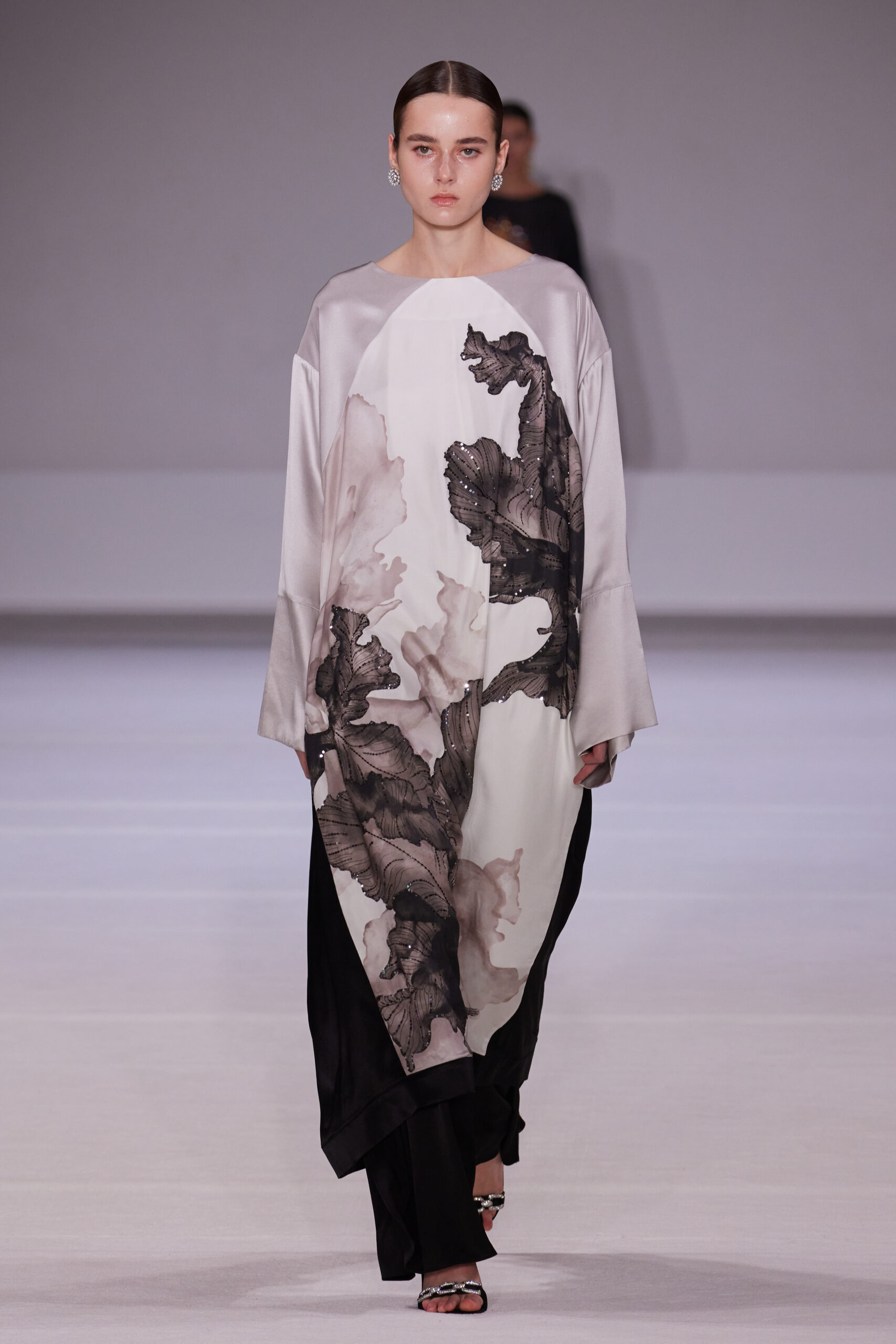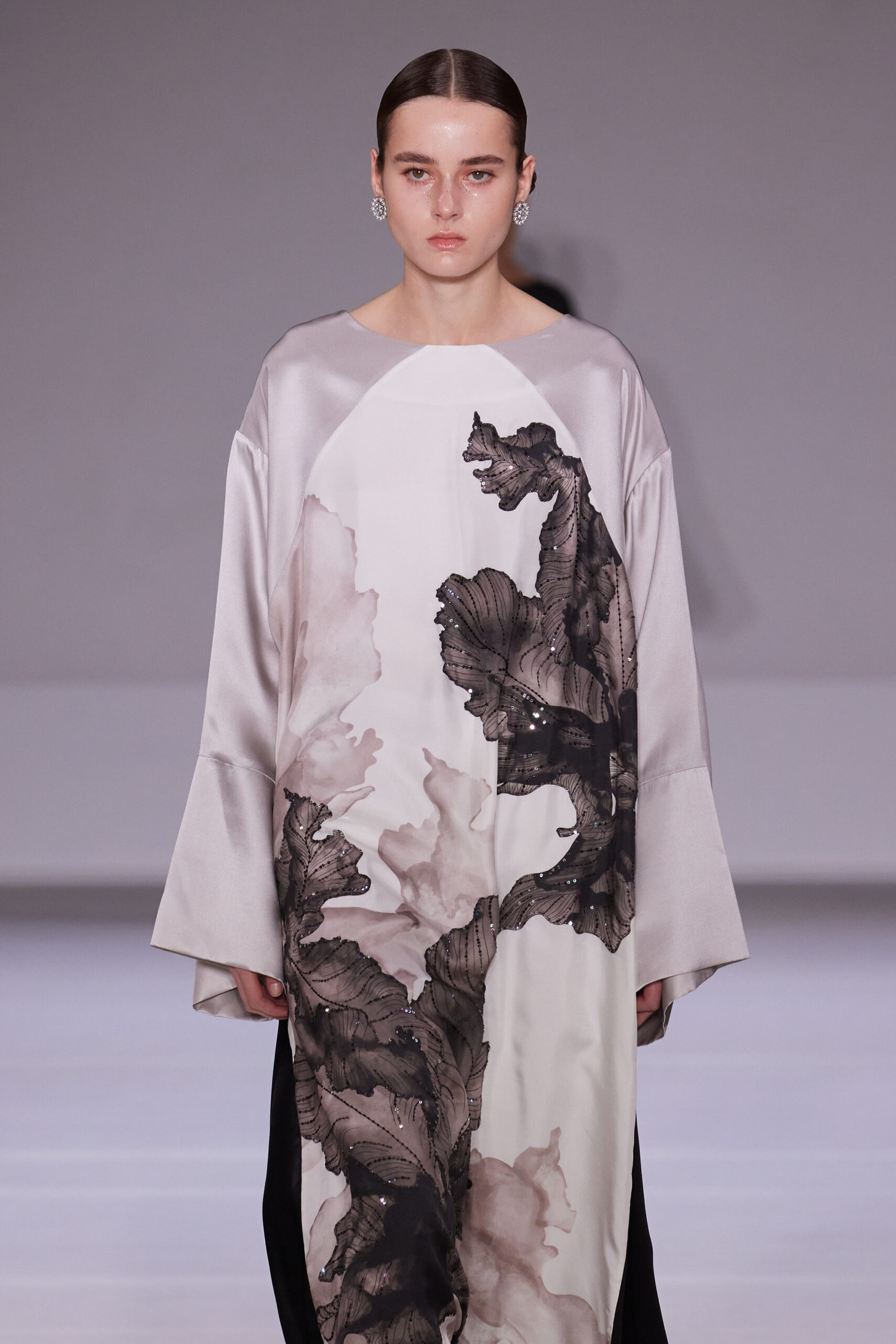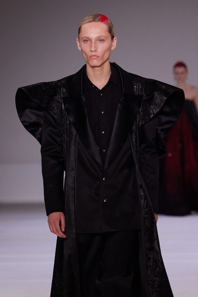 Emily Cheong et son équipe ont plongé dans l’étude des totems et des récits des dieux du feu, capturant leur caractère magique pour les transformer en motifs imprimés vibrants. Grâce à une coupe experte et un savoir-faire COUTURE, les robes s’ajustent parfaitement, soulignant le contrôle et la maîtrise de la silhouette.