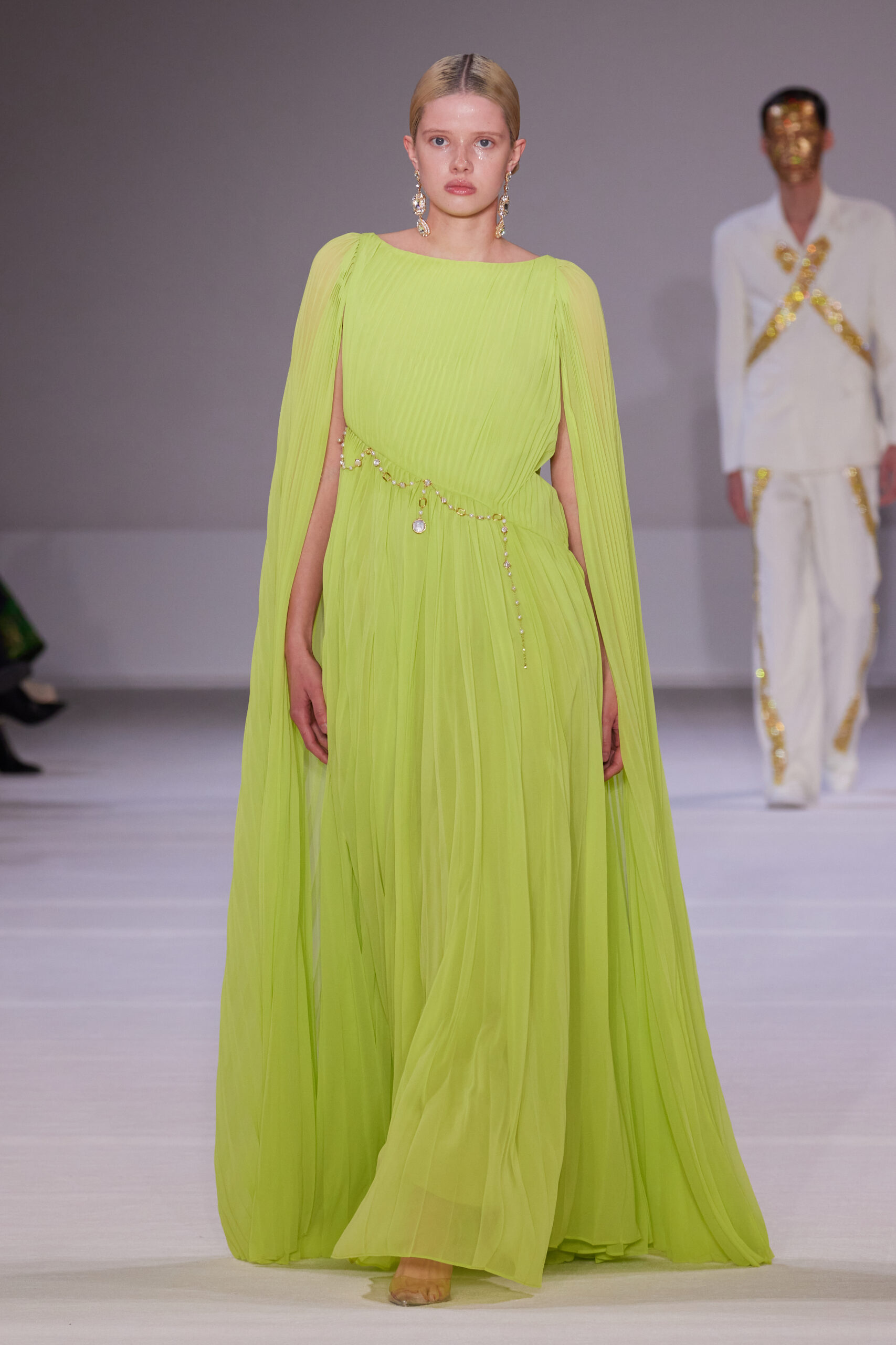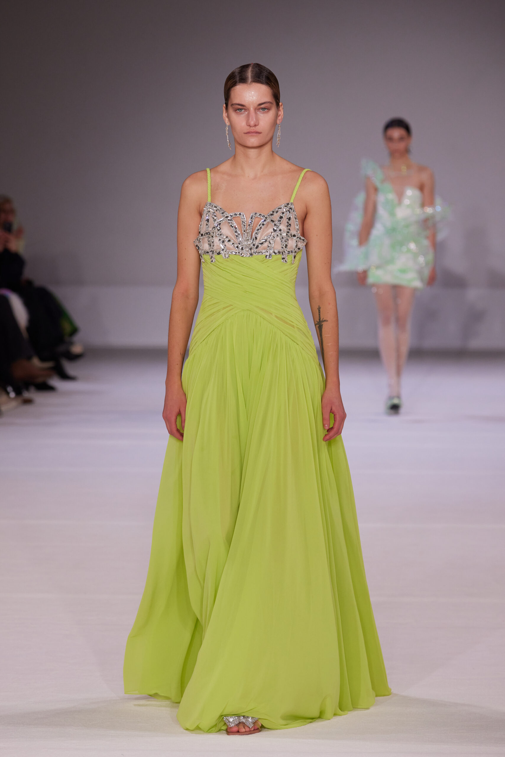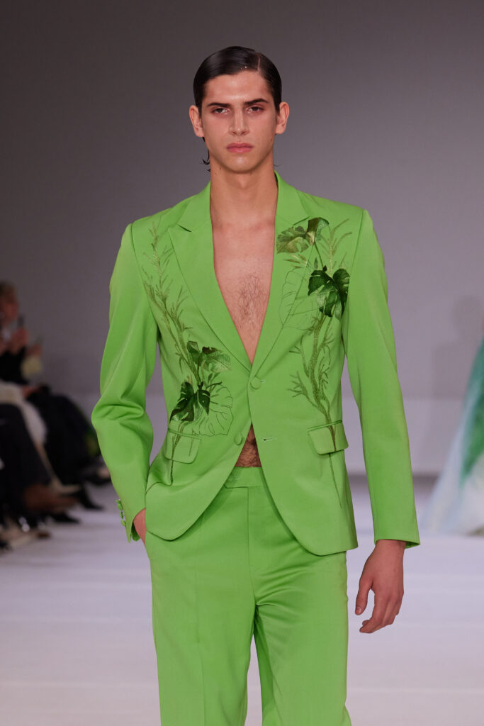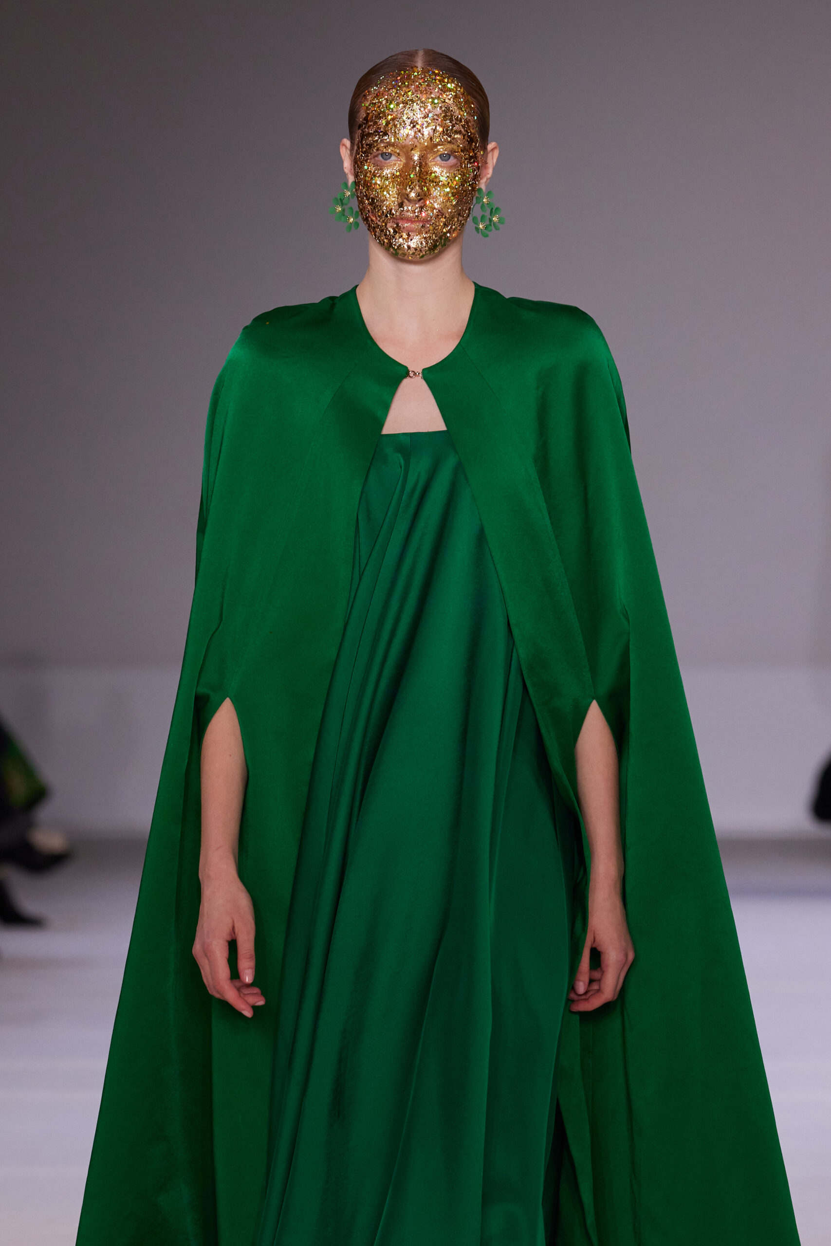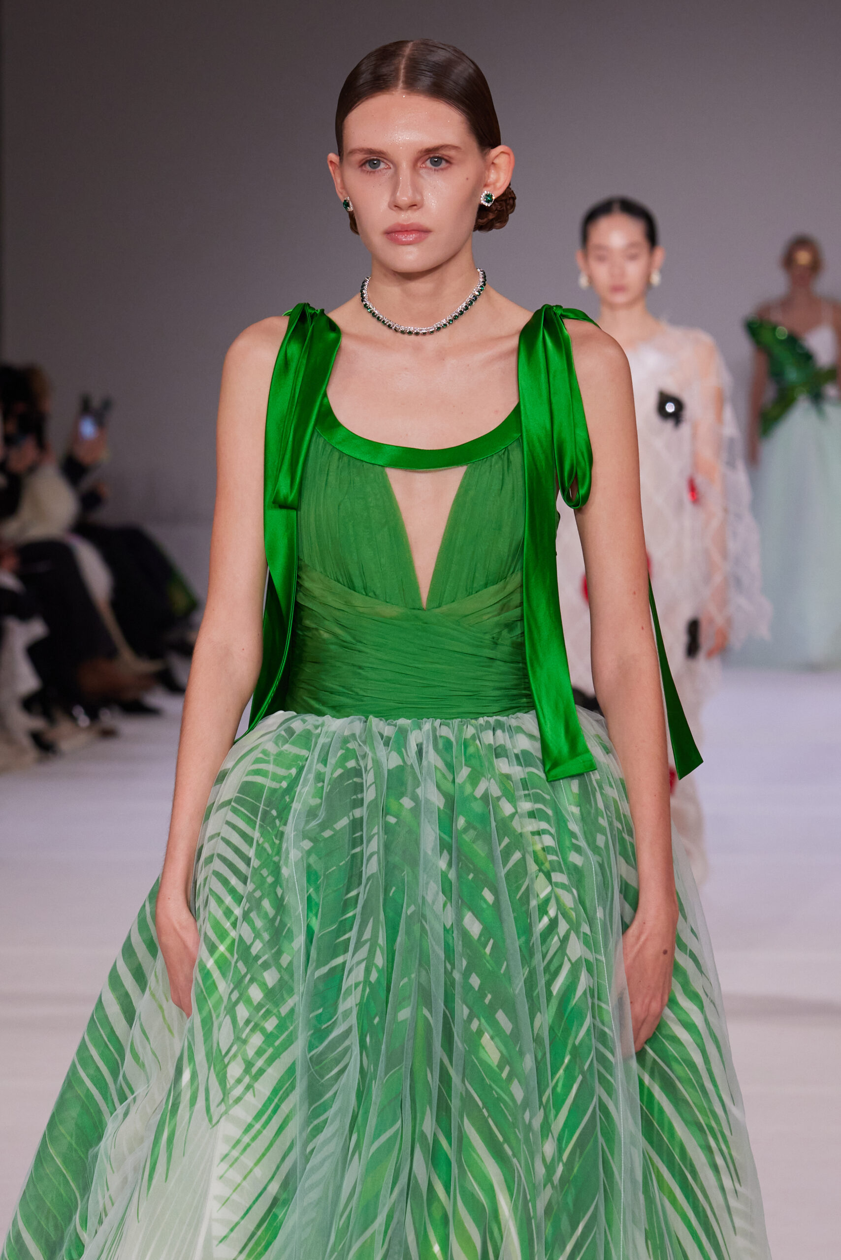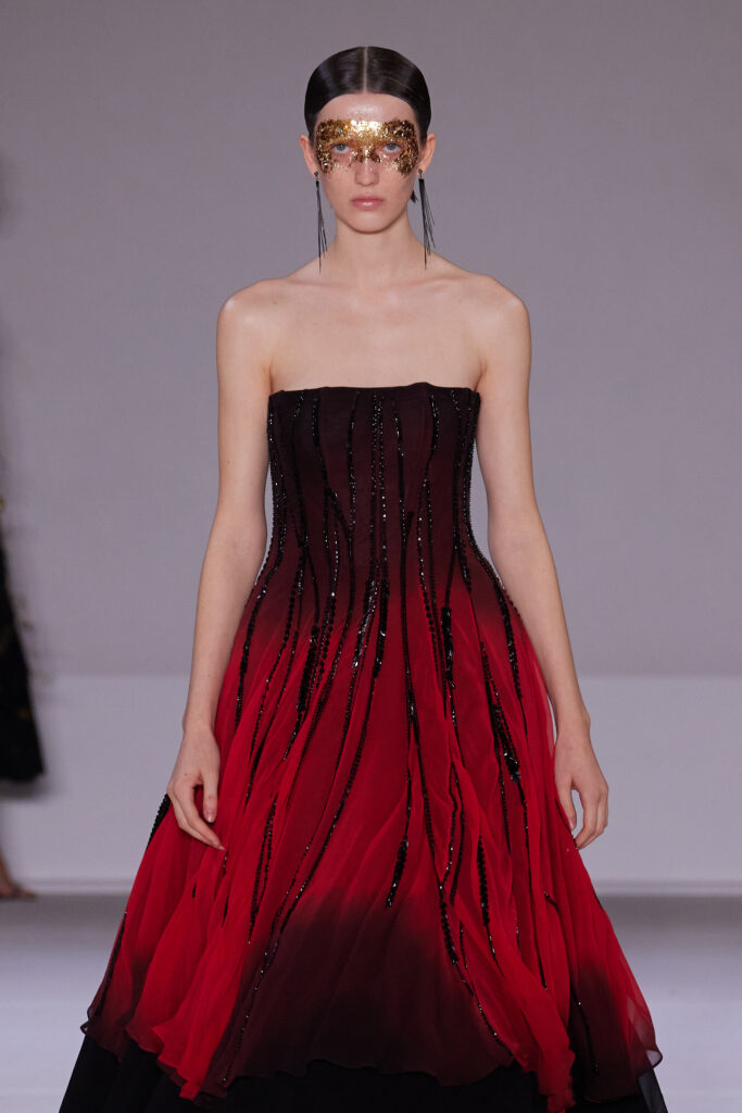Emily Cheong et son équipe ont plongé dans l’étude des totems et des récits des dieux du feu, capturant leur caractère magique pour les transformer en motifs imprimés vibrants. Grâce à une coupe experte et un savoir-faire COUTURE, les robes s’ajustent parfaitement, soulignant le contrôle et la maîtrise de la silhouette.