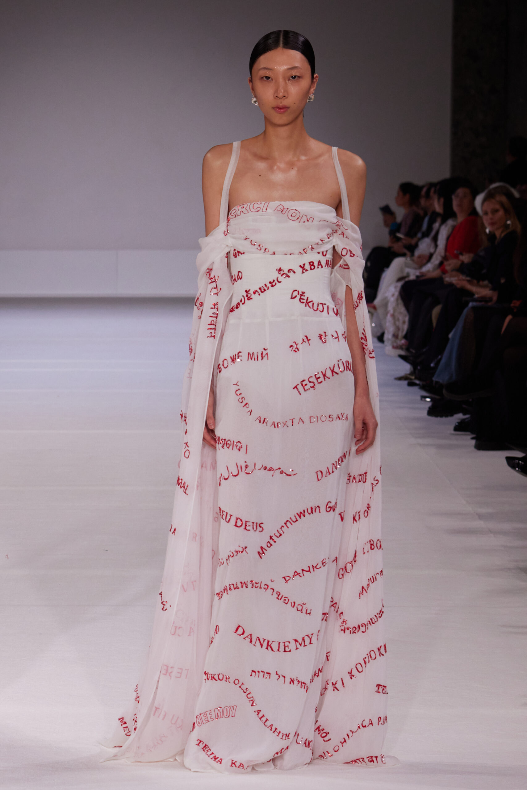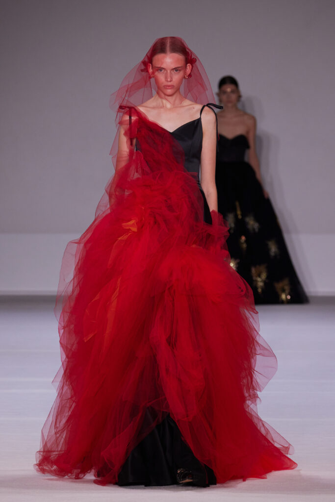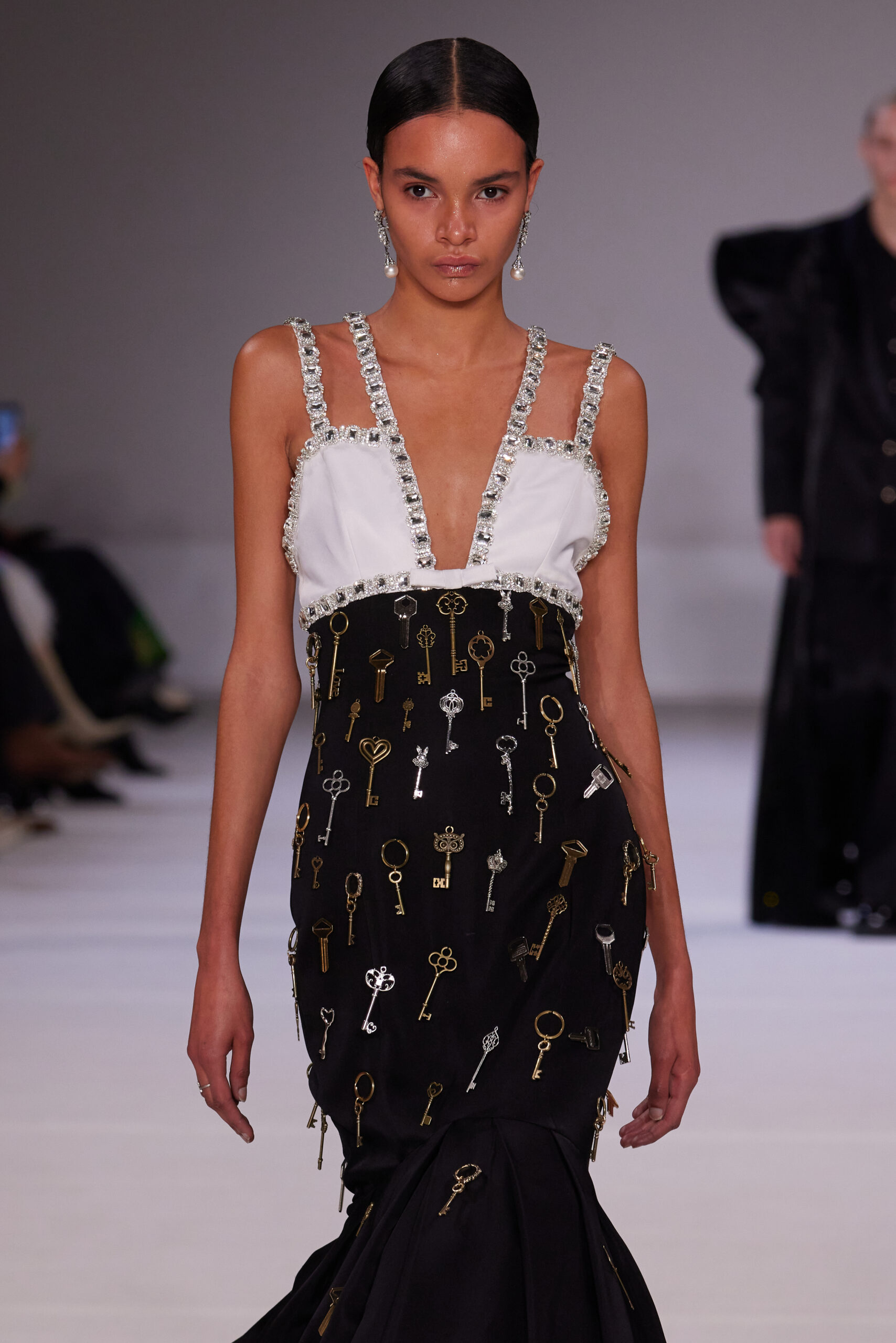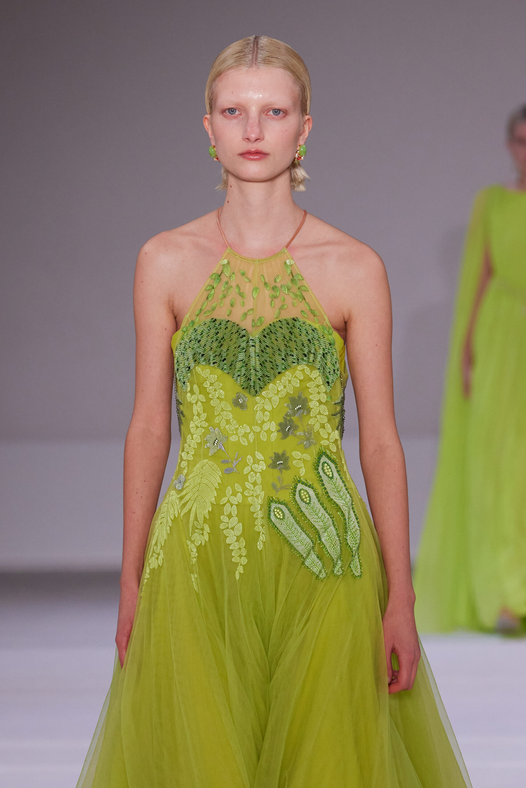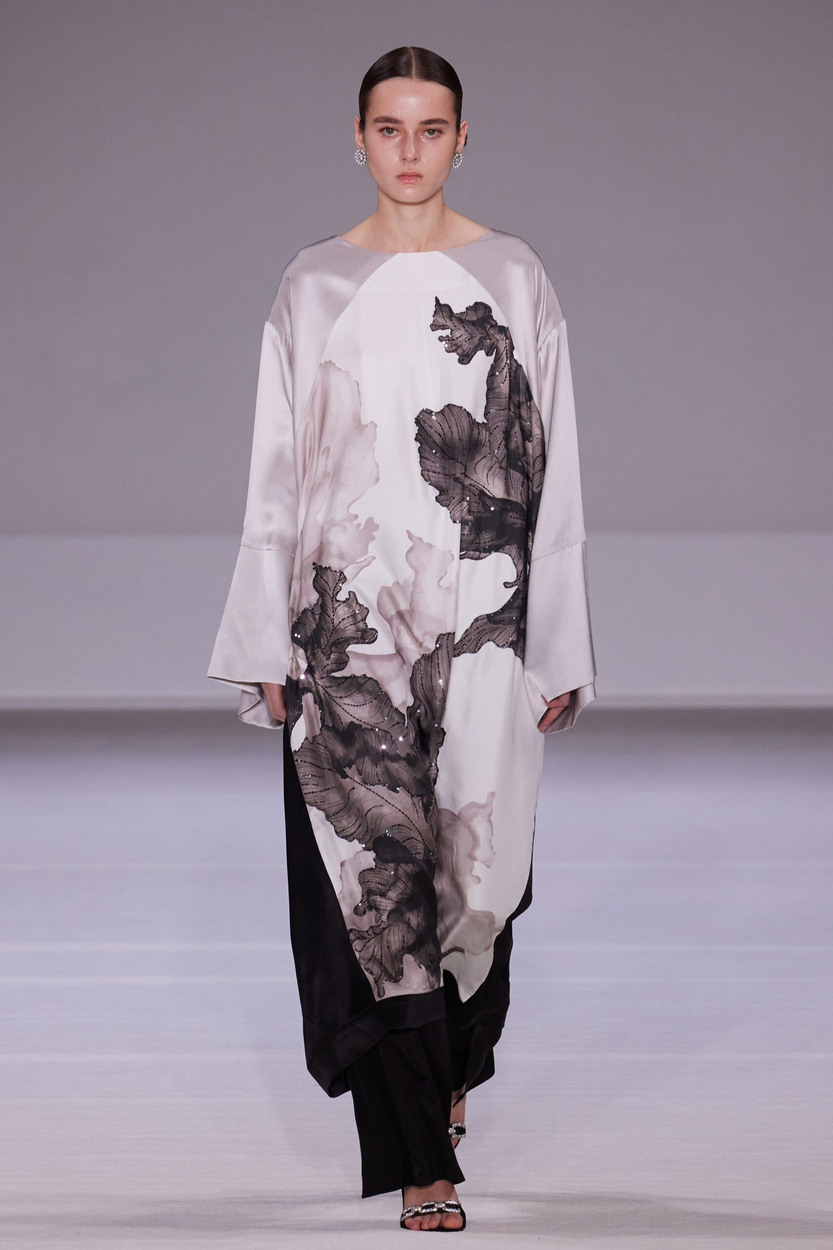 Emily Cheong et son équipe ont plongé dans l’étude des totems et des récits des dieux du feu, capturant leur caractère magique pour les transformer en motifs imprimés vibrants. Grâce à une coupe experte et un savoir-faire COUTURE, les robes s’ajustent parfaitement, soulignant le contrôle et la maîtrise de la silhouette.