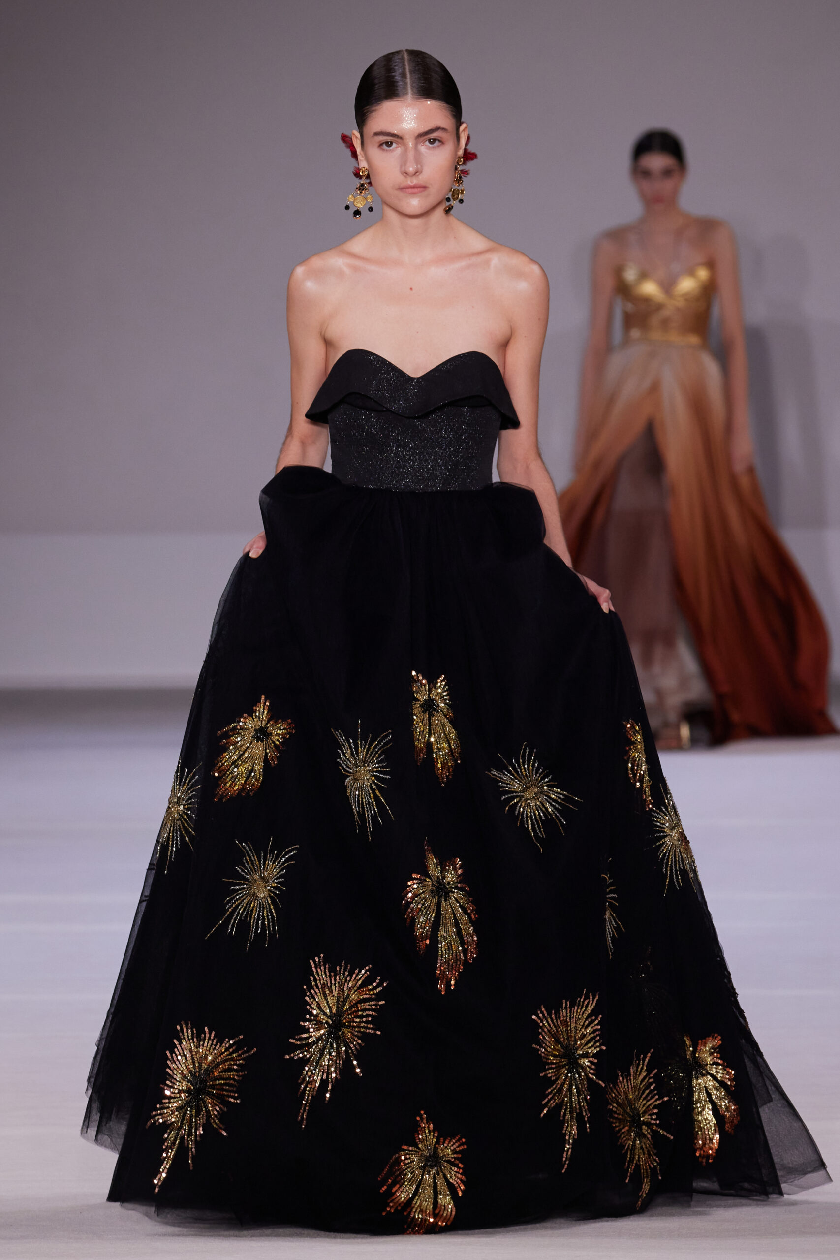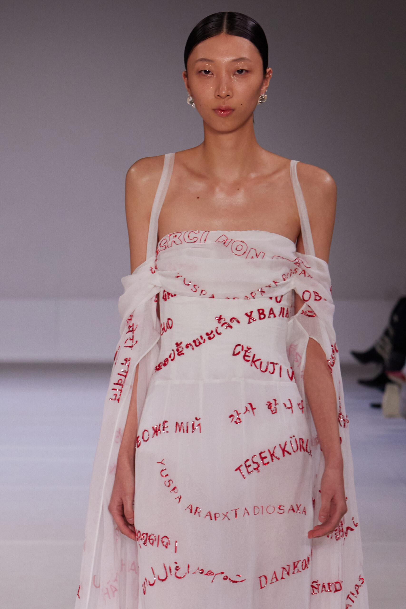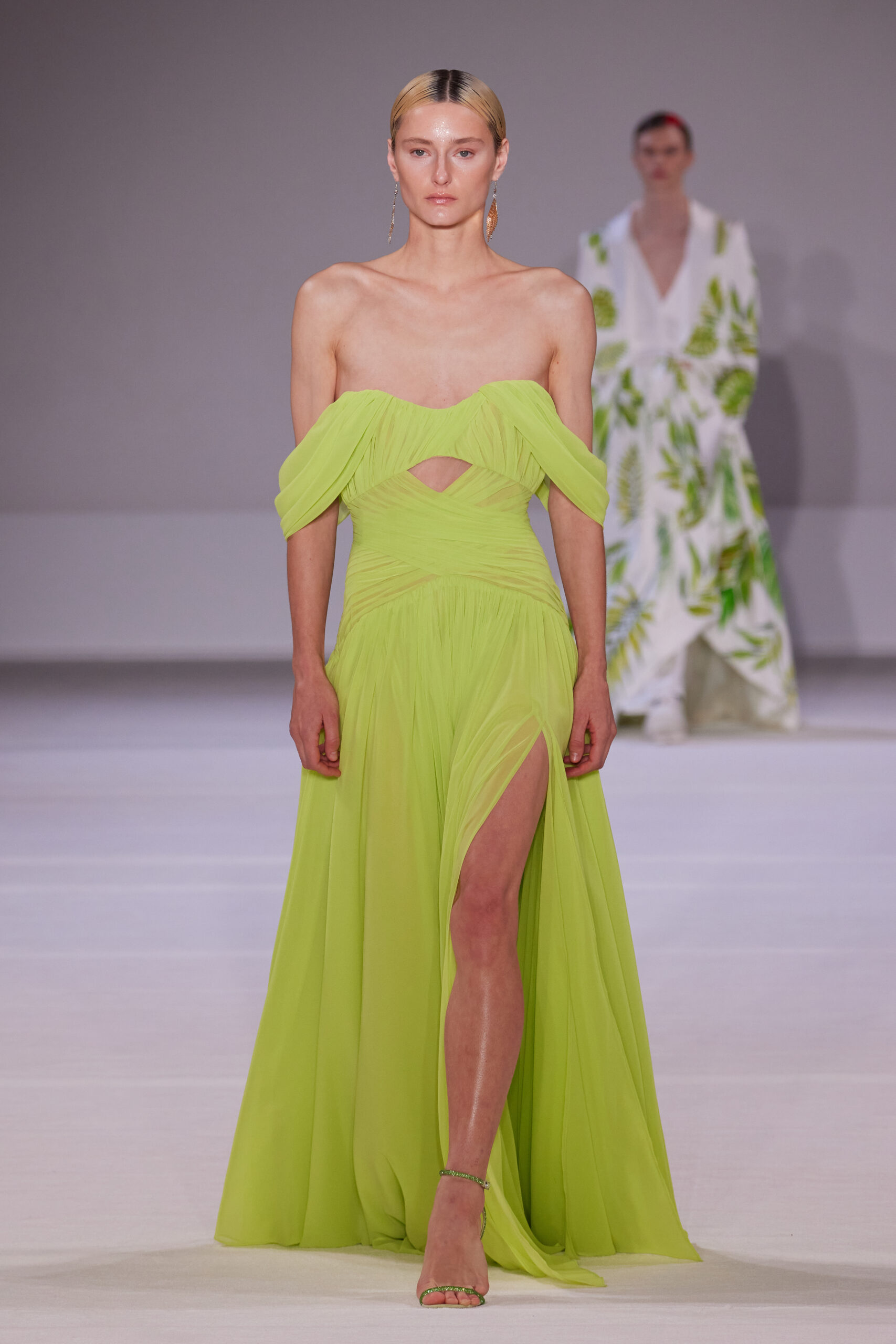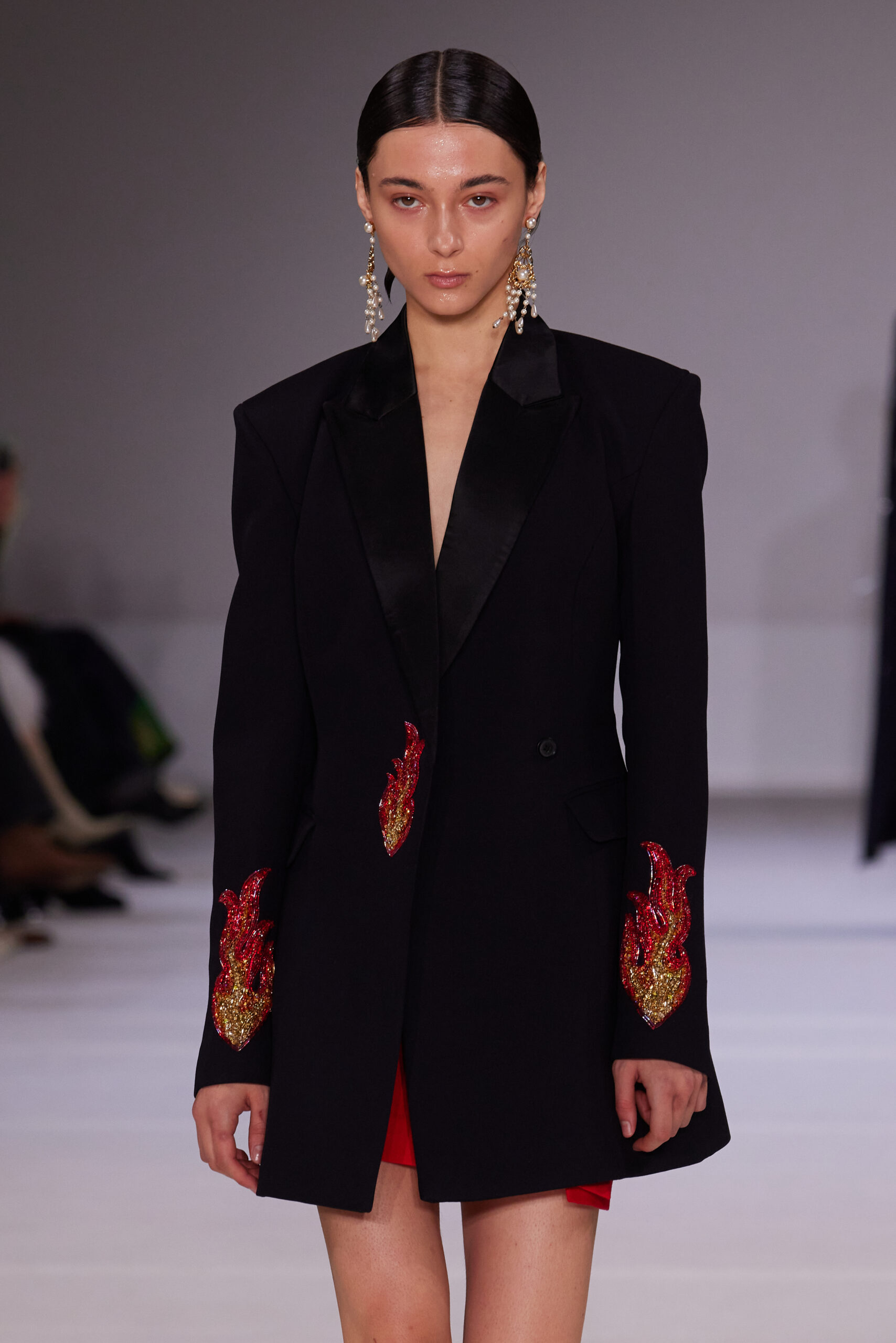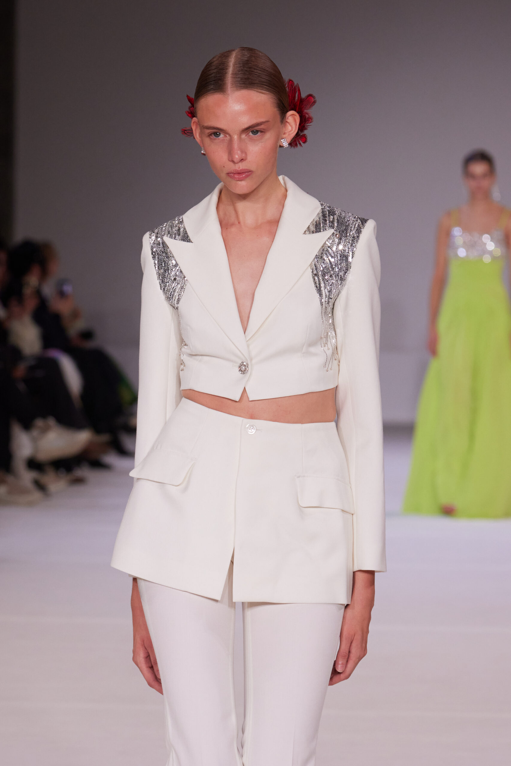 Emily Cheong et son équipe ont plongé dans l’étude des totems et des récits des dieux du feu, capturant leur caractère magique pour les transformer en motifs imprimés vibrants. Grâce à une coupe experte et un savoir-faire COUTURE, les robes s’ajustent parfaitement, soulignant le contrôle et la maîtrise de la silhouette.