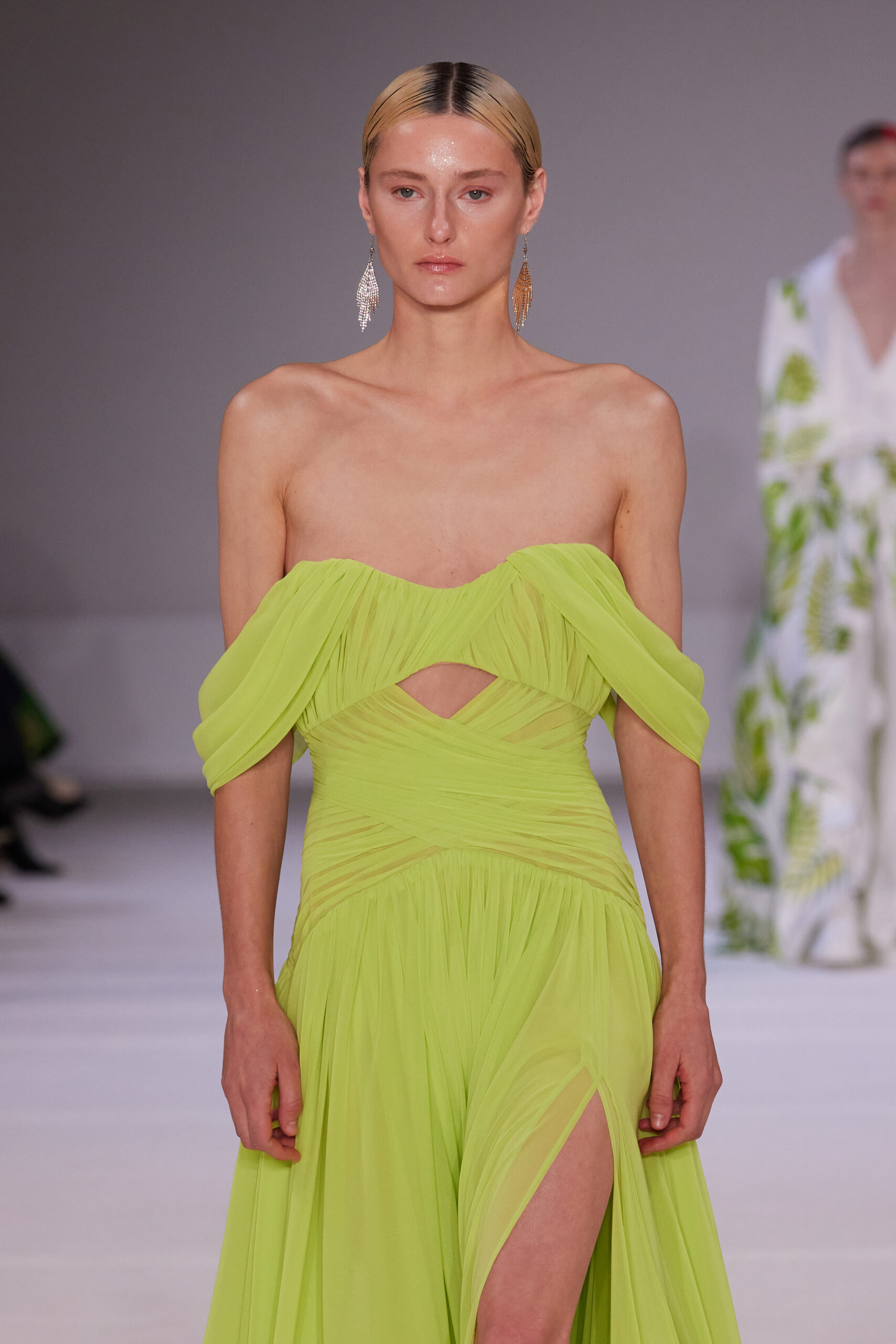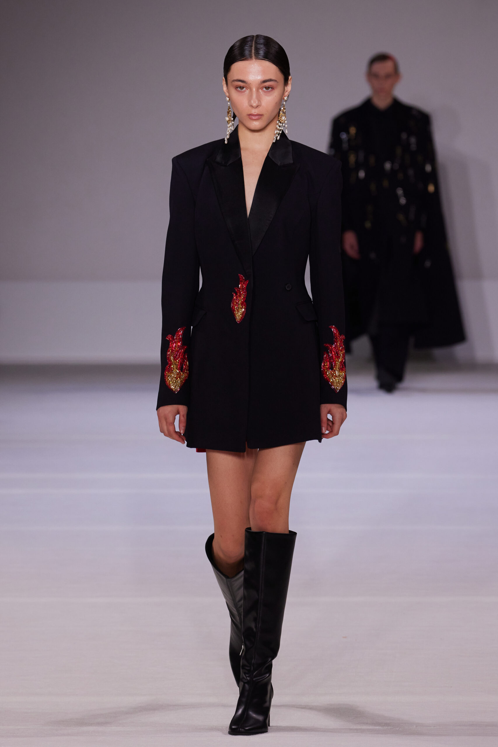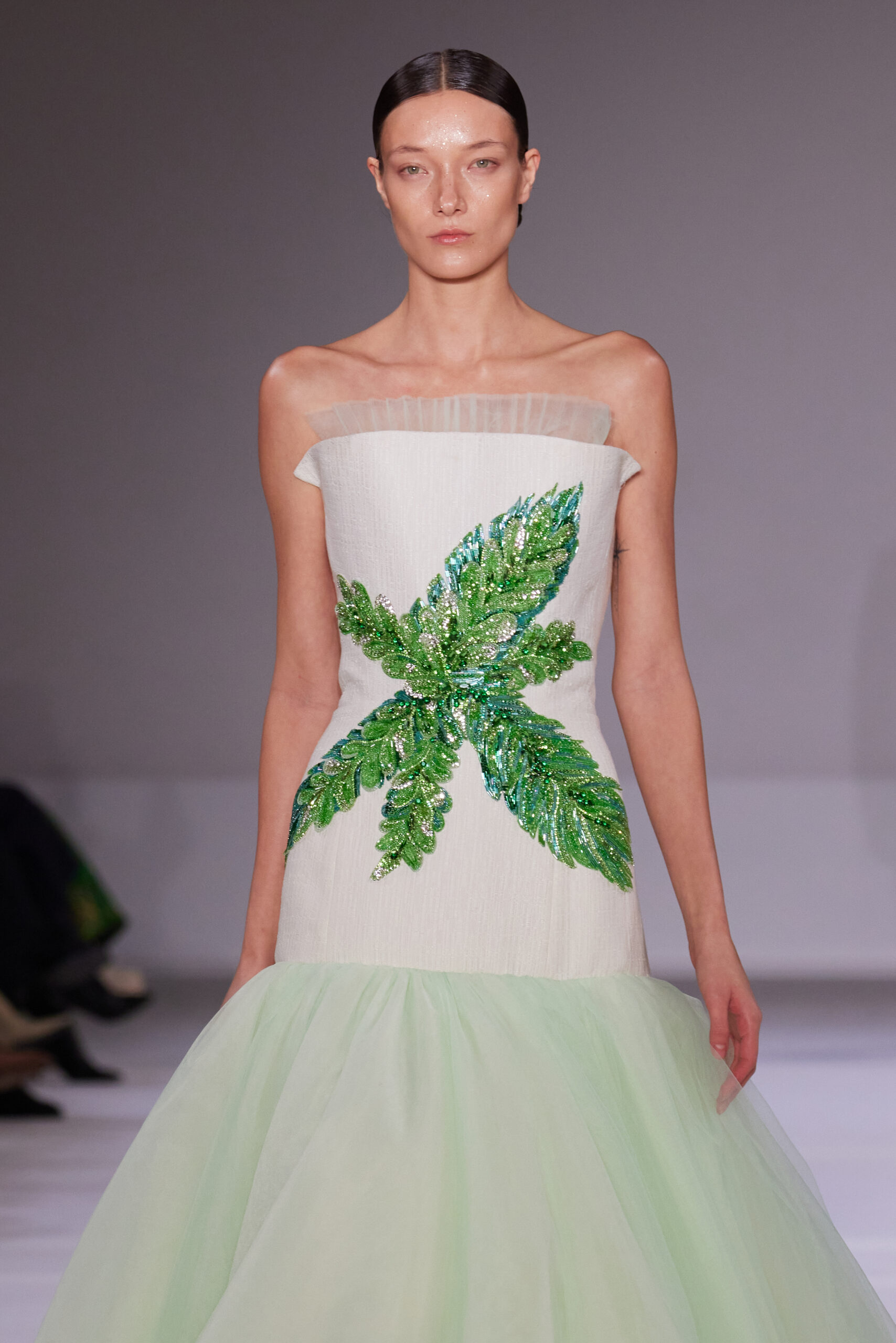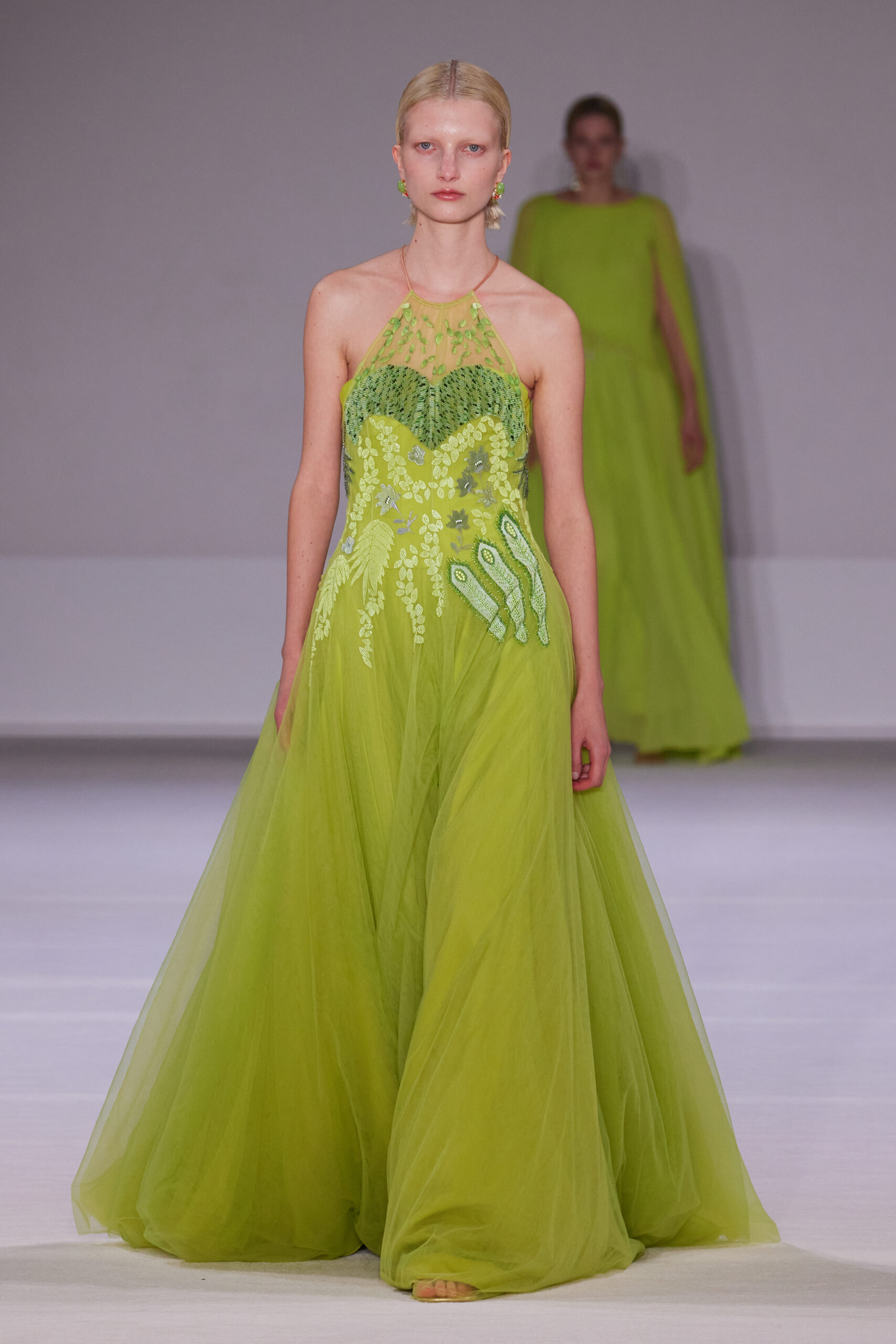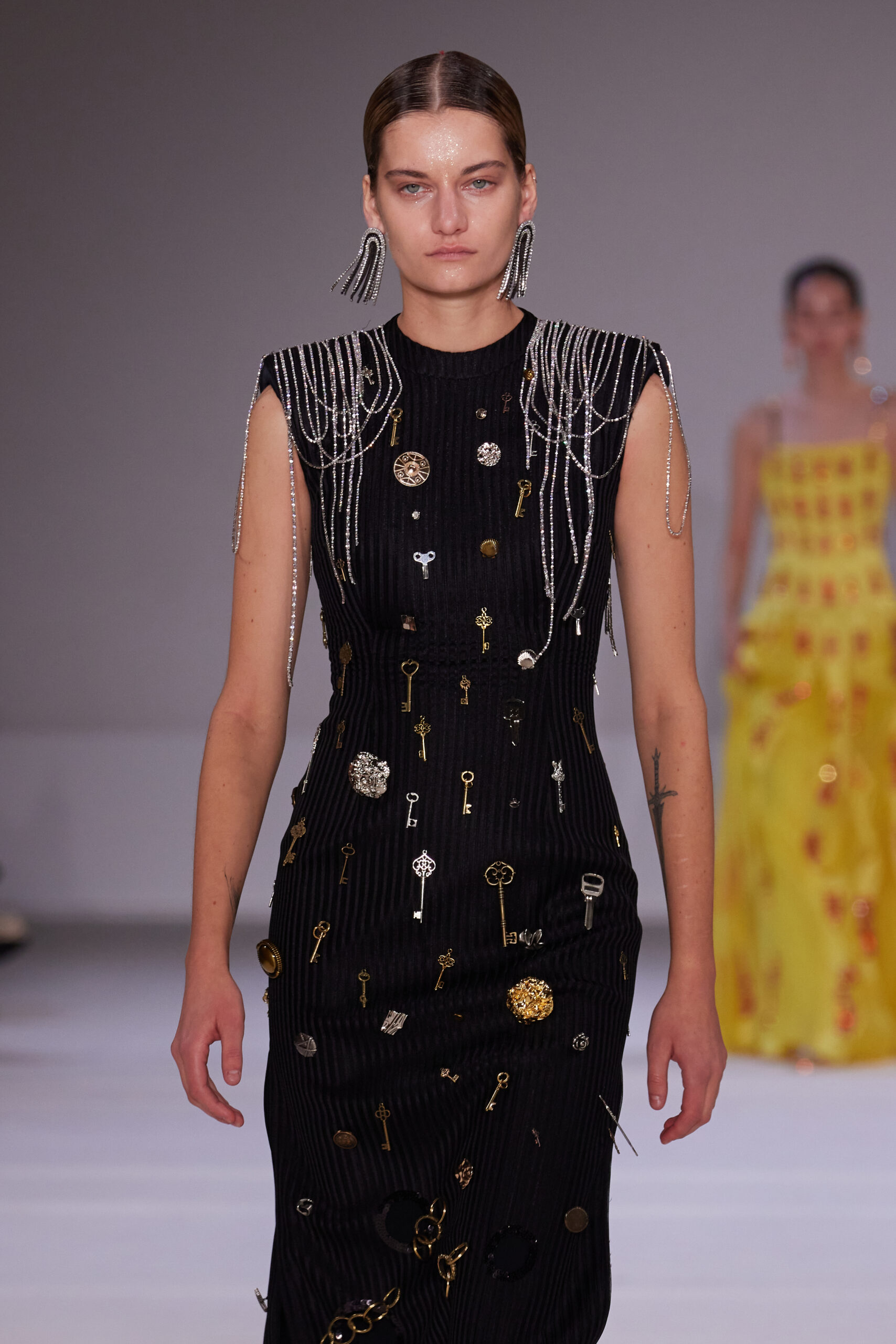 Emily Cheong et son équipe ont plongé dans l’étude des totems et des récits des dieux du feu, capturant leur caractère magique pour les transformer en motifs imprimés vibrants. Grâce à une coupe experte et un savoir-faire COUTURE, les robes s’ajustent parfaitement, soulignant le contrôle et la maîtrise de la silhouette.