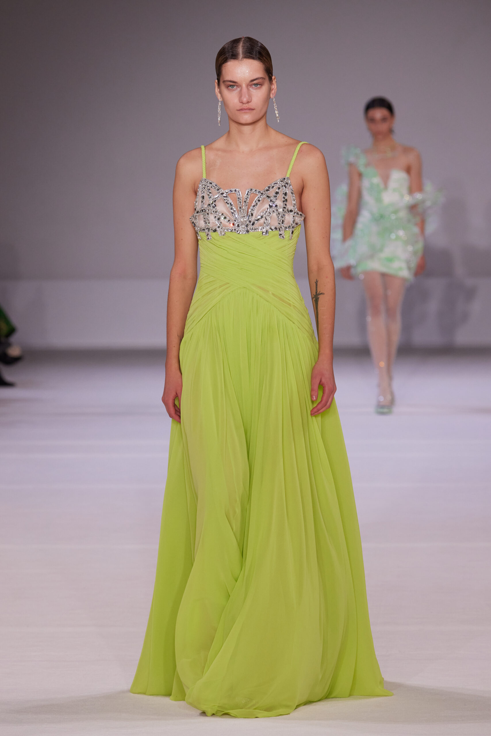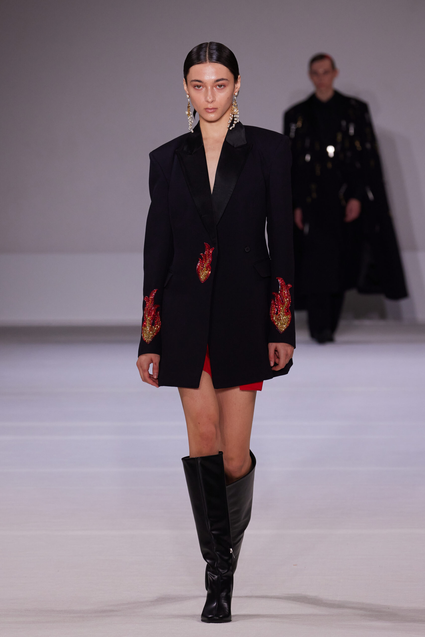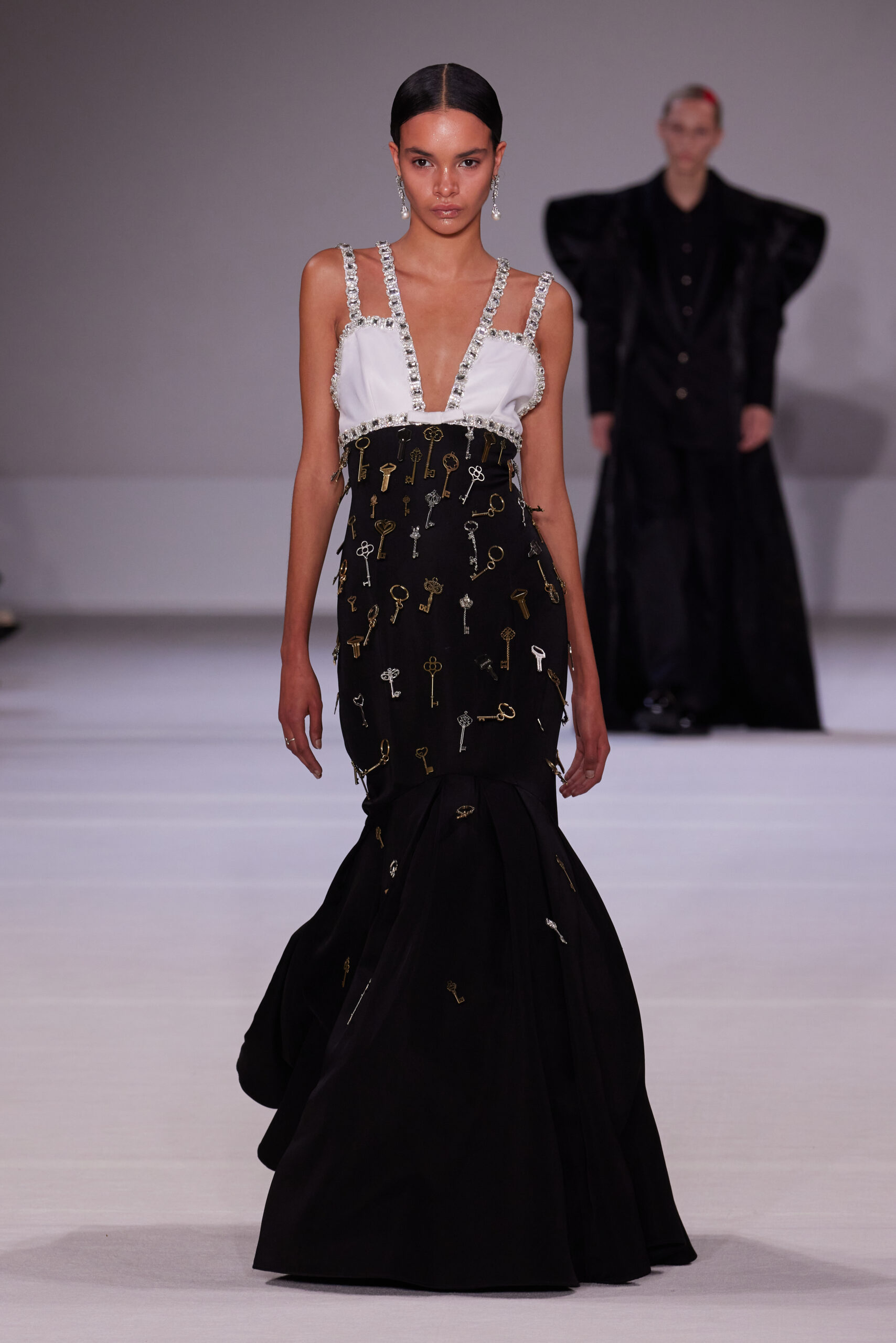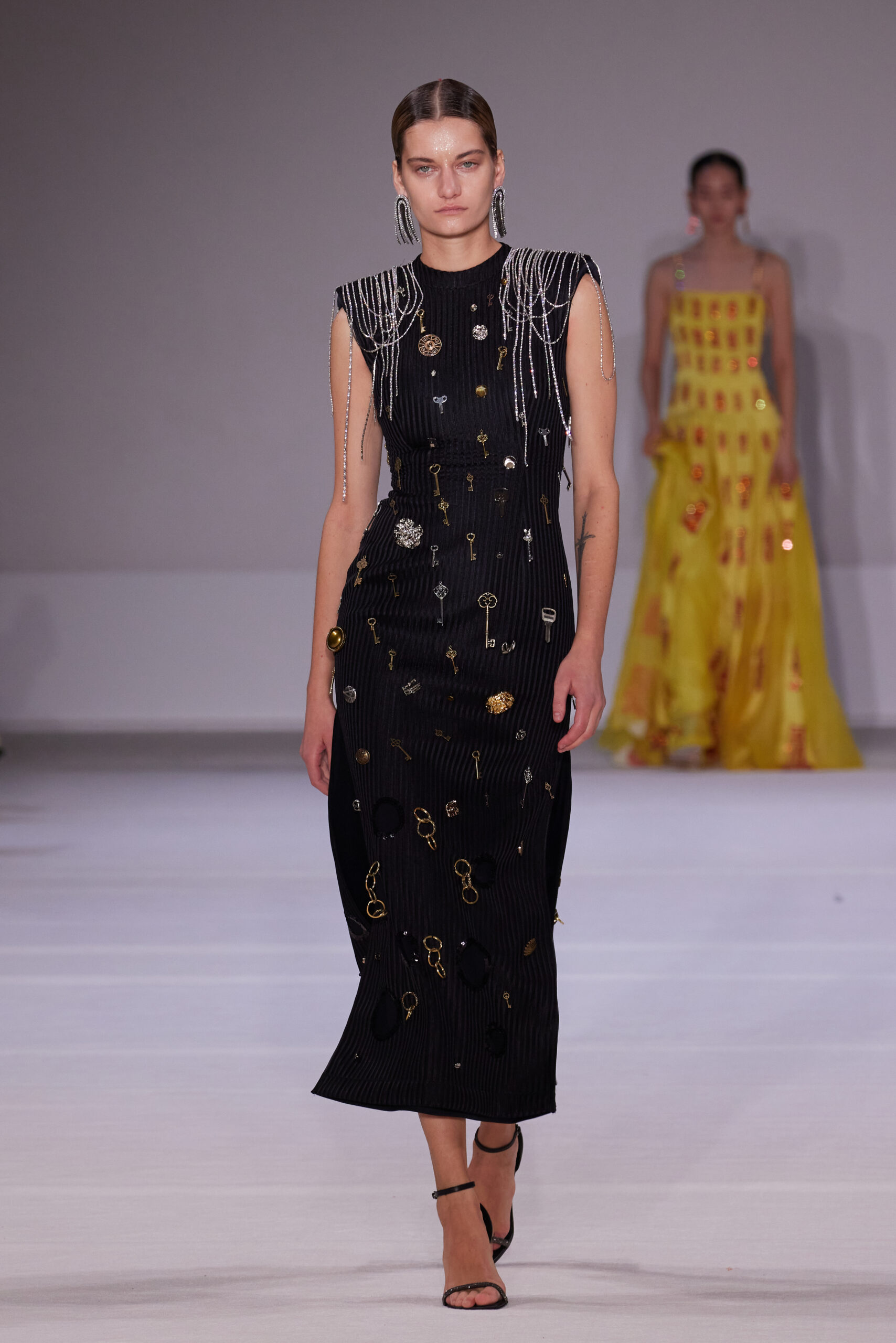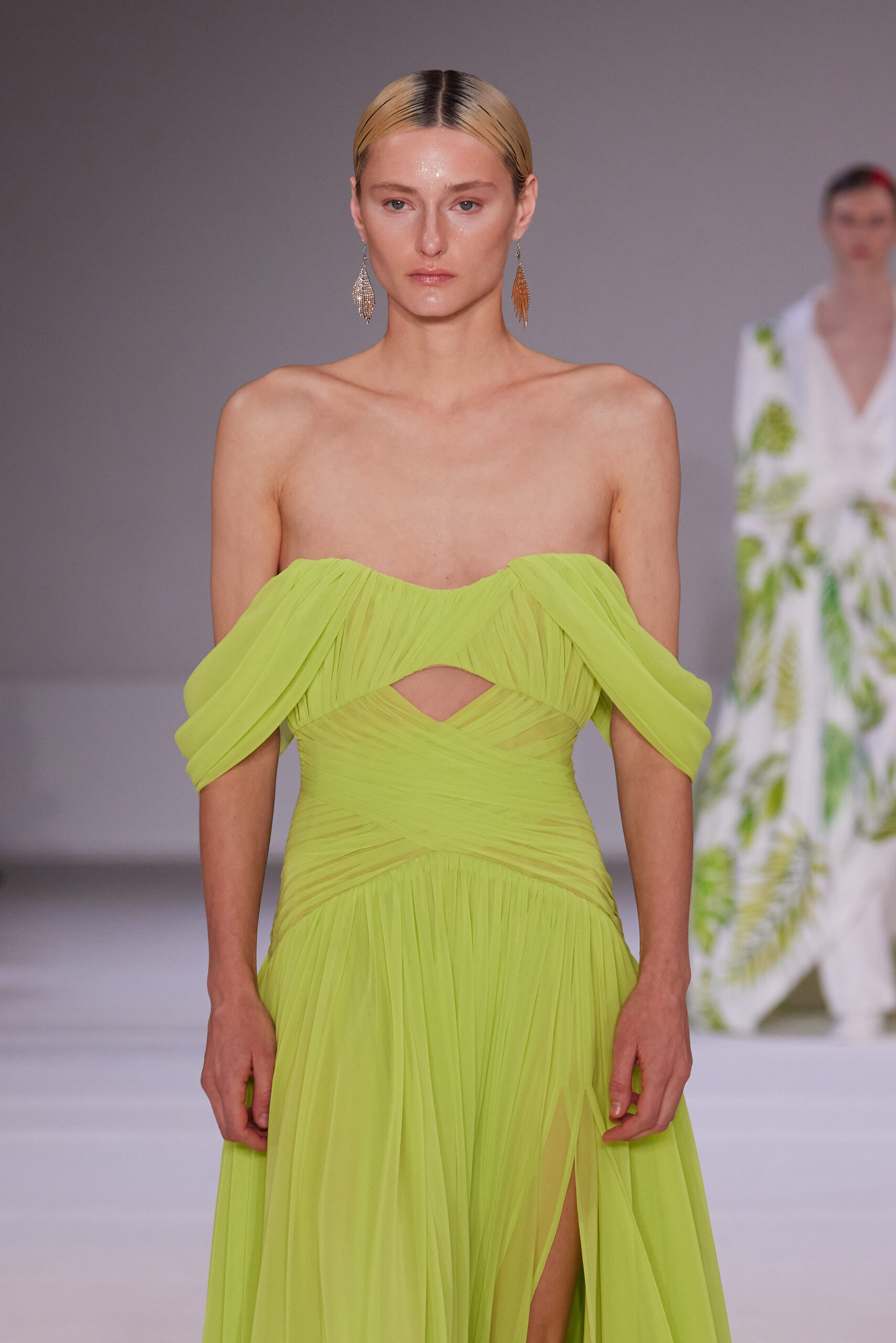 Emily Cheong et son équipe ont plongé dans l’étude des totems et des récits des dieux du feu, capturant leur caractère magique pour les transformer en motifs imprimés vibrants. Grâce à une coupe experte et un savoir-faire COUTURE, les robes s’ajustent parfaitement, soulignant le contrôle et la maîtrise de la silhouette.