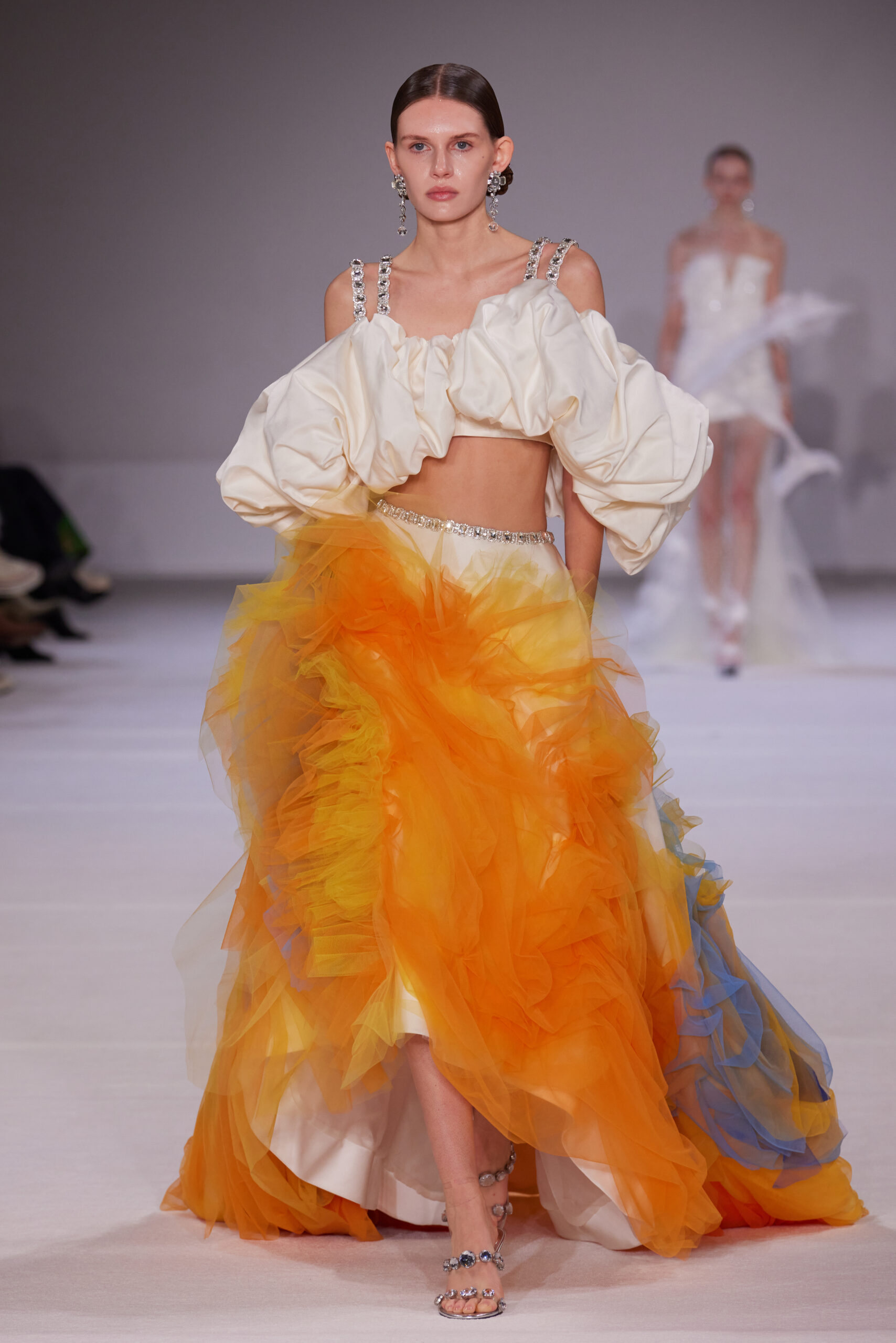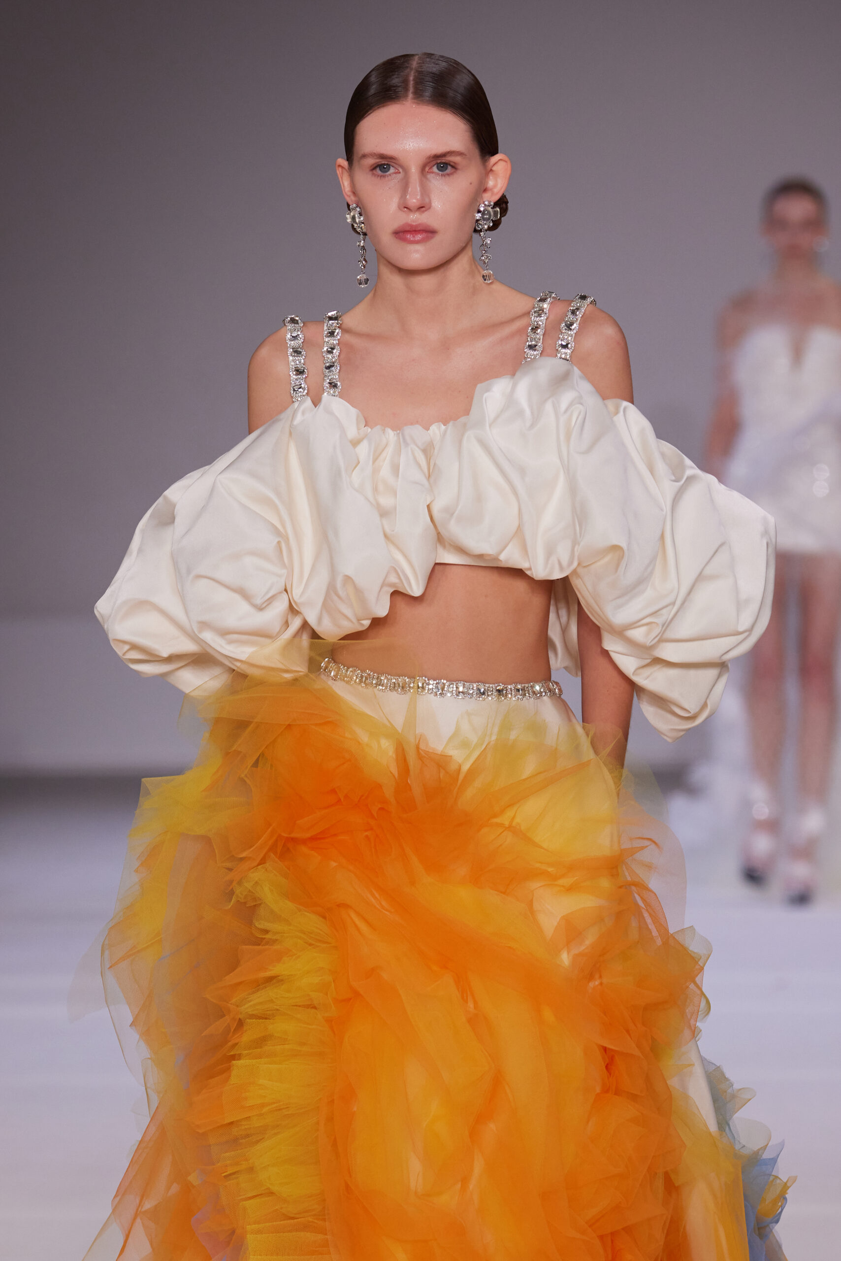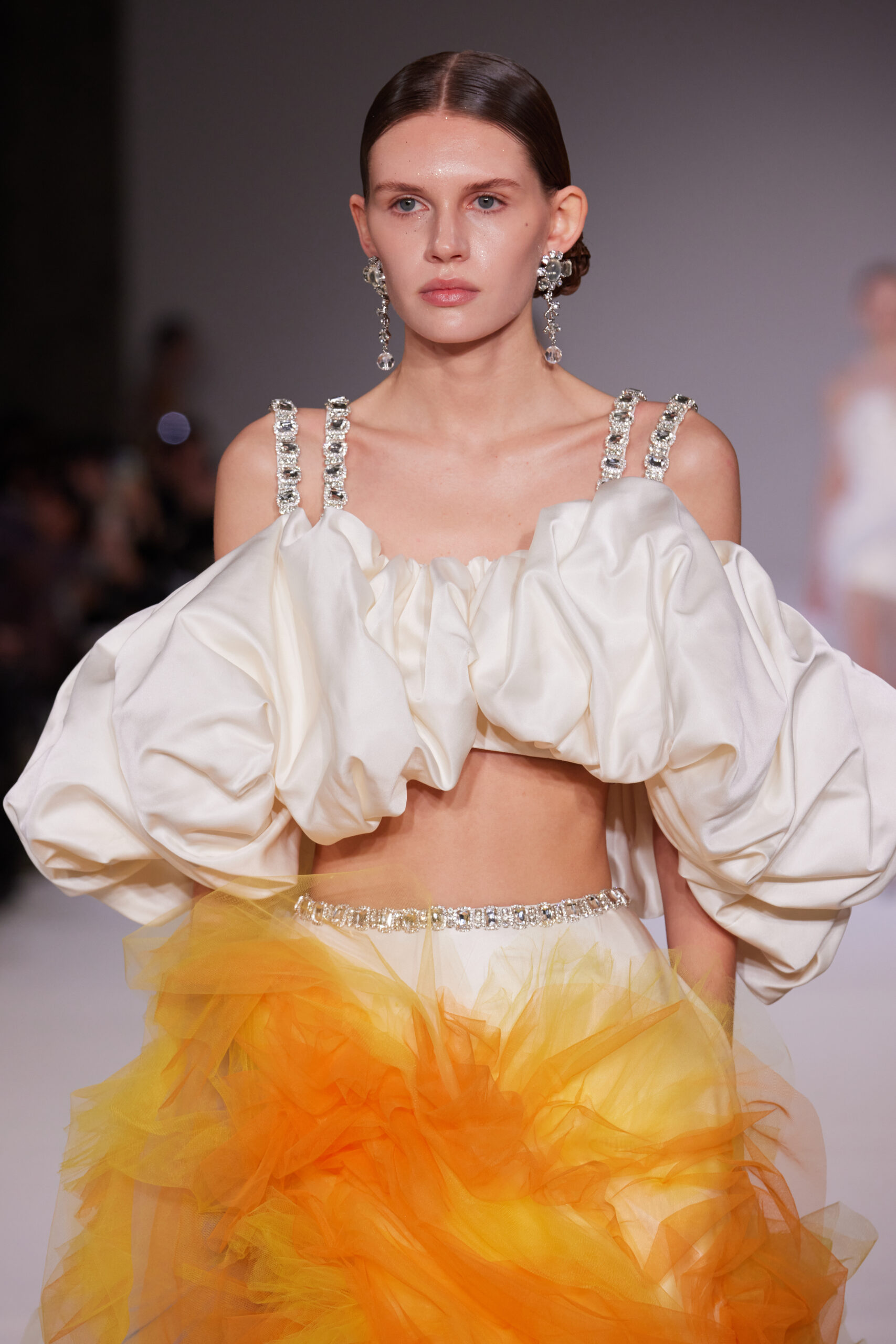 Les robes, légères et aériennes, réalisées en mousseline de soie avec une exécution méticuleuse des finitions en dentelle, épousent parfaitement la silhouette, formant un jeu de lumière qui interprète les nuances des flammes : les dorés de l’aube, les rouges du crépuscule, et une variété de jaunes et de bleus complexes inspirés par l’observation des flammes ardentes.