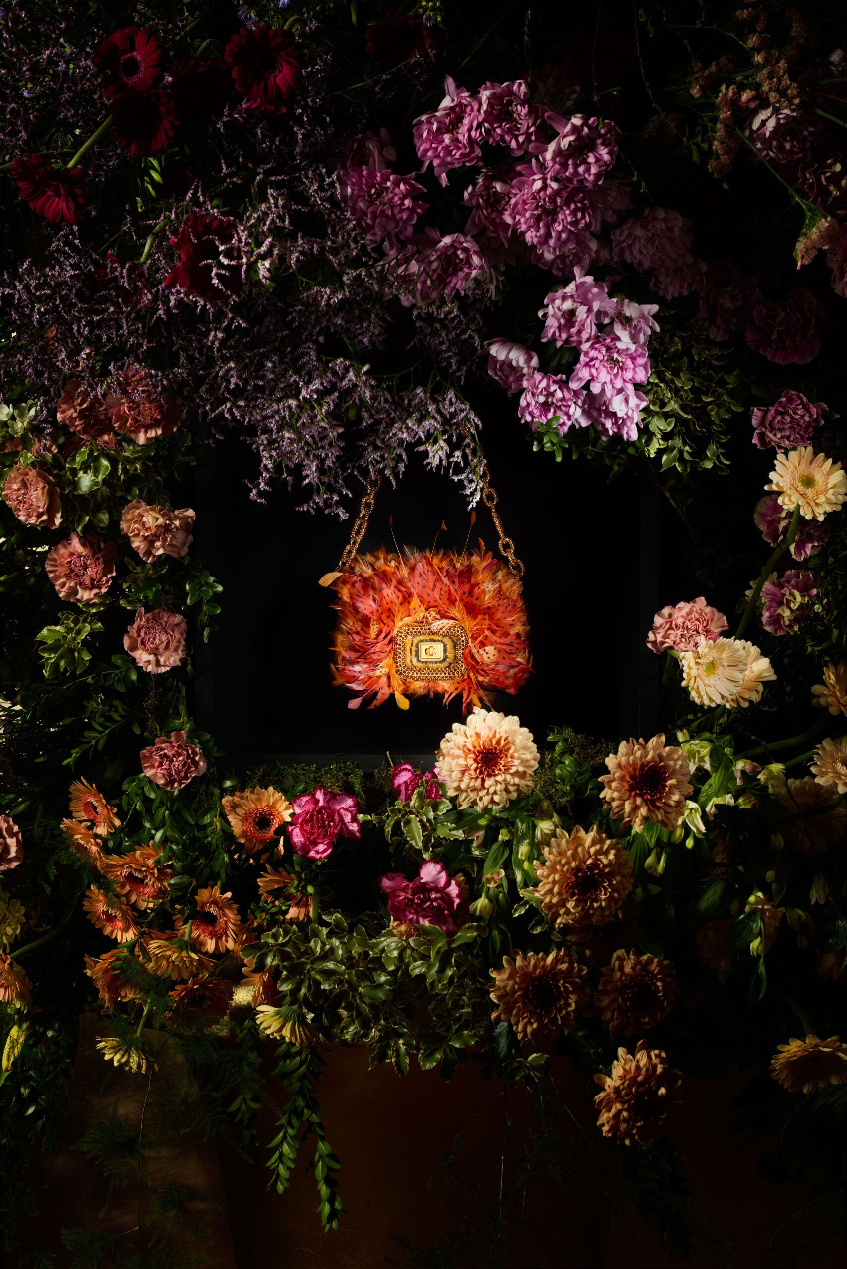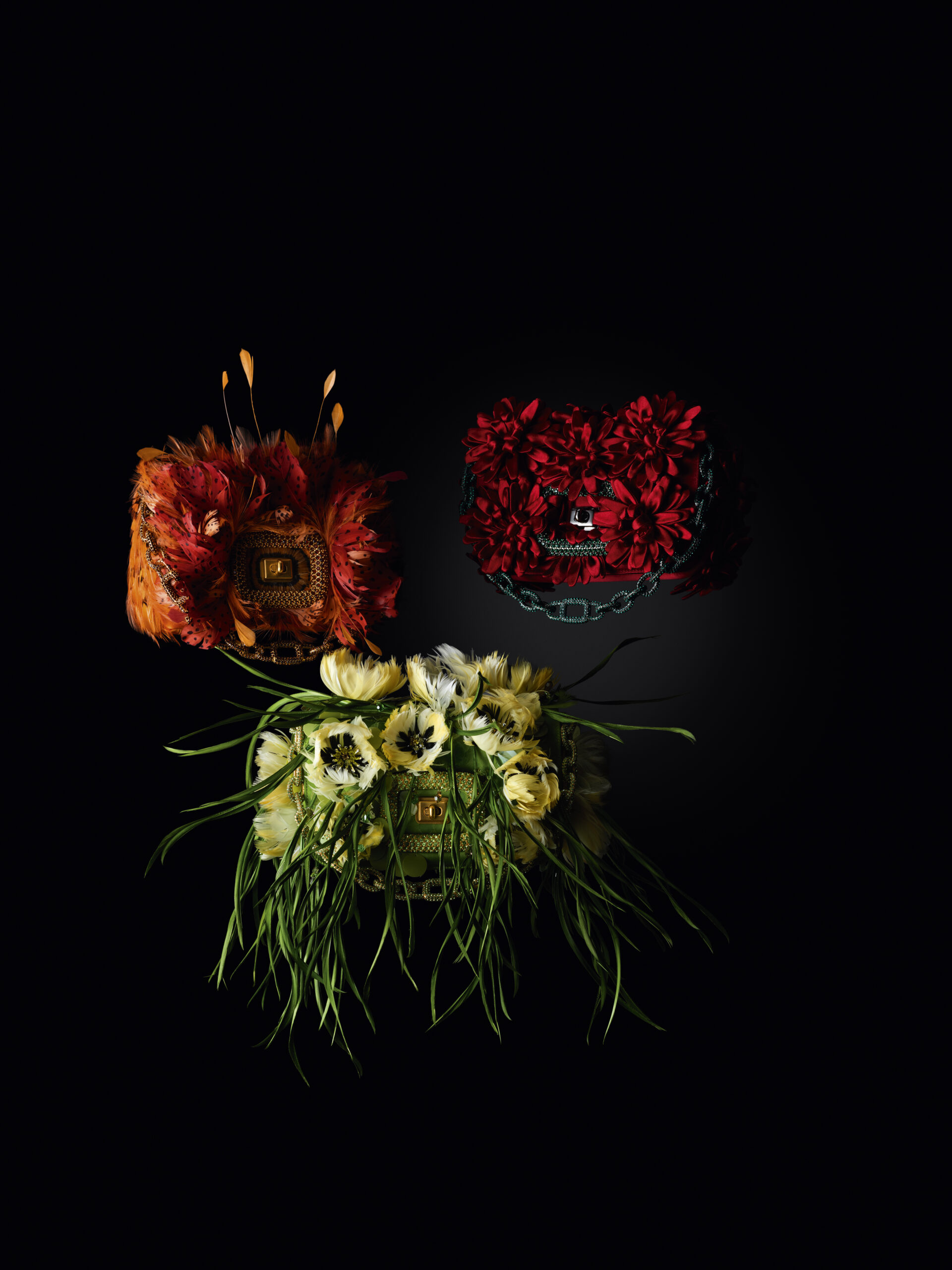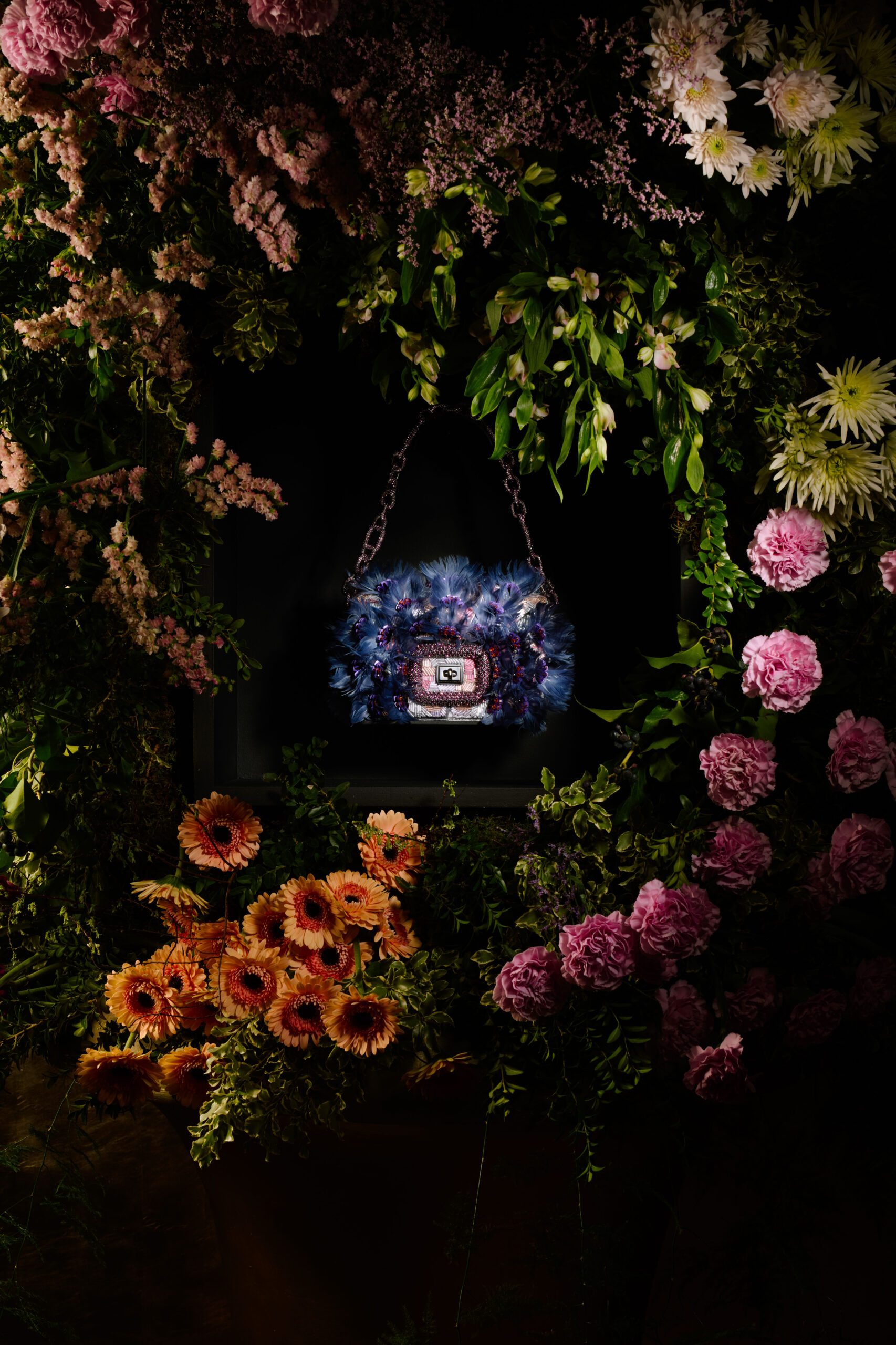Des roses aux lys, en passant par les marguerites, les violettes, les nigelles et les dahlias cactus, de somptueuses répliques et interprétations de ces fleurs classiques sont exécutées dans des couleurs vives et des formes en 3D, démontrant l’extraordinaire prouesse de l’atelier. Flânant à travers ce jardin de Pièce Unique en Pièce Unique, une myriade de techniques est appliquée avec la plus légère touche : des nigelles bleu ciel aux pétales de soie et pistils de plumes, jusqu’aux roses dorées incrustées de fils métalliques et de perles de cristal. Les prairies printanières et les jardins de mini-blooms enveloppent chaque volume doux du Viv’ Choc, tandis que les plumes peintes à la main évoquent des pétales et brins d’herbe flottant dans la brise, parmi des sequins iridescents.