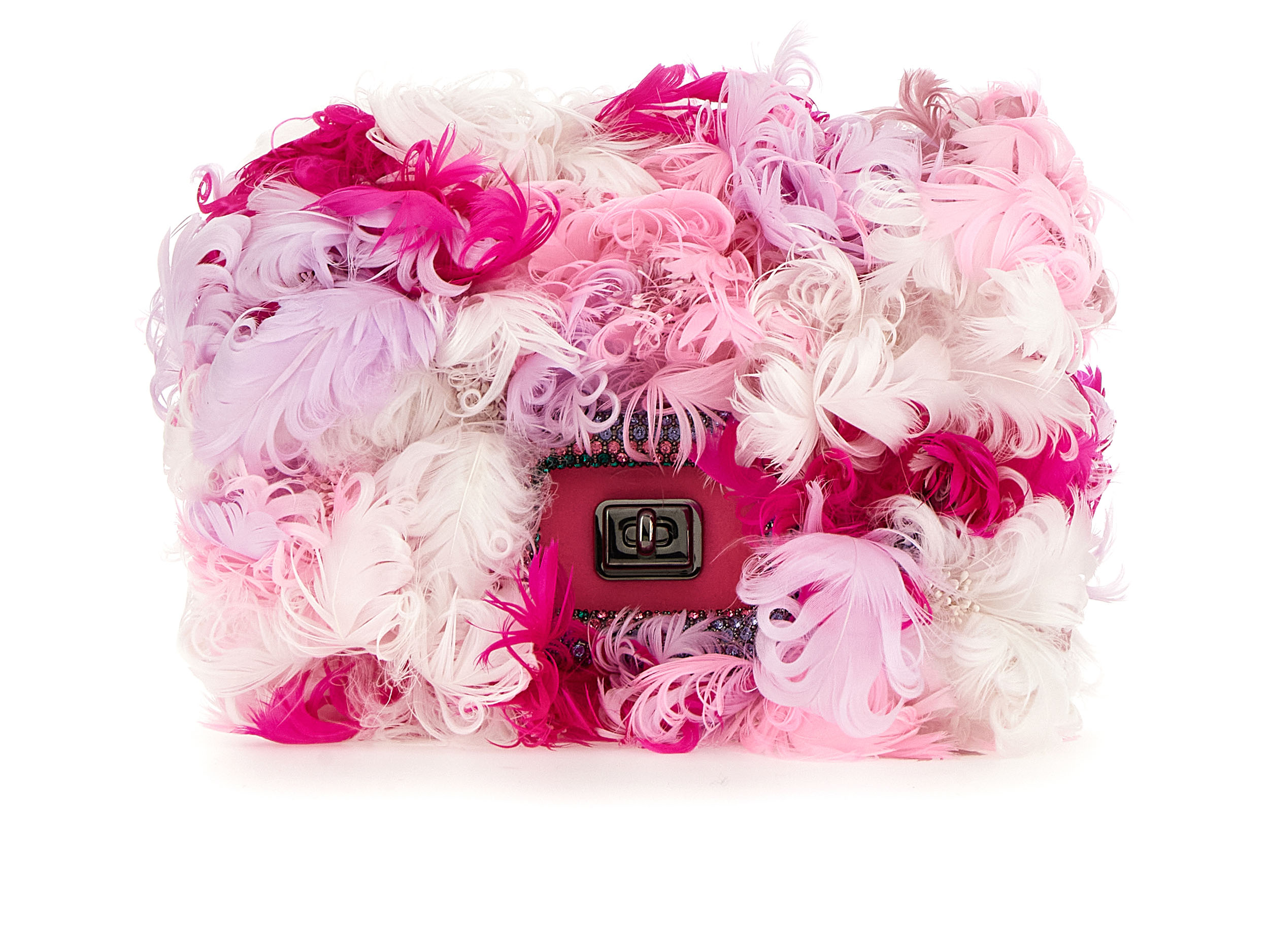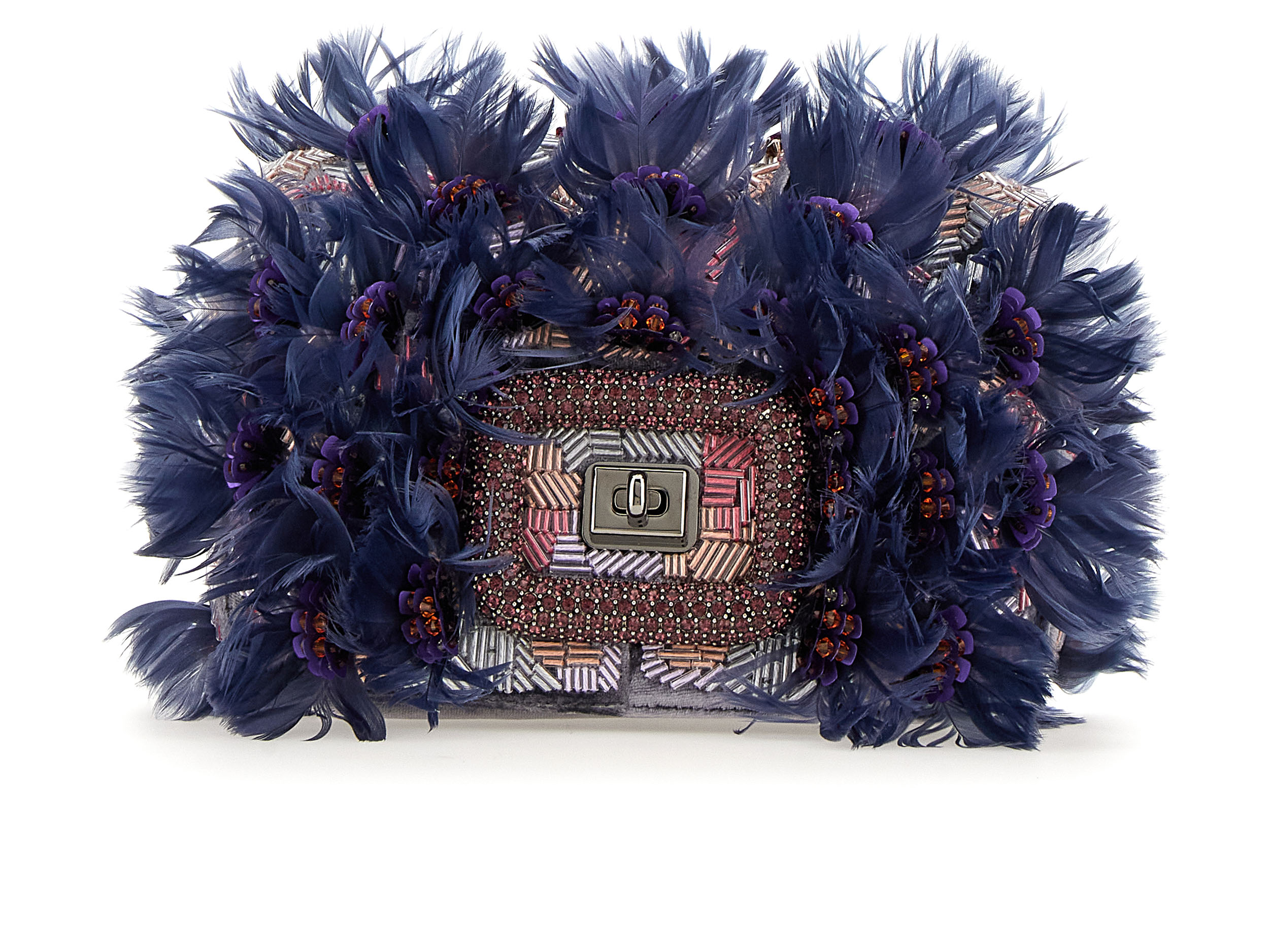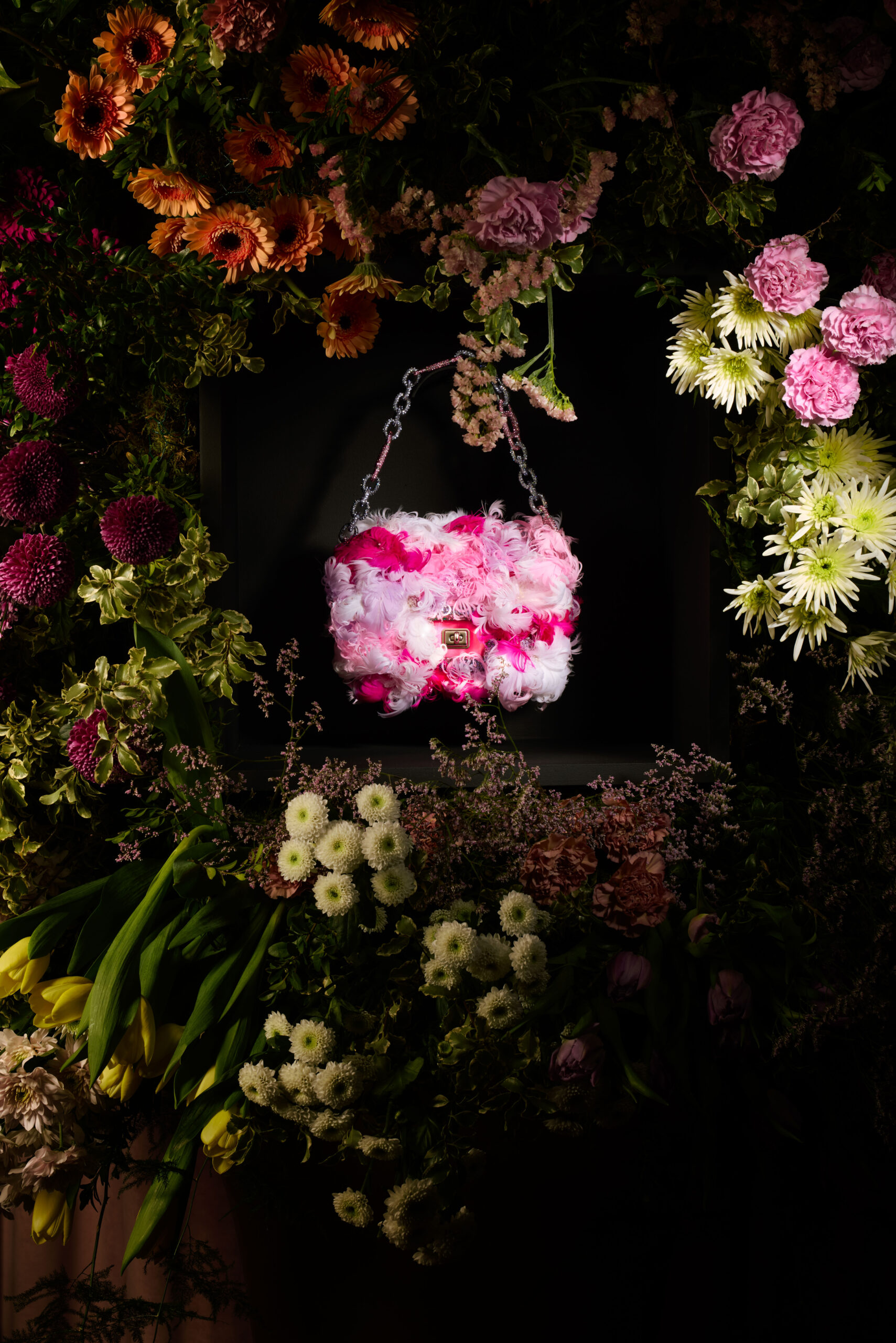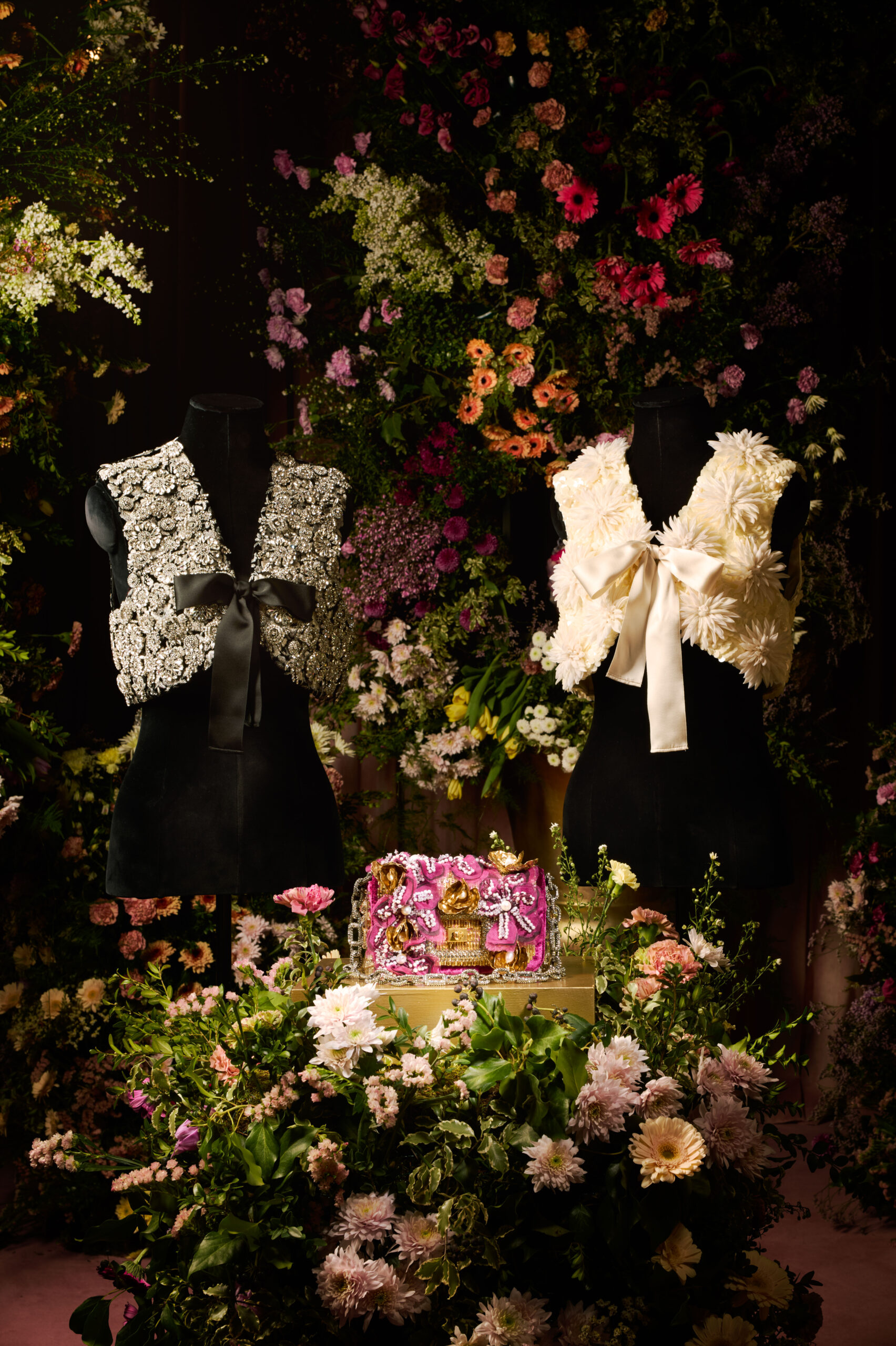 Des roses aux lys, en passant par les marguerites, les violettes, les nigelles et les dahlias cactus, de somptueuses répliques et interprétations de ces fleurs classiques sont exécutées dans des couleurs vives et des formes en 3D, démontrant l’extraordinaire prouesse de l’atelier. Flânant à travers ce jardin de Pièce Unique en Pièce Unique, une myriade de techniques est appliquée avec la plus légère touche : des nigelles bleu ciel aux pétales de soie et pistils de plumes, jusqu’aux roses dorées incrustées de fils métalliques et de perles de cristal. Les prairies printanières et les jardins de mini-blooms enveloppent chaque volume doux du Viv’ Choc, tandis que les plumes peintes à la main évoquent des pétales et brins d’herbe flottant dans la brise, parmi des sequins iridescents.