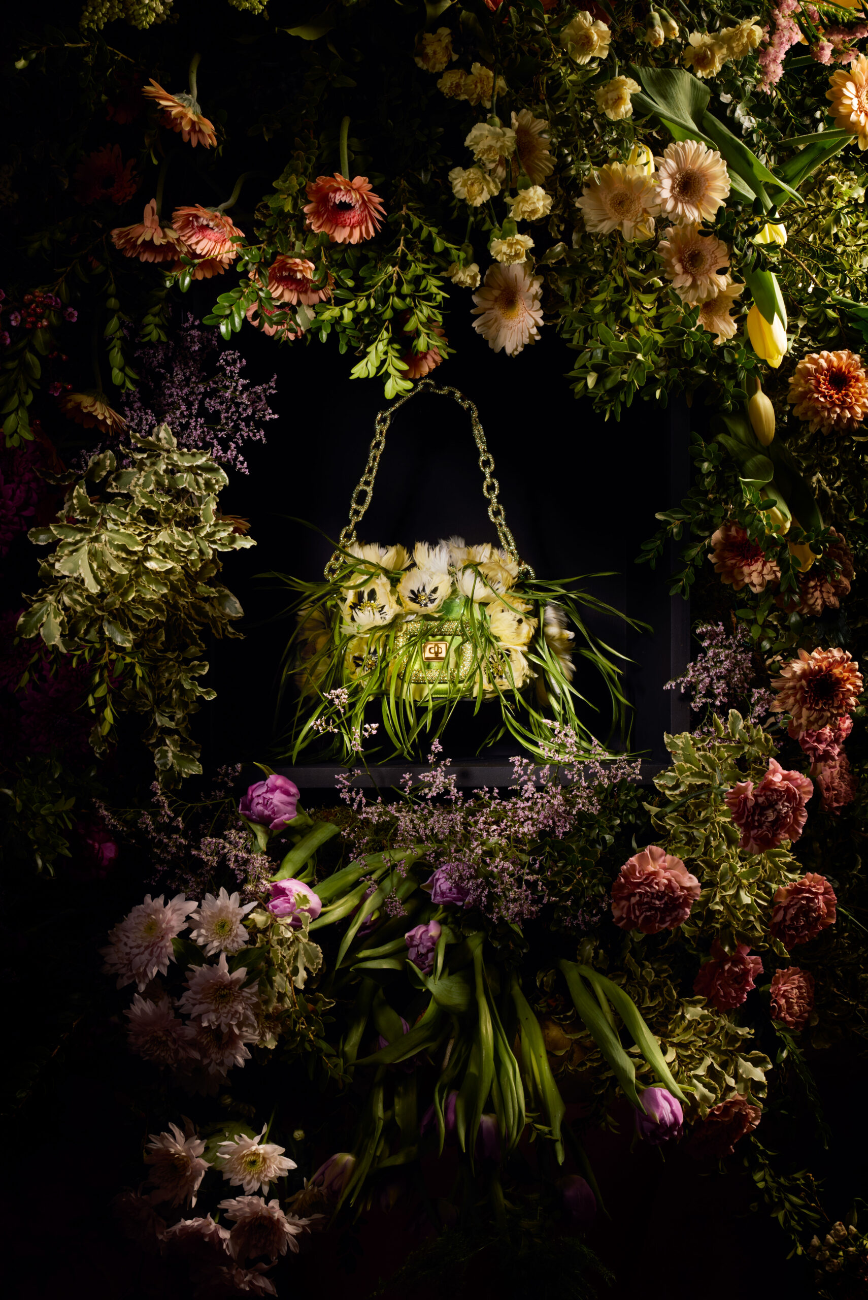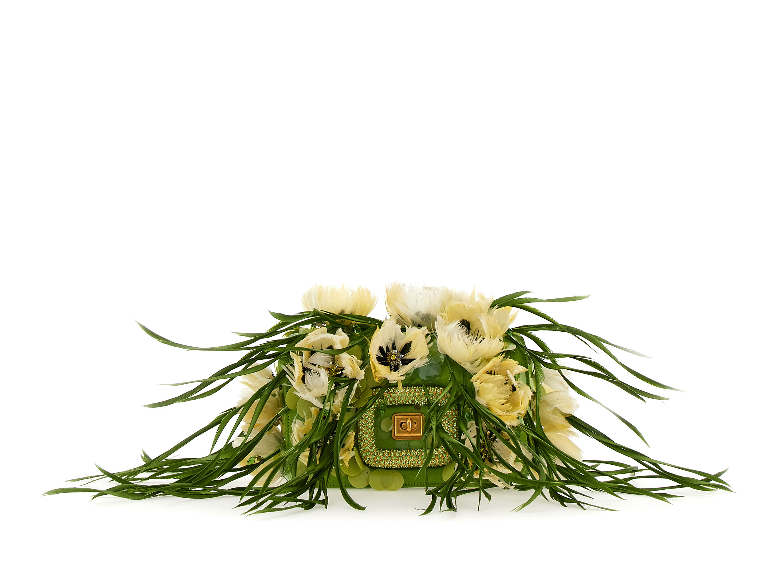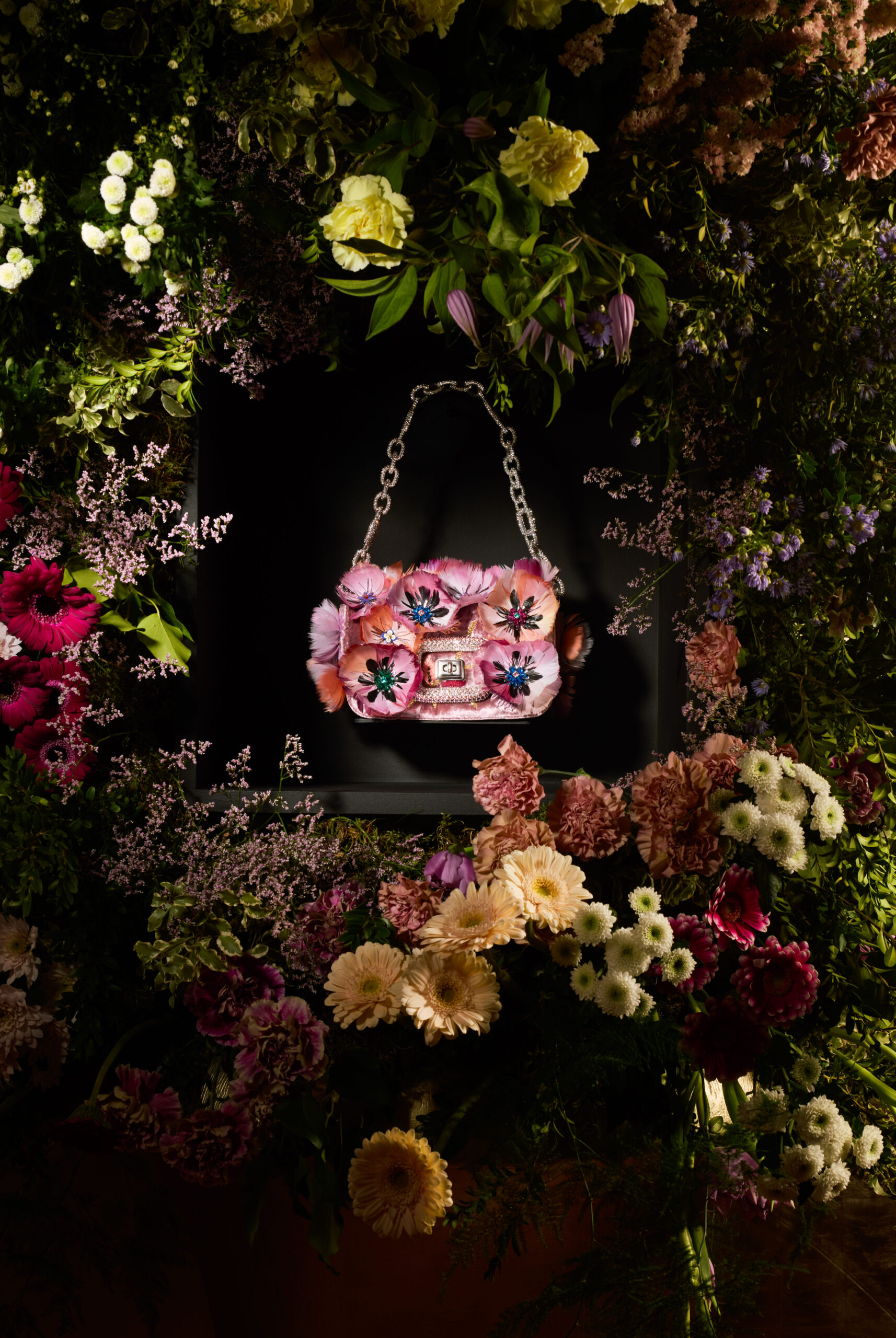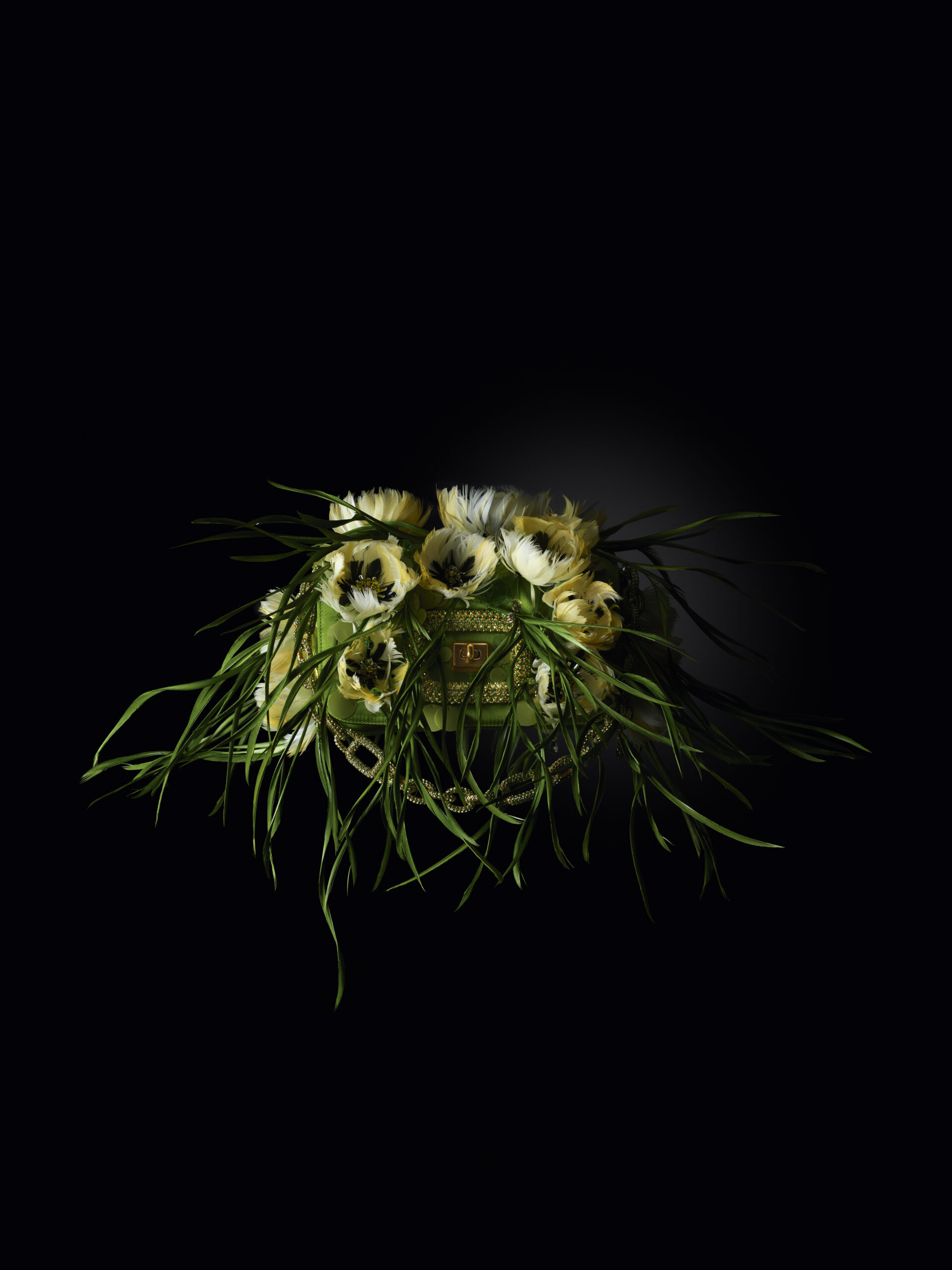 Inspiré par un jardin classique d’un autre monde, regorgeant de fleurs venues des quatre coins du globe, Felloni réfléchit aux personnalités et particularités de chaque variété, ancrées par l’architecture fluide du sac Viv’ Choc. La broderie à la main, triomphante, fait écho au toucher délicat de Monsieur Vivier, qui a su apporter la fantaisie de la Haute Couture dans le monde des accessoires tout au long de la seconde moitié du XXe siècle.