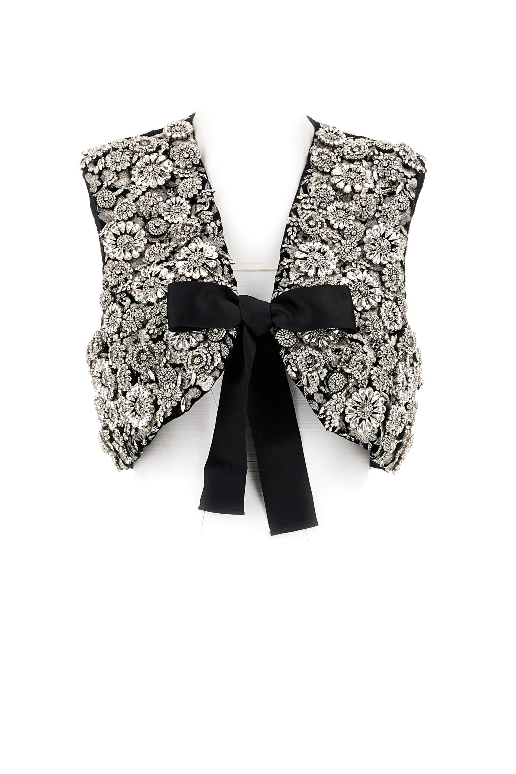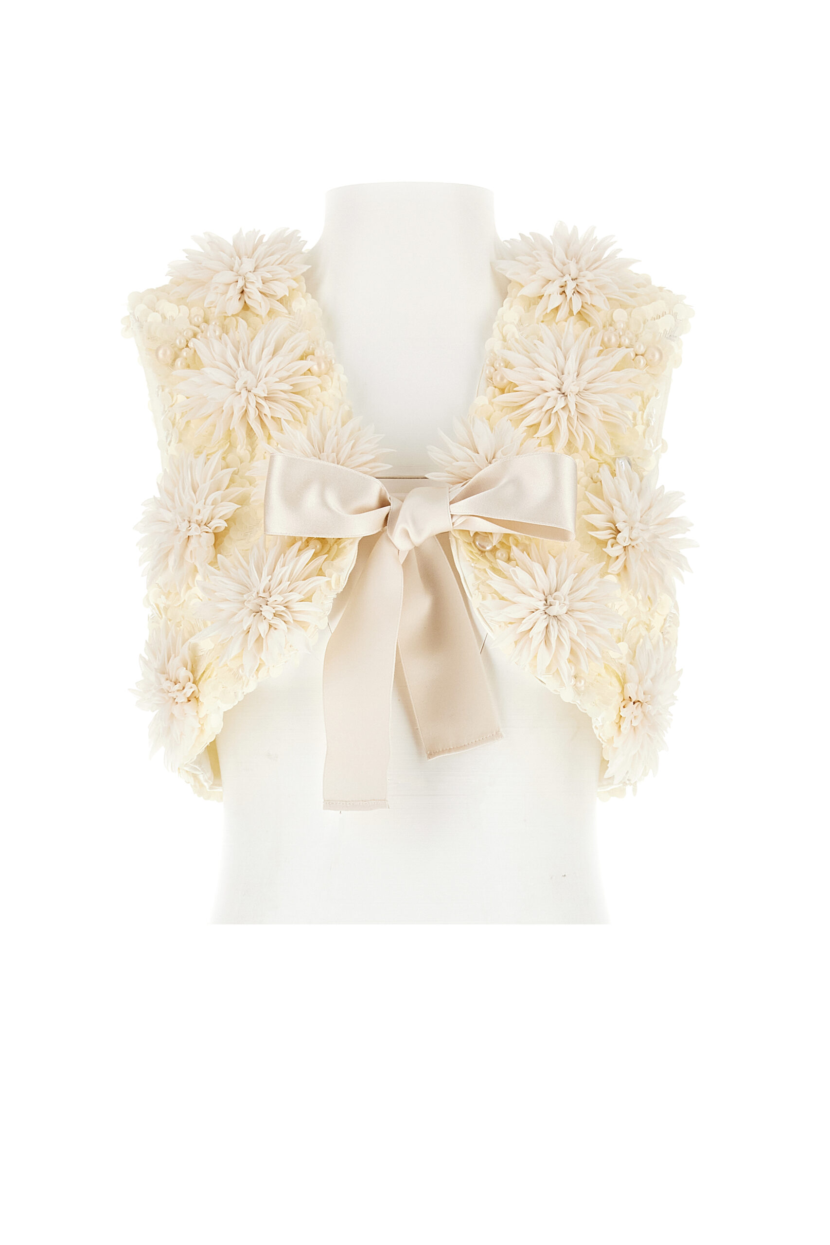 Sublimant les broderies florales de la collection sur le corps, une série romantique de gilets Pièce Unique poursuit l’évolution de la silhouette Roger Vivier par Felloni – honorant l’engagement de Monsieur Vivier à accessoiriser de la tête aux pieds. Une construction sans col en satin de soie, organza de soie ou velours de soie devient une toile vierge pour un artisanat magnifique, écho aux motifs de plusieurs sacs à main Pièce Unique. Nécessitant entre 60 et 100 heures de travail artisanal à la main, les designs exclusifs uniques en leur genre sont ornés de véritables envolées de fantaisie, des anémones multicolores ou des pétales de plumes bouclées dans des nuances rosées, à une prairie printanière de soucis jaunes et les teintes crème des dahlias cactus en perles baroques et organza.