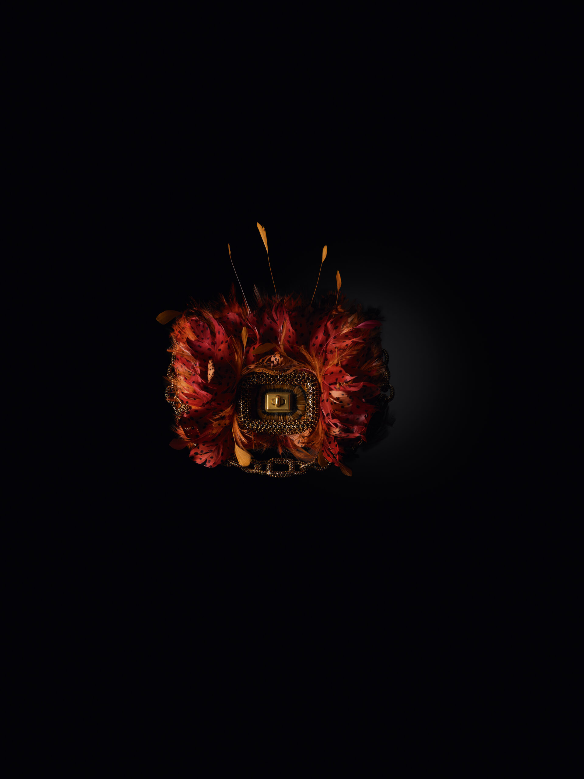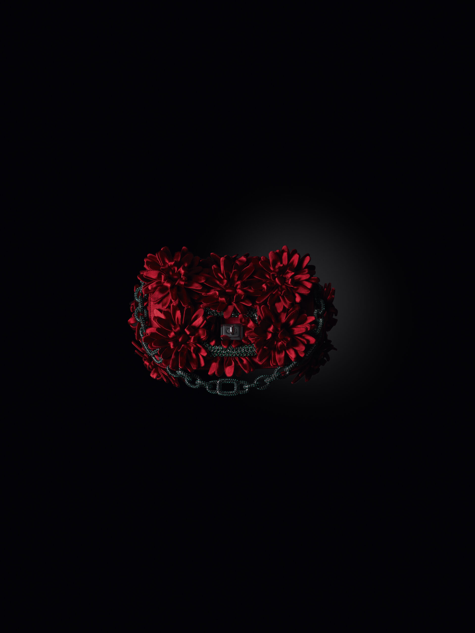 Les fleurs, tels des joyaux montés ‘en tremblant’ sur du velours noir avec des accents d’argent sombre et de rhinestones géants, ou encore évoquant la noble mythologie du lys dans des organza frangés, des métaux dorés, et des plumes teintées à la main, complètent les traitements de surface opulents de la collection Pièce Unique. Les développements artisanaux transforment la quincaillerie du Viv’ Choc, élevant l’embellissement à 360° vers de nouveaux sommets. Par moments, la boucle emblématique de Roger Vivier reçoit une finition or antique inédite ou est incrustée de cristaux, et les chaînes décoratives sont ornées par les artisans de pierres pavées éblouissantes. Chaque sac à main Pièce Unique est le résultat de 30 à 60 heures de travail artisanal à la main dans l’atelier Roger Vivier.