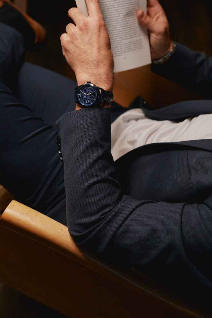 Le design de ces montres est une véritable prouesse technique. Le traitement DLC (Diamond-Like Carbon) appliqué sur l’acier poli du boîtier garantit une résistance et une durabilité exceptionnelles. De plus, la technique de pulvérisation cathodique, utilisée pour appliquer la couleur sur les composants métalliques, assure une finition parfaite et une couleur éclatante et durable. Cette attention méticuleuse au détail se reflète également dans les cadrans en saphir teinté, offrant une transparence et un contraste saisissants qui mettent en valeur les disques de date et de lune, ainsi que les index Super Luminova BGW9.